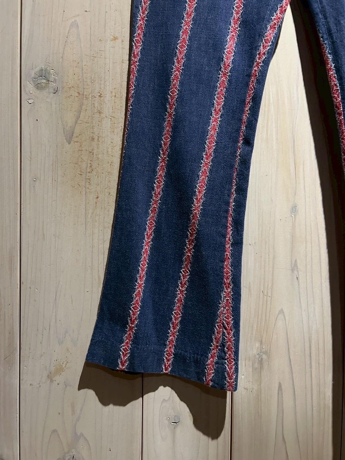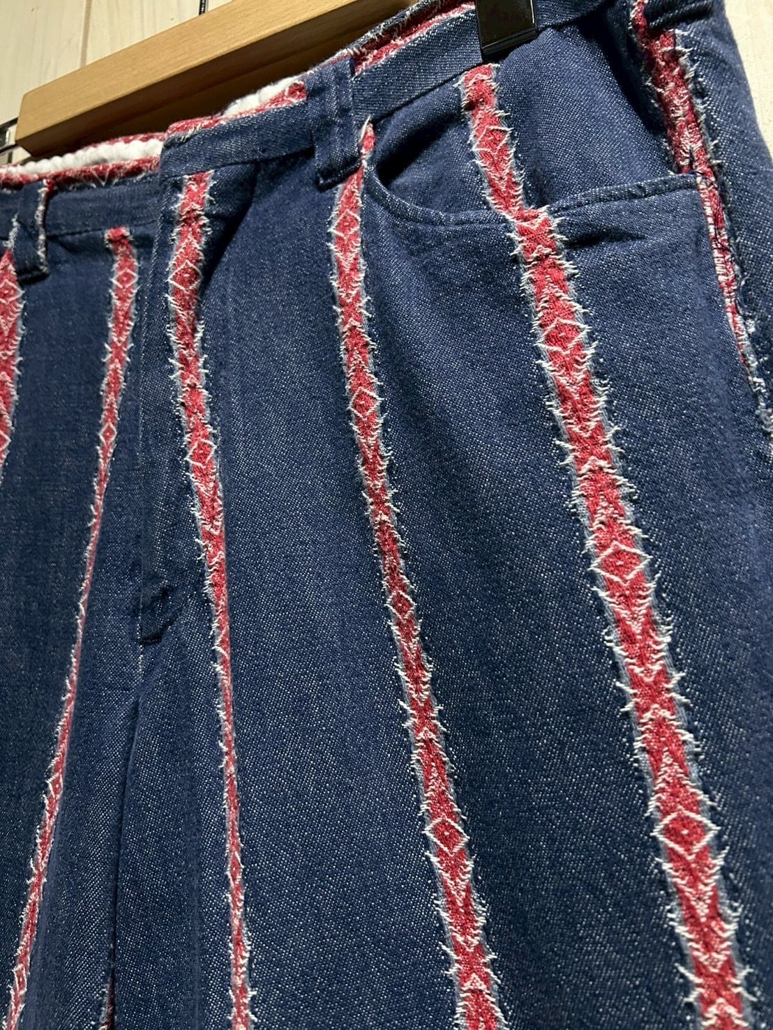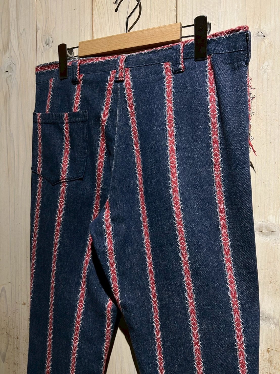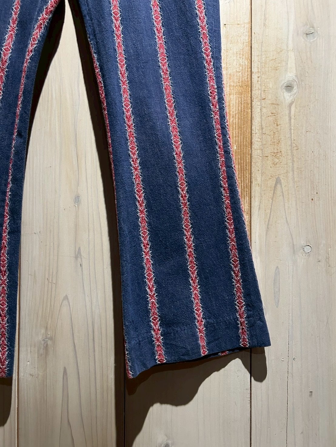 インディゴのボディをベースに、稀少なデニムの織柄で表現されたネイティブパターンをストライプ状に配置したフレアパンツ。