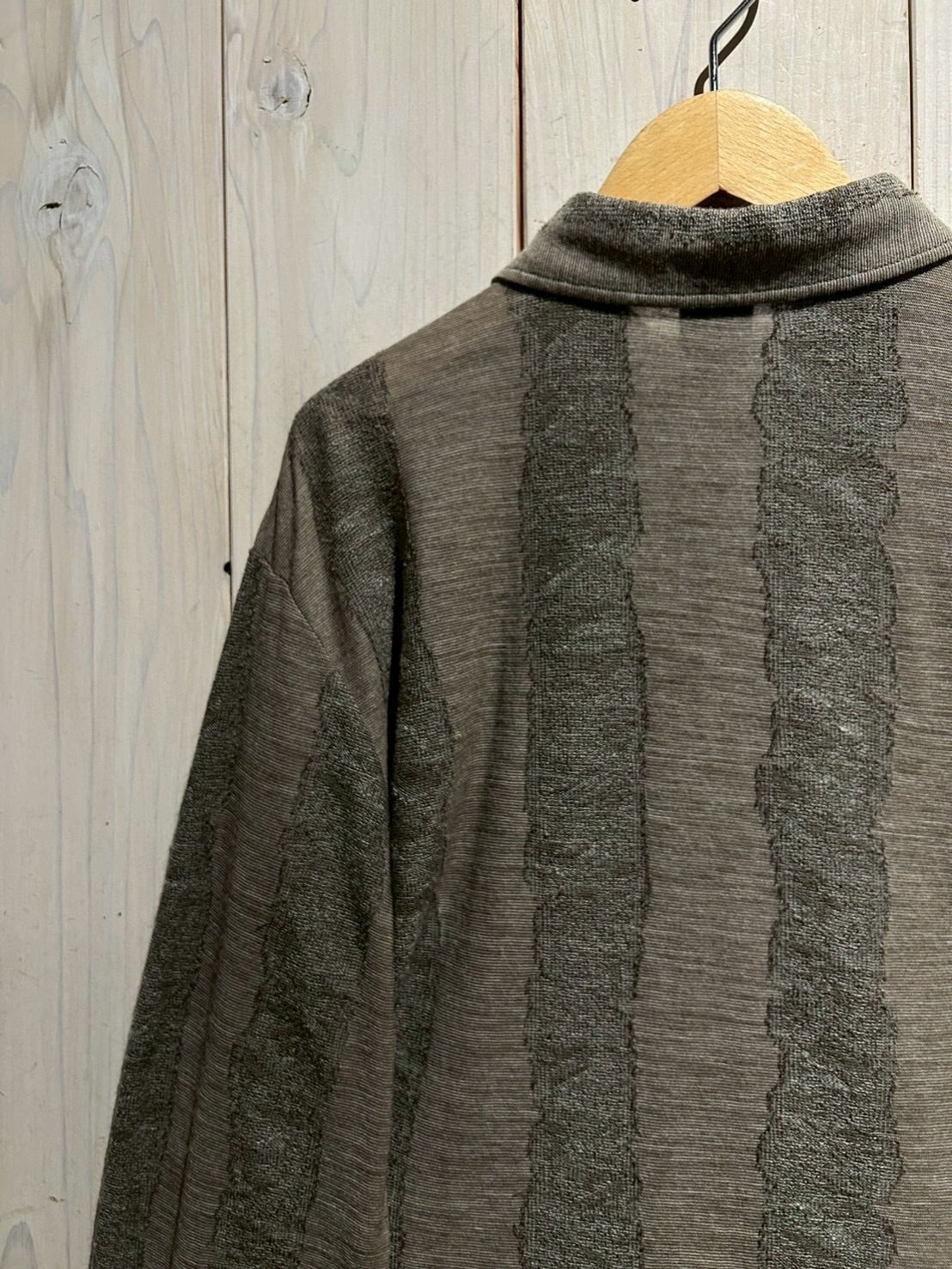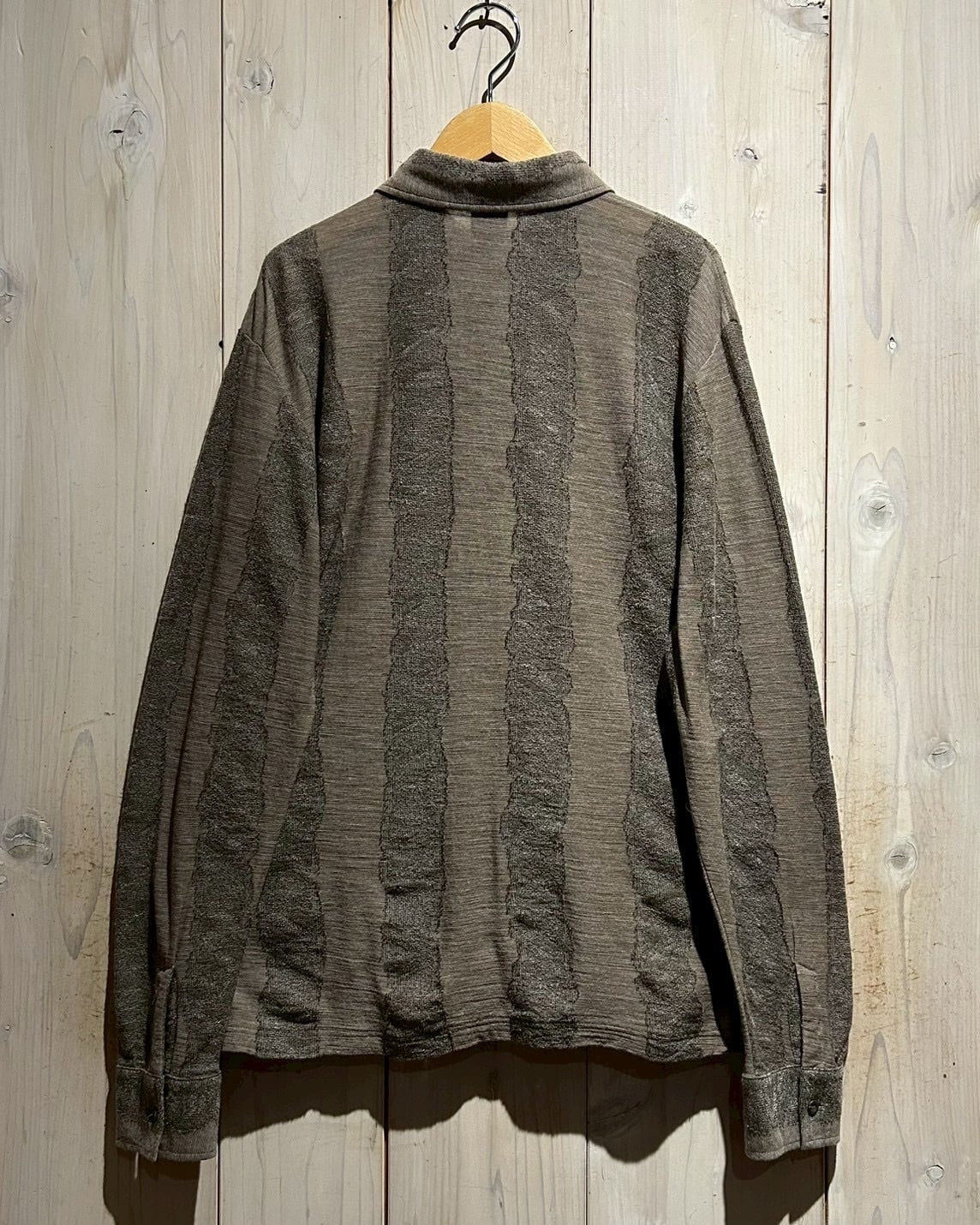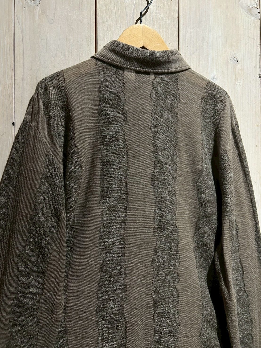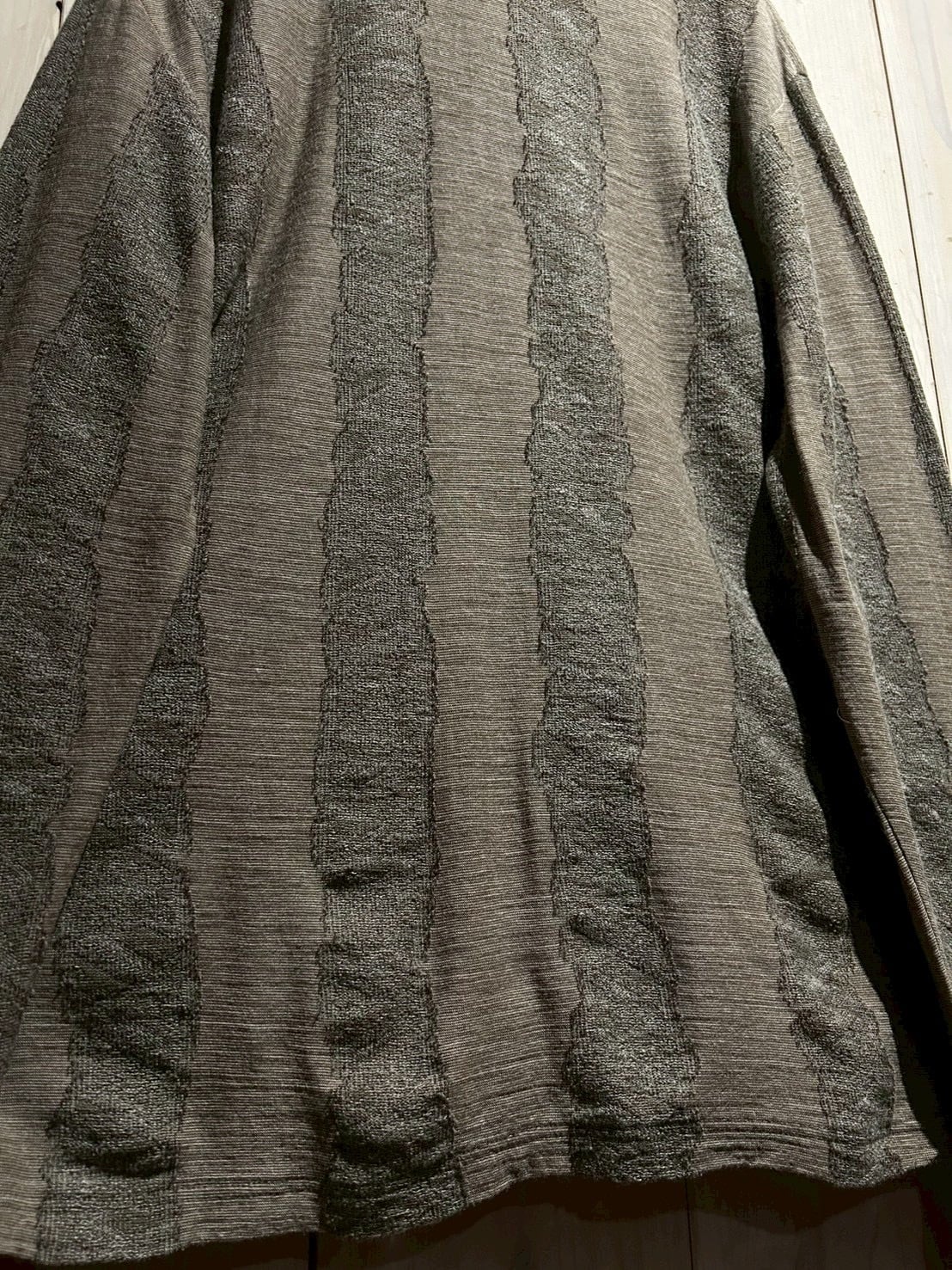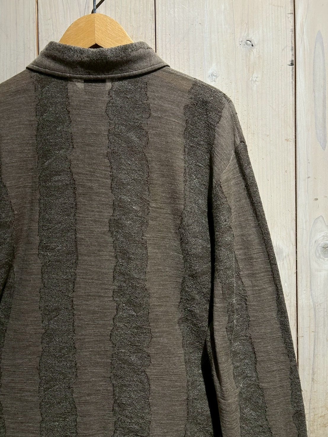 落ち着いたブラウンをベースとしたボディに、手書きのような揺らぎを感じるストライプをニッティングで表現した1着。