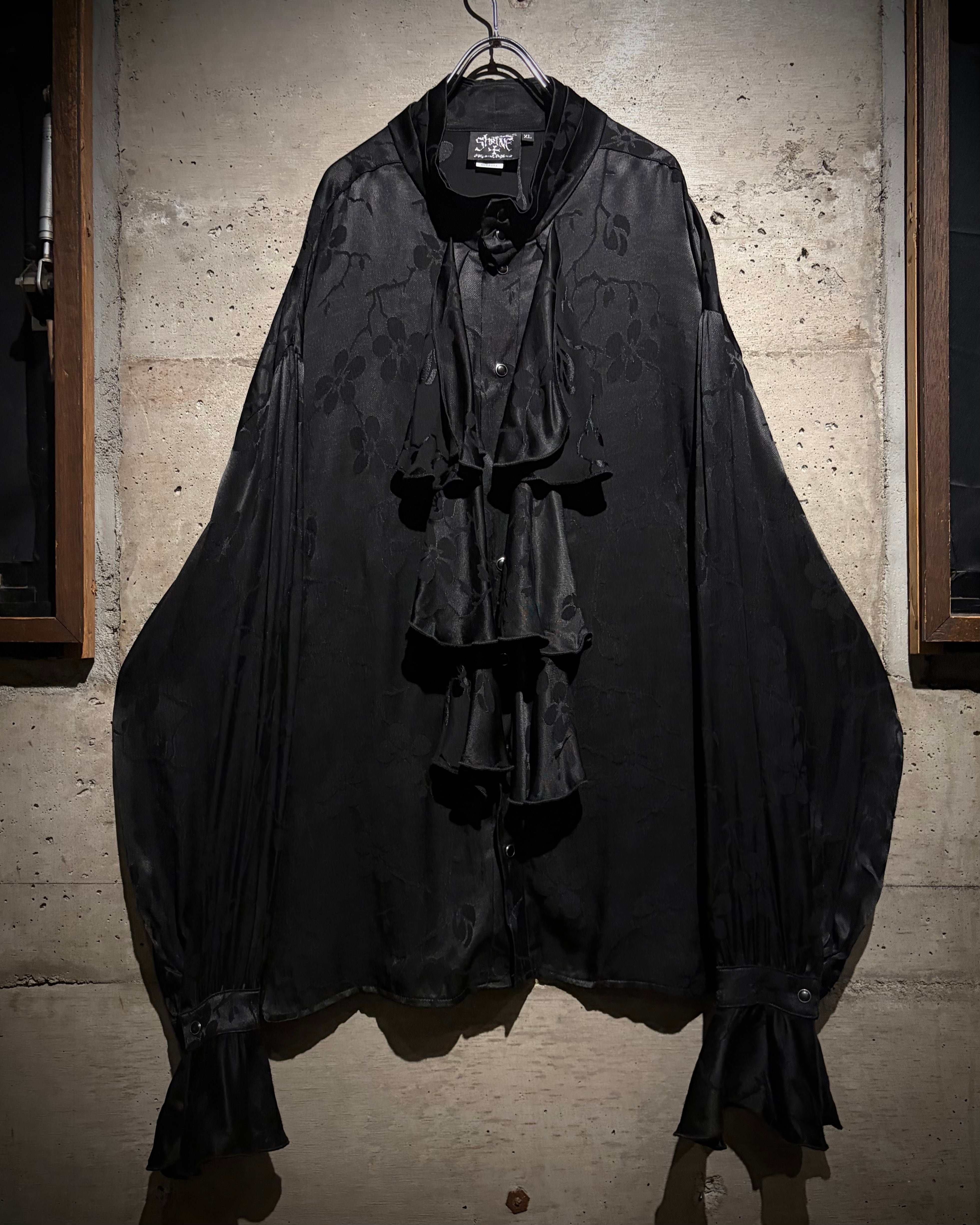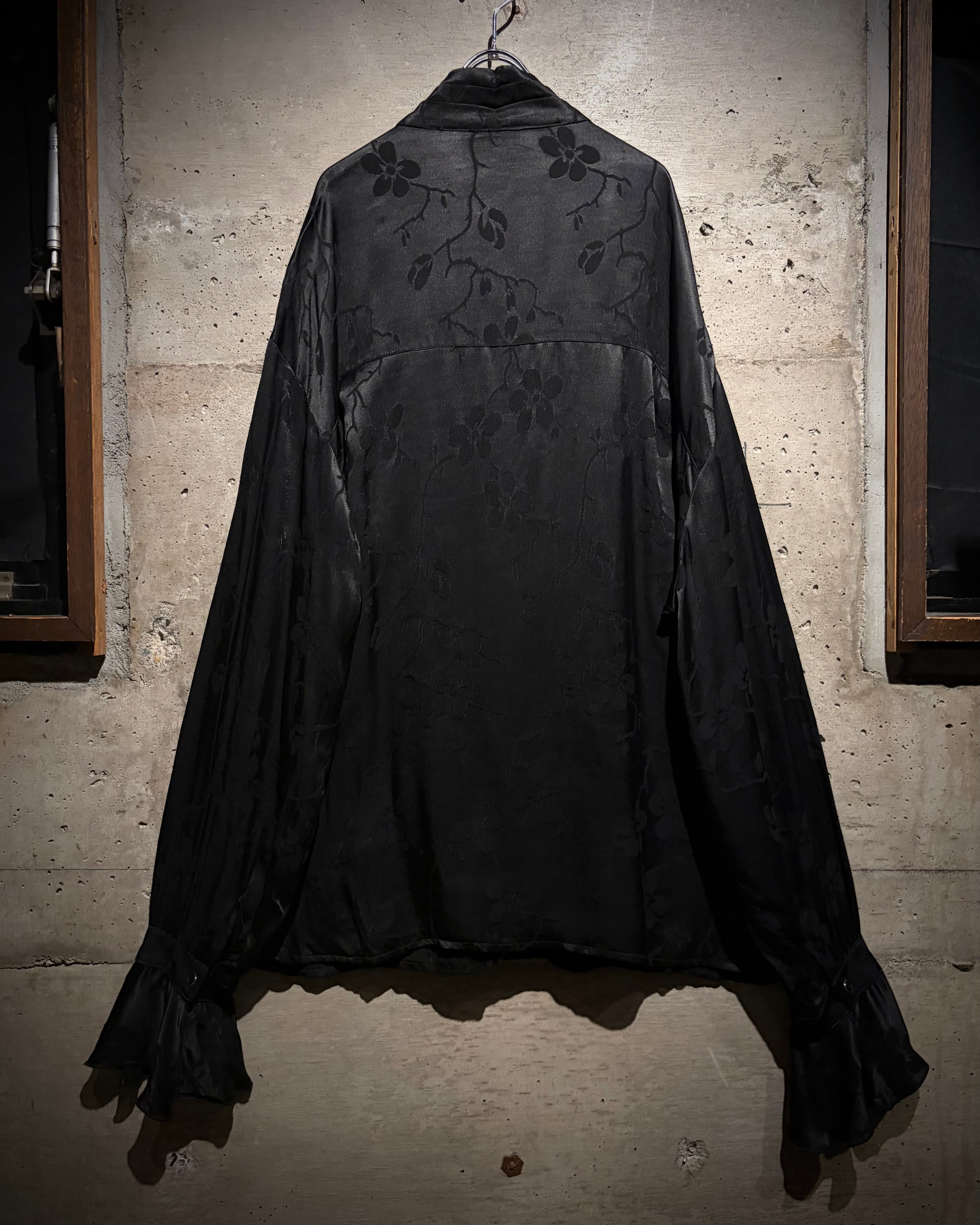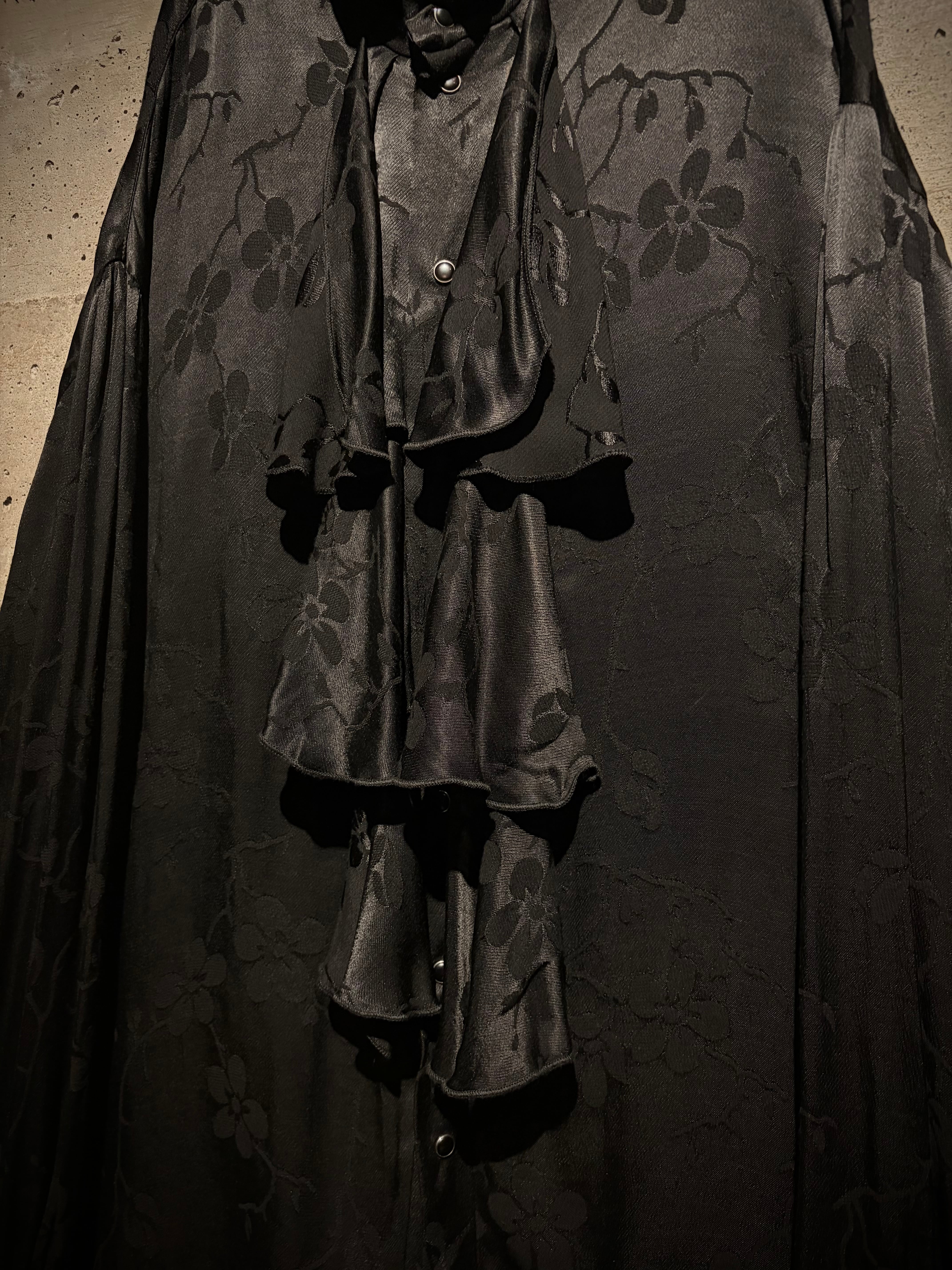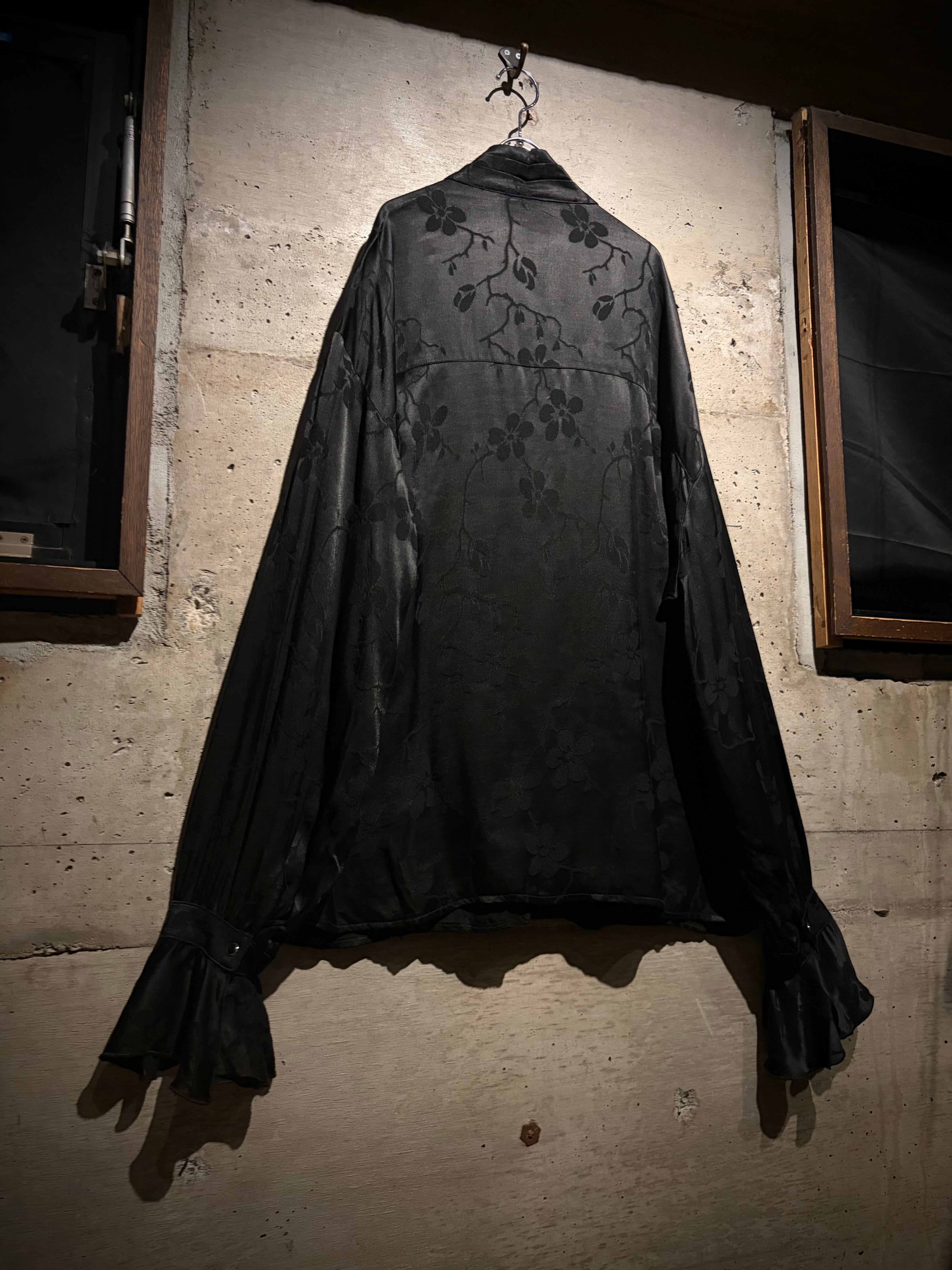 艶やかな光沢を帯びたブラックボディに、ジャガード織りによる美しい花を全面に載せ、ラッフルによる装飾を施した稀有な長袖シャツ。