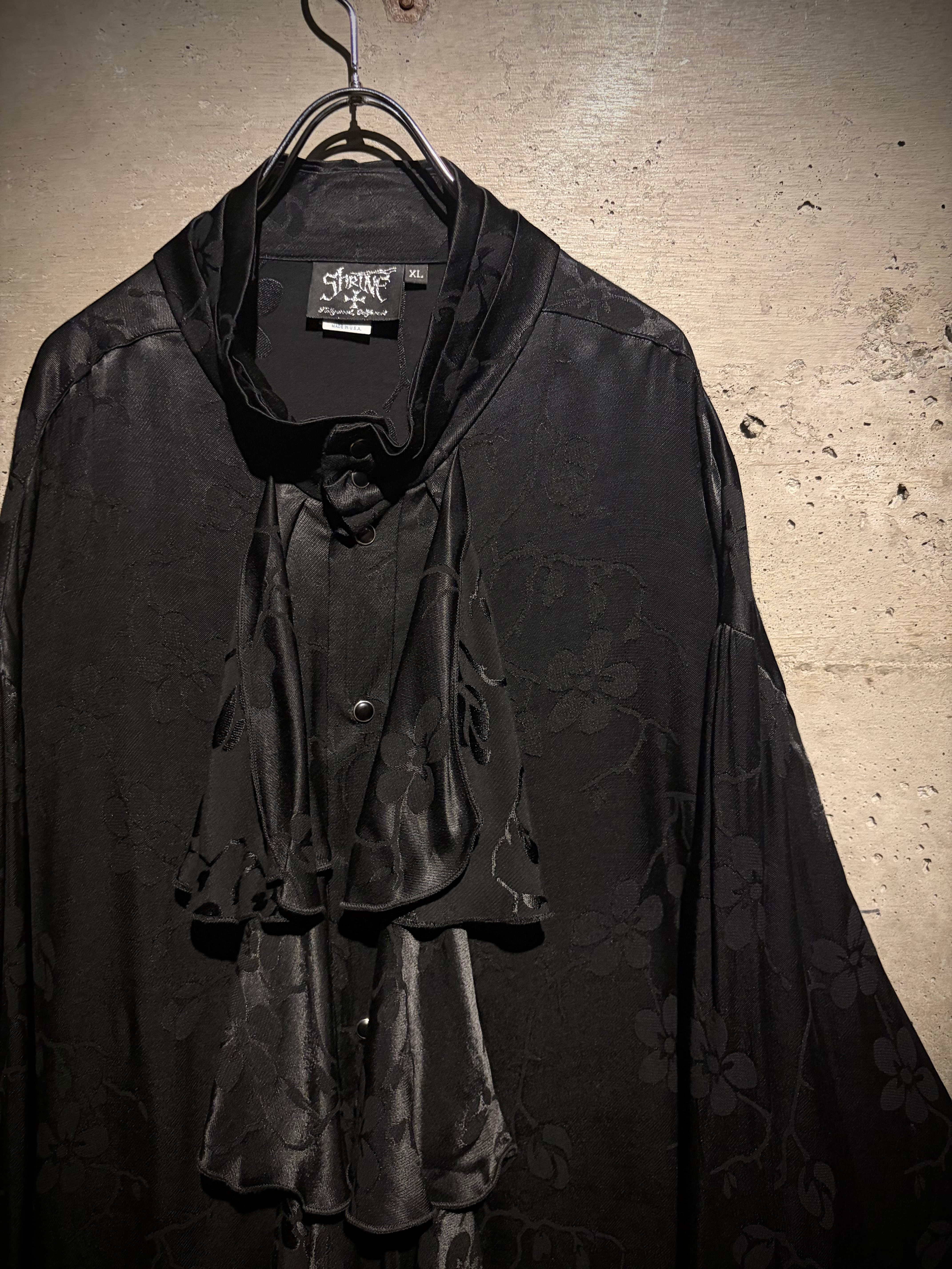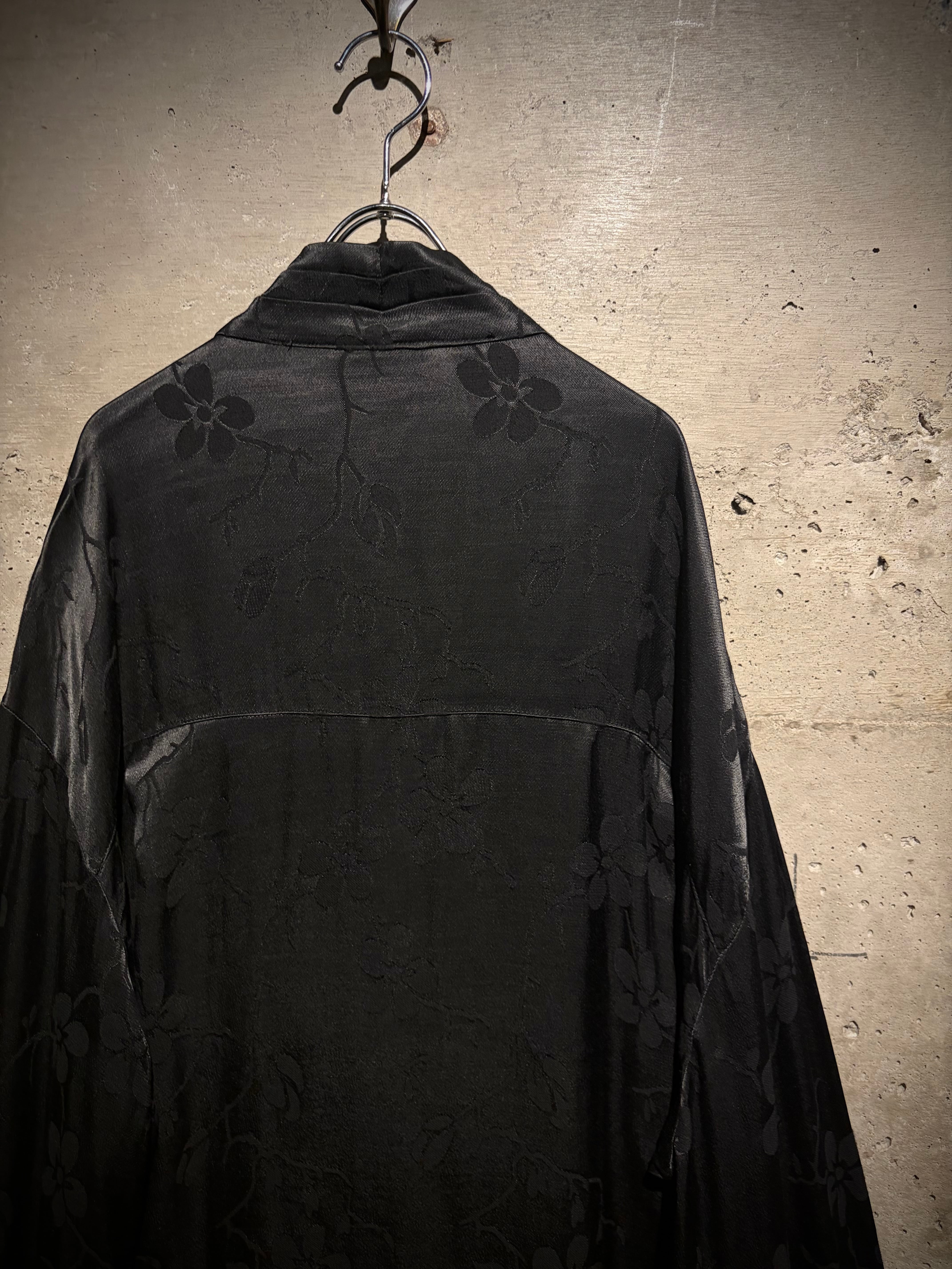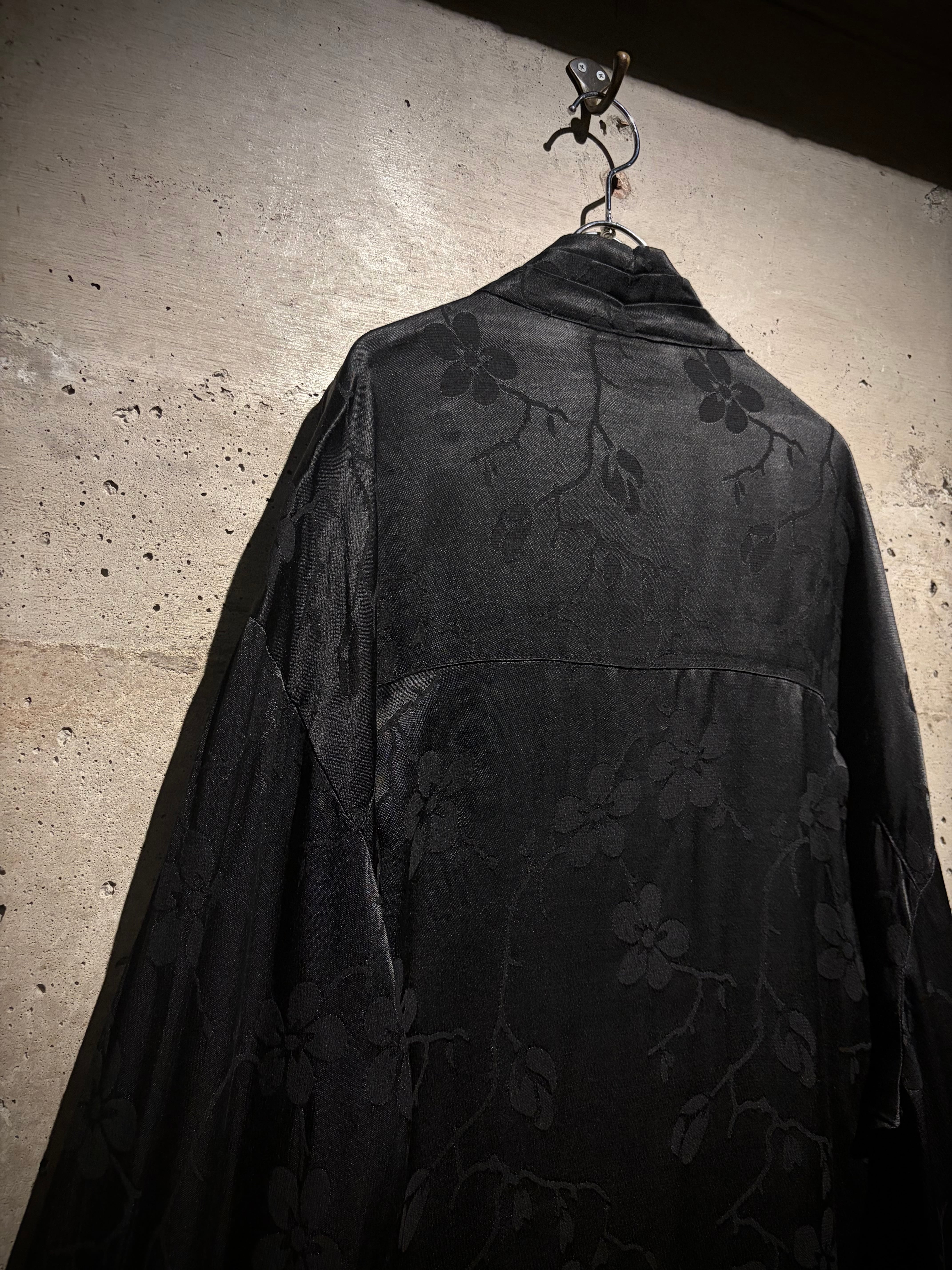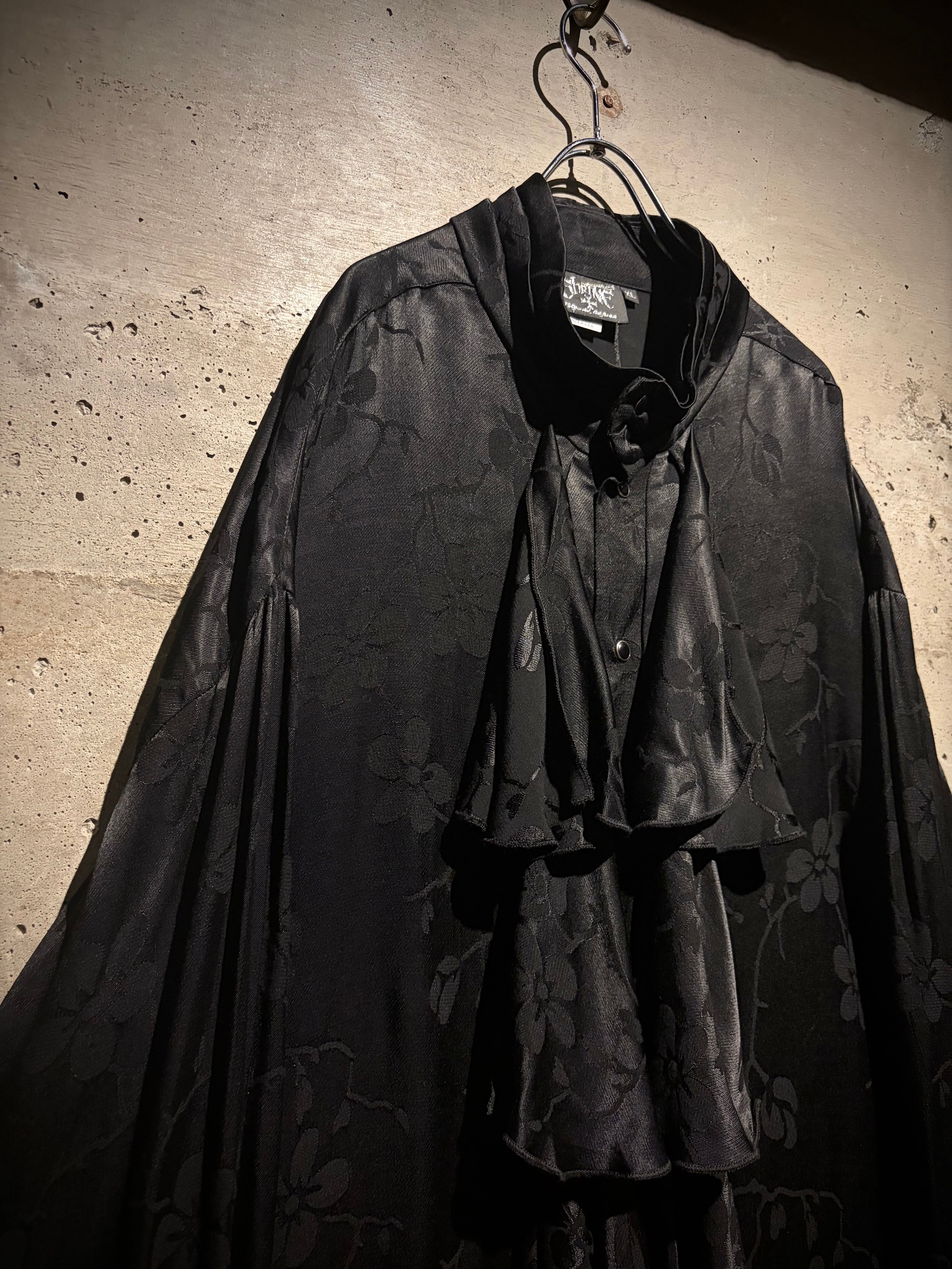 艶やかな光沢を帯びたブラックボディに、ジャガード織りによる美しい花を全面に載せ、ラッフルによる装飾を施した稀有な長袖シャツ。