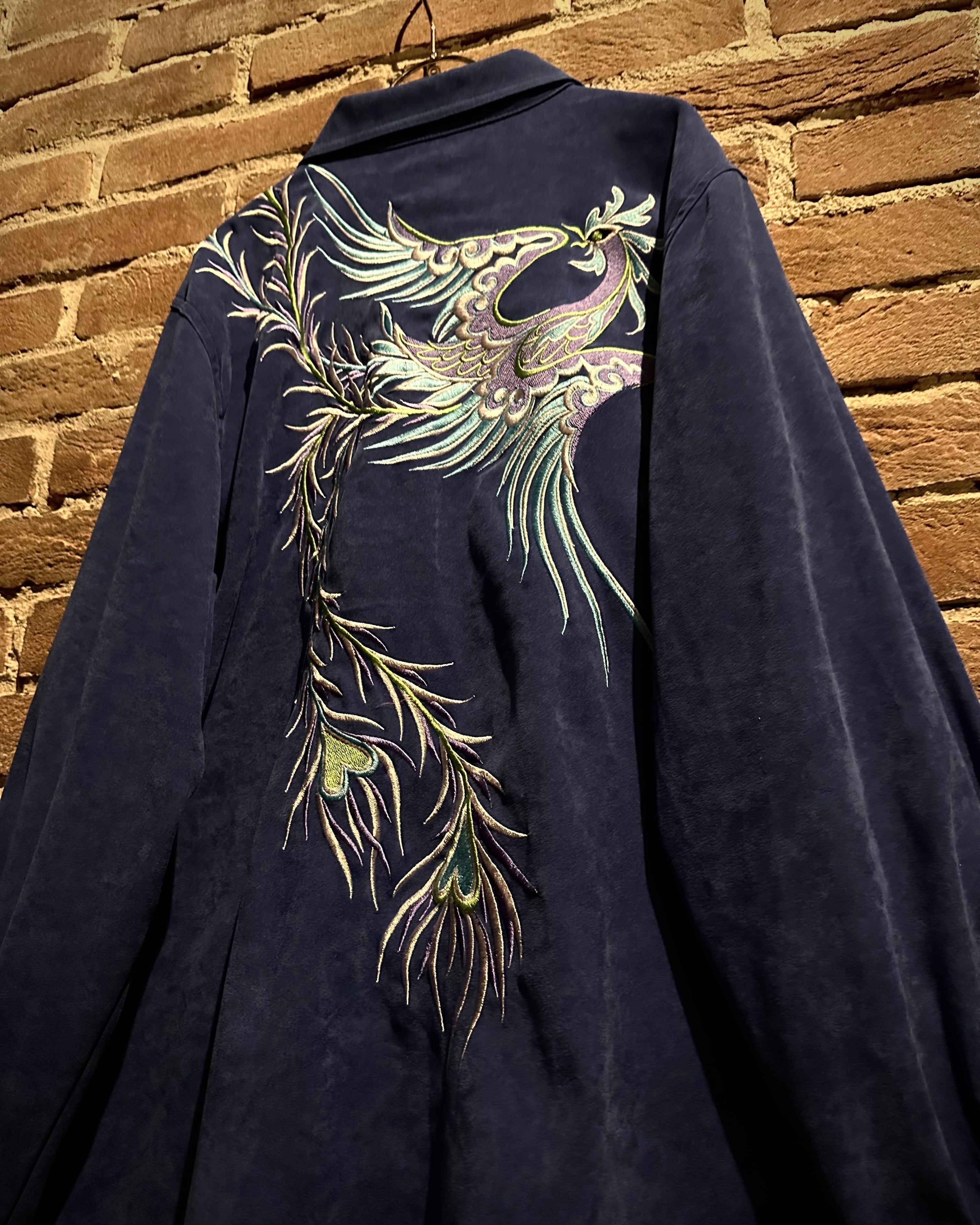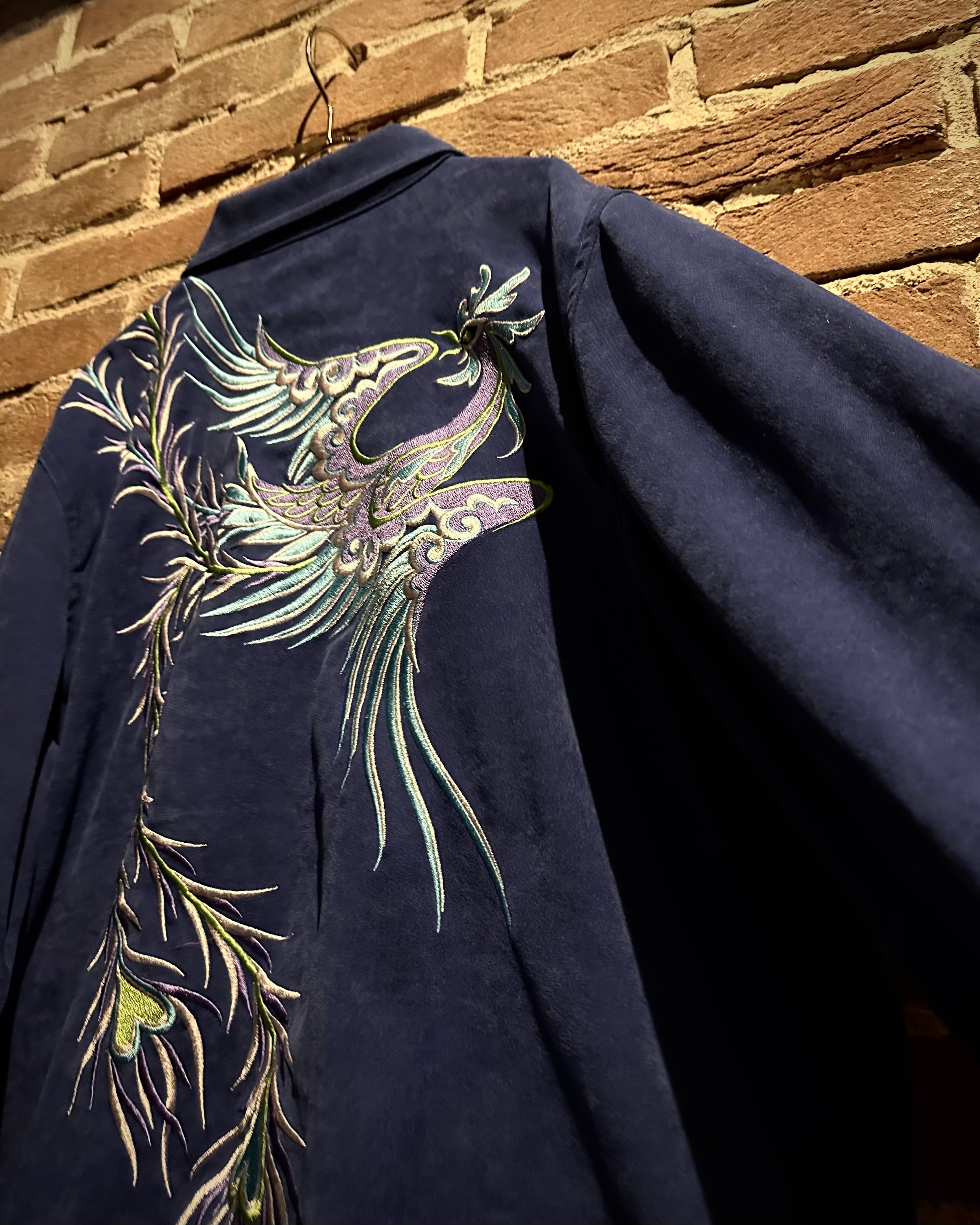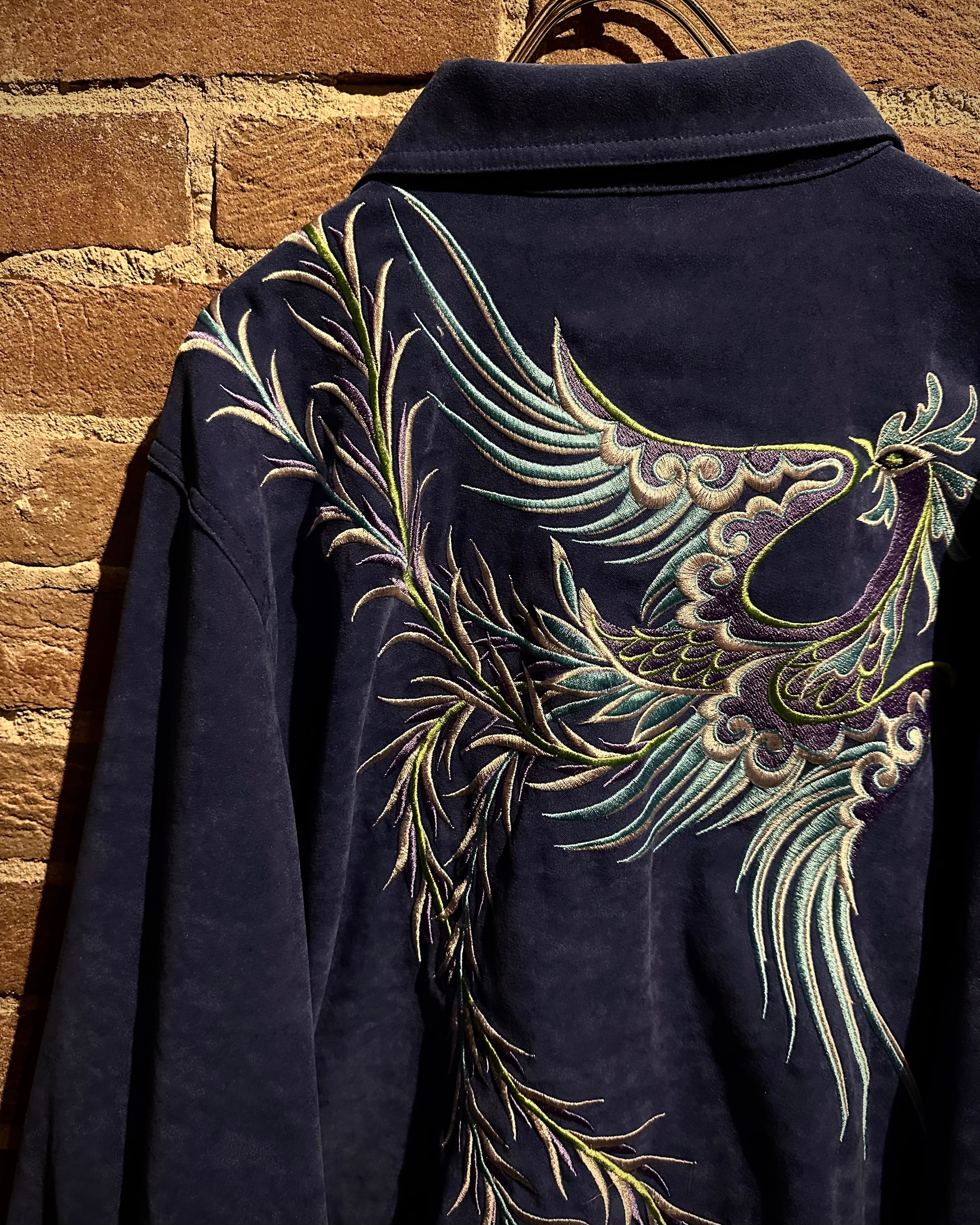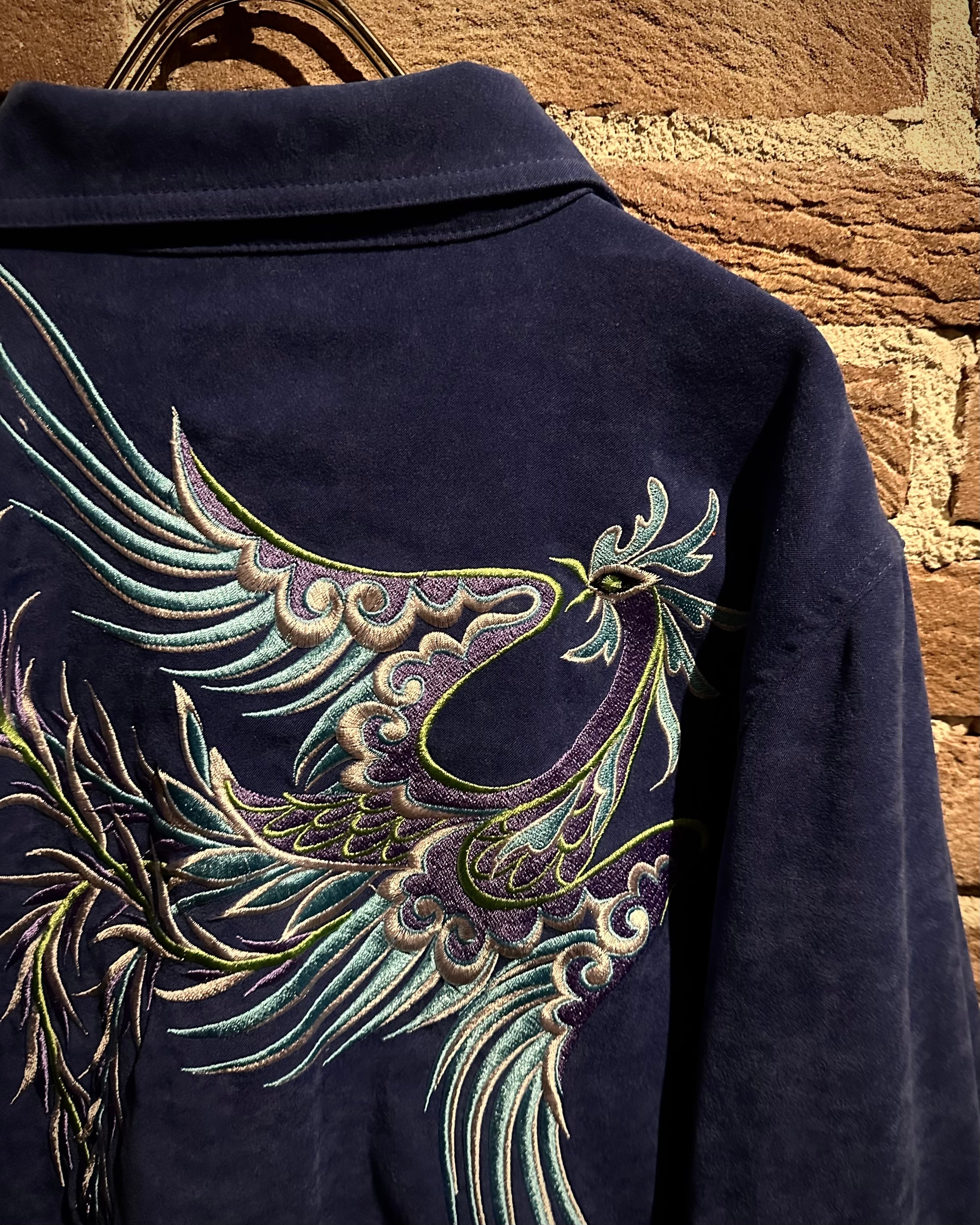 落ち感の美しい上質な素材に、緻密で美しい鳳凰の刺繍が前身頃から後ろ身頃に渡って施されたジップアップジャケット。