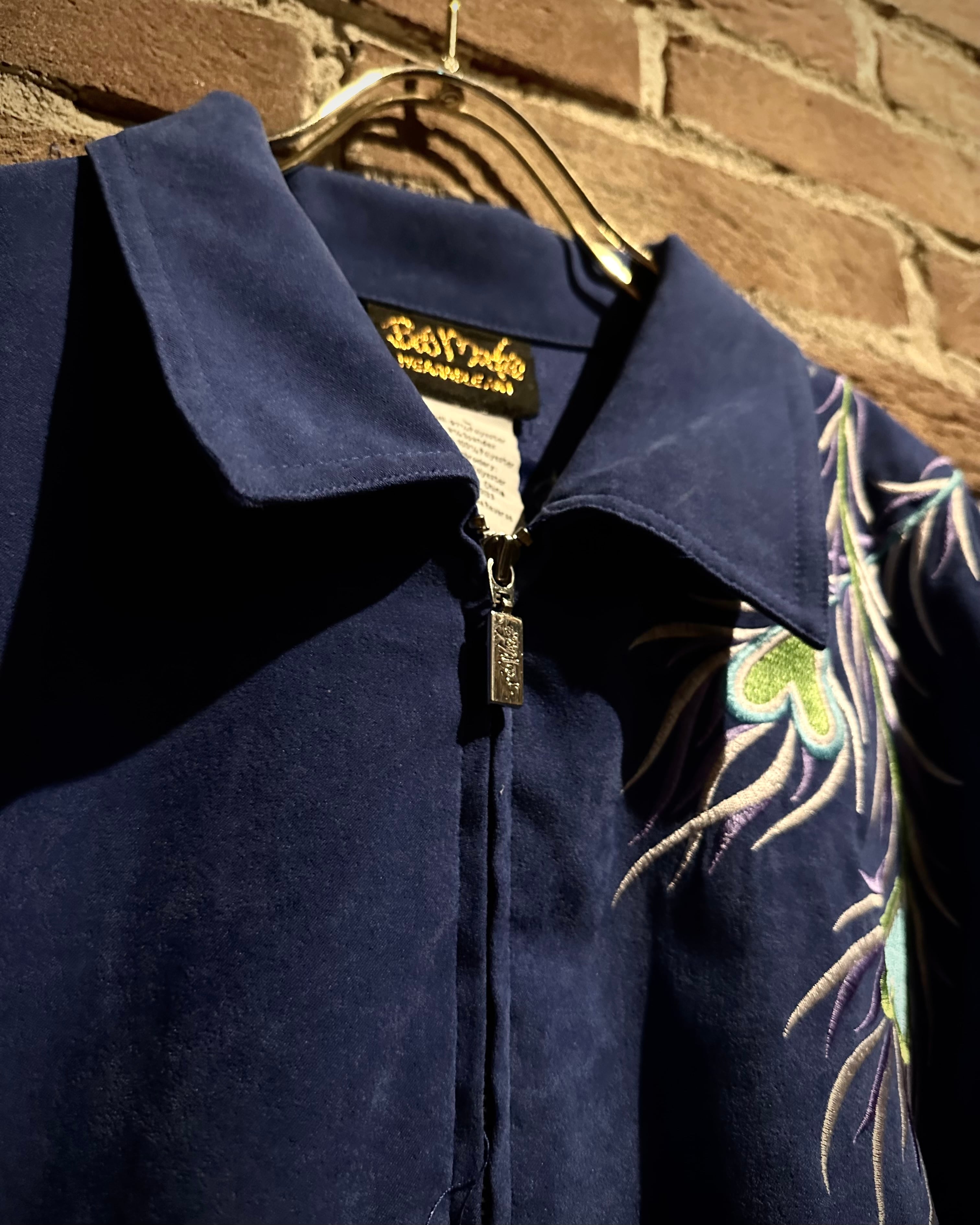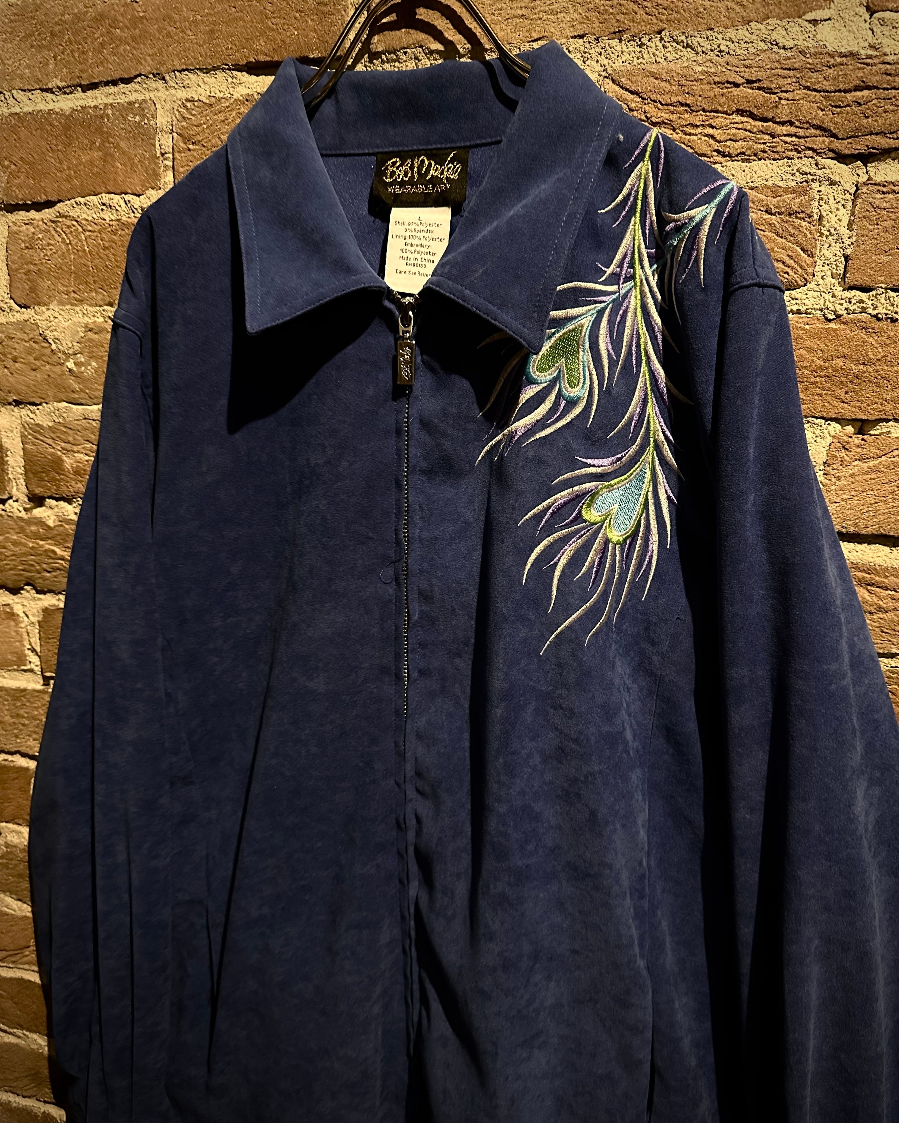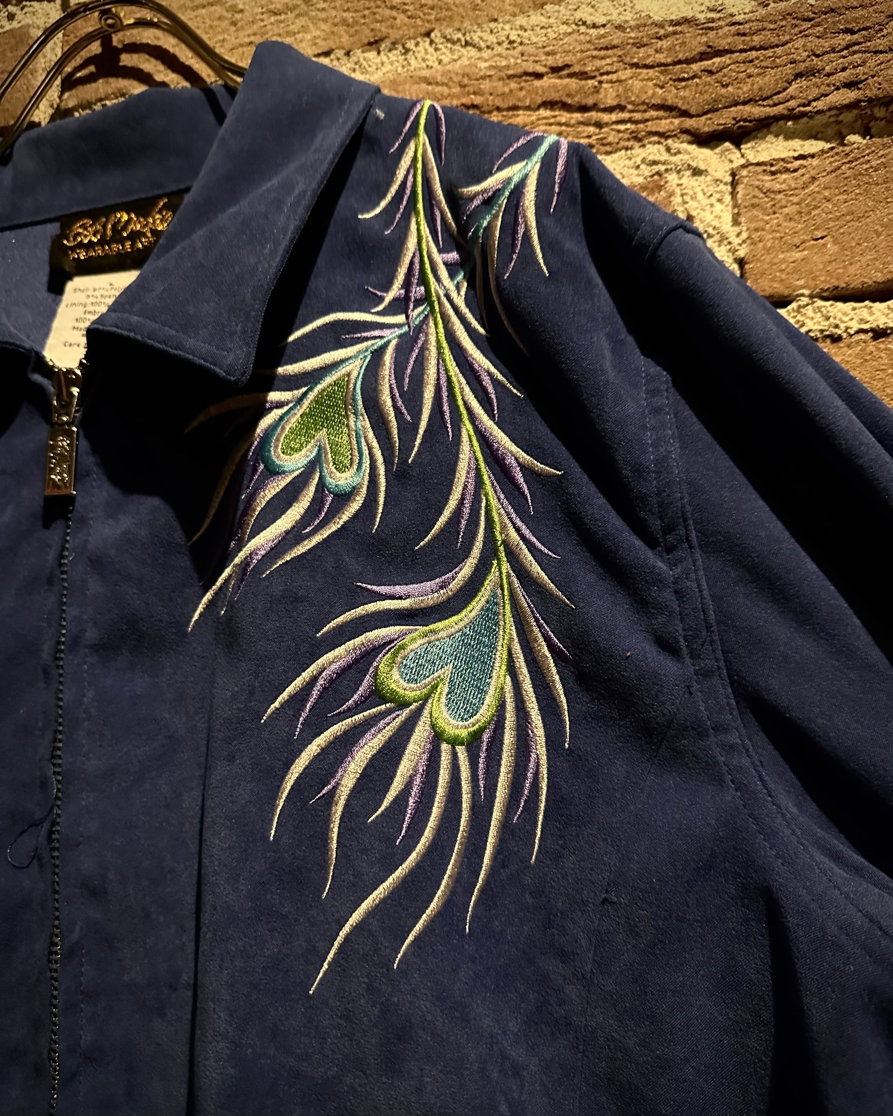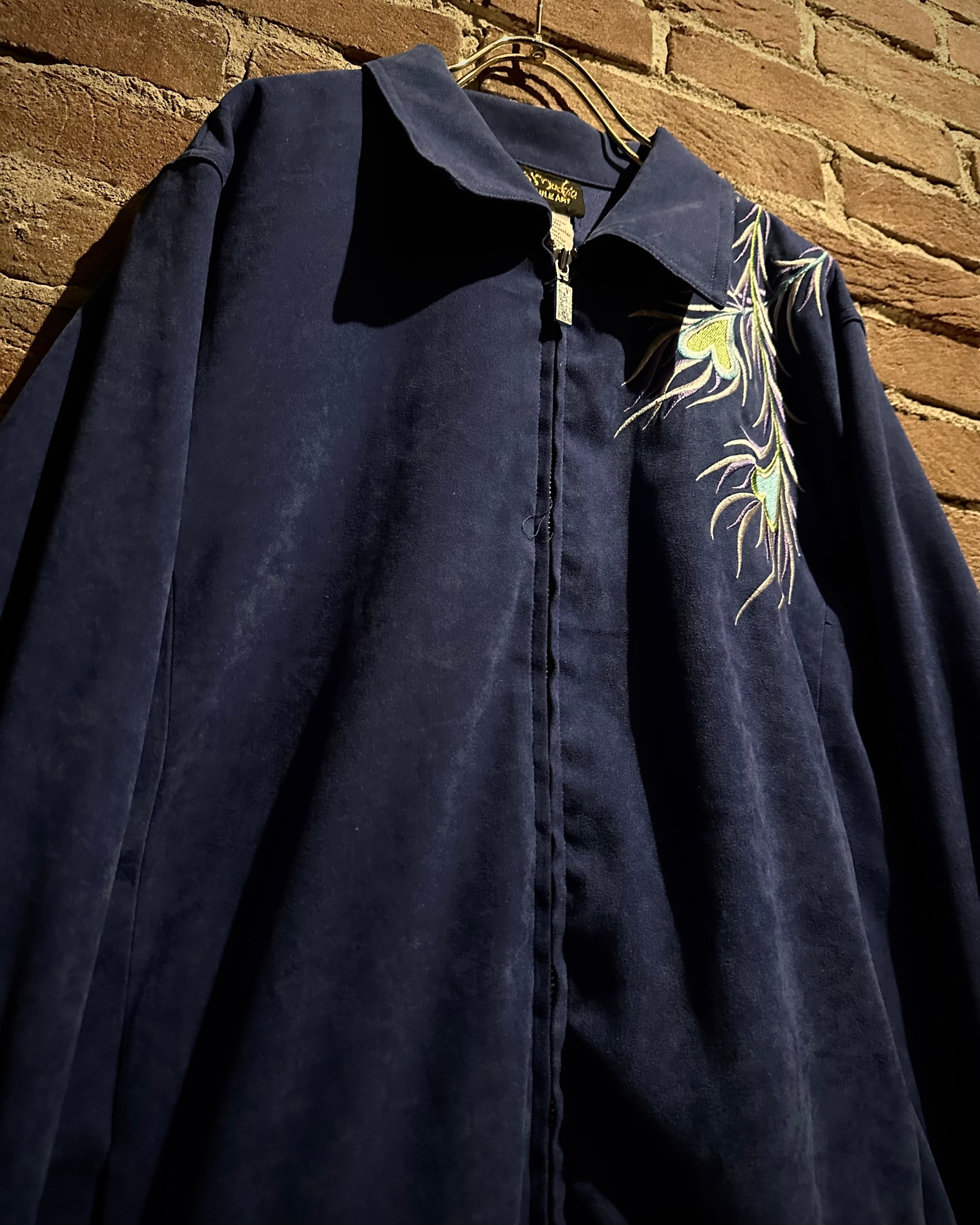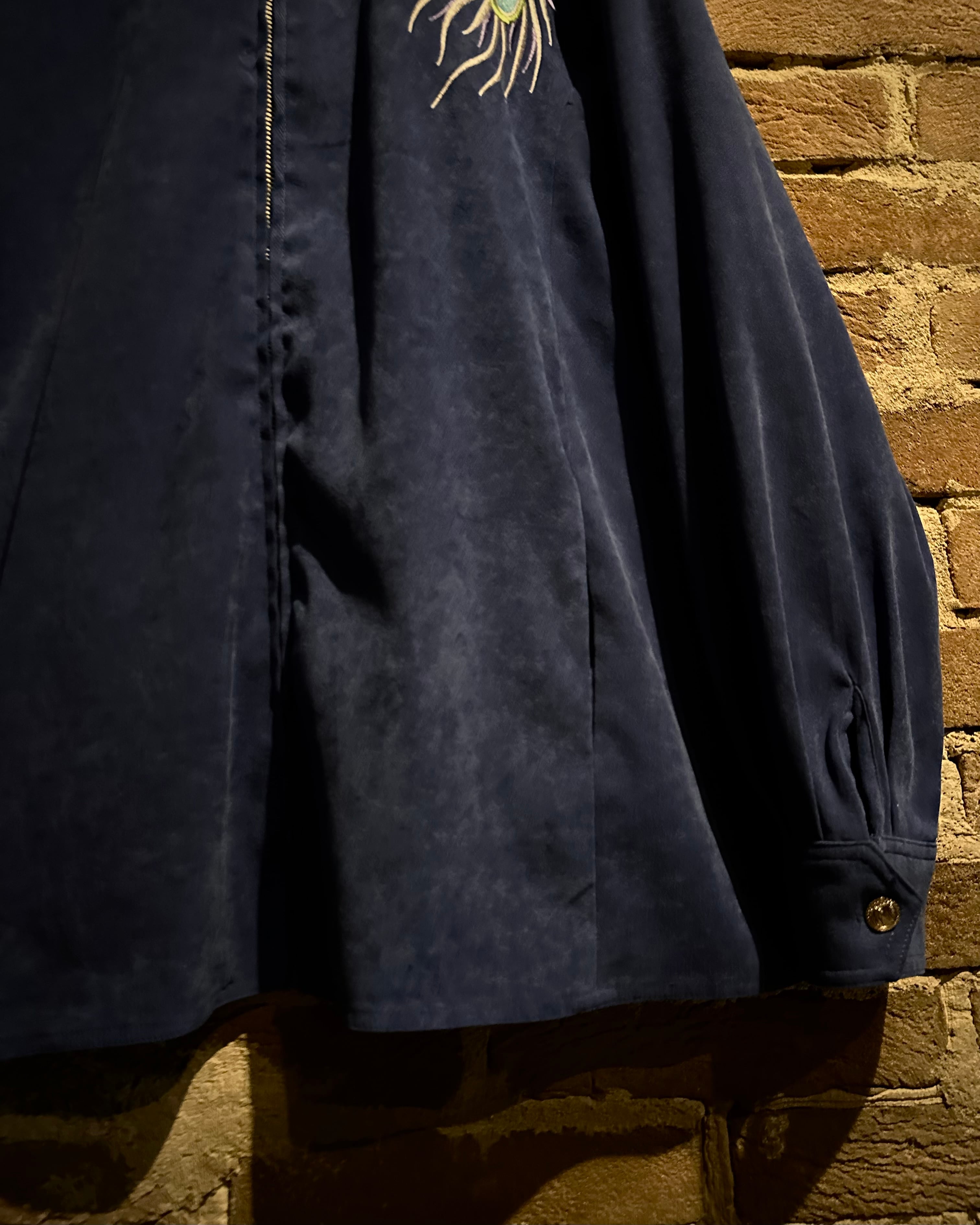 落ち感の美しい上質な素材に、緻密で美しい鳳凰の刺繍が前身頃から後ろ身頃に渡って施されたジップアップジャケット。