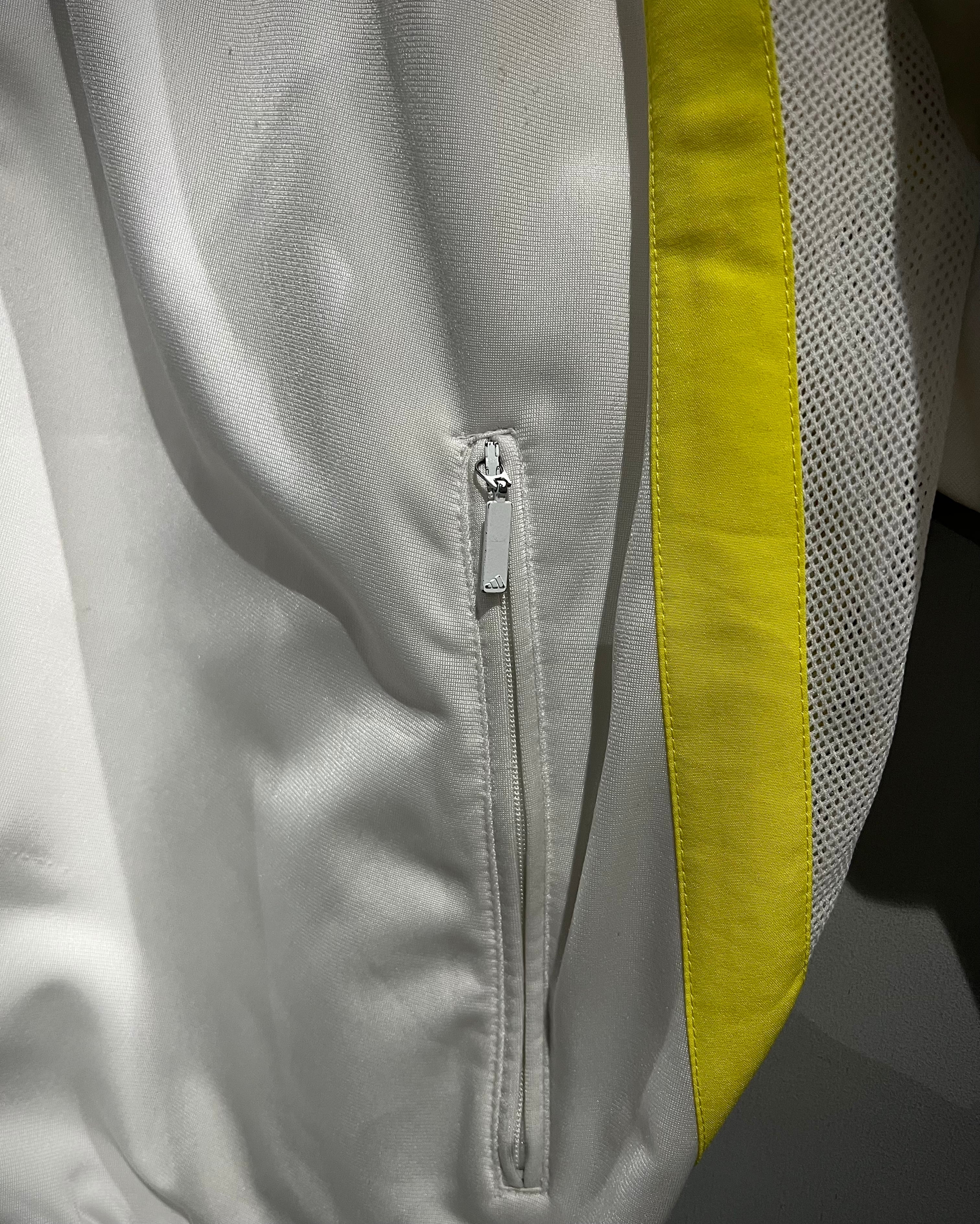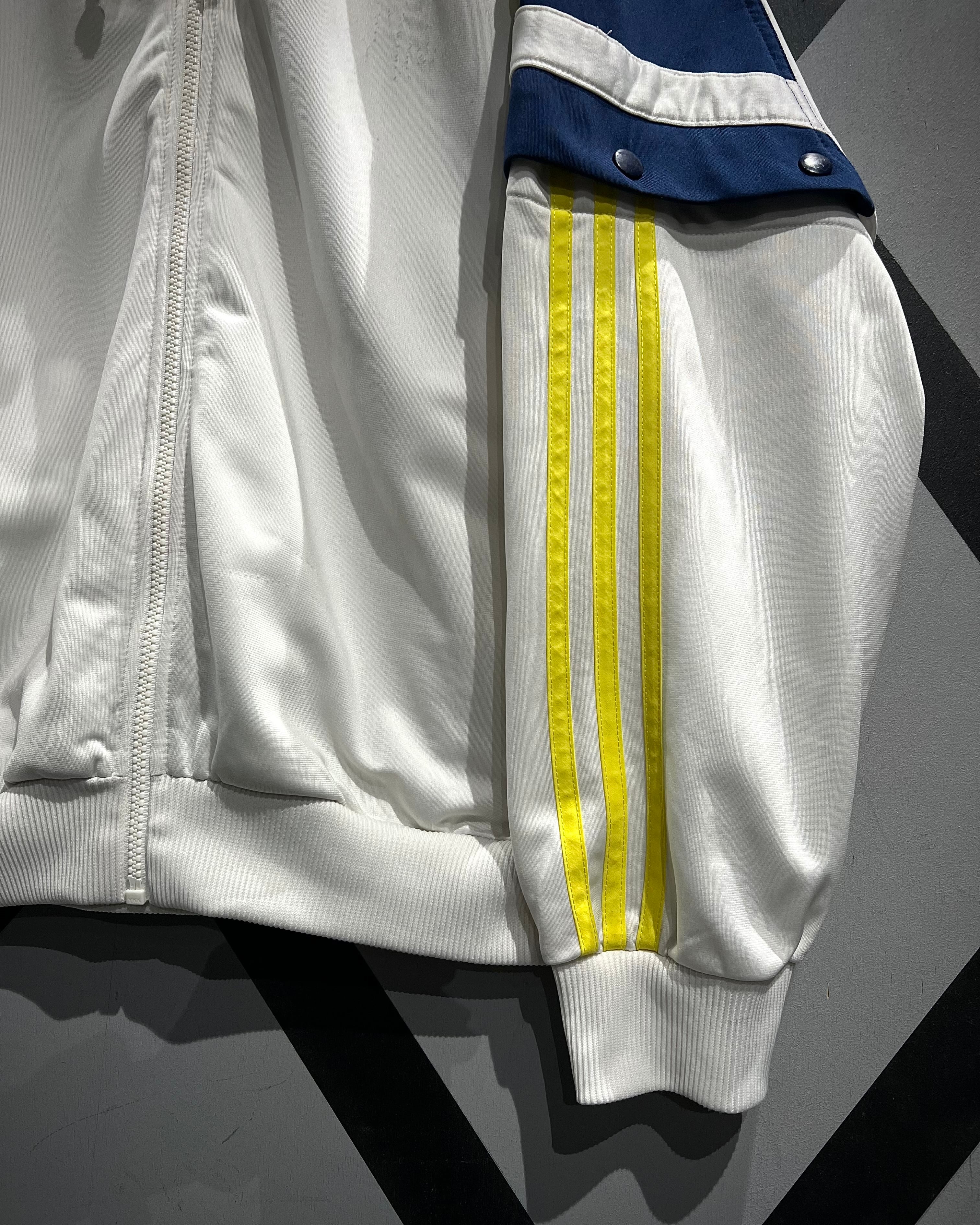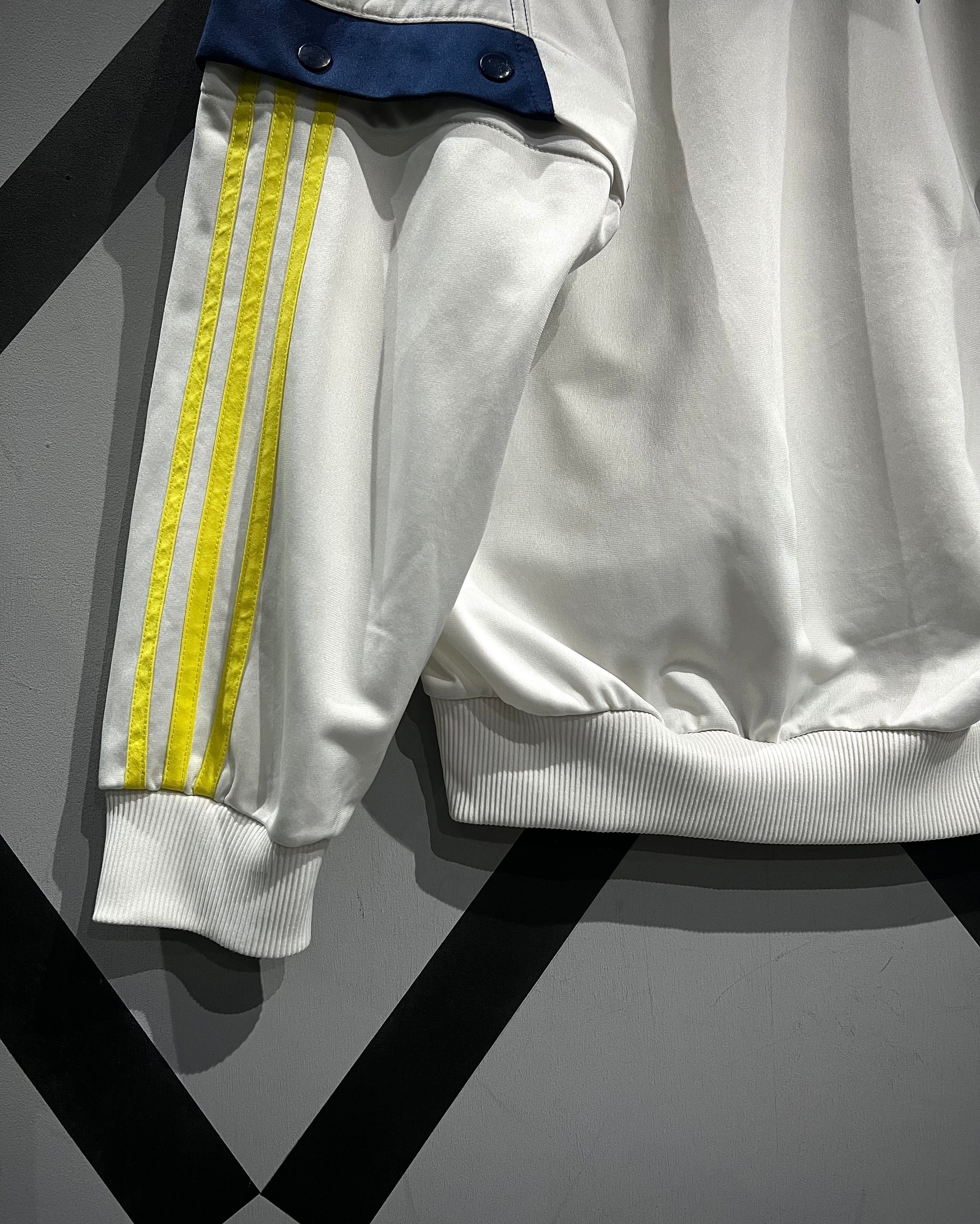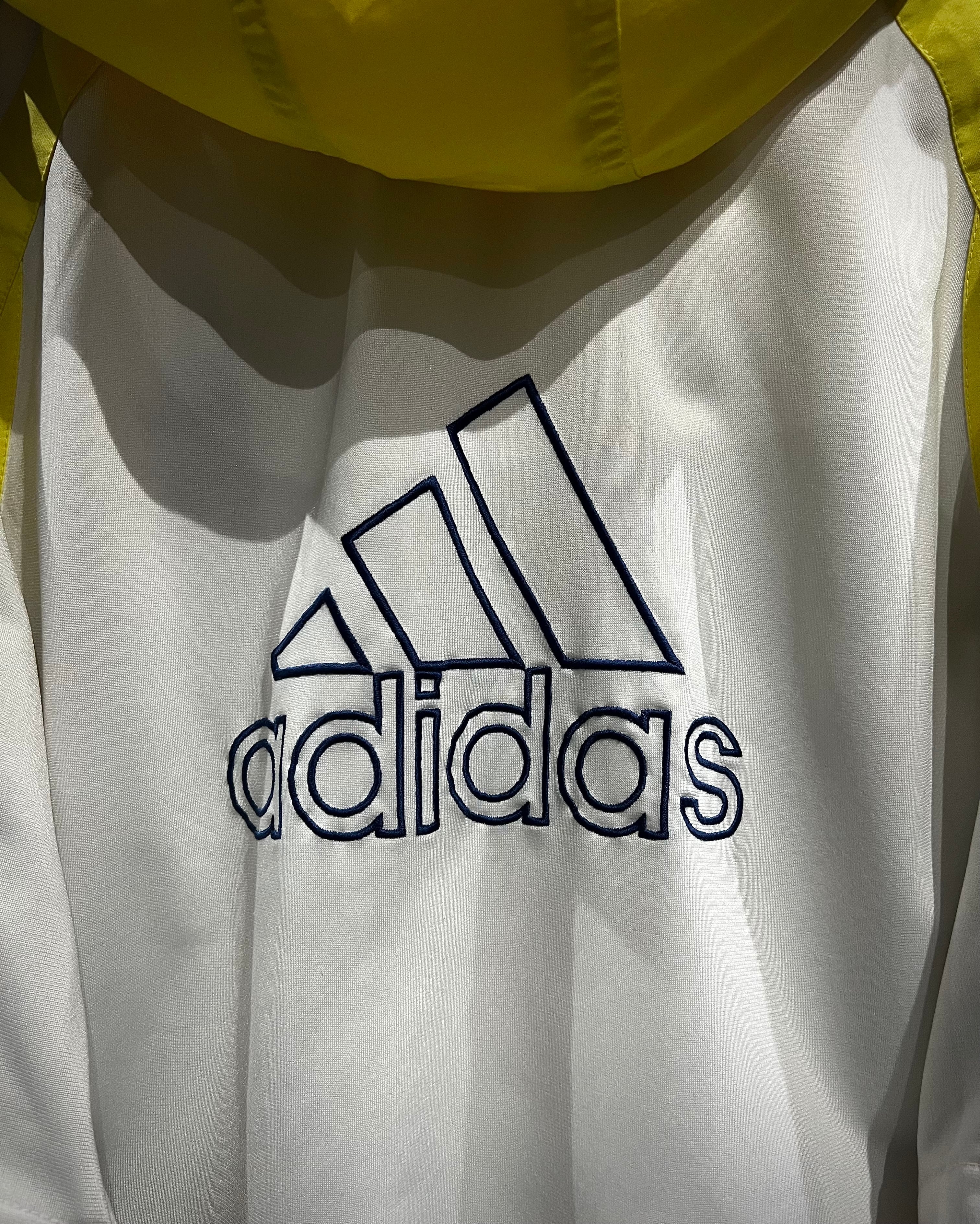 ホワイトをベースにイエローとネイビーの配色を切り替え、この年代ならではのデザインバランスが◎左胸と背面にはパフォーマンスロゴを配置し、ブランドのアイデンティティをしっかり主張。さらにアームやフードに走る3ストライプスが、adidasらしい象徴的なデザインを強調します。
