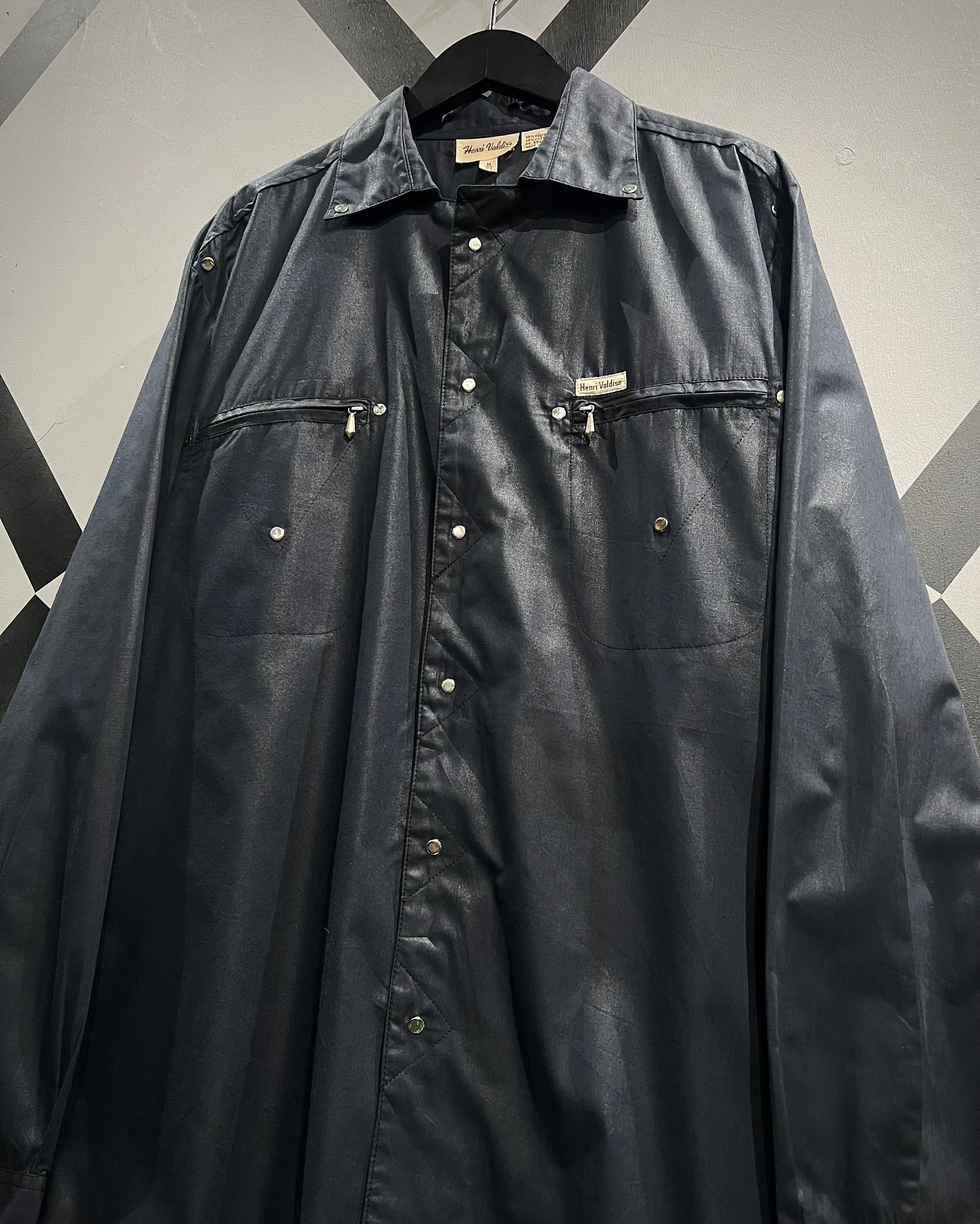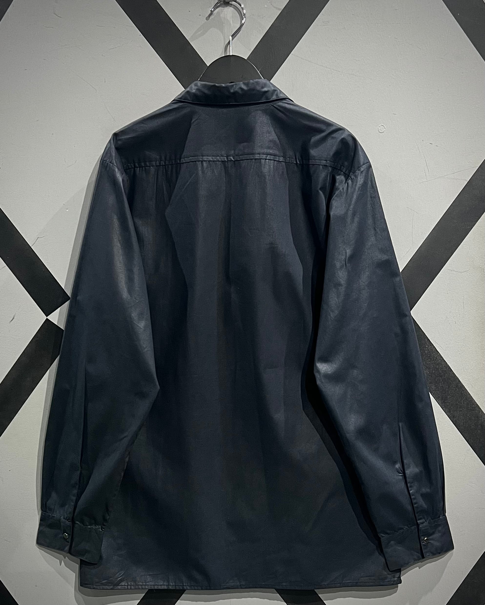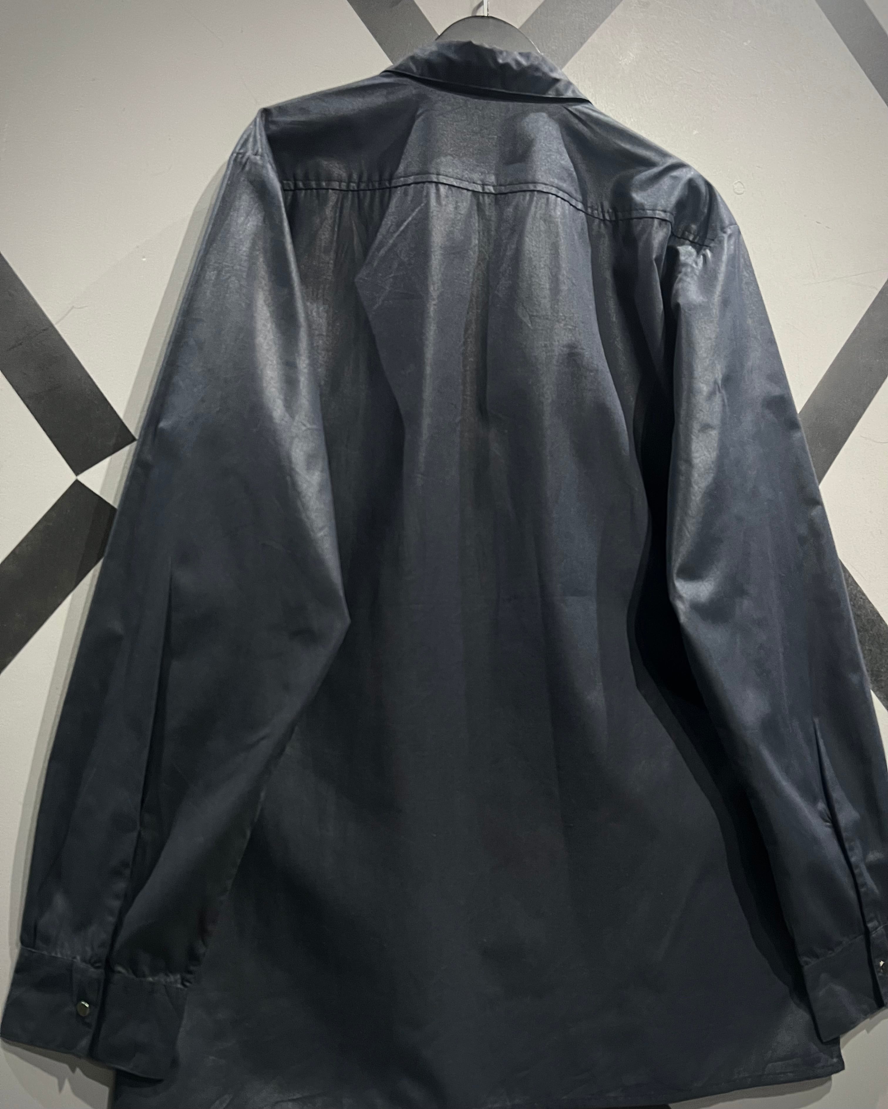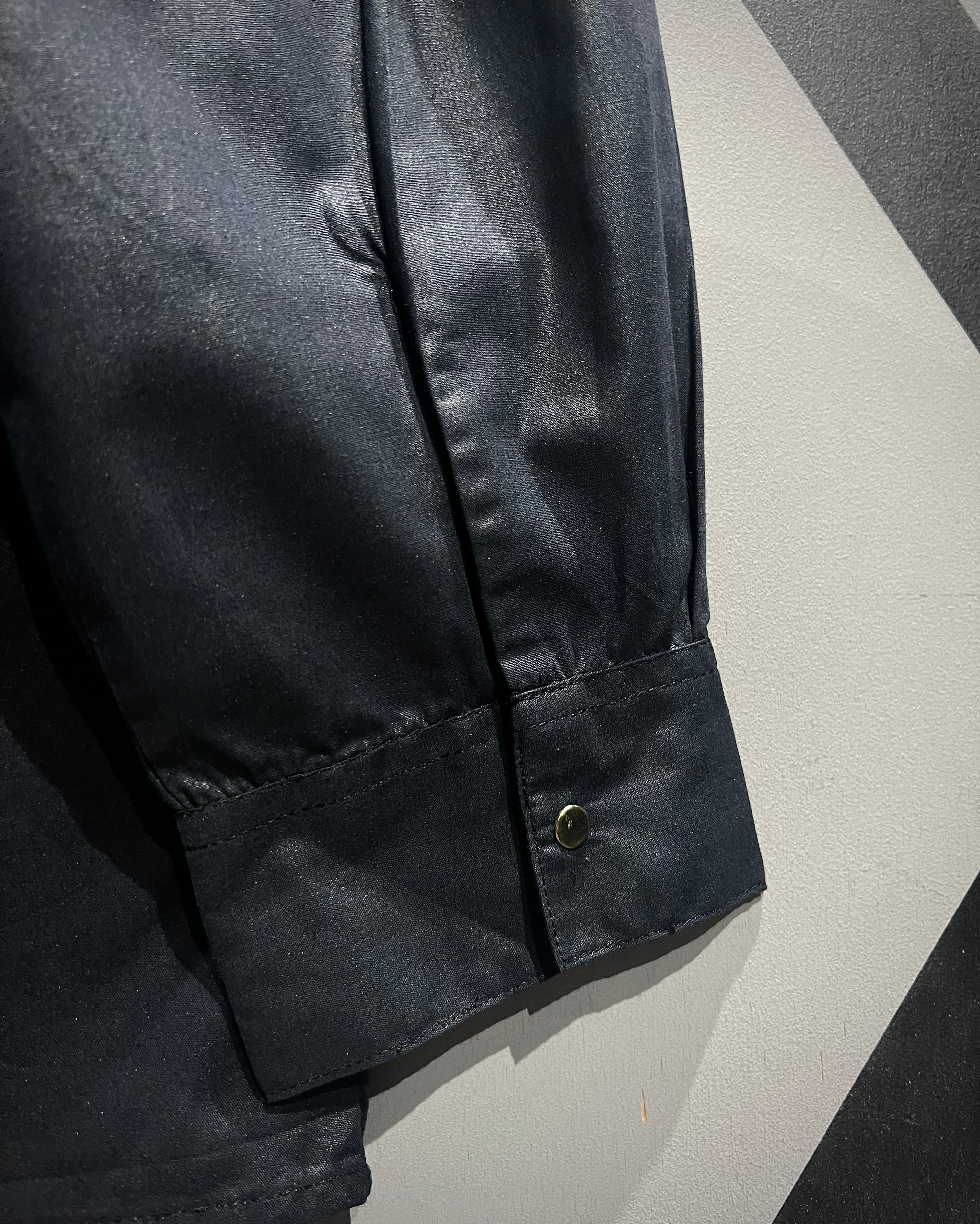 光沢感のあるブラックボディにシルバーパーツが映える、モードな雰囲気を纏った長袖シャツの逸品です。