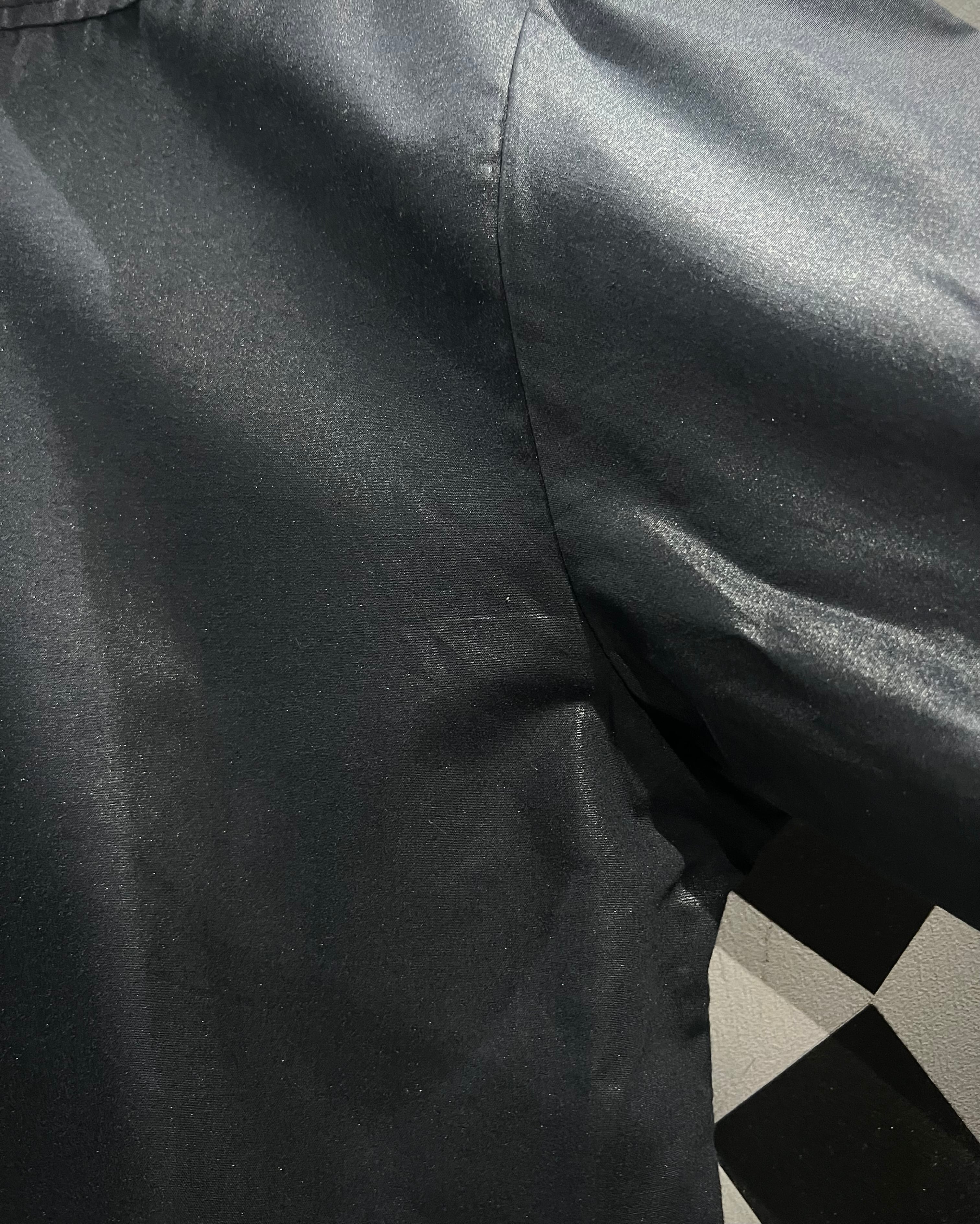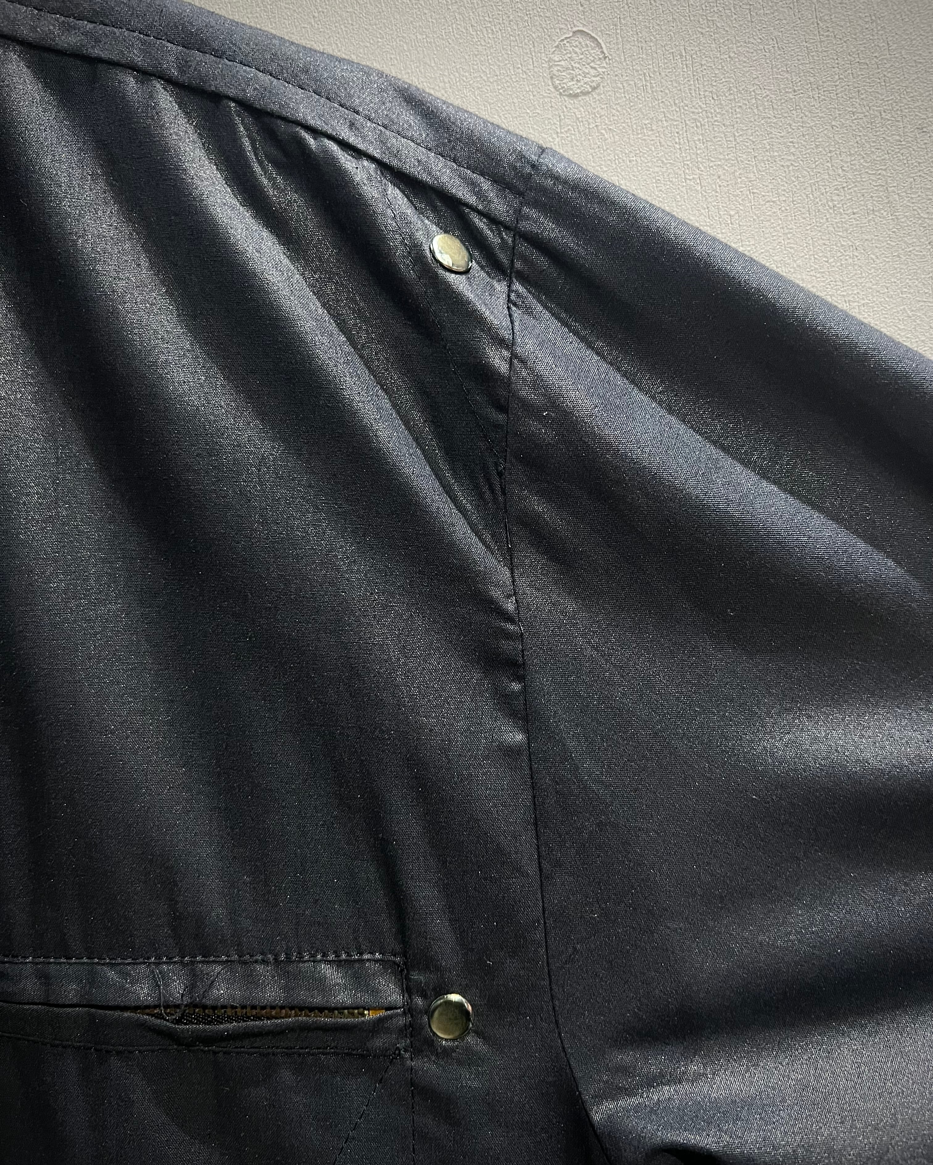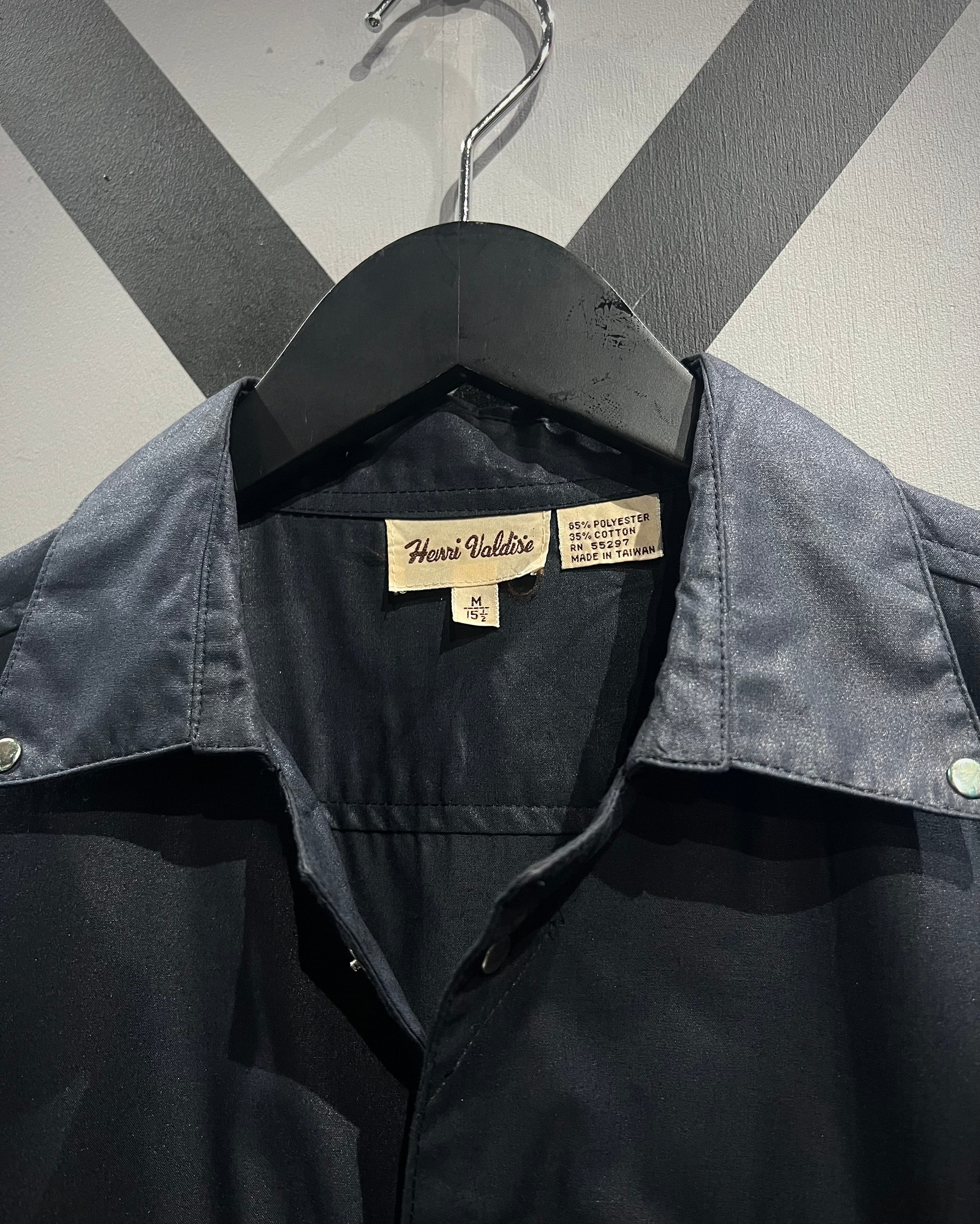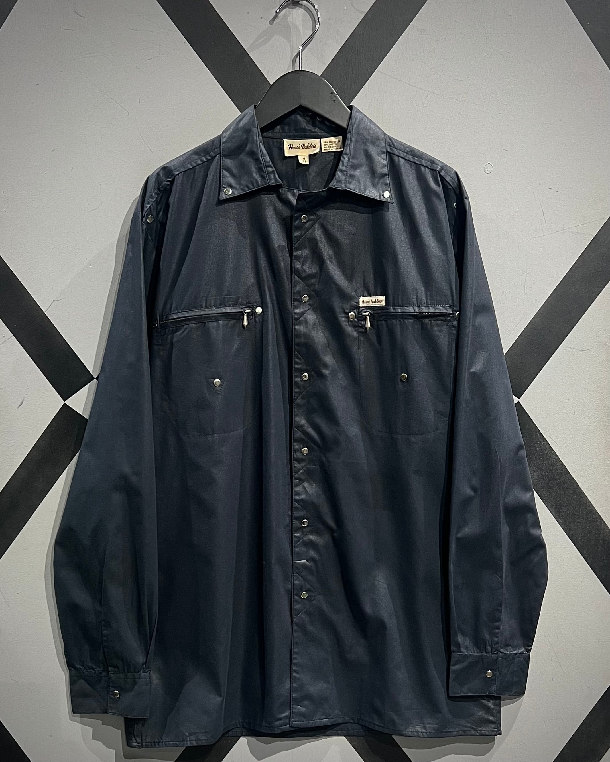 光沢感のあるブラックボディにシルバーパーツが映える、モードな雰囲気を纏った長袖シャツの逸品です。
