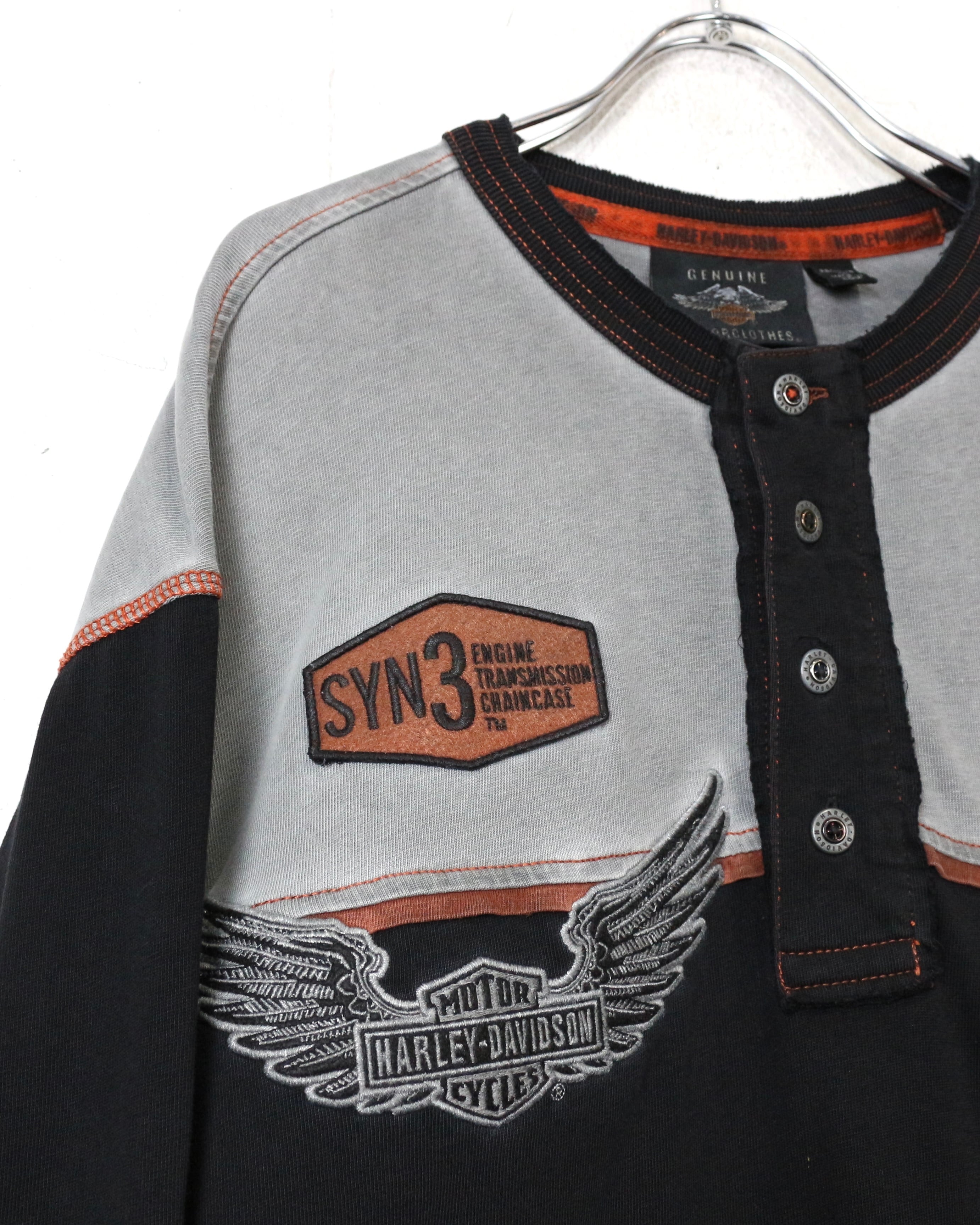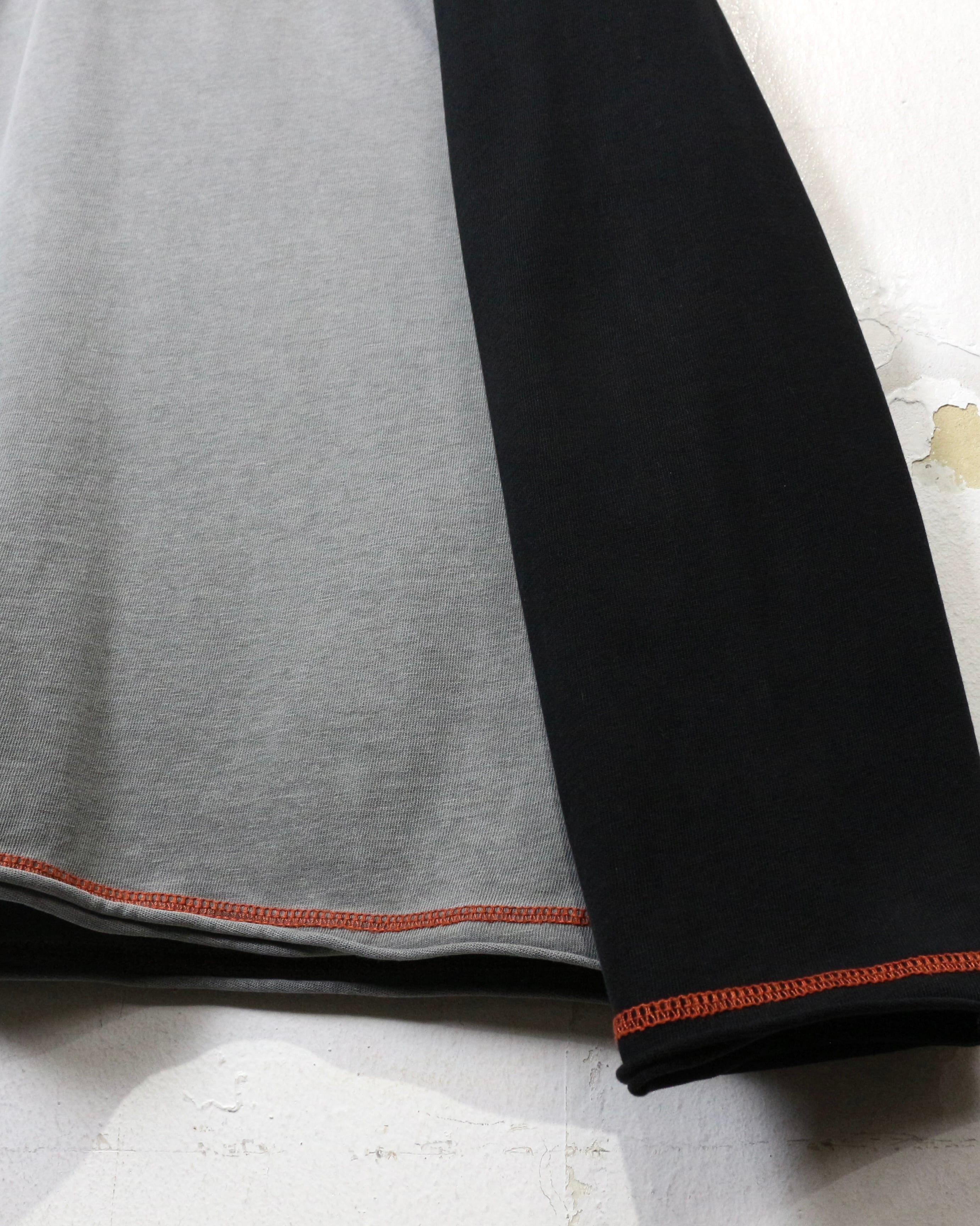 グレーのボディをベースにブラックの切り替えを効かせ、随所へ走るオレンジのラインやステッチがアクセントになったヘンリーネックのロンT。