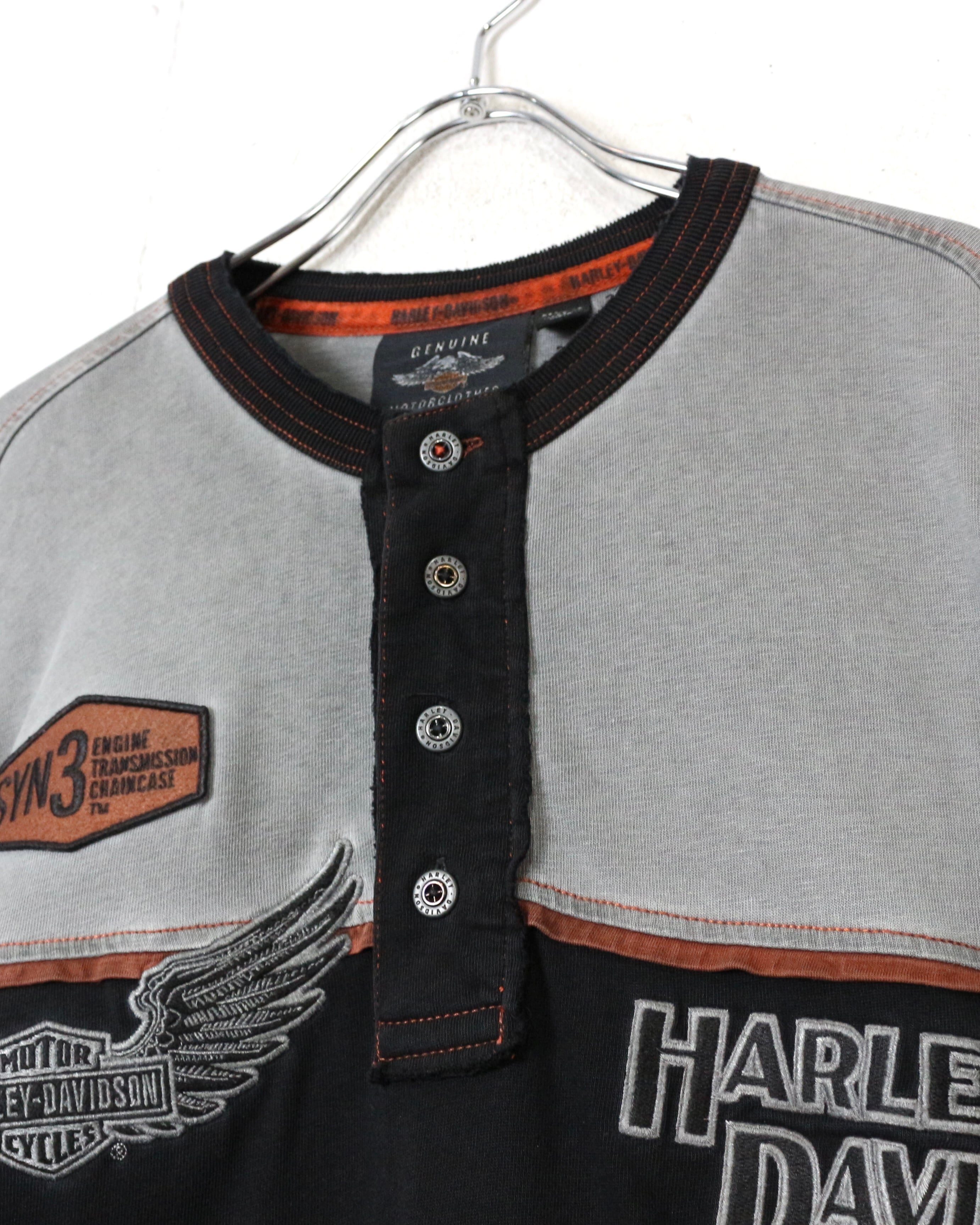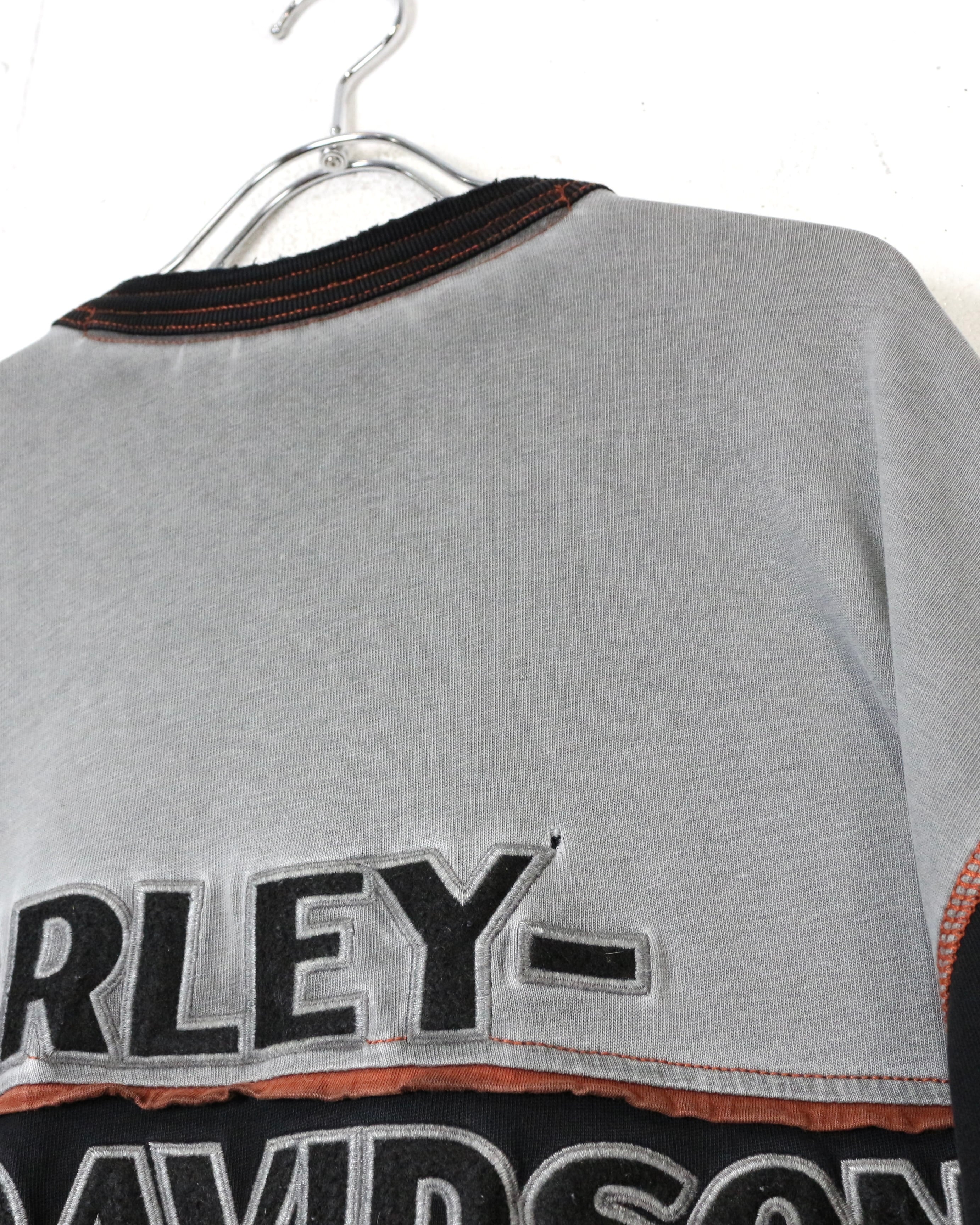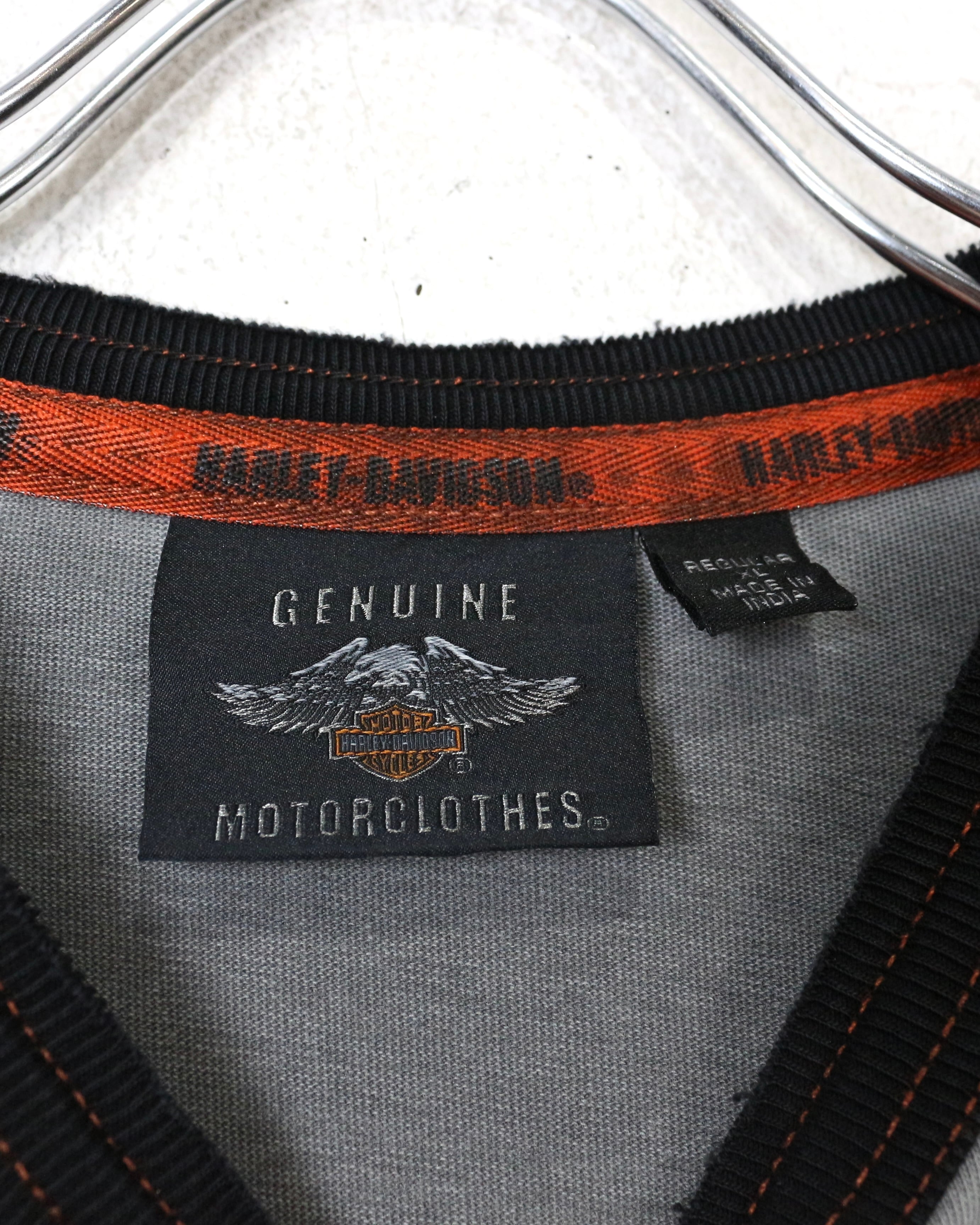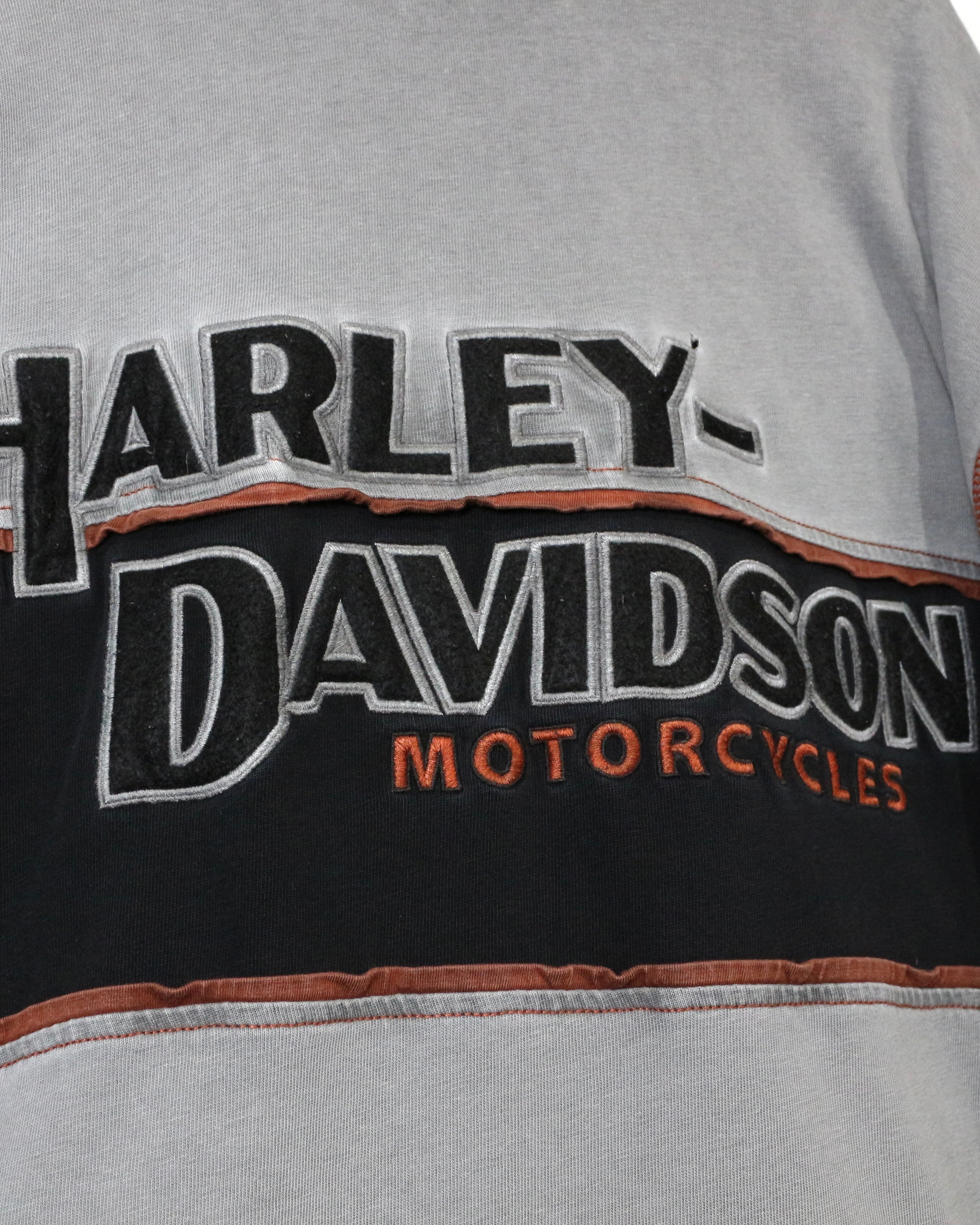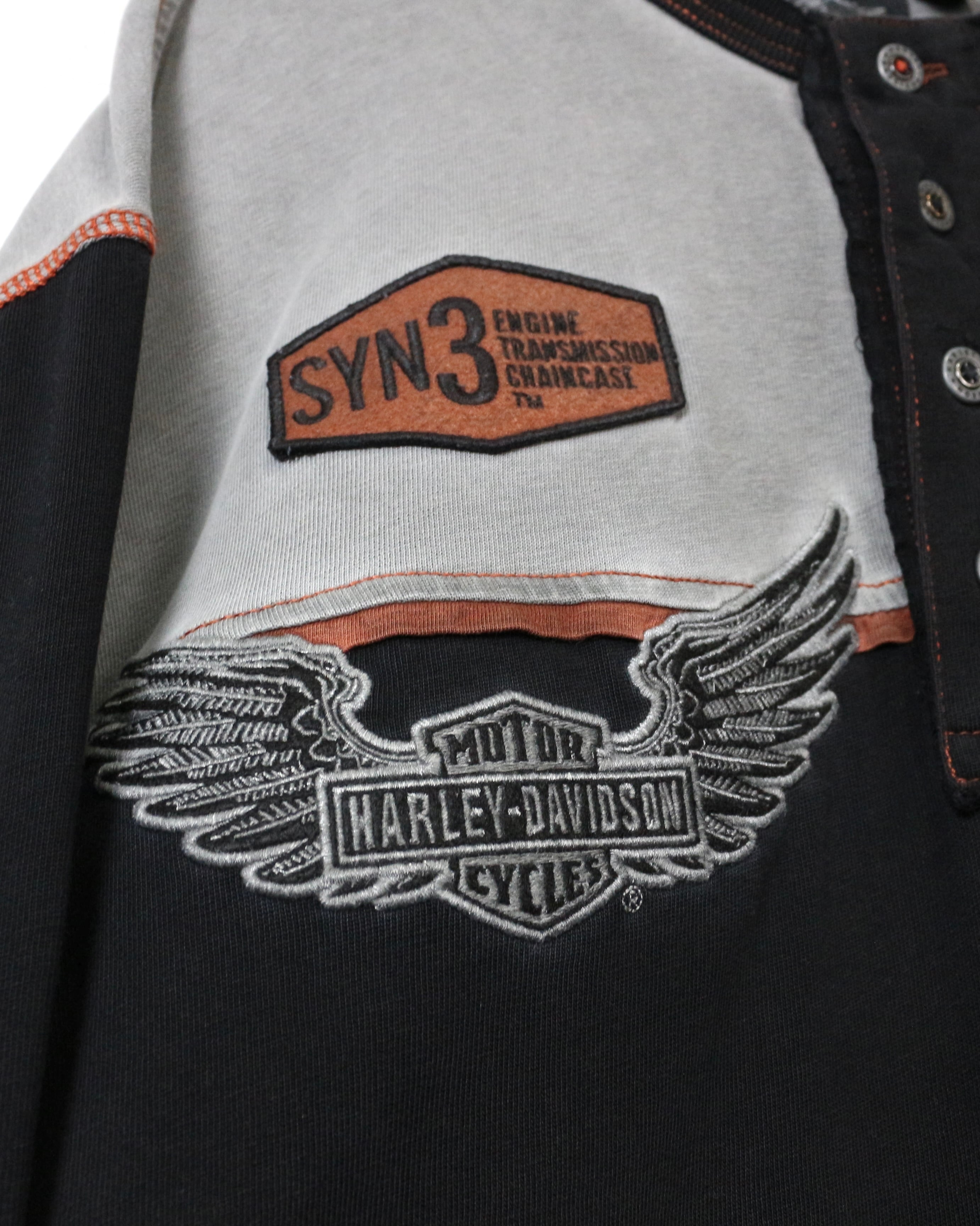 フロント、バック、アームにかけて配されたブランドロゴやネームロゴ、ワッペンデザインは、HARLEYらしいアイコニックなディテール。特にウィングロゴやナンバリングパッチなど、モーターカルチャーを色濃く感じさせる意匠が全体の完成度を引き上げています。