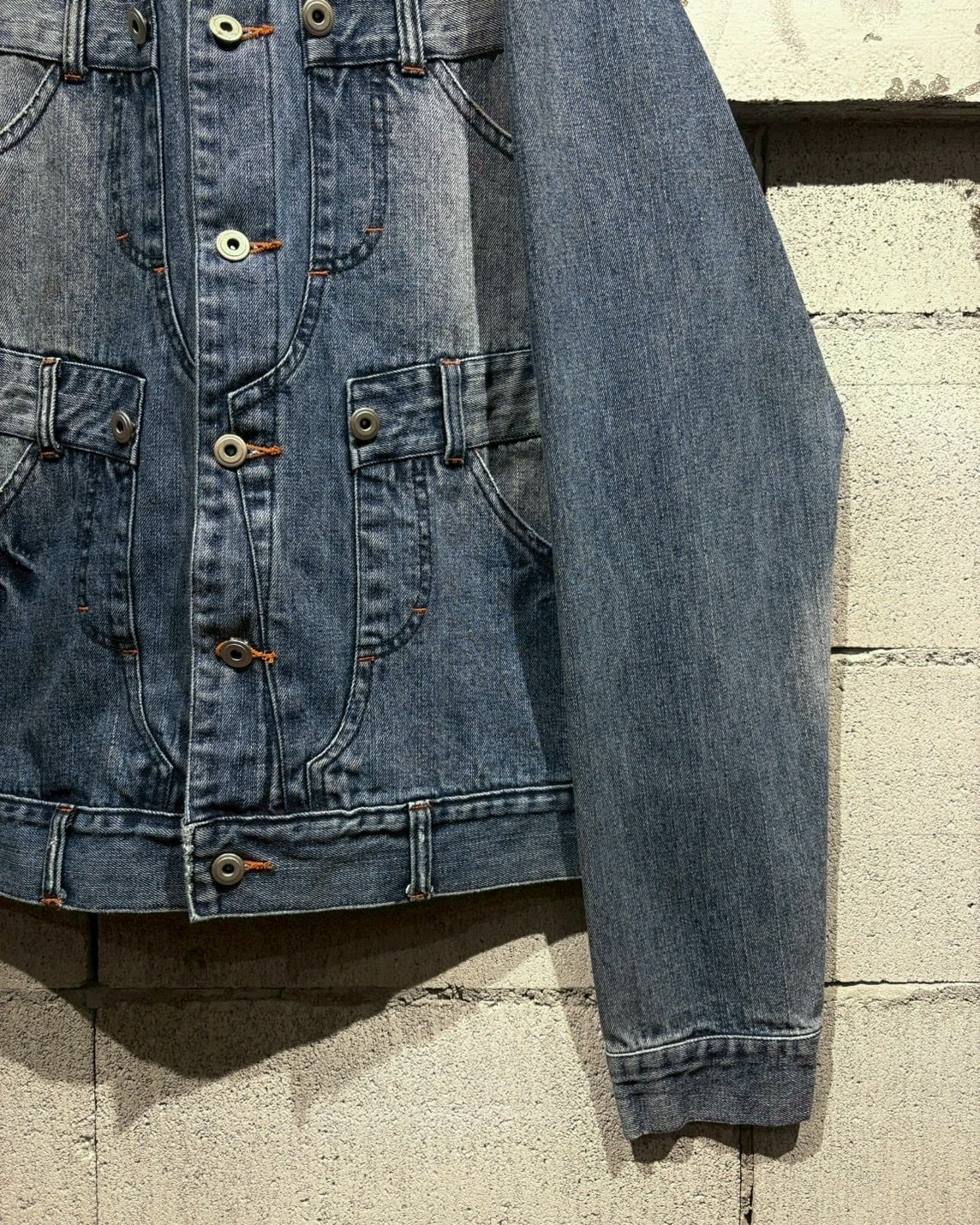 ベルトループにトップボタン、ポケット等々、デニムパンツのディテールをそのままデザインに落とし込んだ稀有なデニムジャケット。