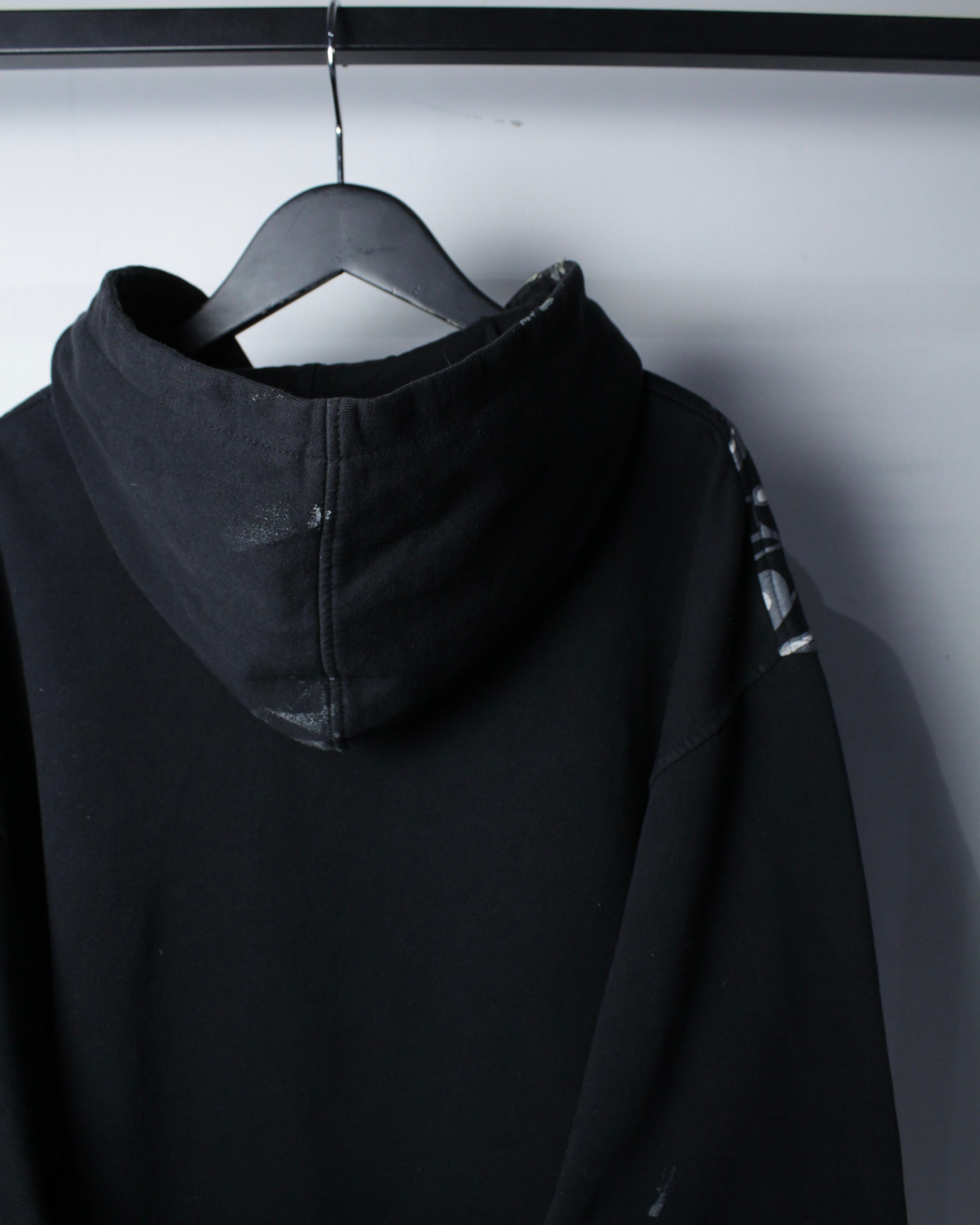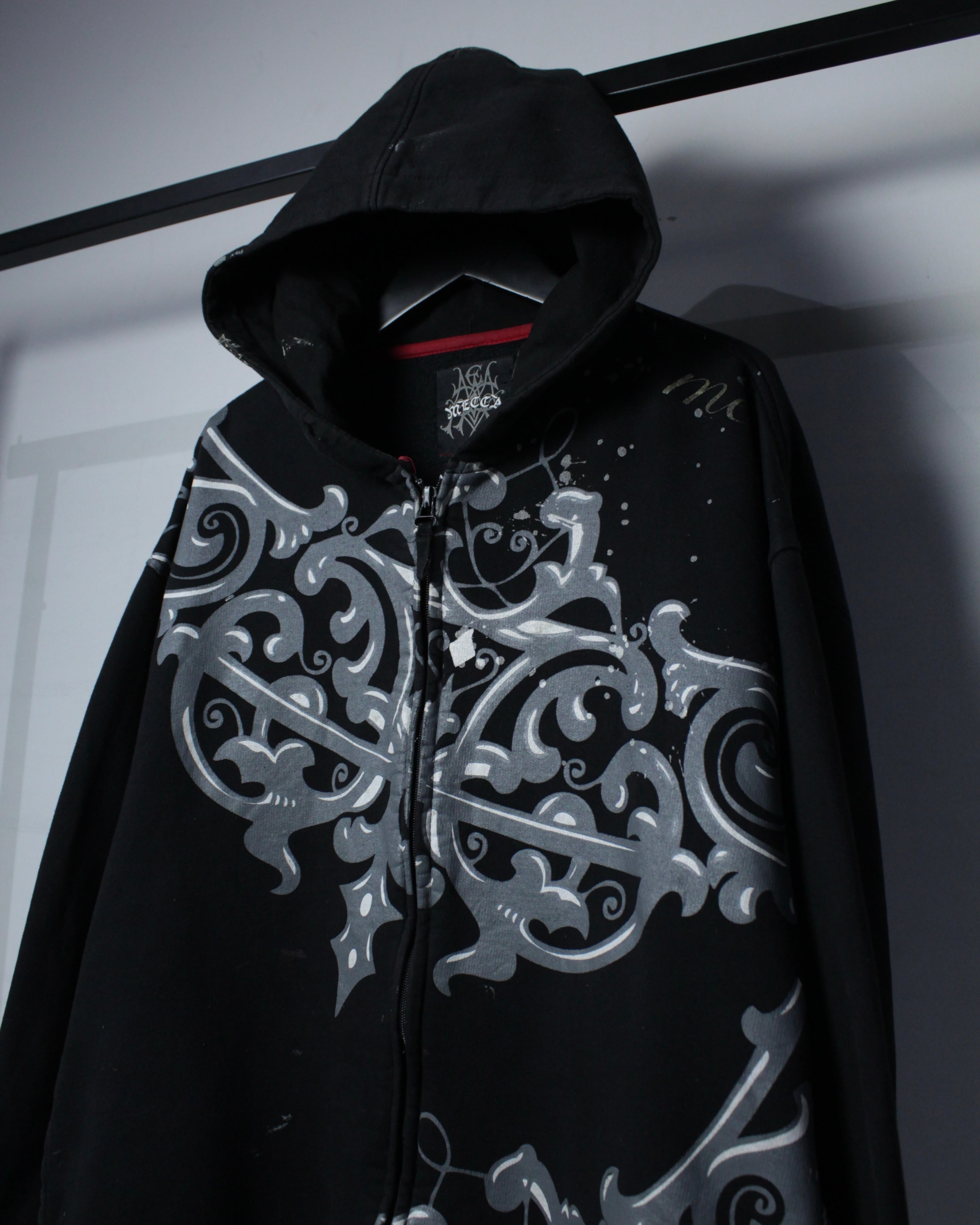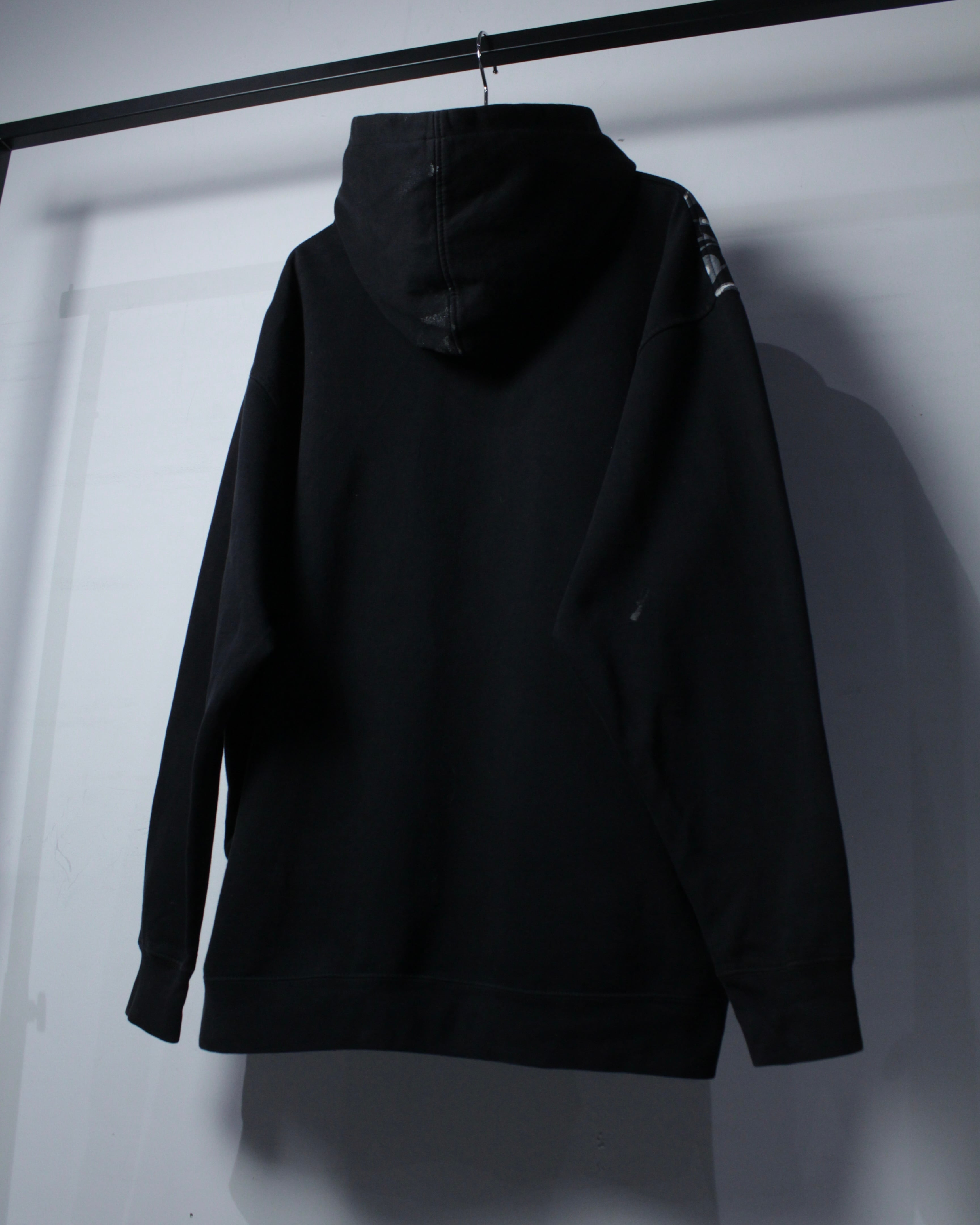 ブラックボディをベースに、フロントから裾にかけて大胆に施されたゴシック調のグラフィックが目を惹くジップアップフーディ。