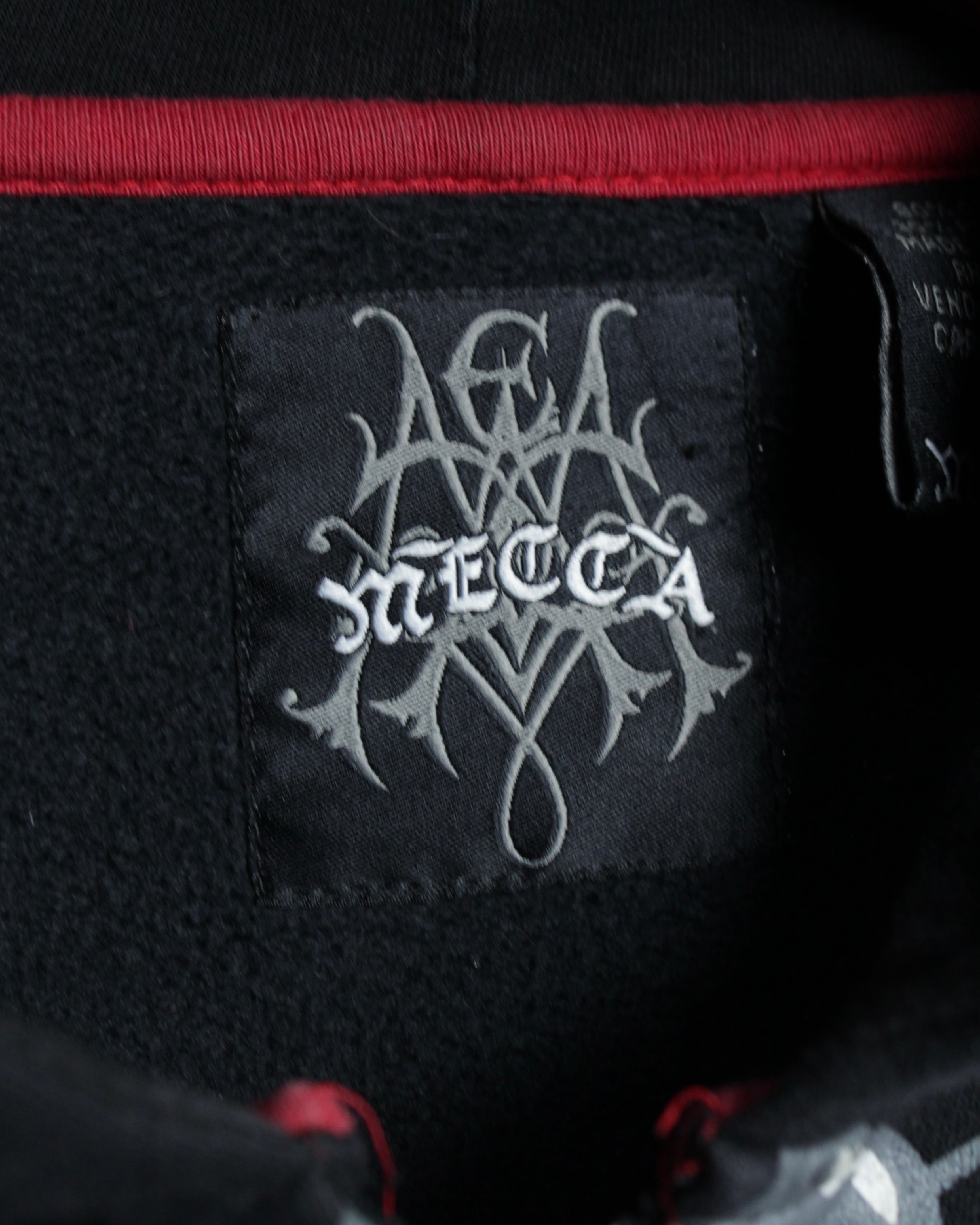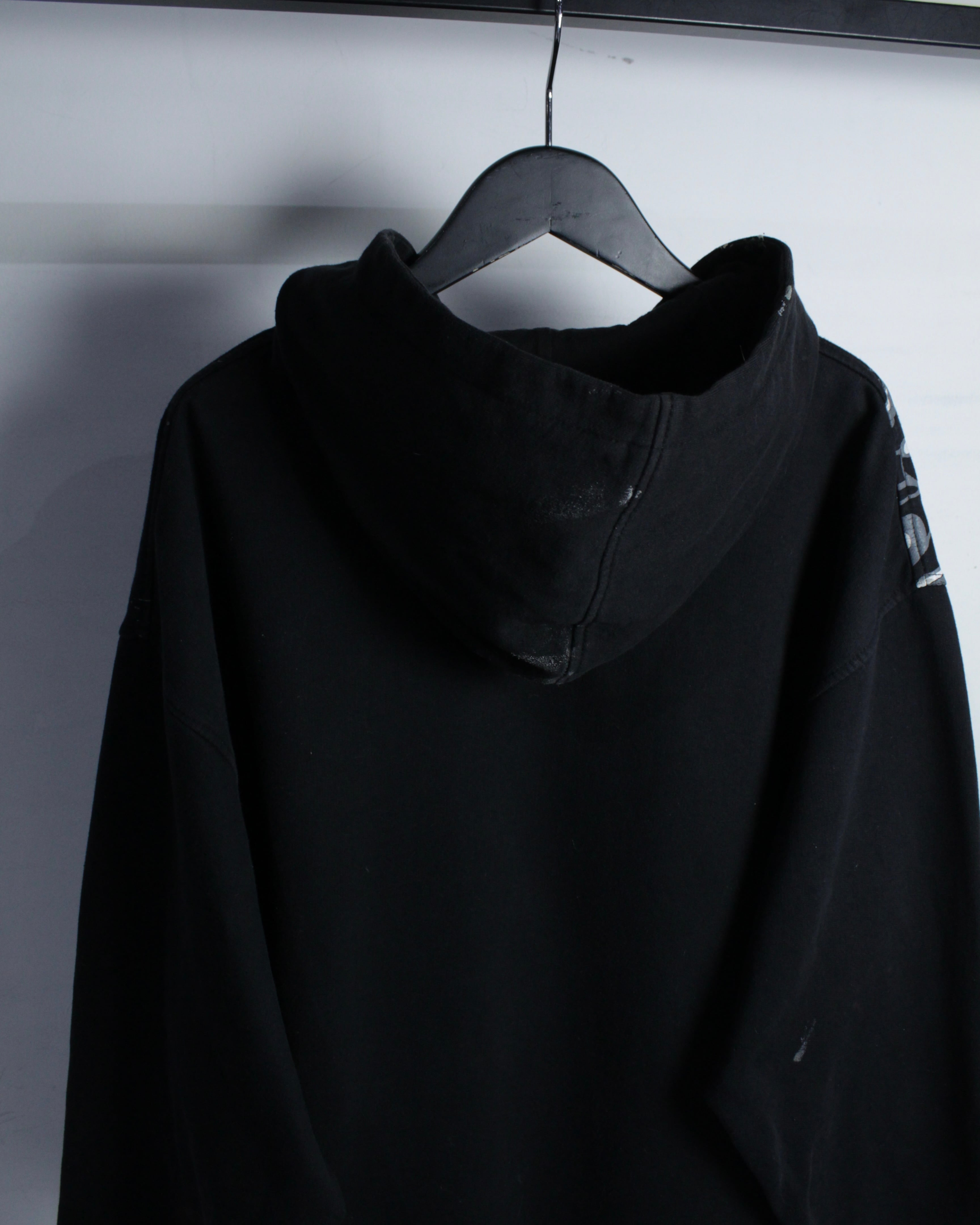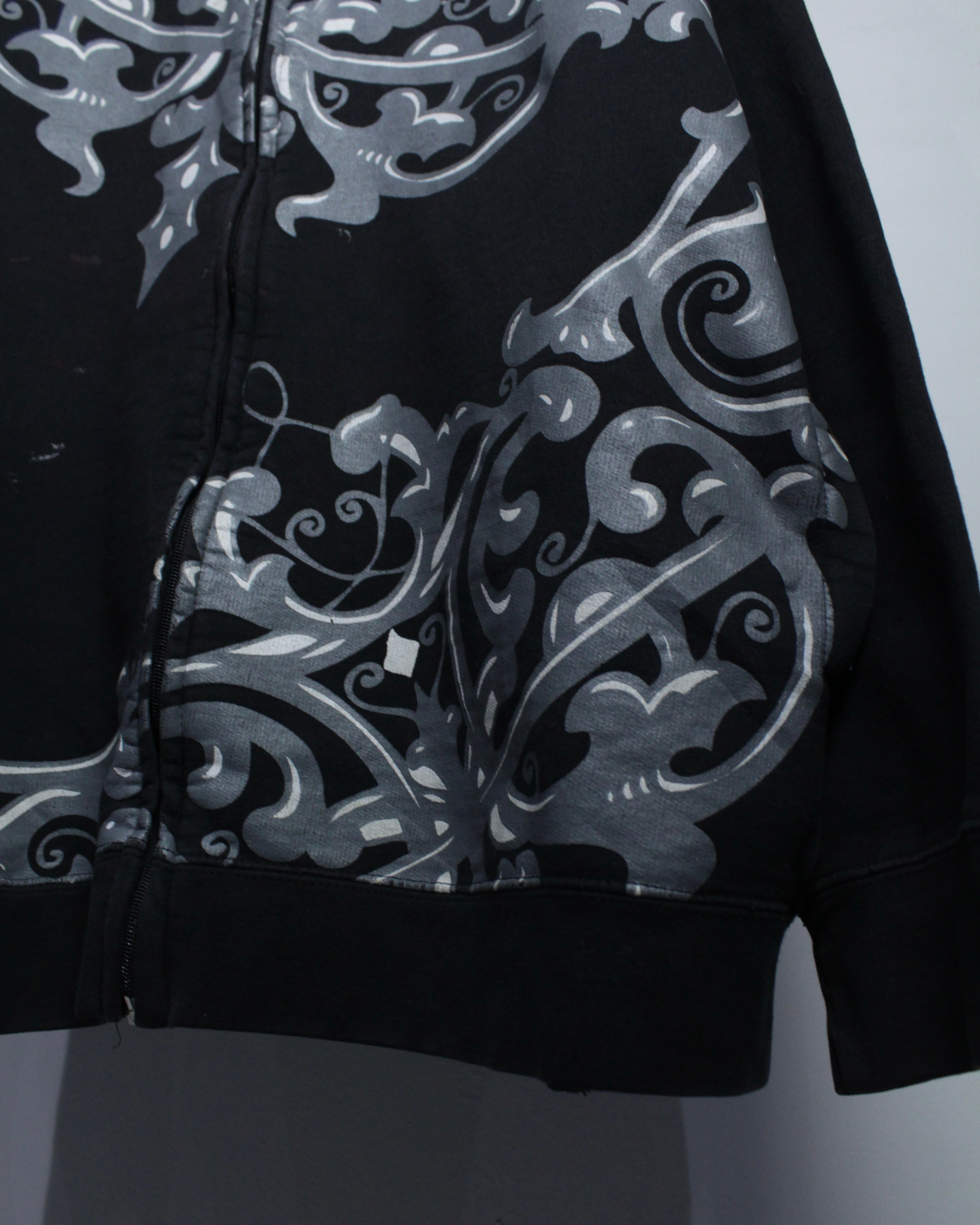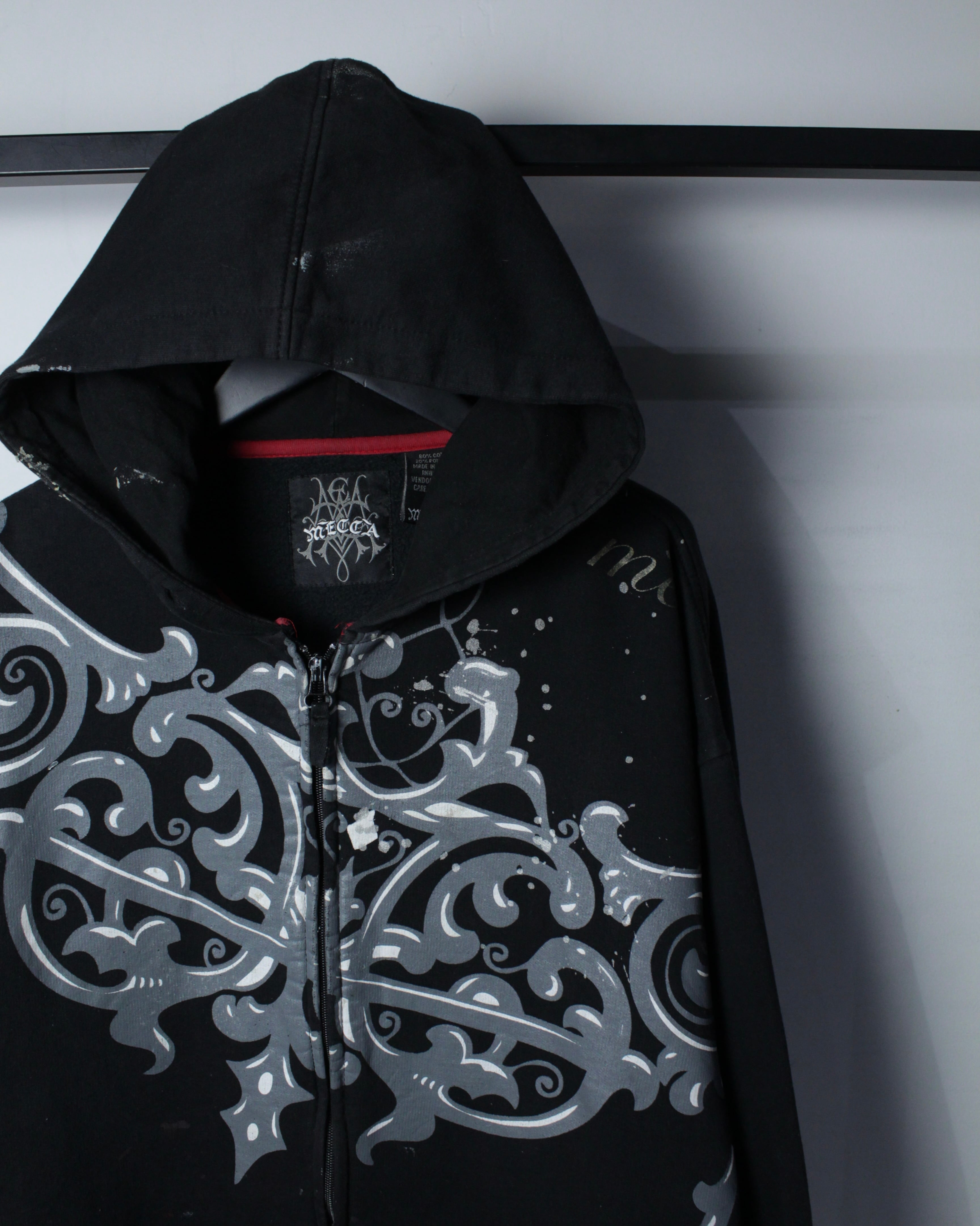 ブラックボディをベースに、フロントから裾にかけて大胆に施されたゴシック調のグラフィックが目を惹くジップアップフーディ。