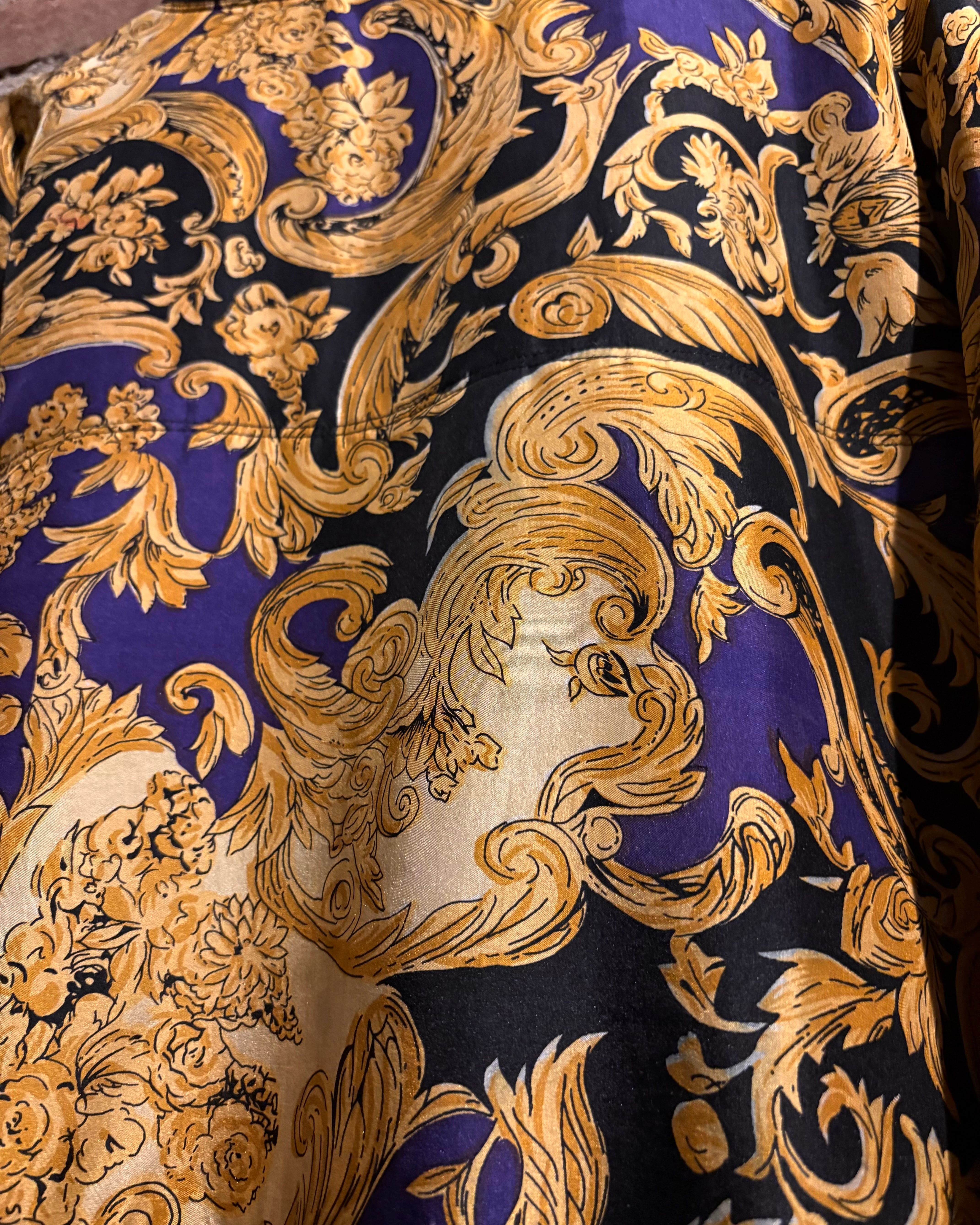 ネイビー×ブラックをベースに、ゴールドのバロック柄を贅沢に載せ、曲線的で繊細な装飾模様が全体に広がり、インパクトと高級感を兼ね備えた1着。