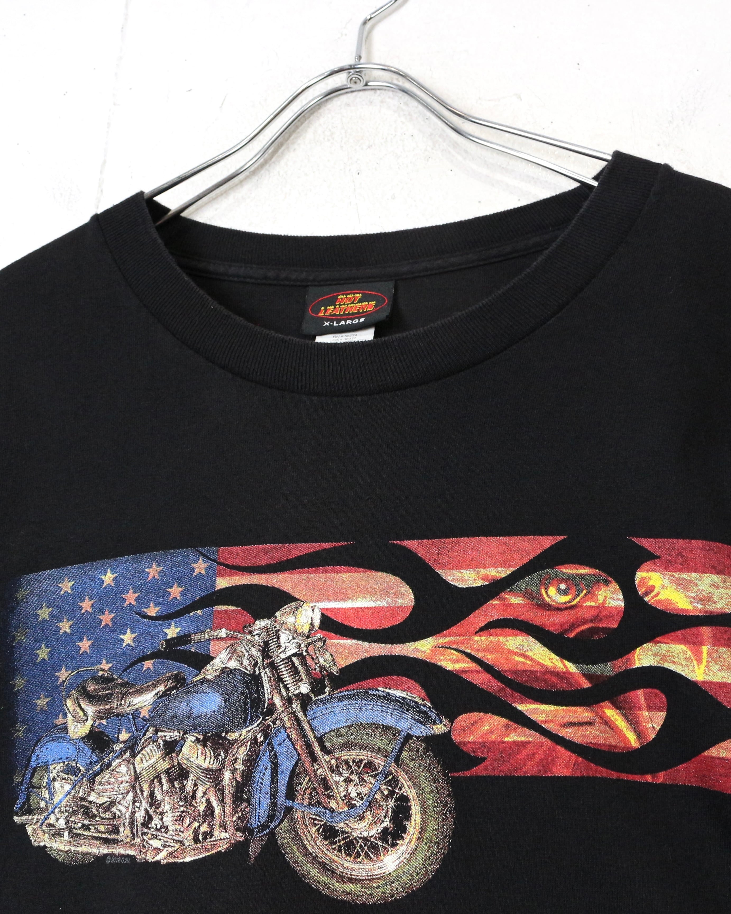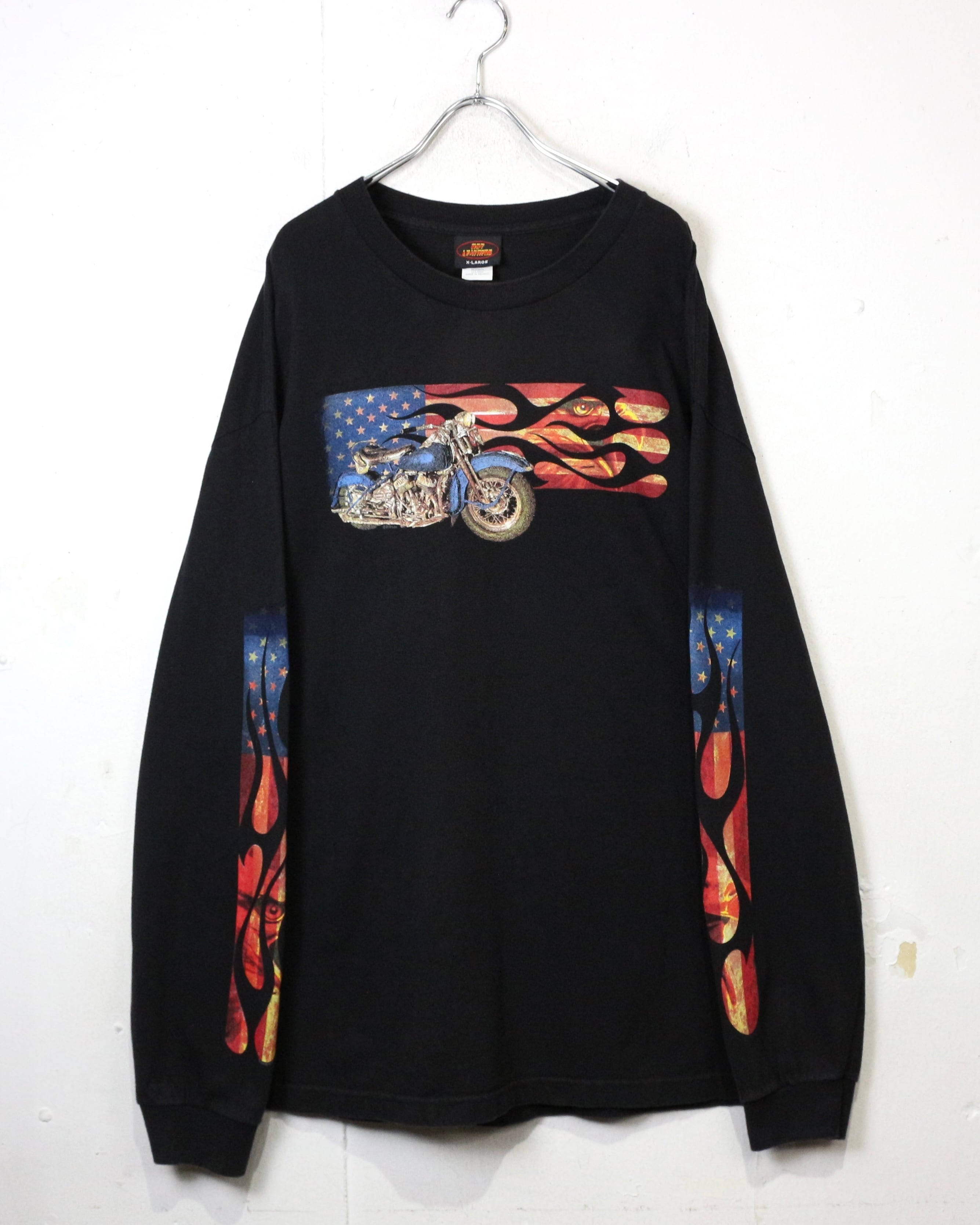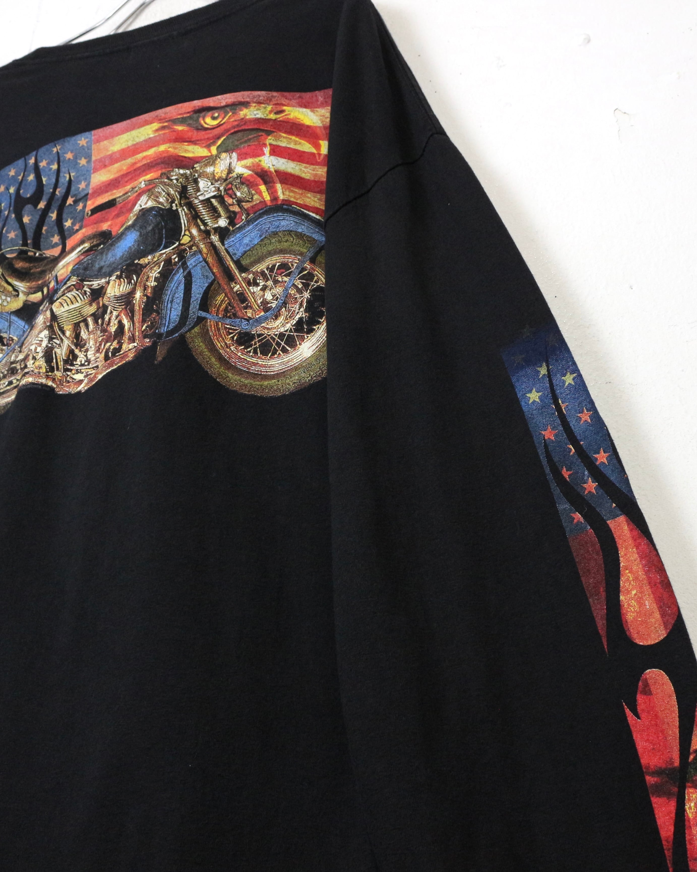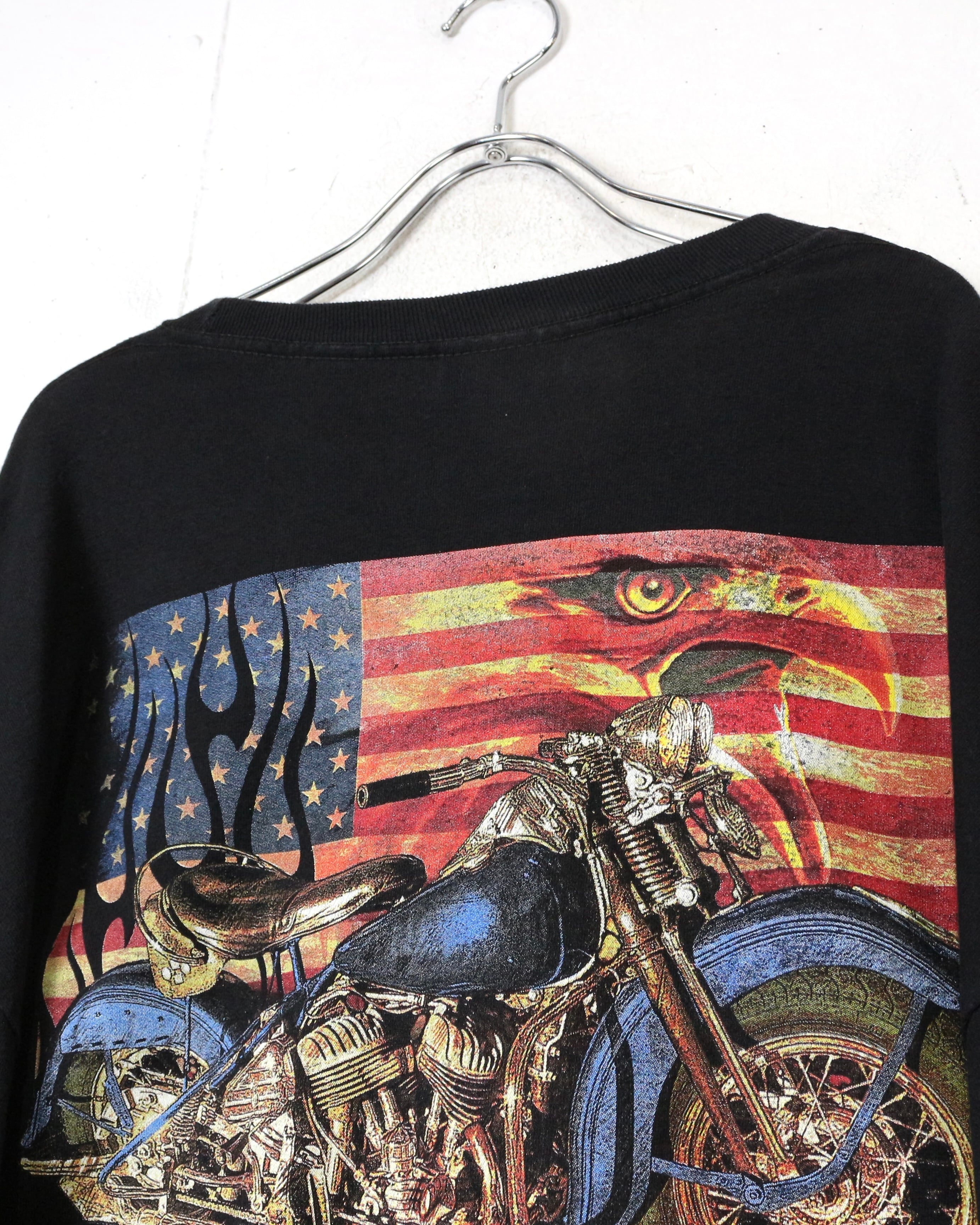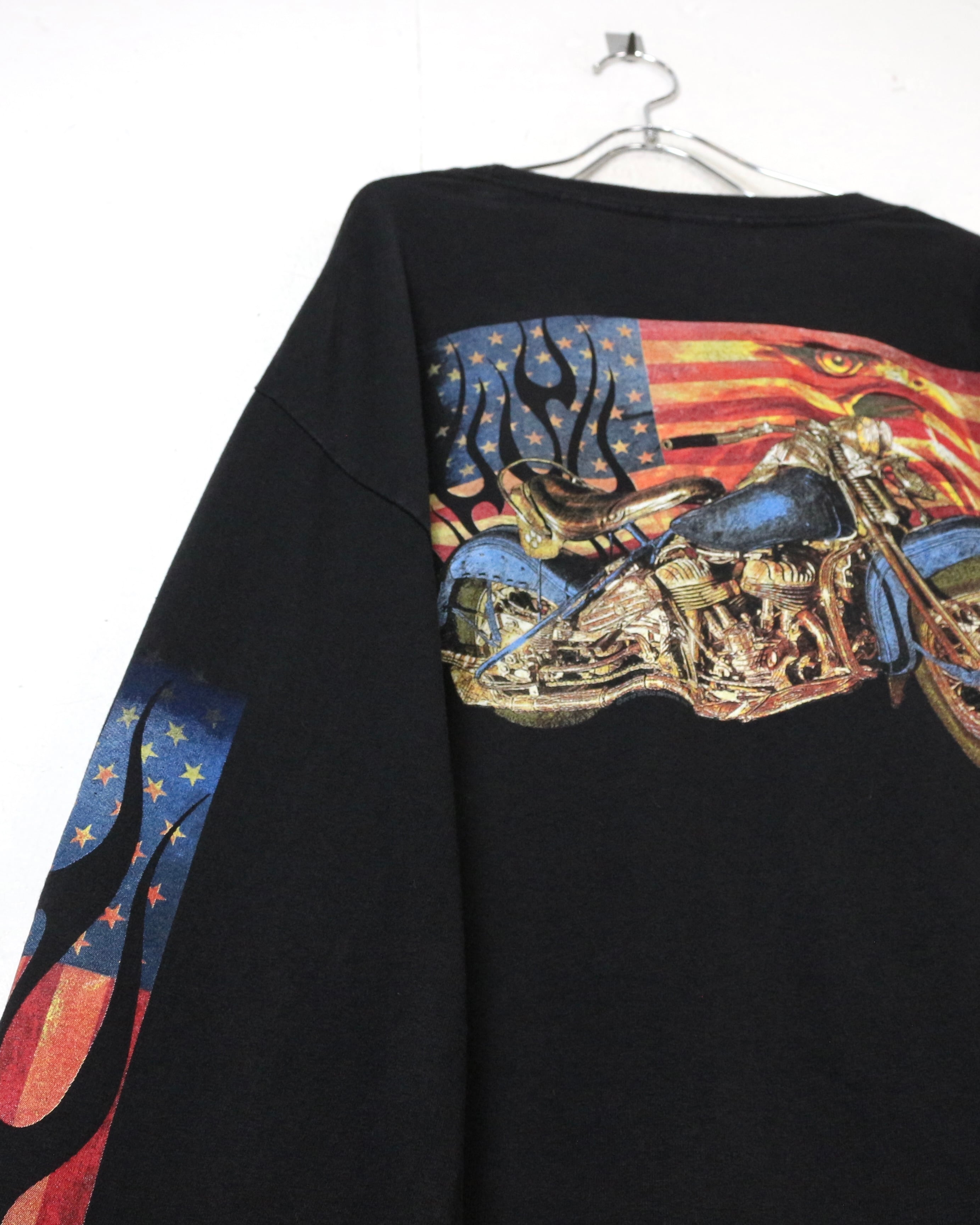 ブラックボディをベースに、ファイヤーパターンを纏ったアメリカ国旗、バイク、ハクトウワシを組み合わせたインパクト抜群の1着。