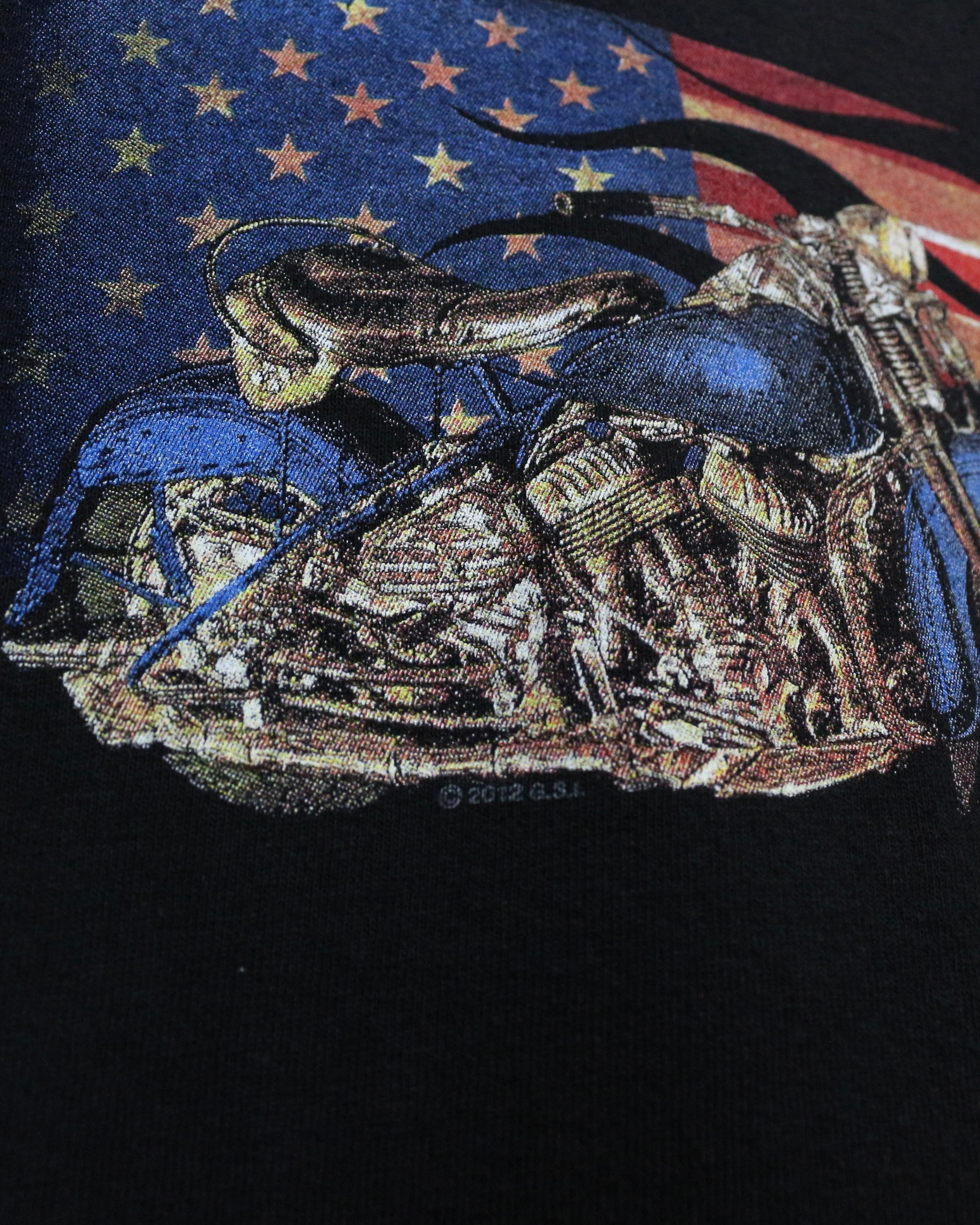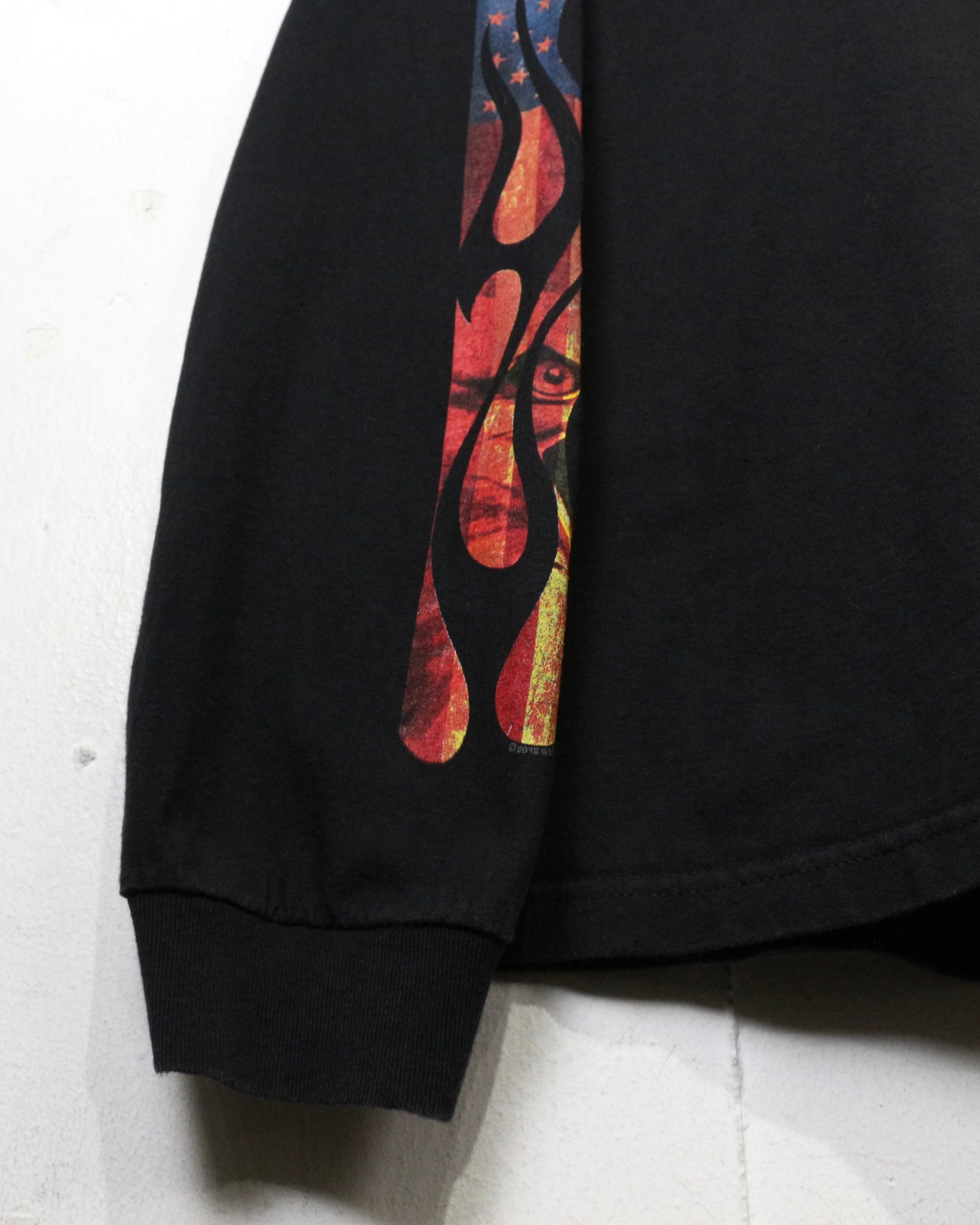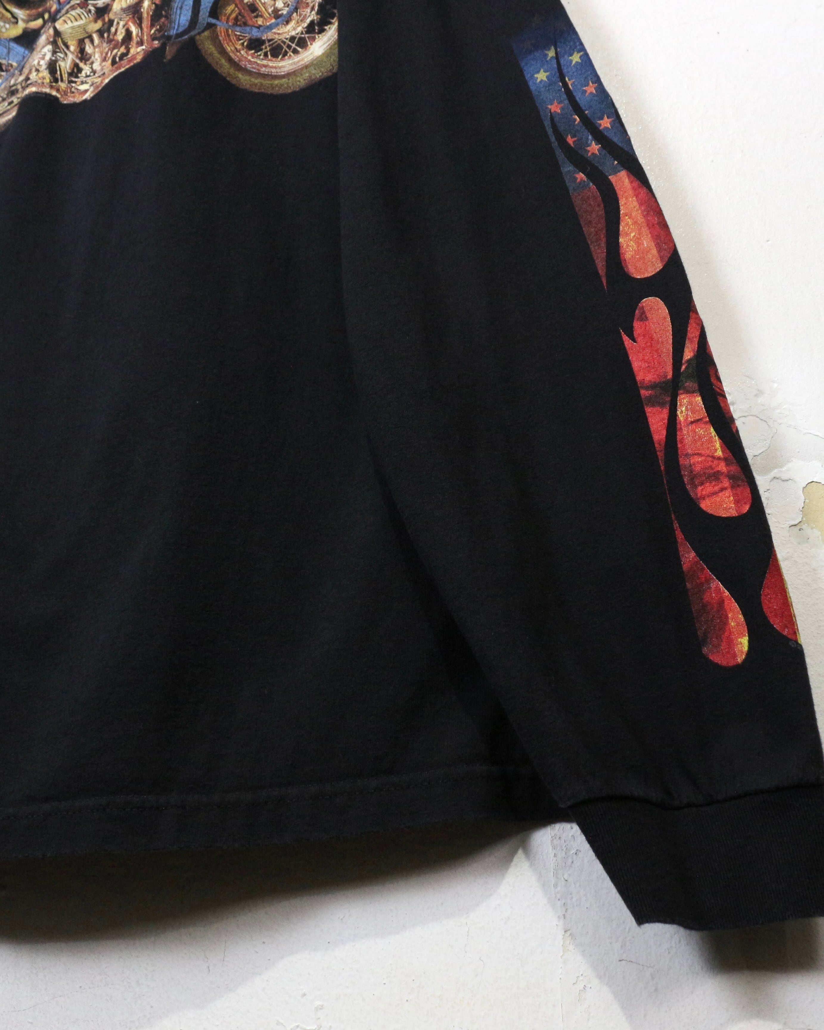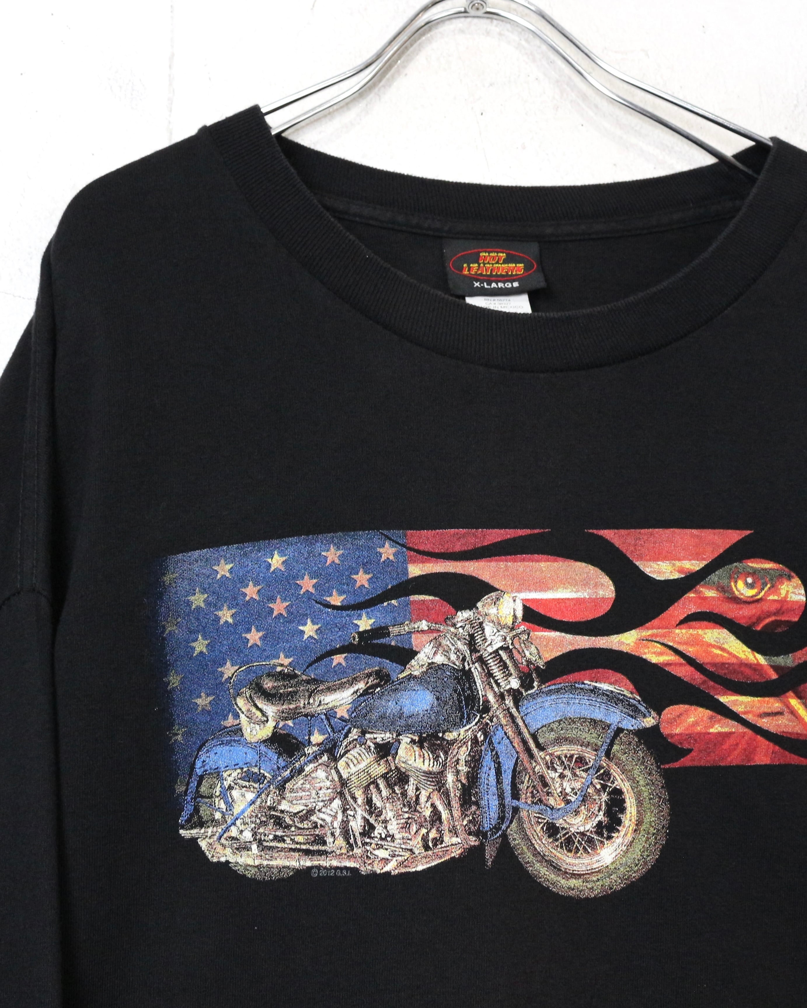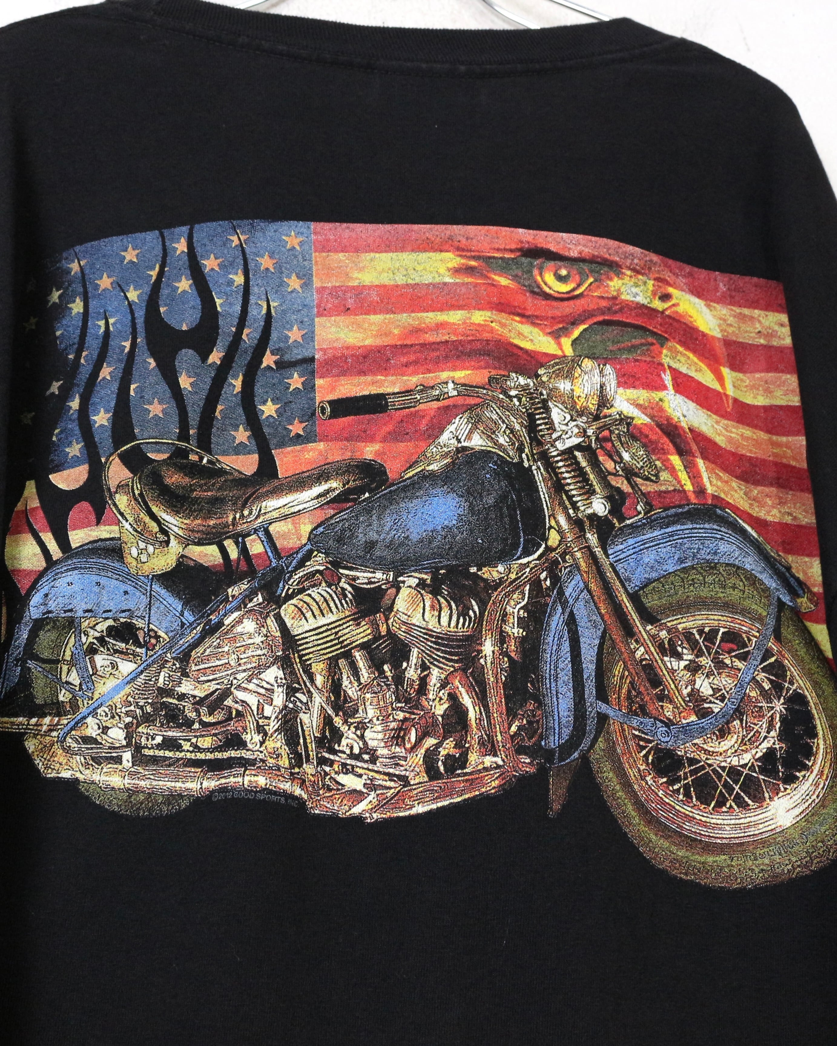 ブラックボディをベースに、ファイヤーパターンを纏ったアメリカ国旗、バイク、ハクトウワシを組み合わせたインパクト抜群の1着。