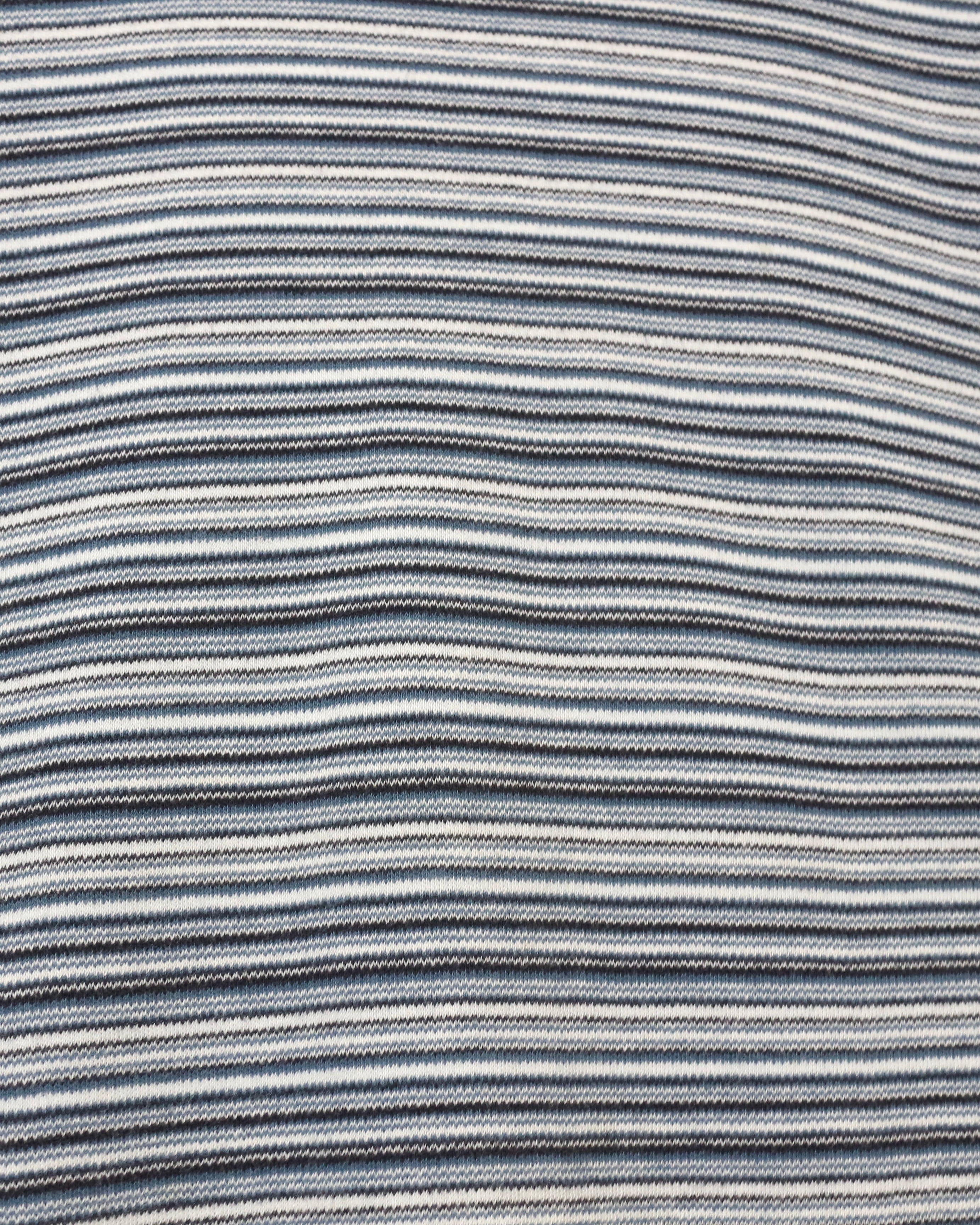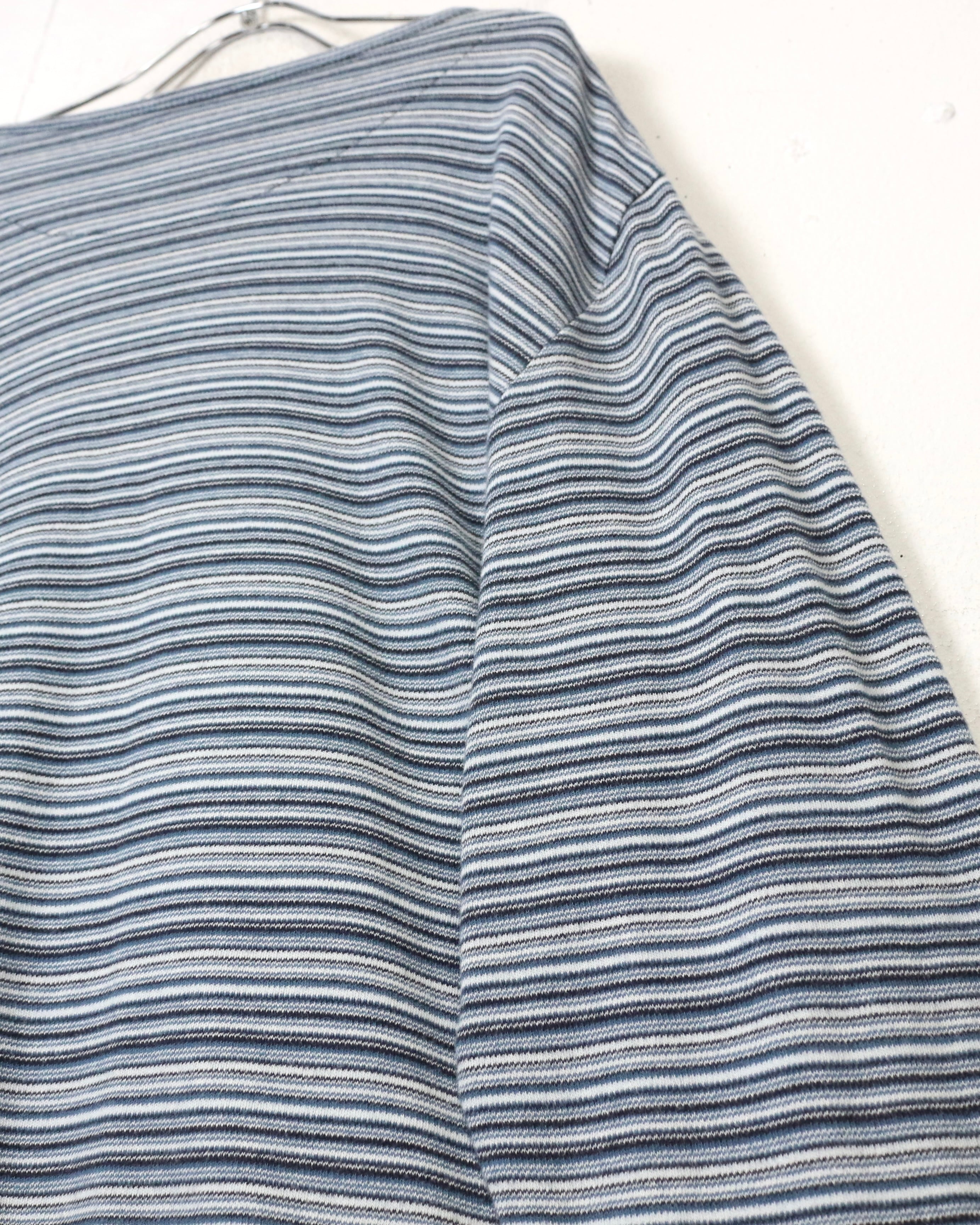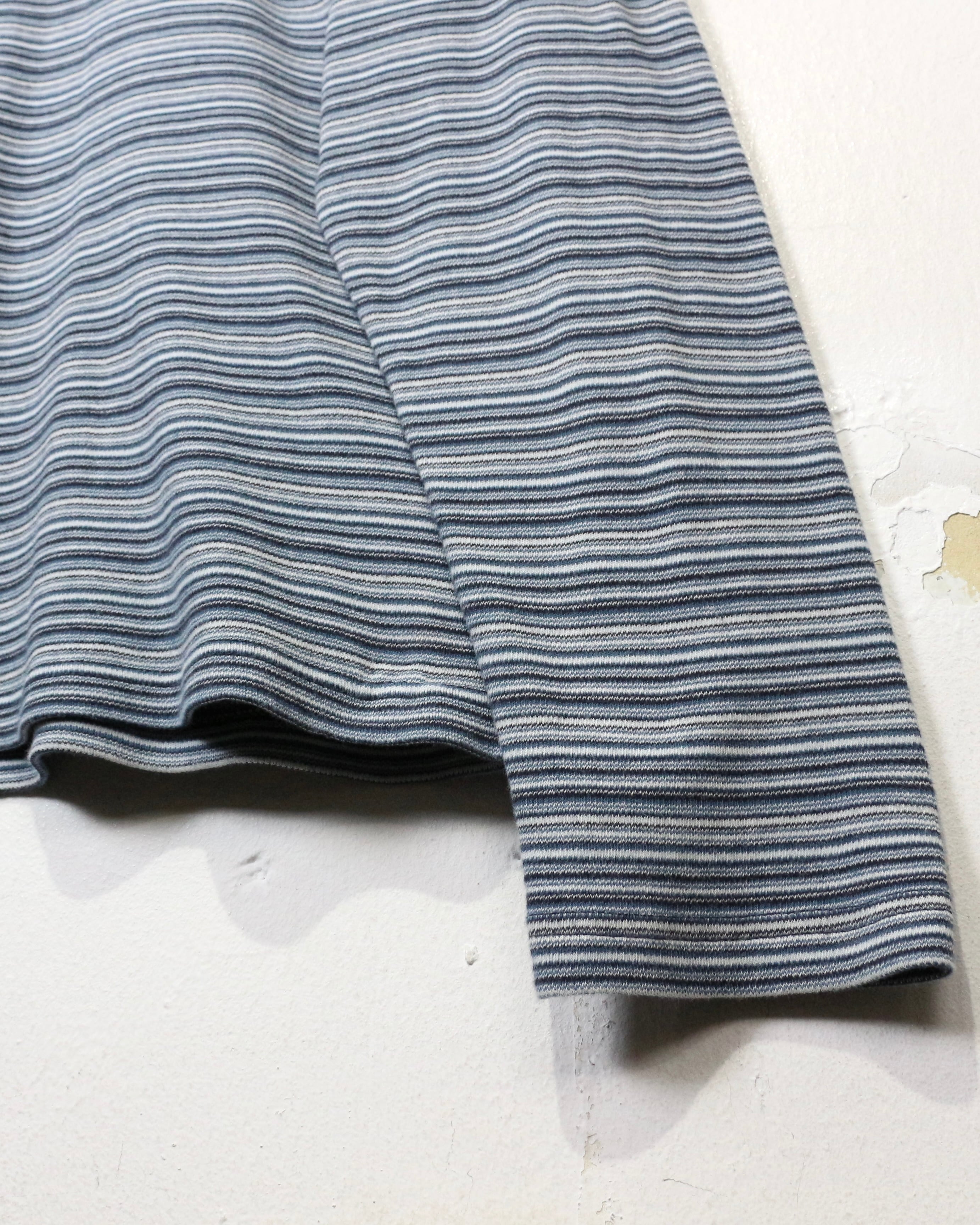 ブラック×ブルーグレーをベースとした落ち着きあるボーダーパターンの1着。