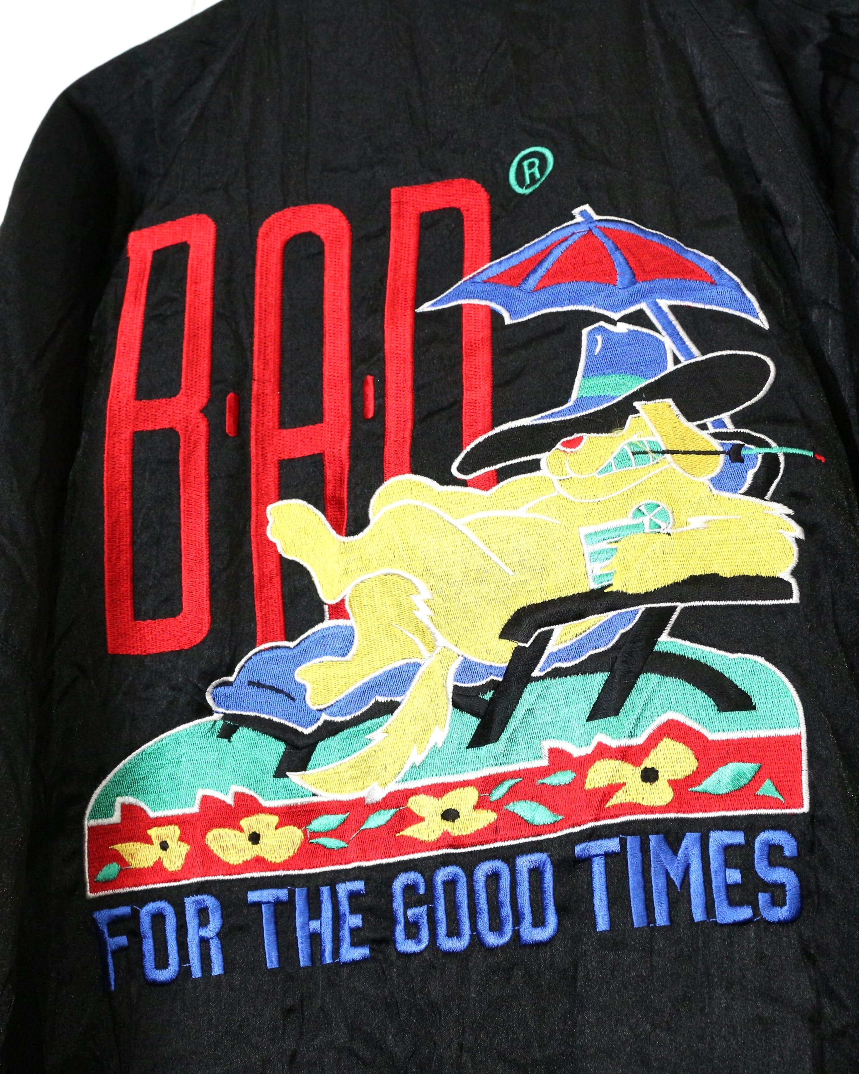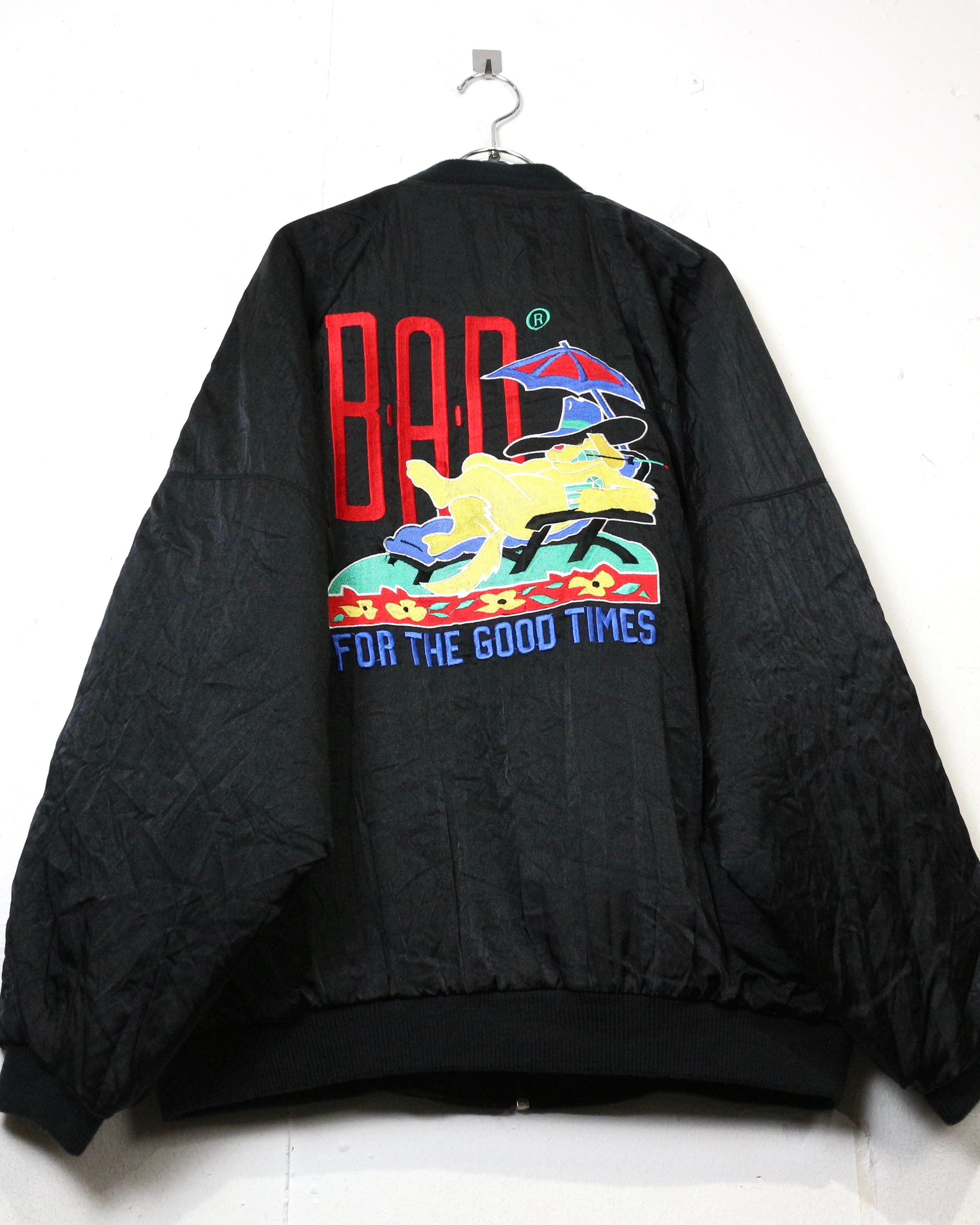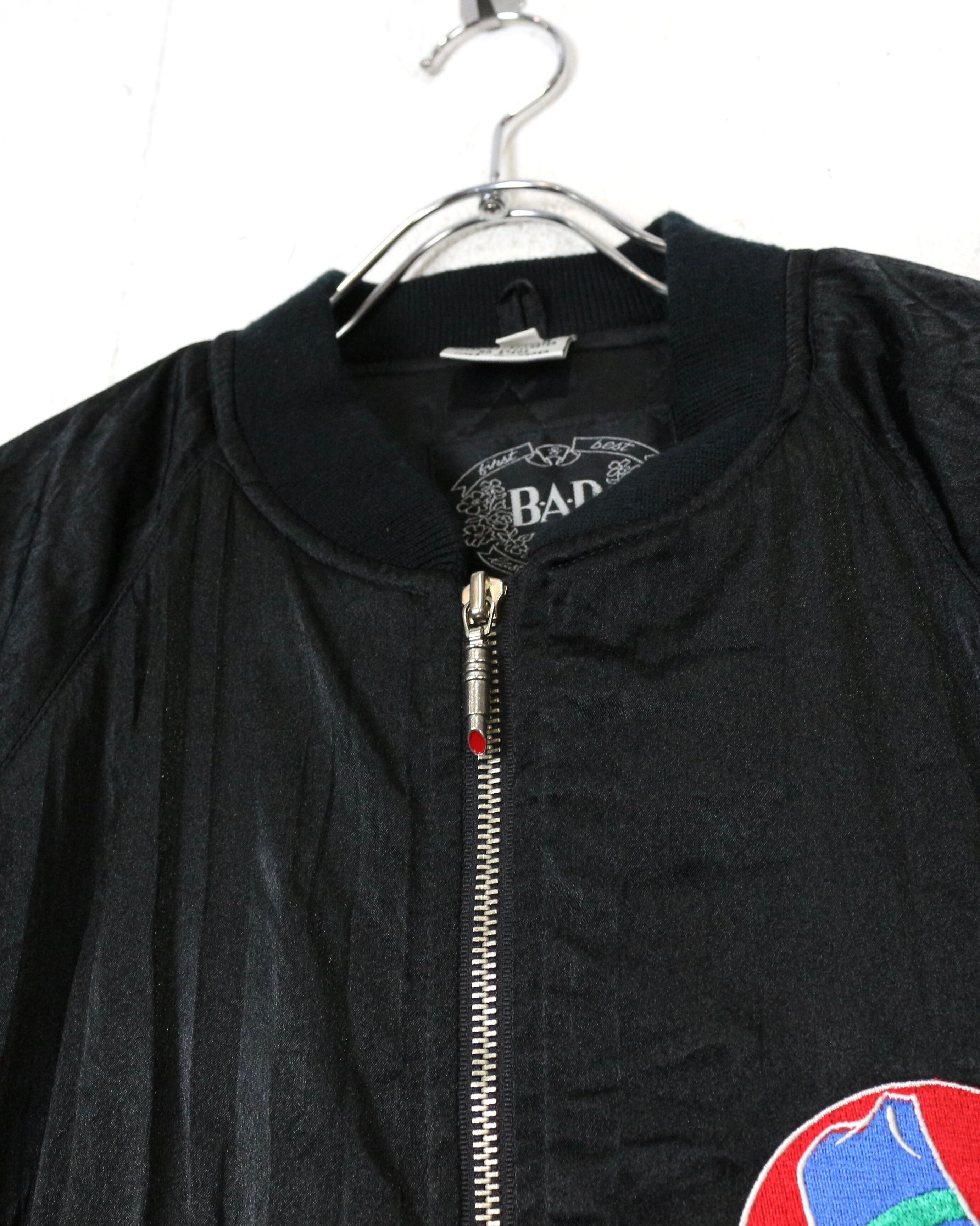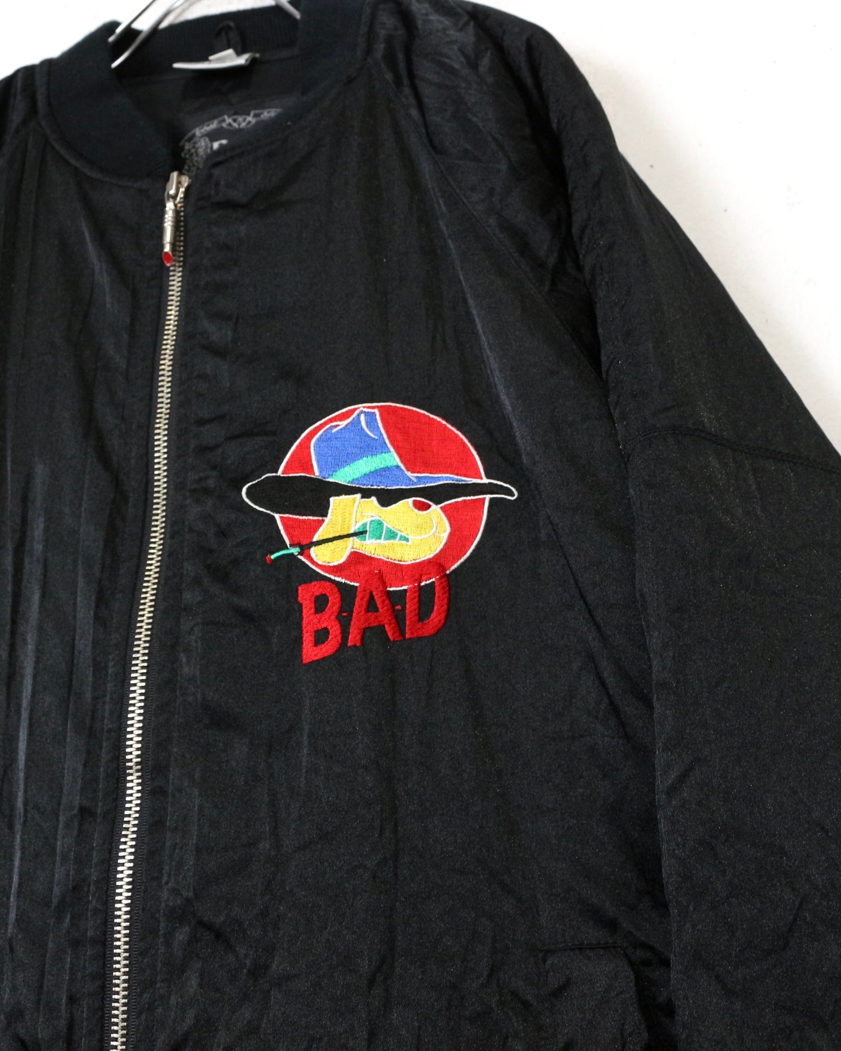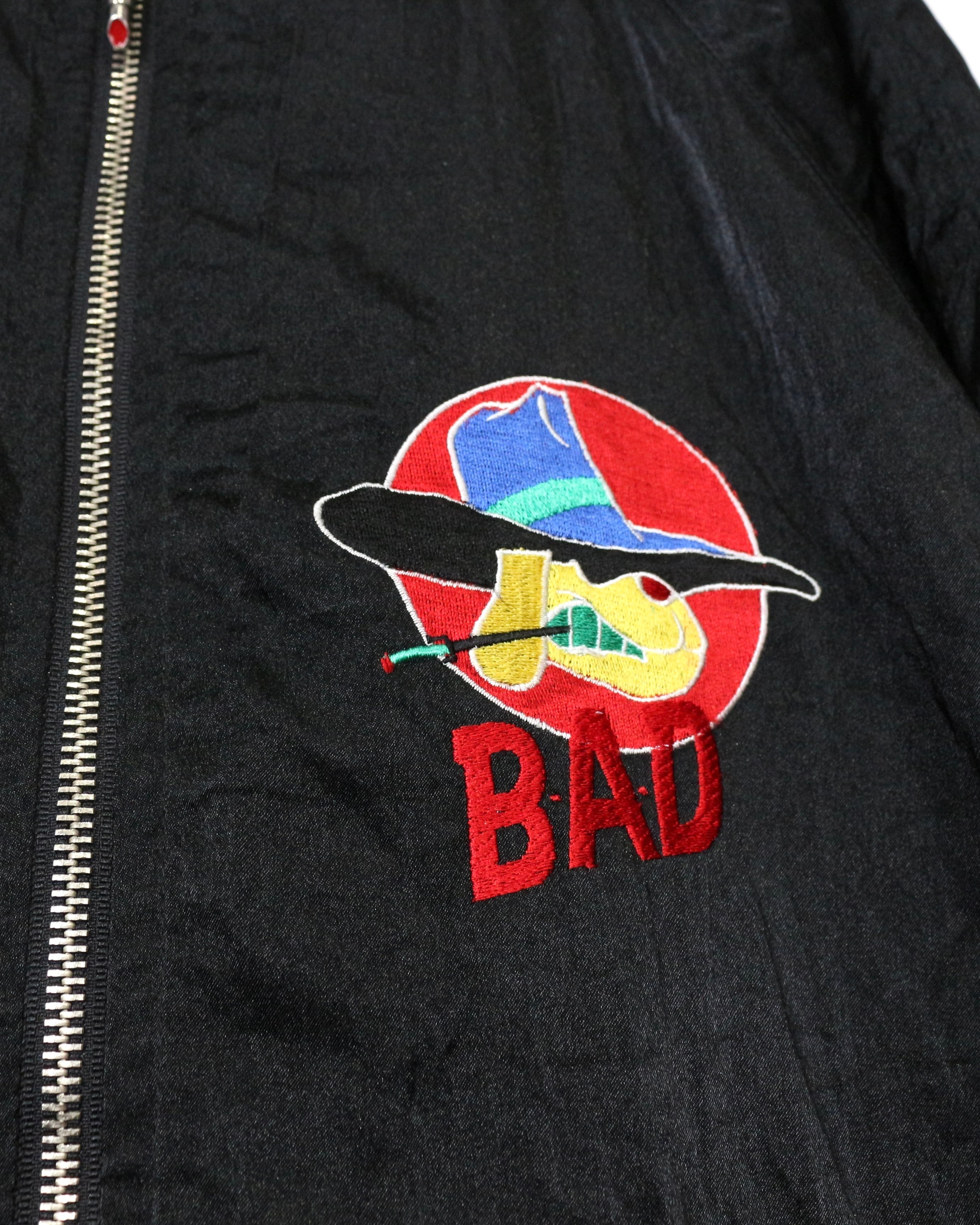 ブラックを基調としたボディに、“BAD”のロゴと共にワルな装いの犬を落とし込んだ刺繍デザインの1着。