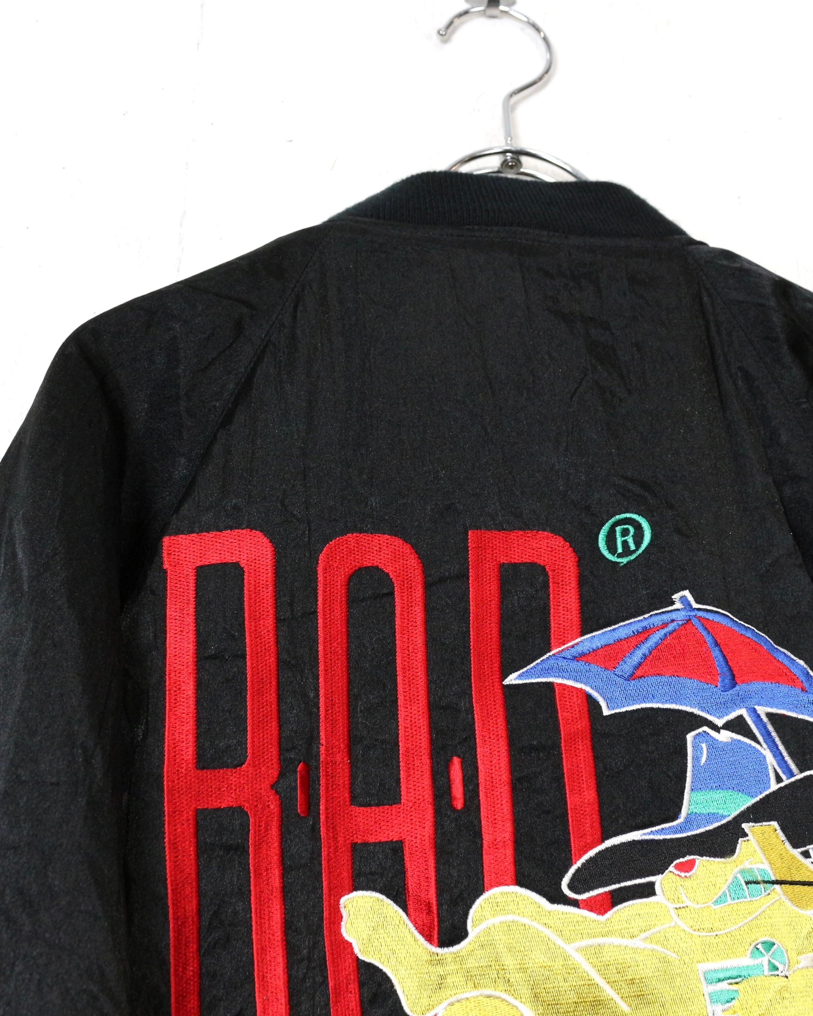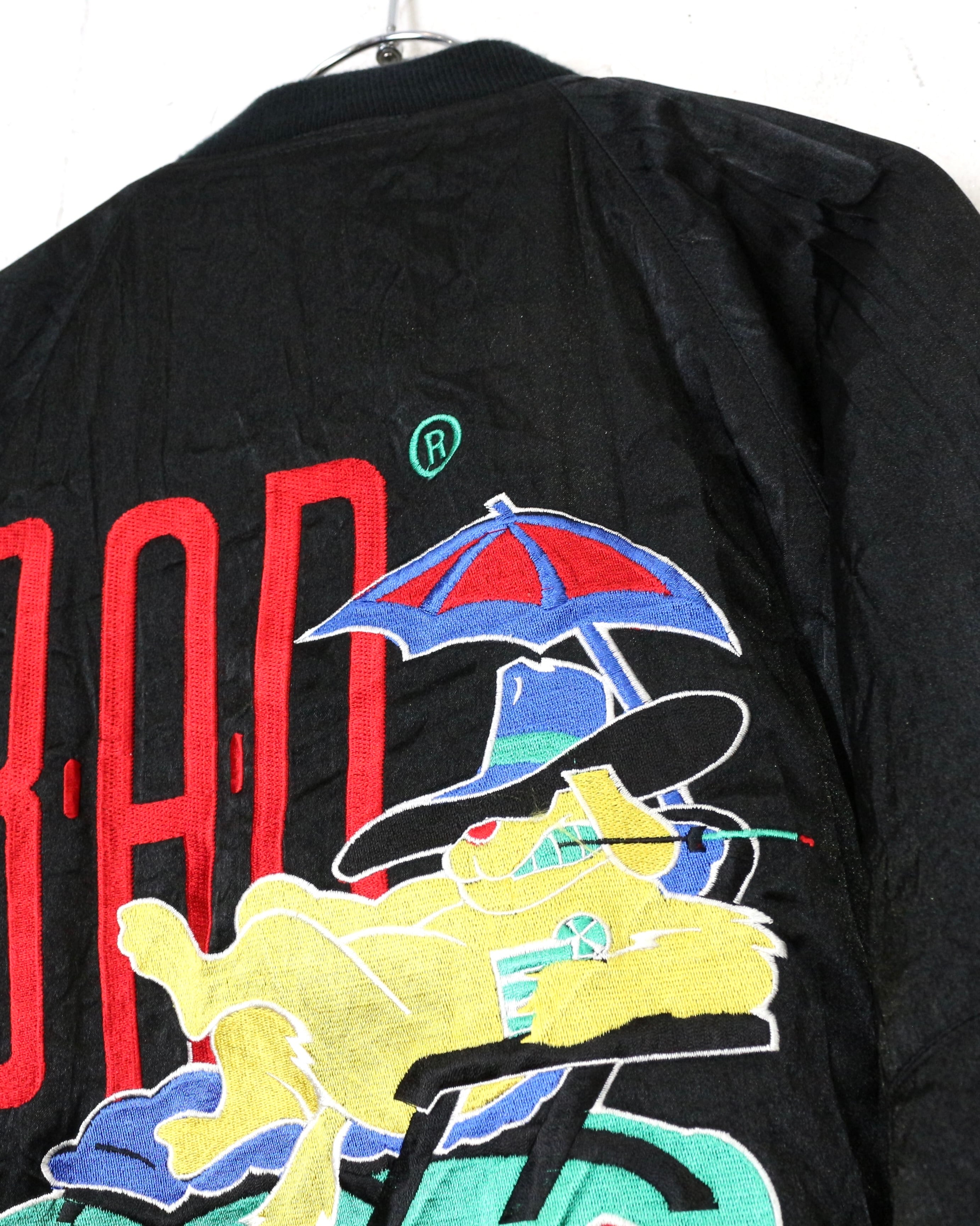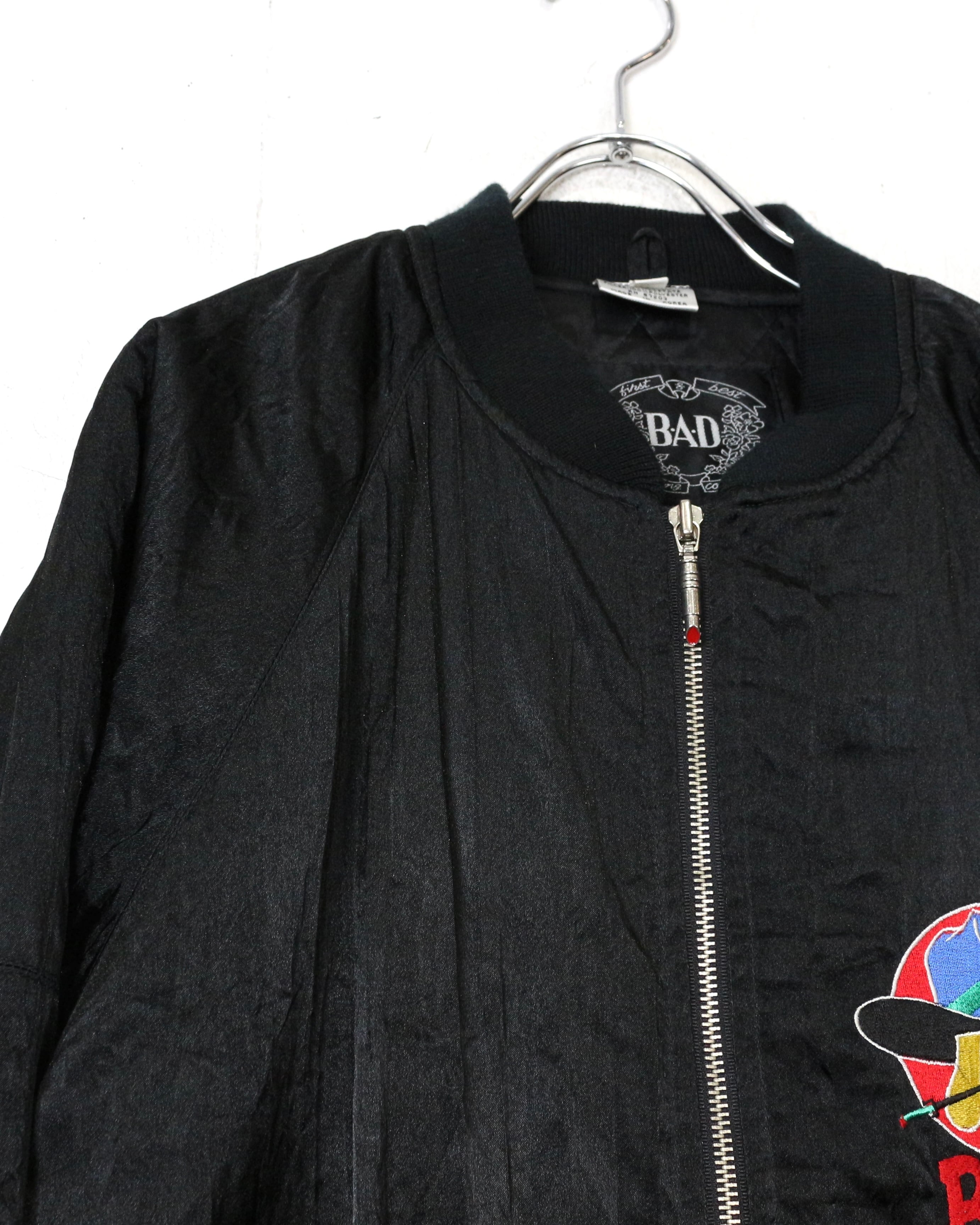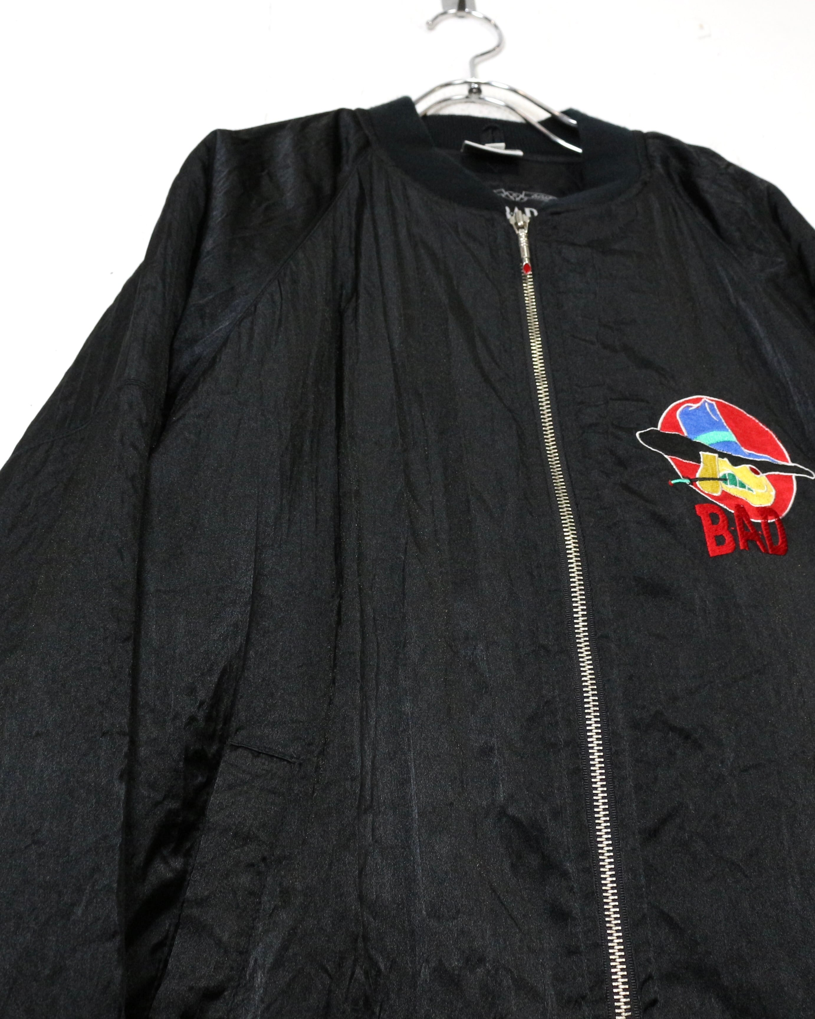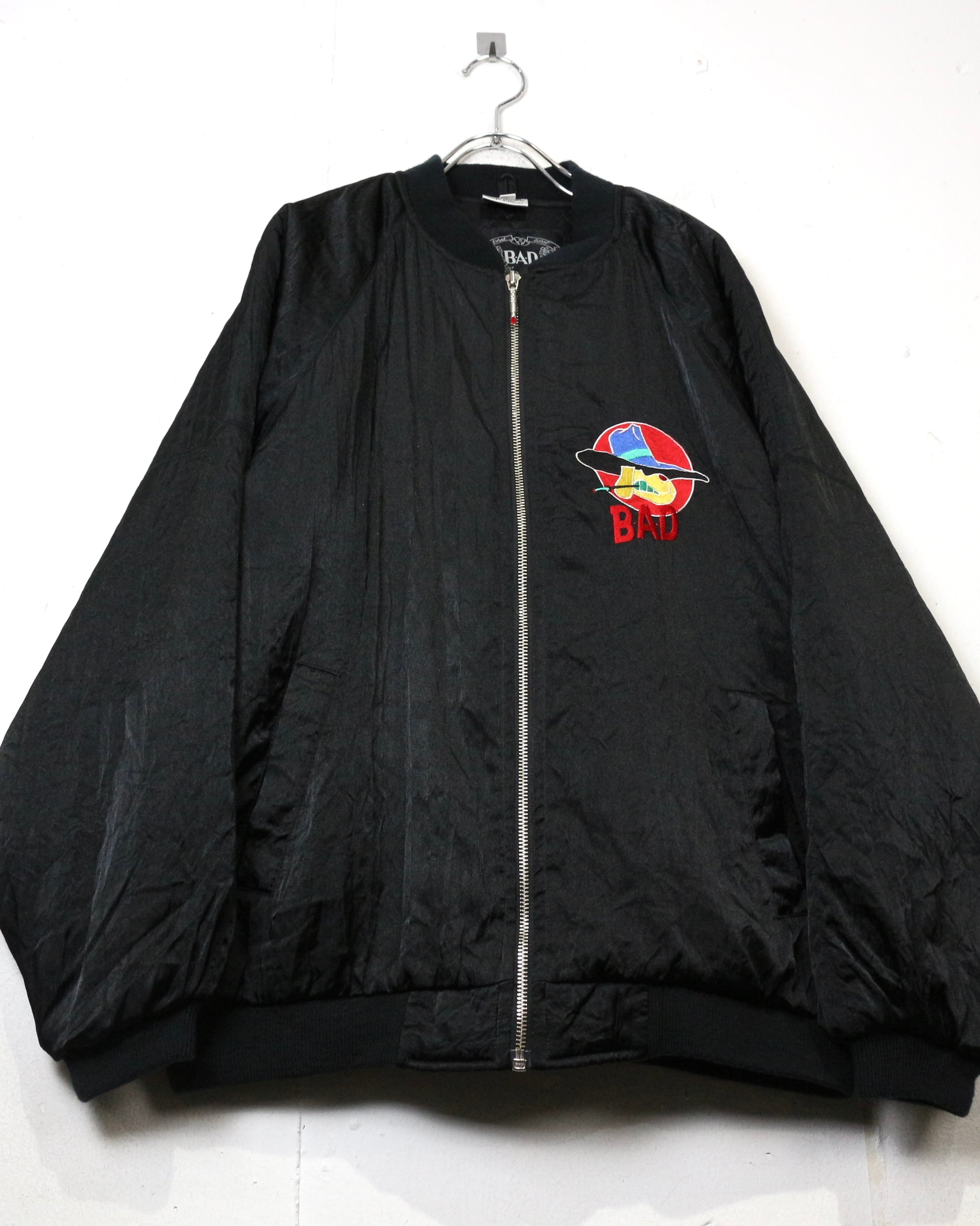 ブラックを基調としたボディに、“BAD”のロゴと共にワルな装いの犬を落とし込んだ刺繍デザインの1着。