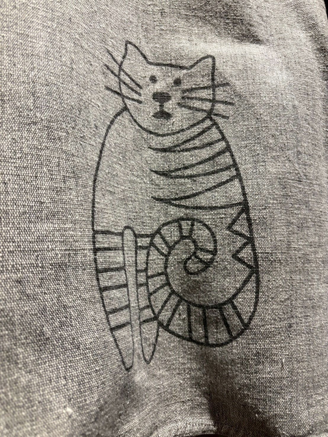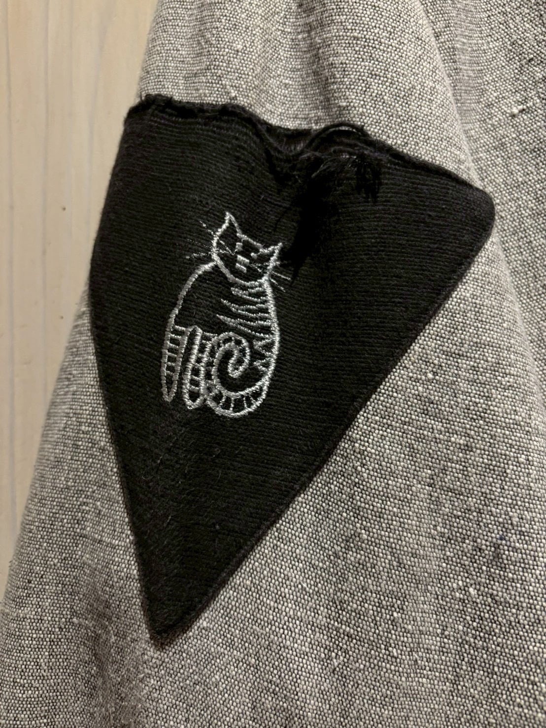 グレーのボディをベースに、フロントには三角状のファブリックで切り替えを施し、その上から猫の刺繍やプリントを落とし込んだユニークなデザインの1着。