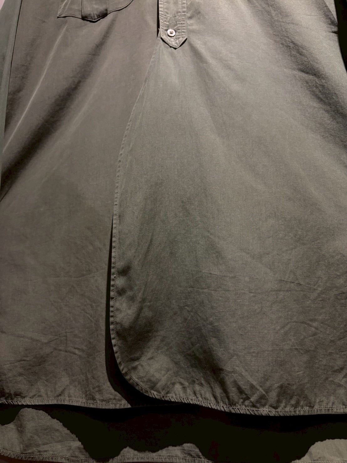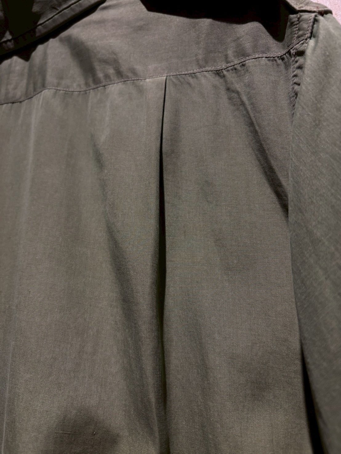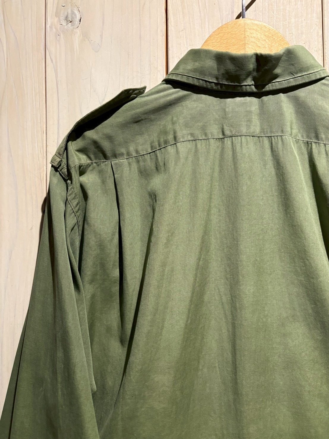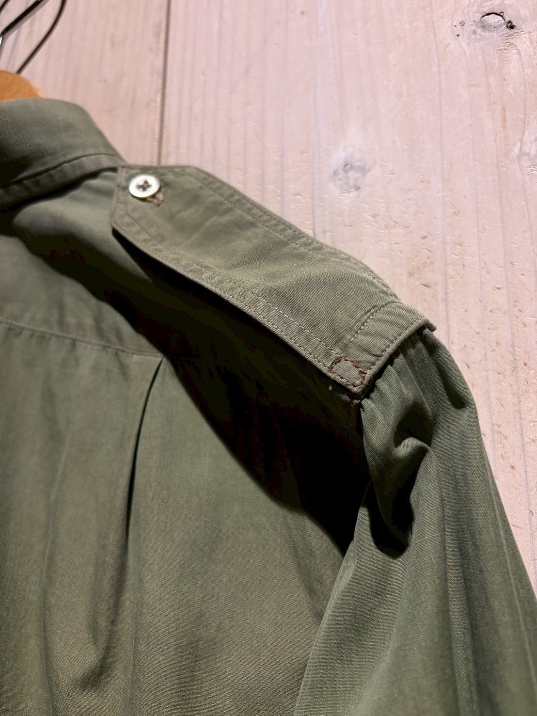 フロントはハーフボタン仕様、両胸にはフラップポケットを配置。肩にはエポレットを装備。長めに設計された着丈や、裾にかけて広く開く独特のパターンは、現代のスタイリングでもレイヤードの幅をグッと広げてくれます。