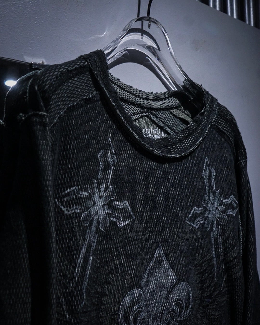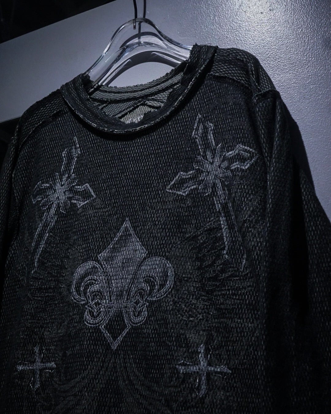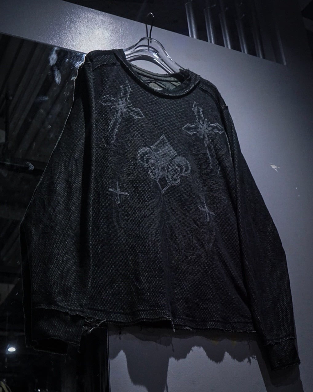 グレー×ブラックの配色で構成された、凹凸のあるサーマル生地をボディに使用し、フルール•ド•リス、クロスモチーフといったゴシックなプリントを載せた1着。