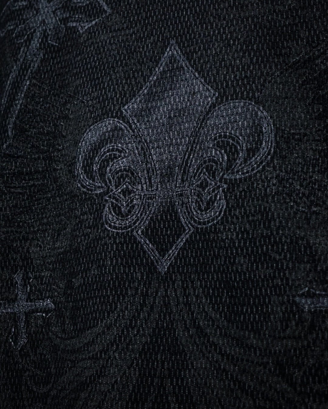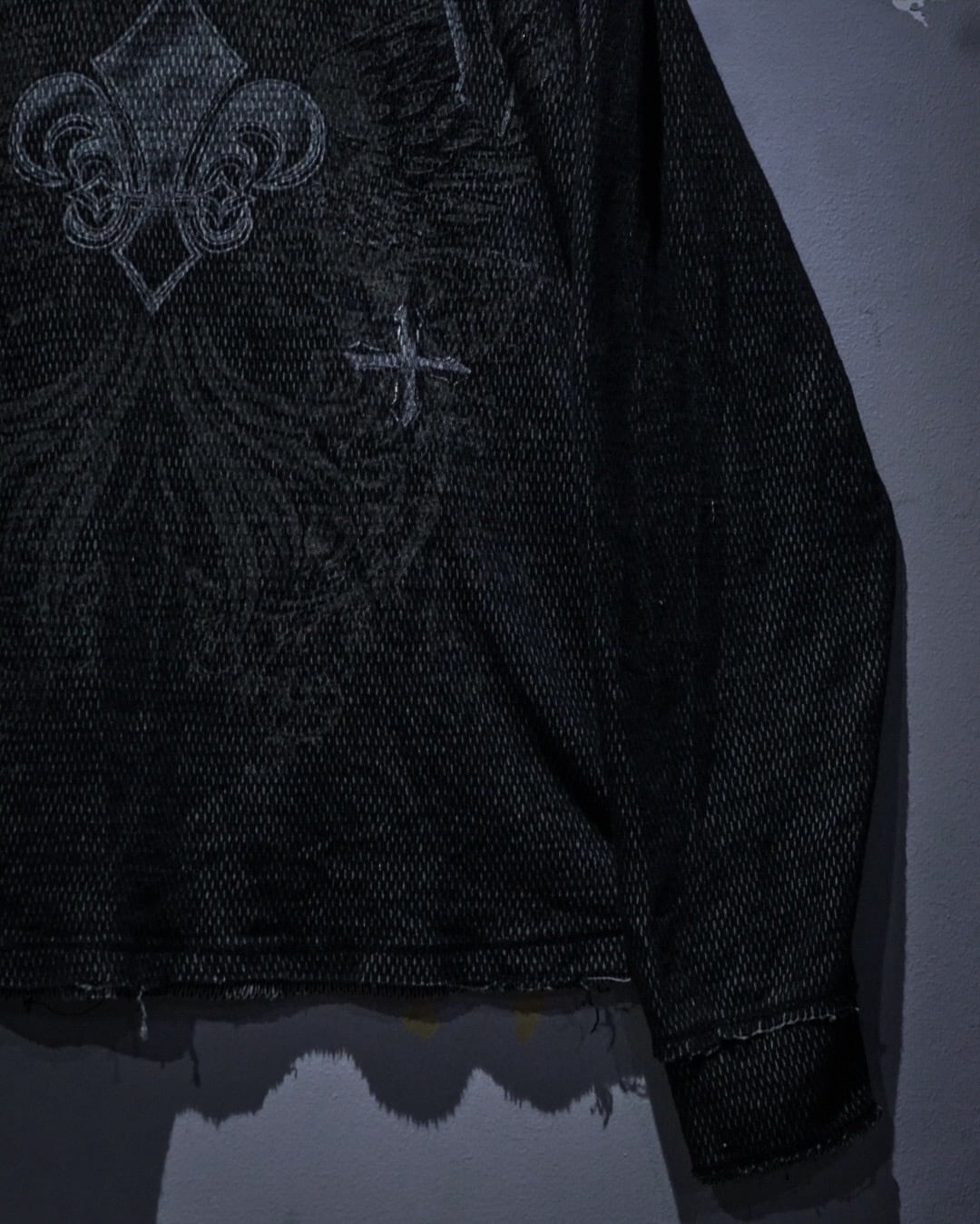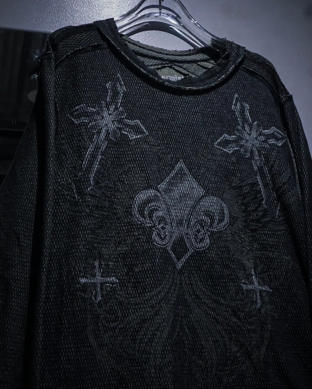 グレー×ブラックの配色で構成された、凹凸のあるサーマル生地をボディに使用し、フルール•ド•リス、クロスモチーフといったゴシックなプリントを載せた1着。