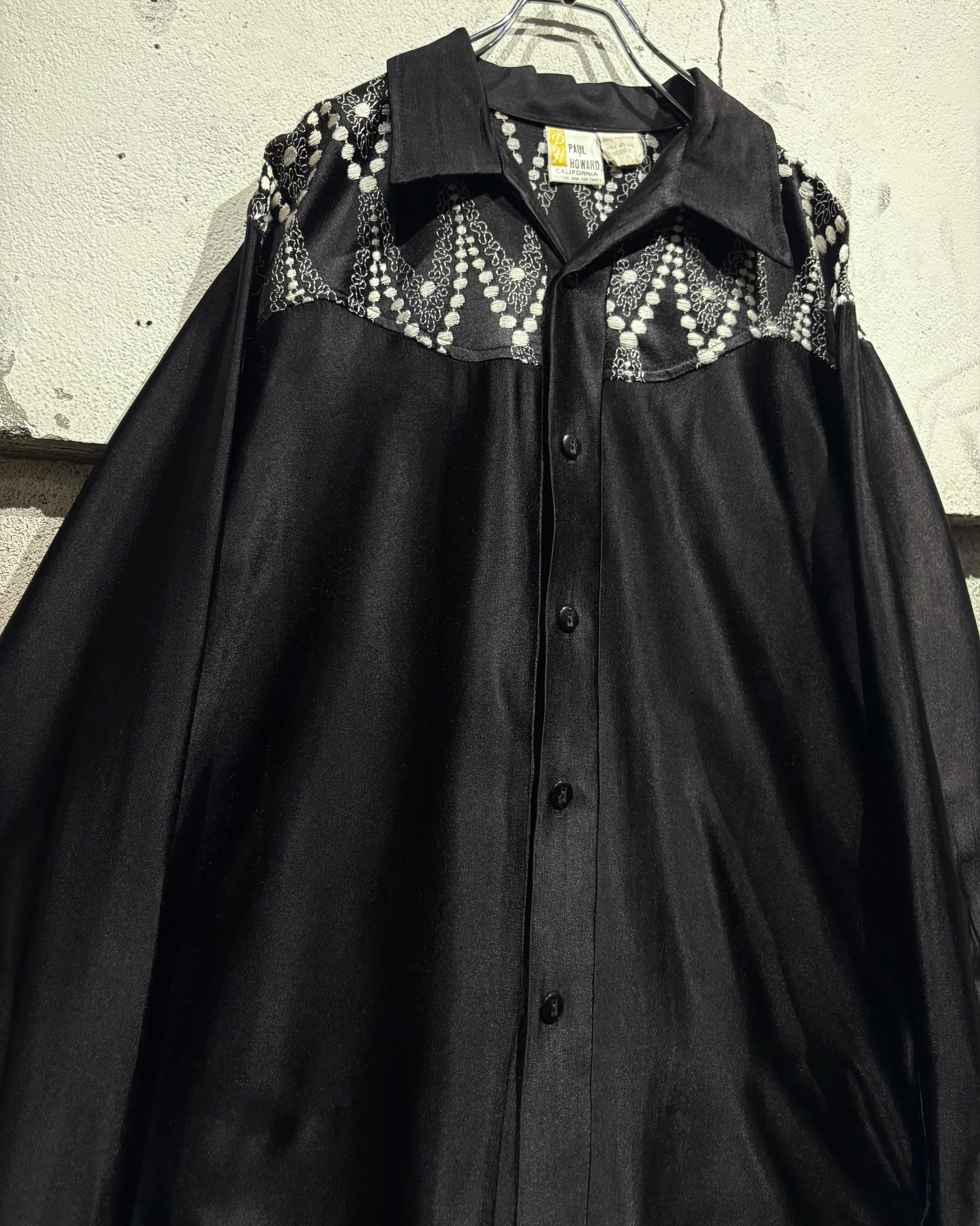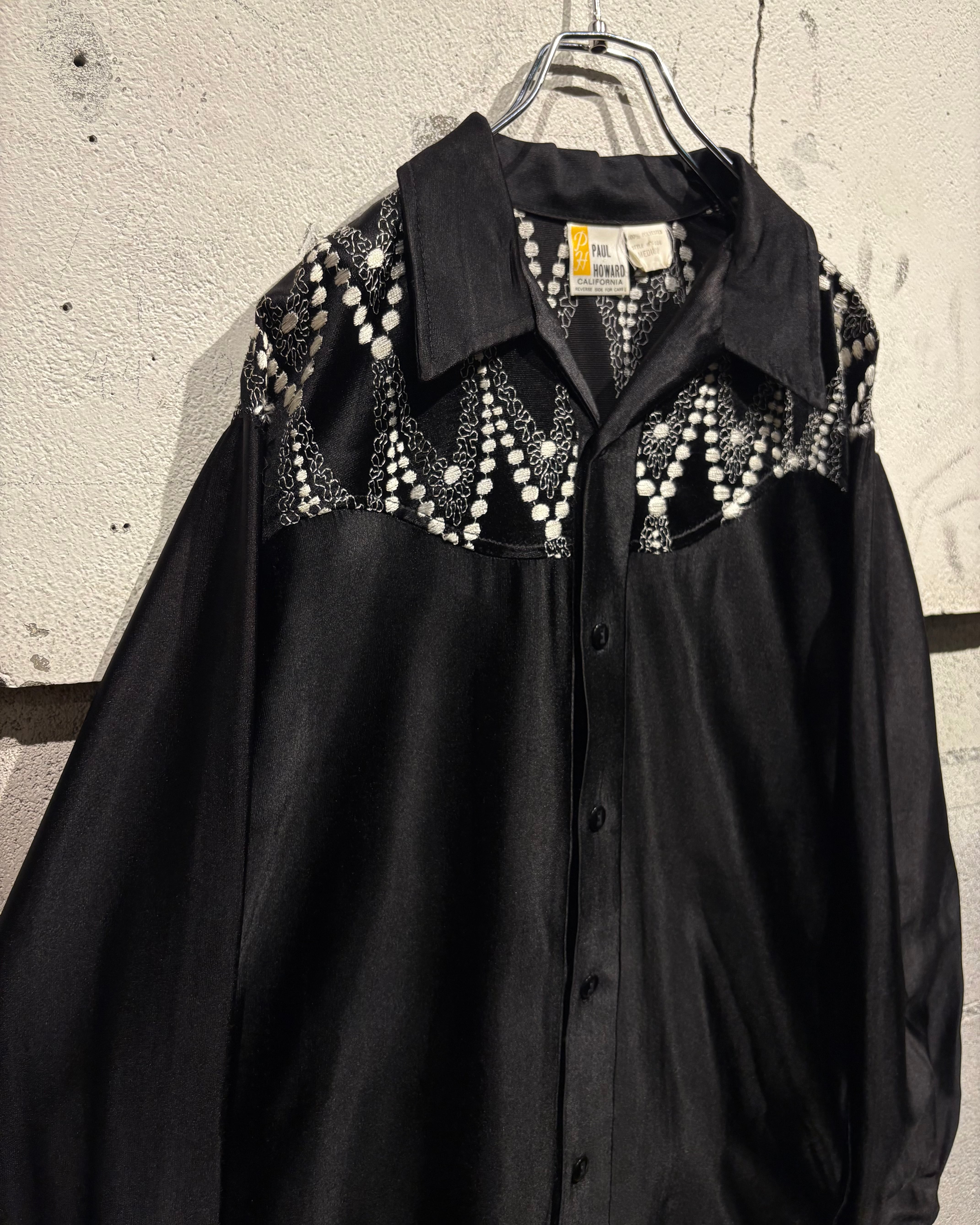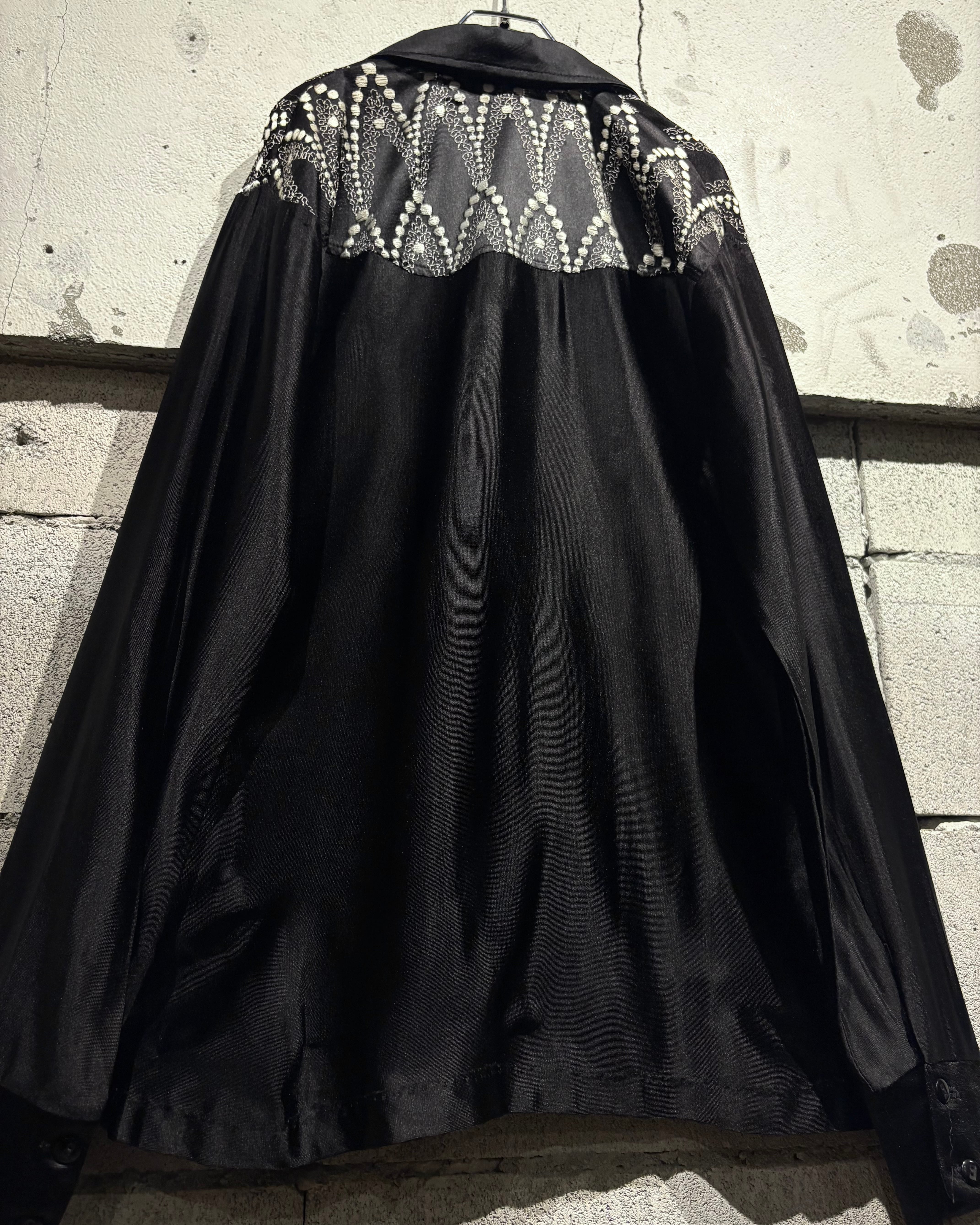 素材の光沢が生み出す上品さと、刺繍デザインによるモードなエッセンスが合わさった、70'sヴィンテージの長袖シャツです。
