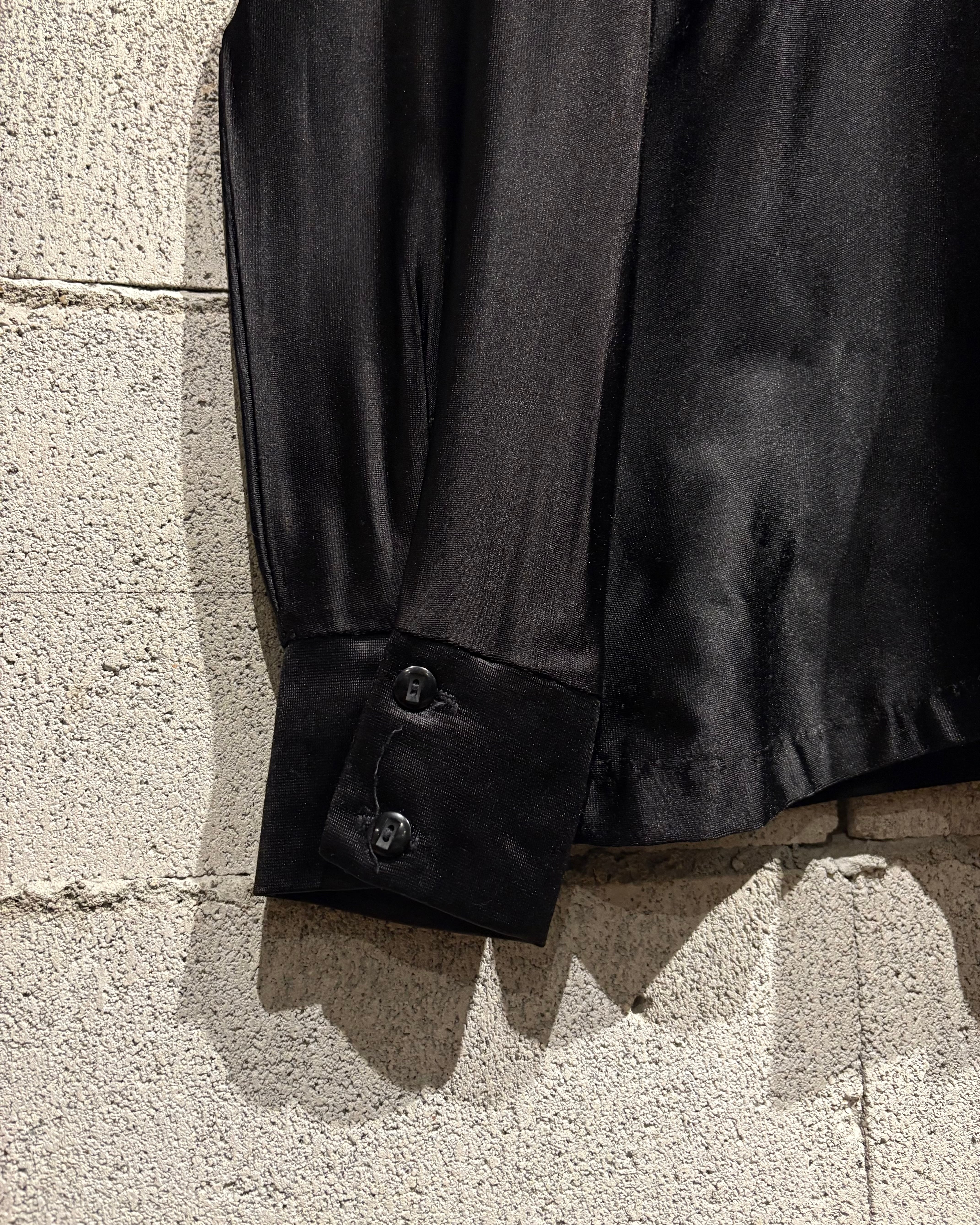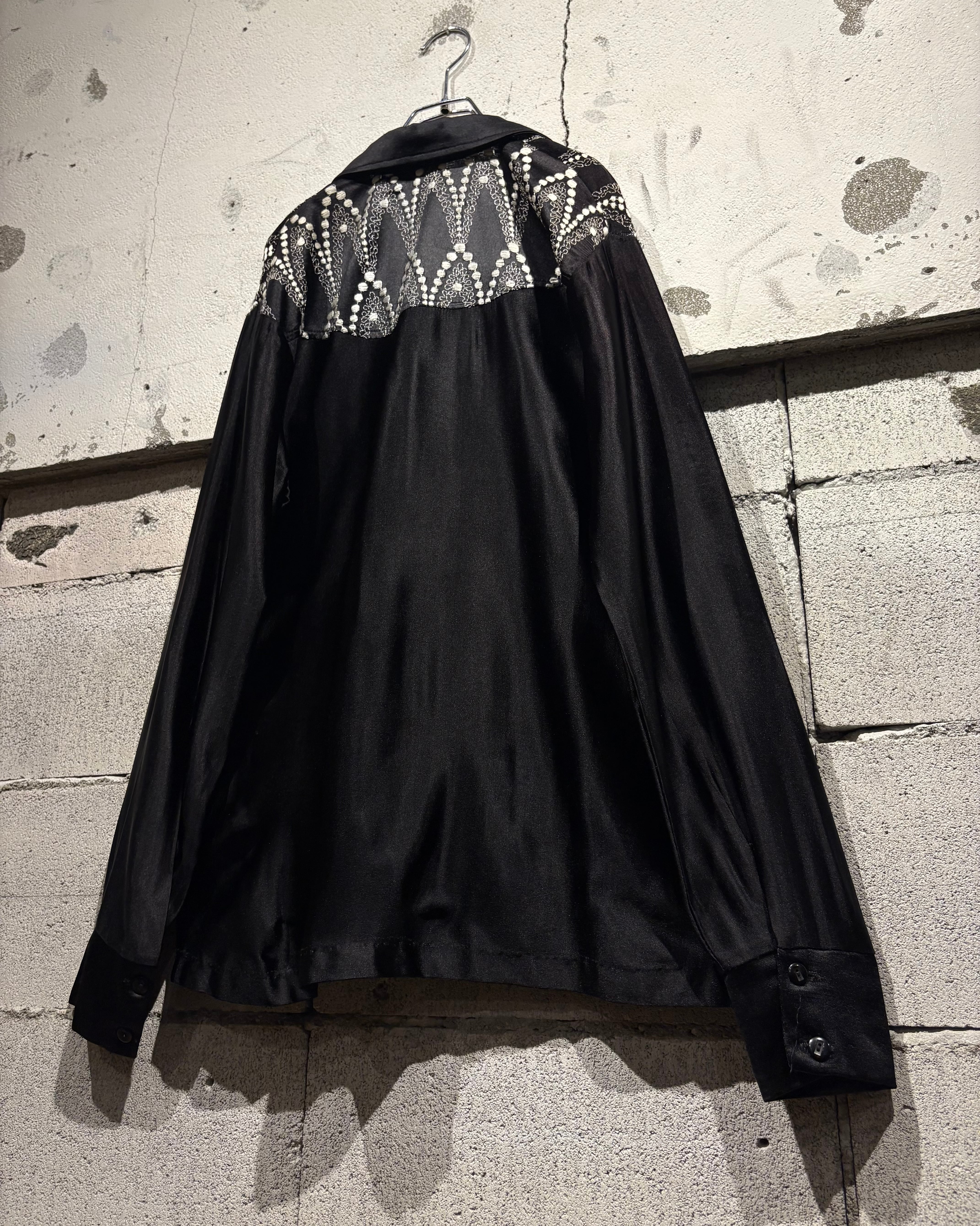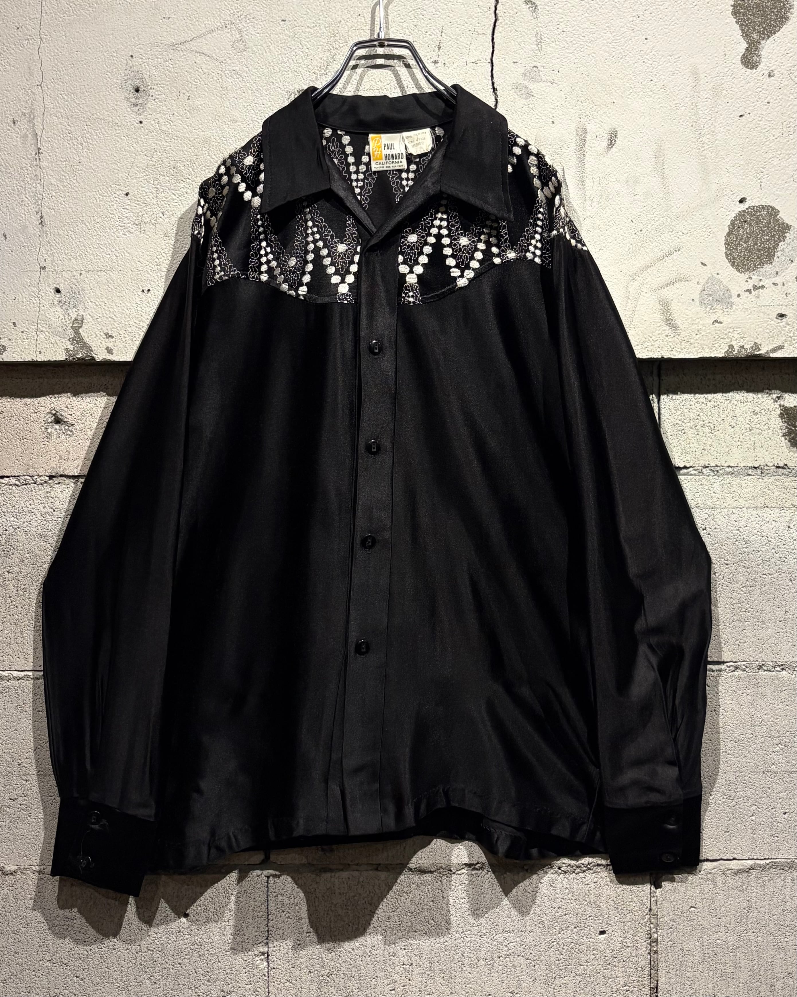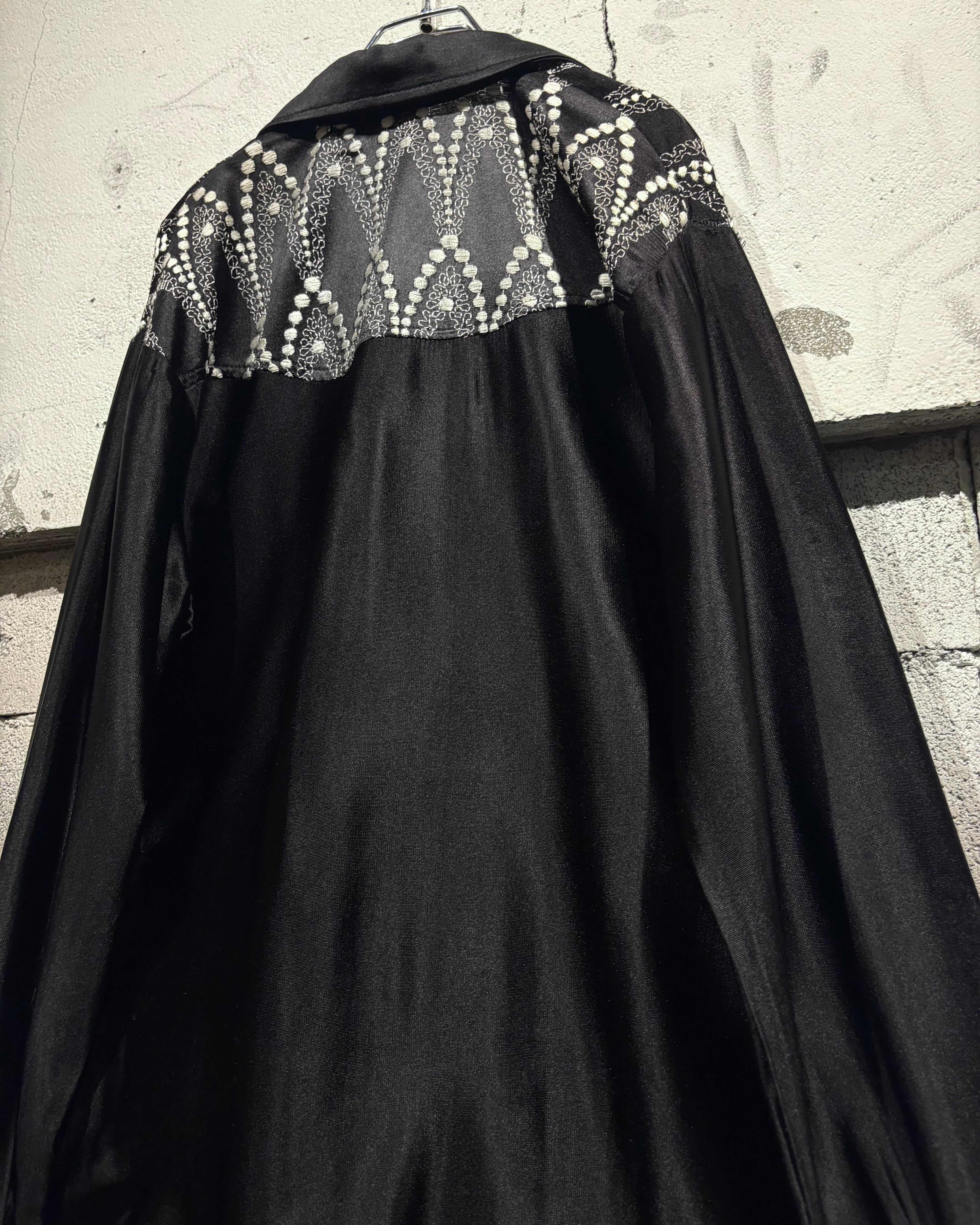 素材の光沢が生み出す上品さと、刺繍デザインによるモードなエッセンスが合わさった、70'sヴィンテージの長袖シャツです。