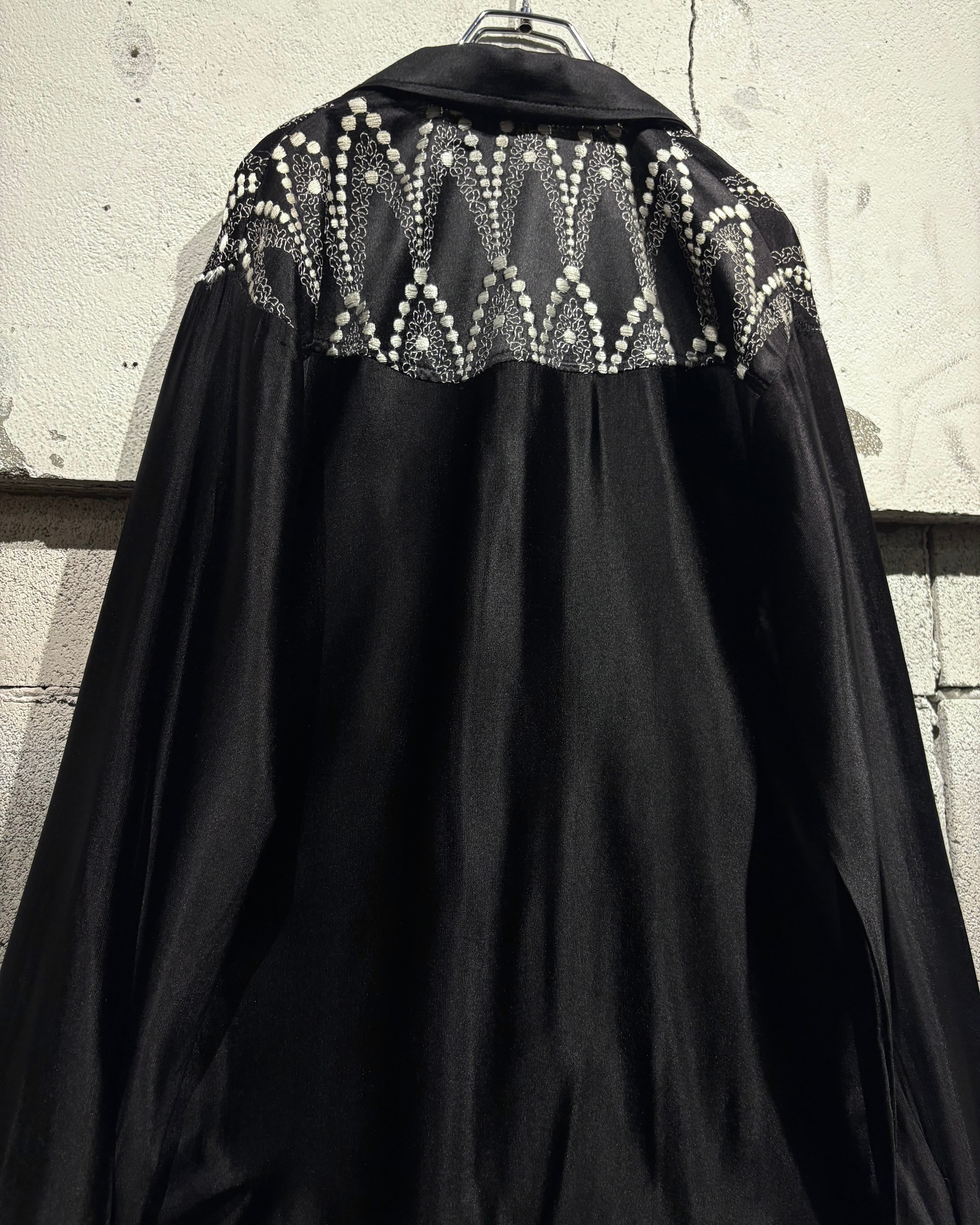 柔らかく若干の光沢を放つブラックのボディをベースに、前後のヨーク部分へ緻密に施された刺繍のデザインが印象的な1着。