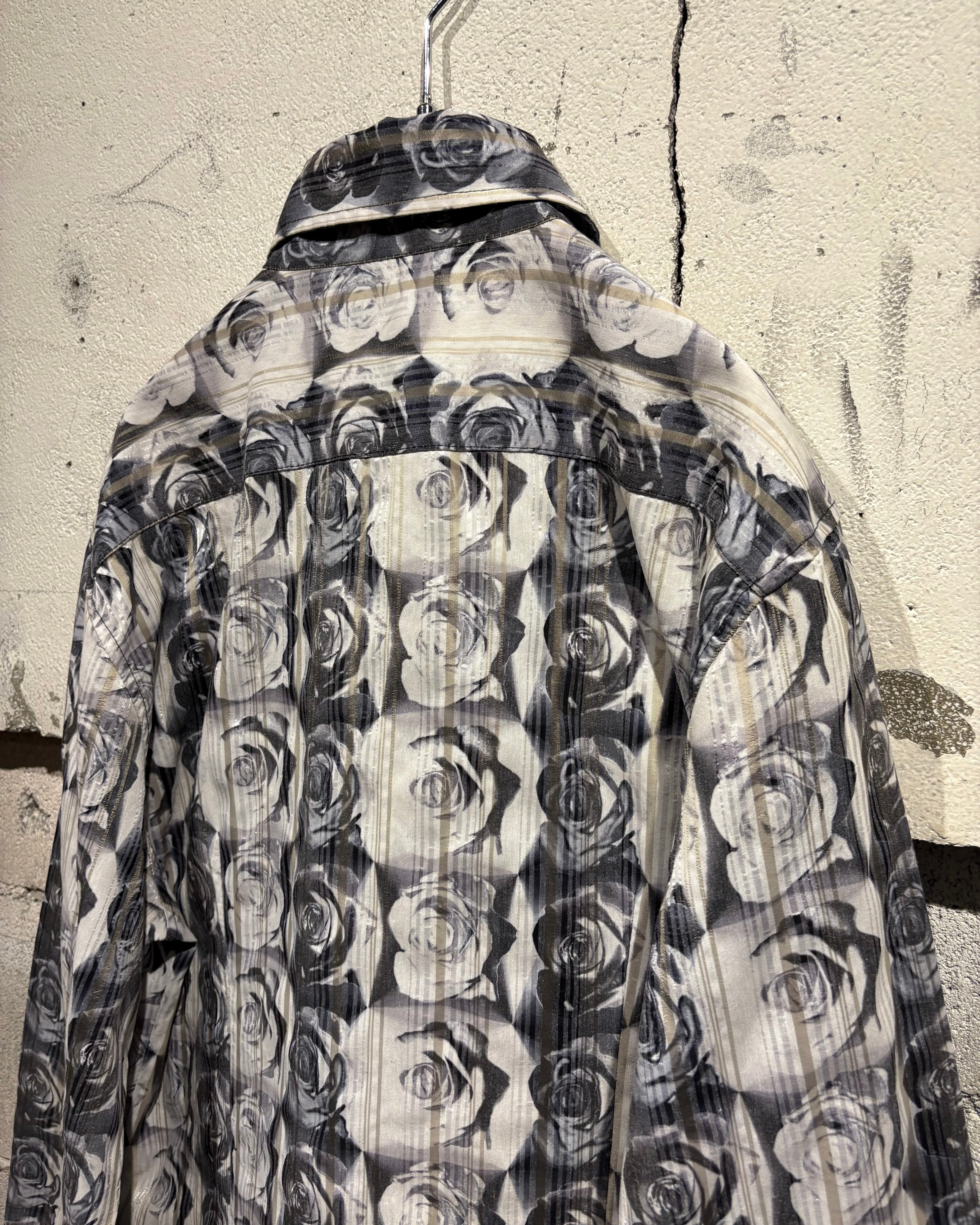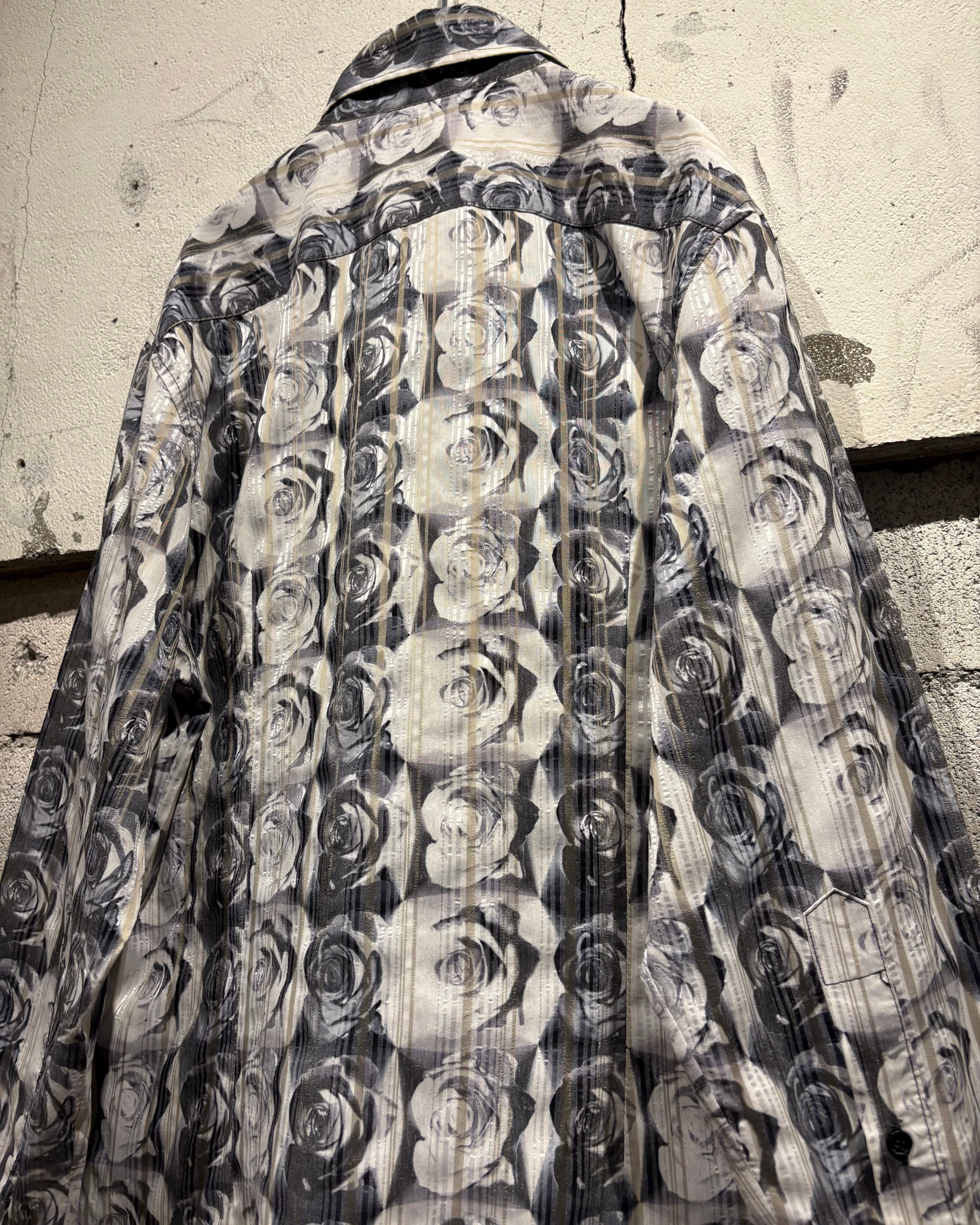 軽やかで滑らかなファブリックをベースに、全面に薔薇柄を落とし込み、さらに織りでストライプを重ねた奥行きのあるデザインに仕上げられた1着。