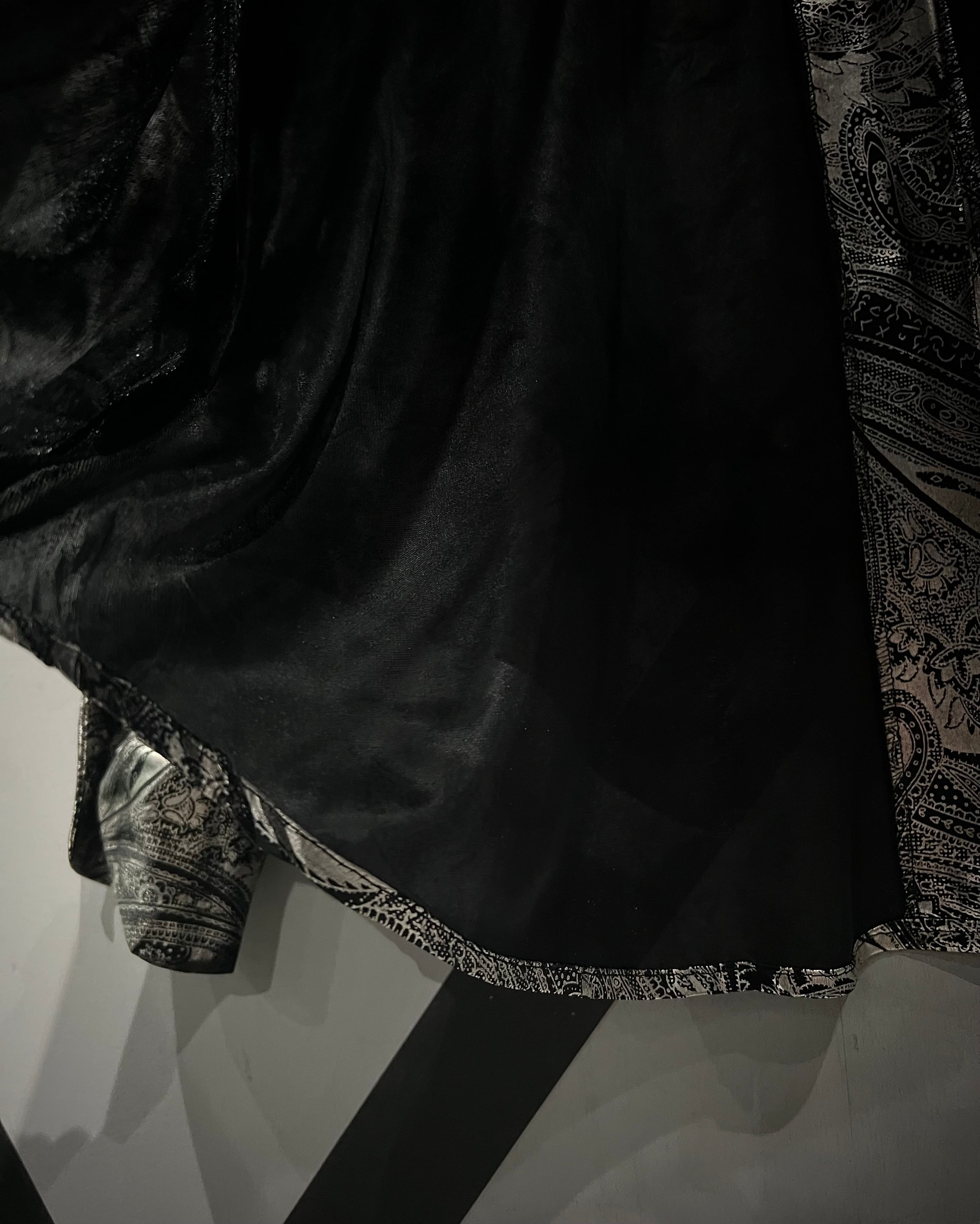全面に落とし込まれたペイズリーパターンは、シャンパンゴールドを基調にブラックとのコントラストで構成された奥行きのある表情を演出。光の当たり方によって表情を変える艶やかな光沢が特徴で、総柄ながらも上品かつ妖艶な雰囲気を醸し出しています。