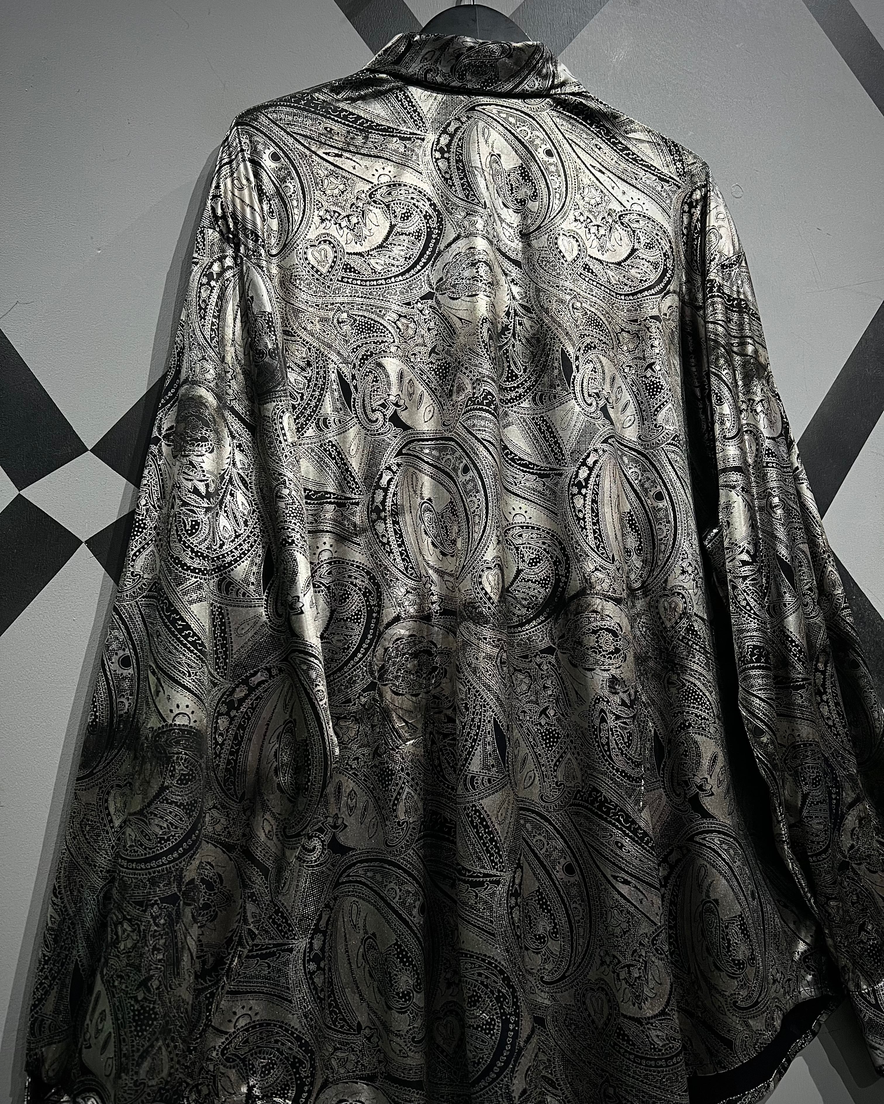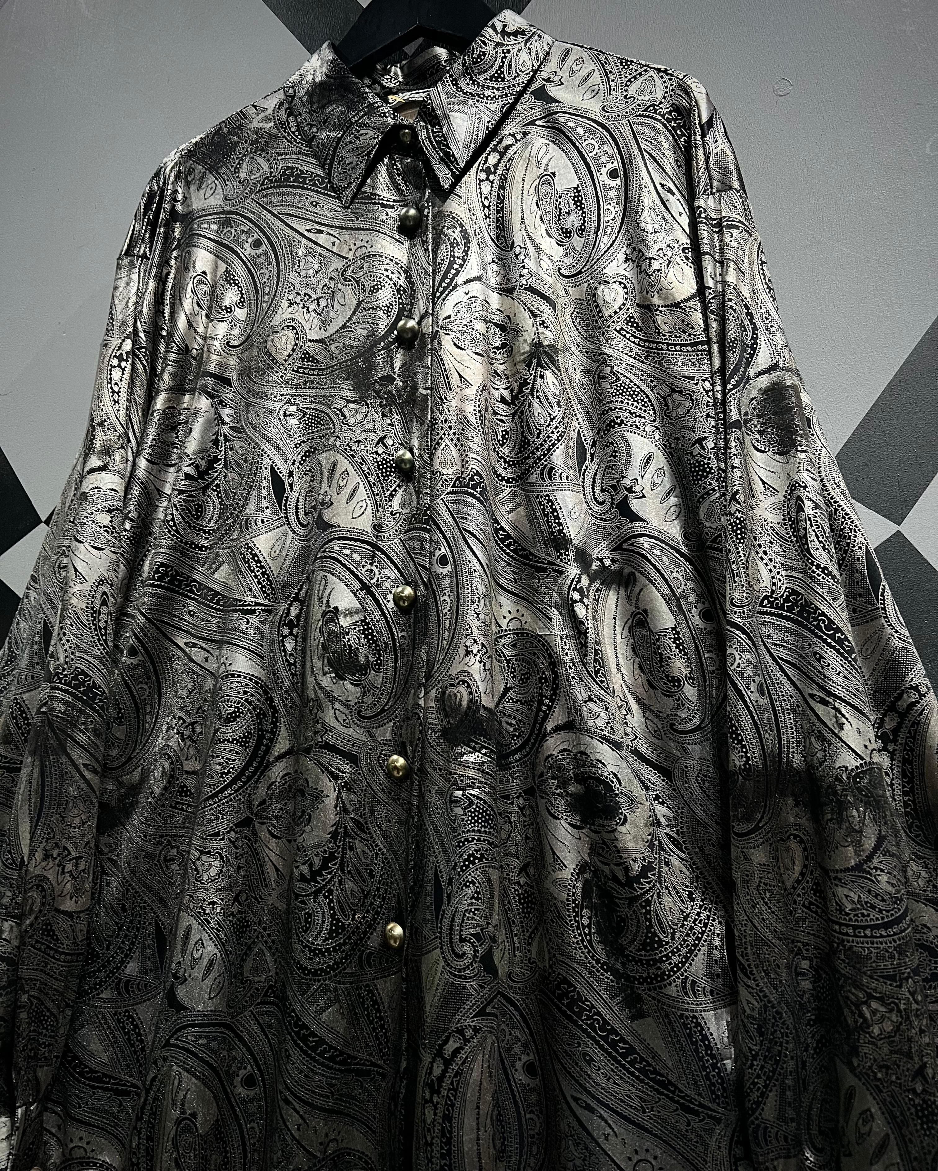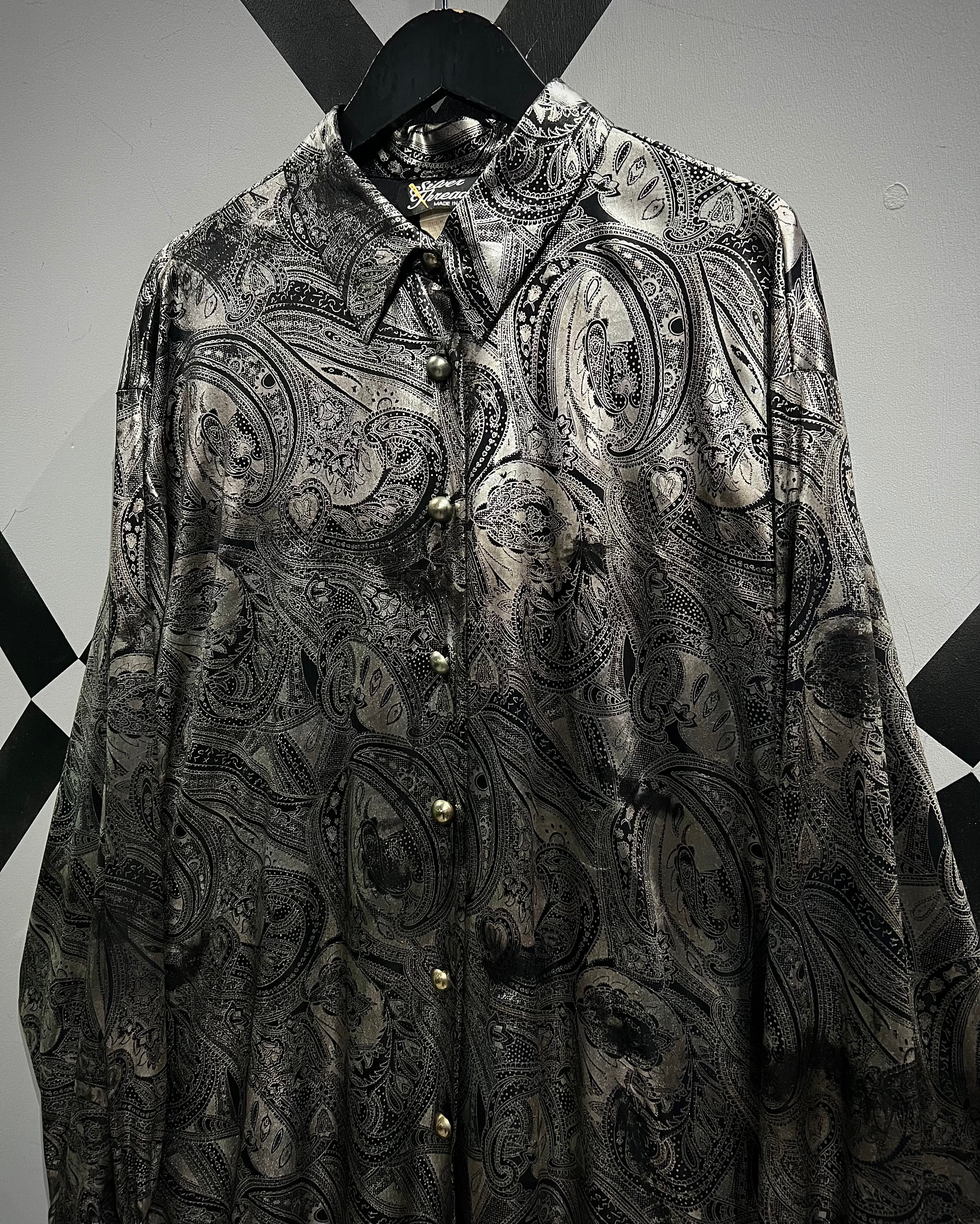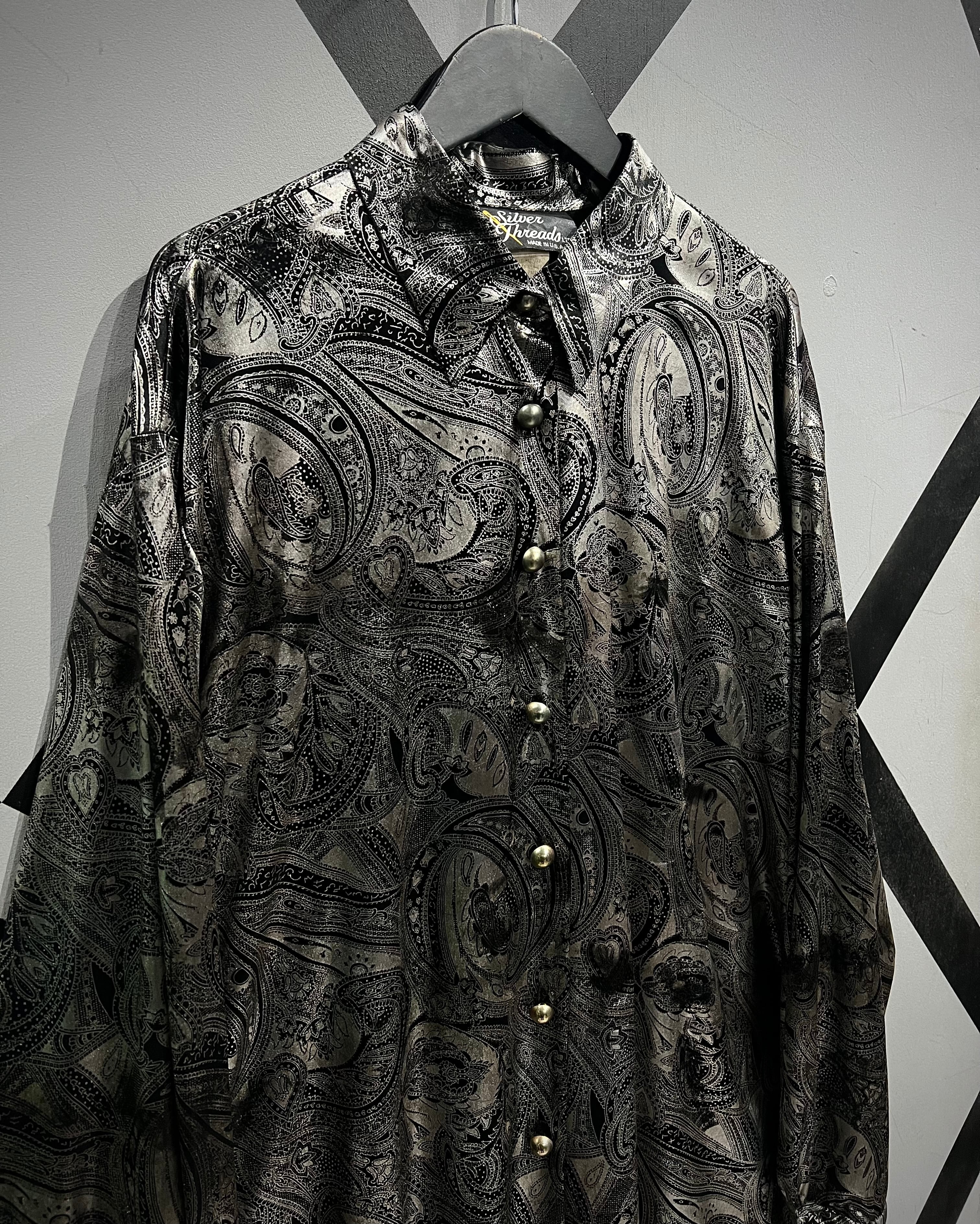 メタリックな光沢を帯びたシルバーのボディをベースにペイズリーパターンを載せた90’s USA製の長袖シャツ。