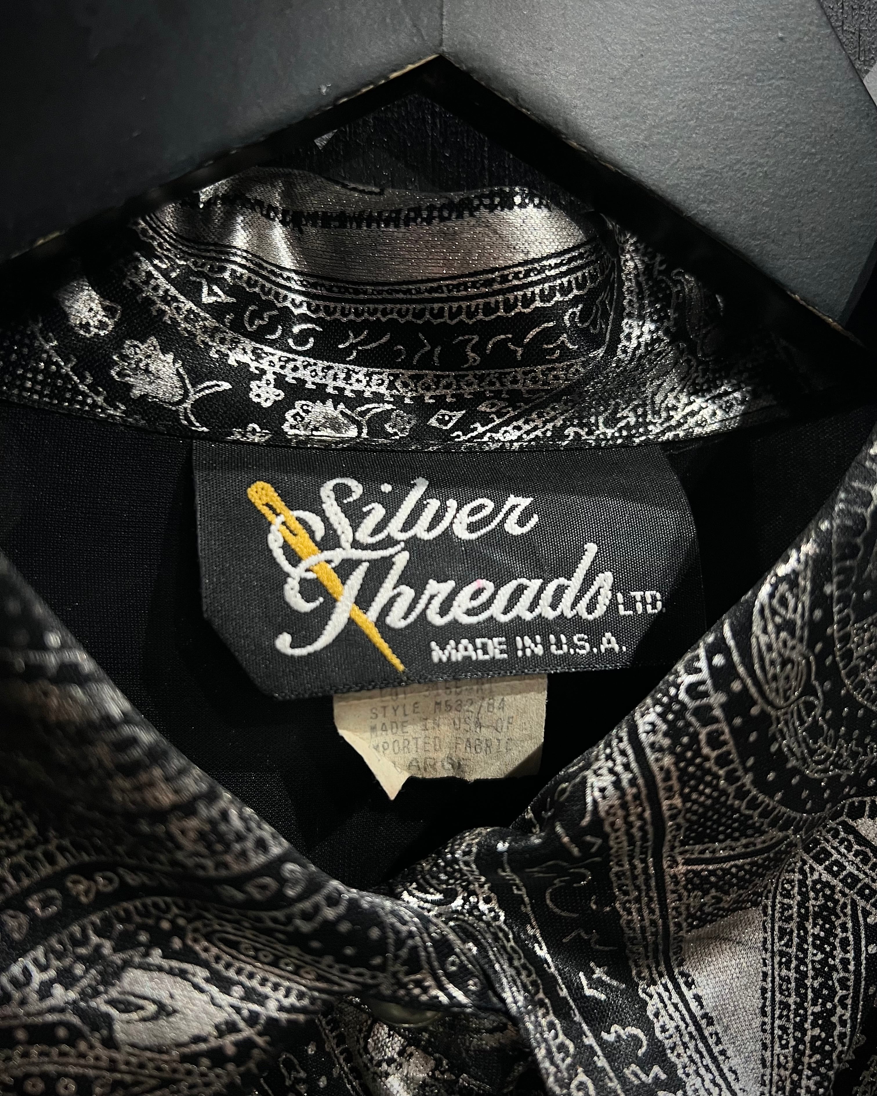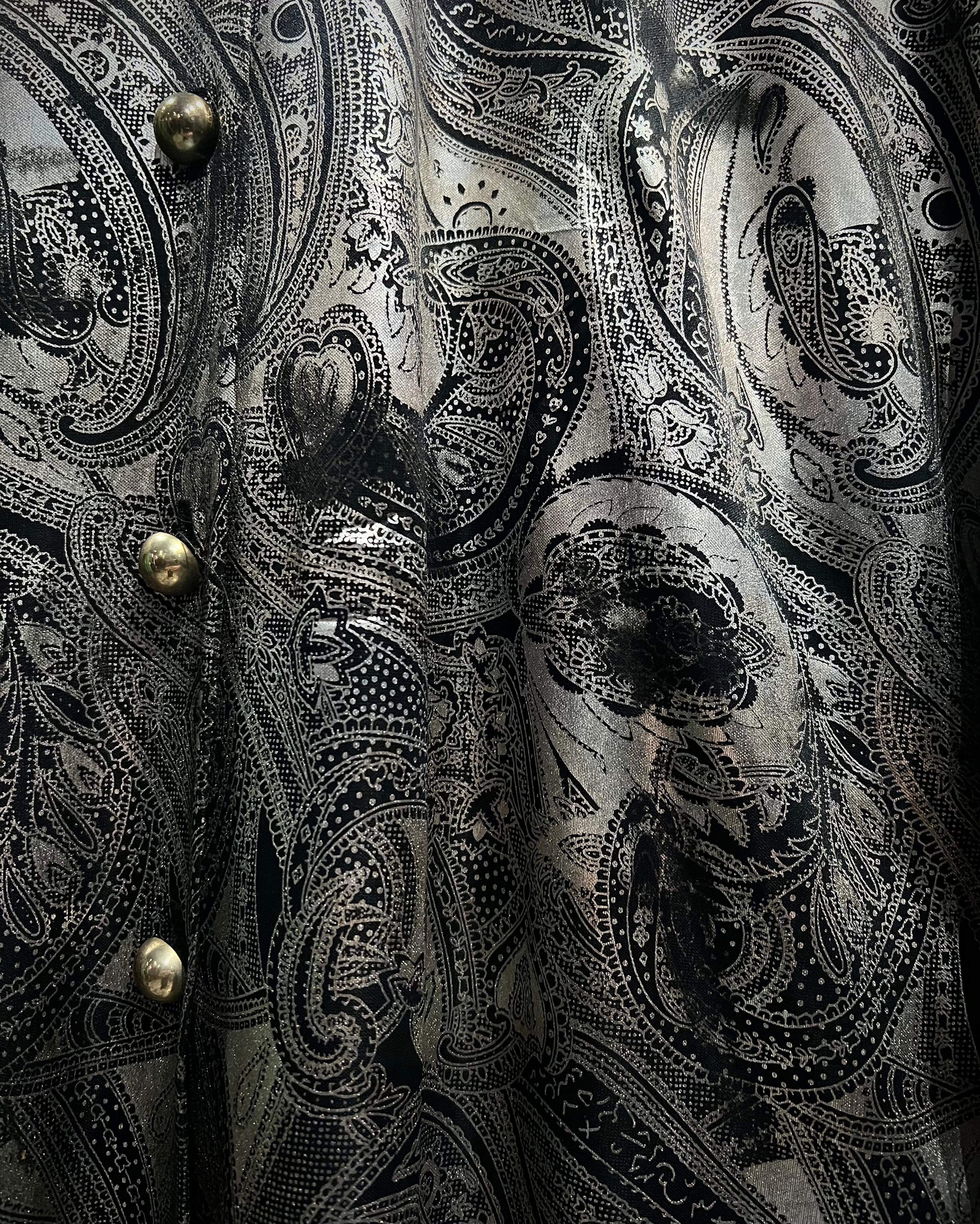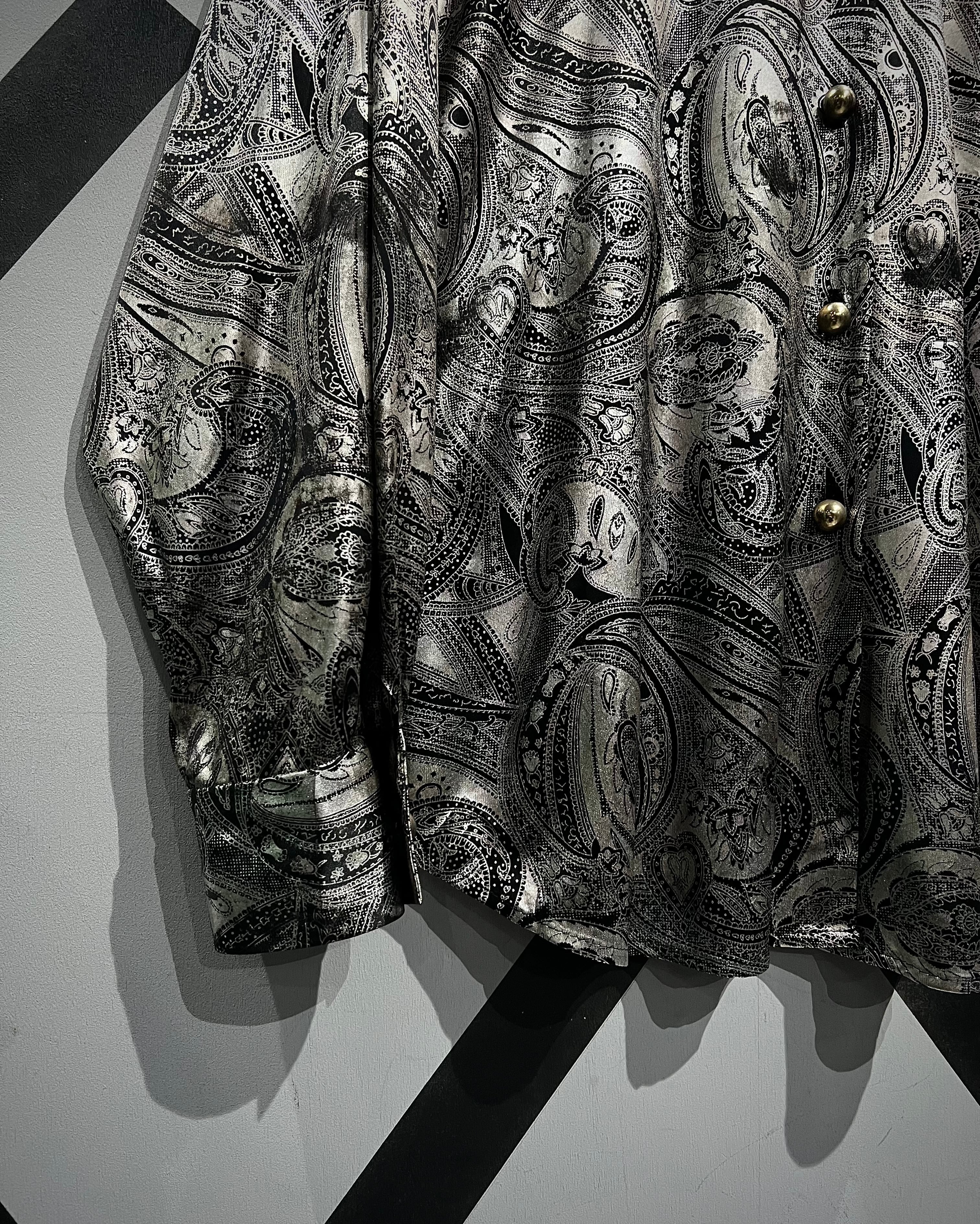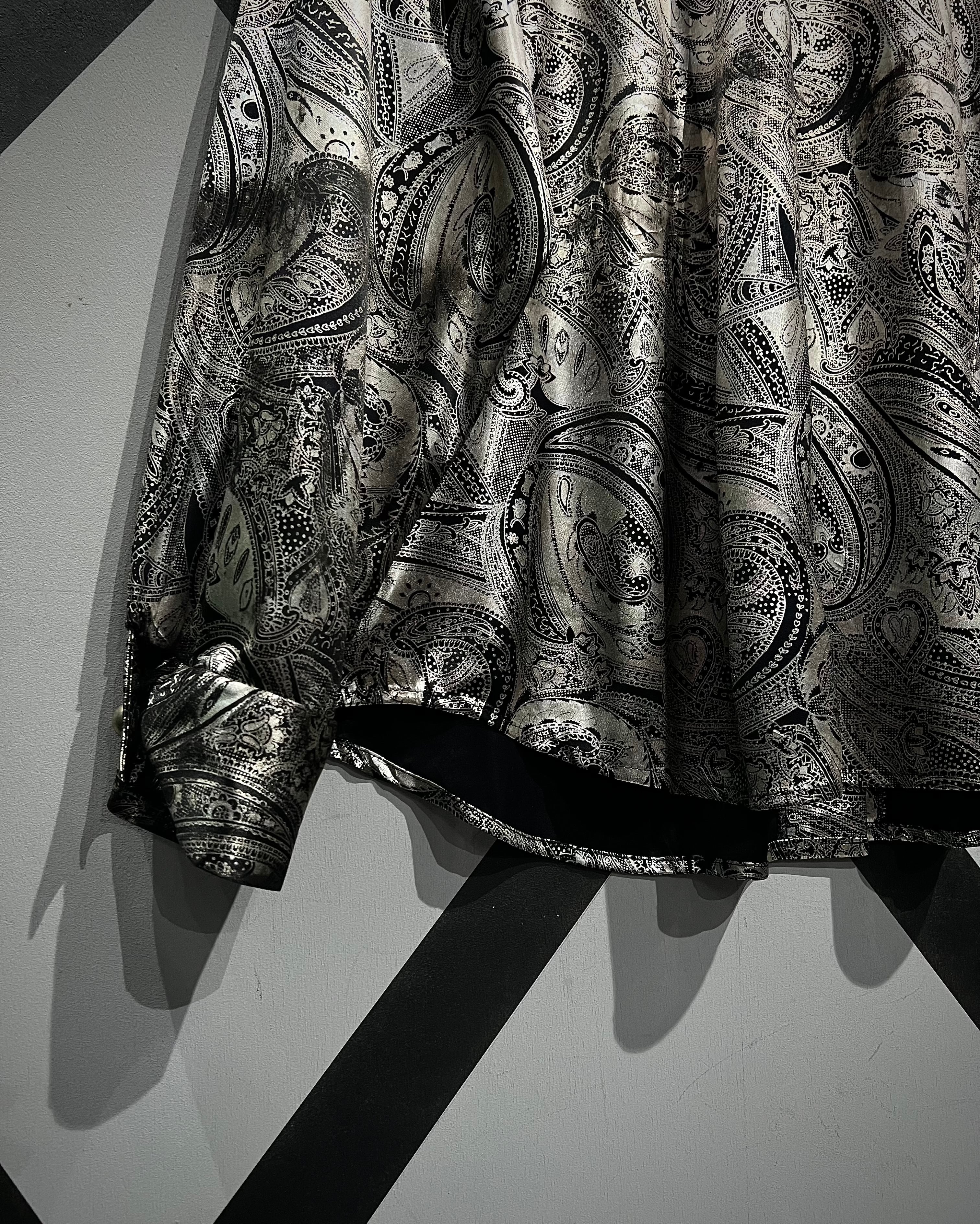 メタリックな光沢を帯びたシルバーのボディをベースにペイズリーパターンを載せた90’s USA製の長袖シャツ。
