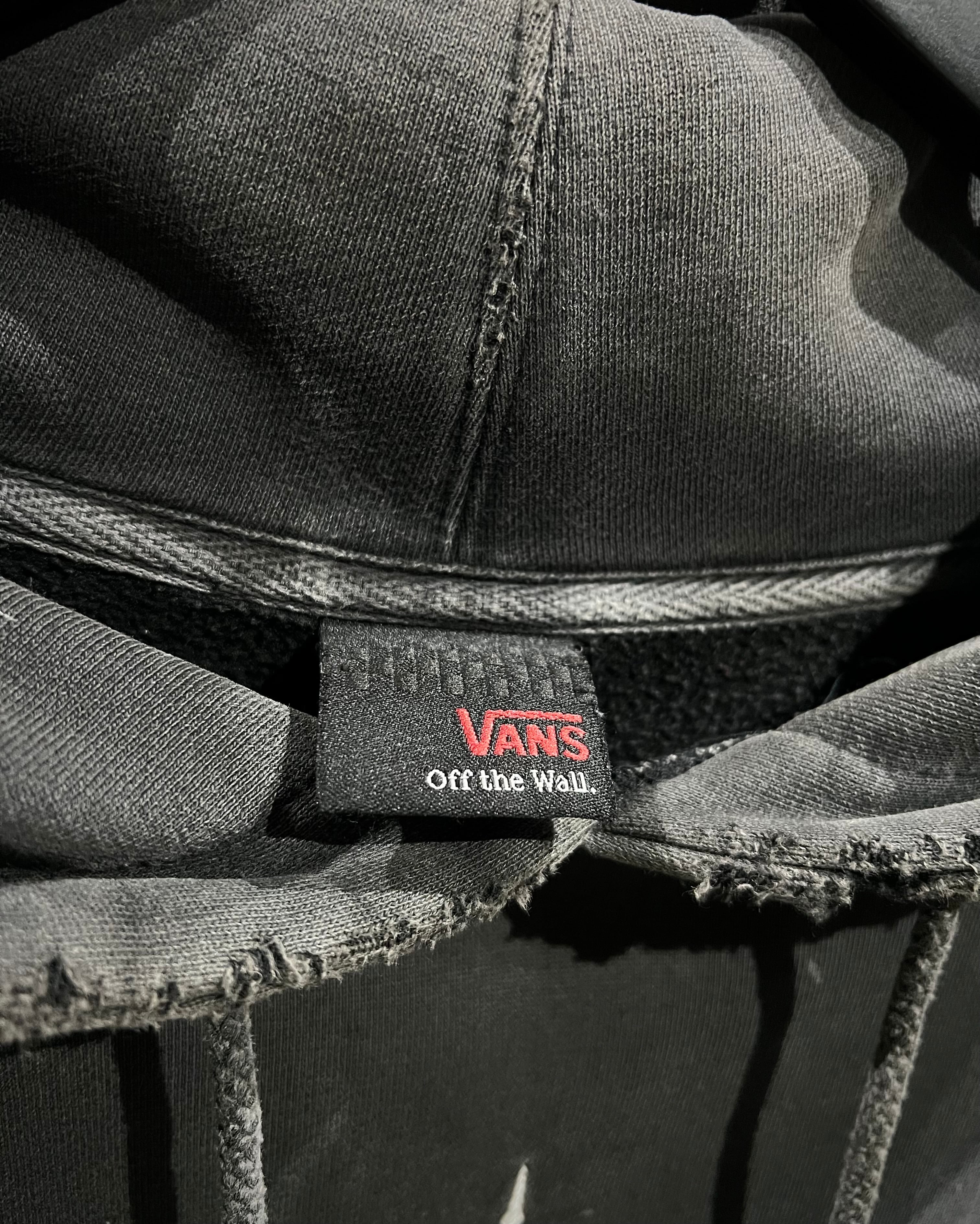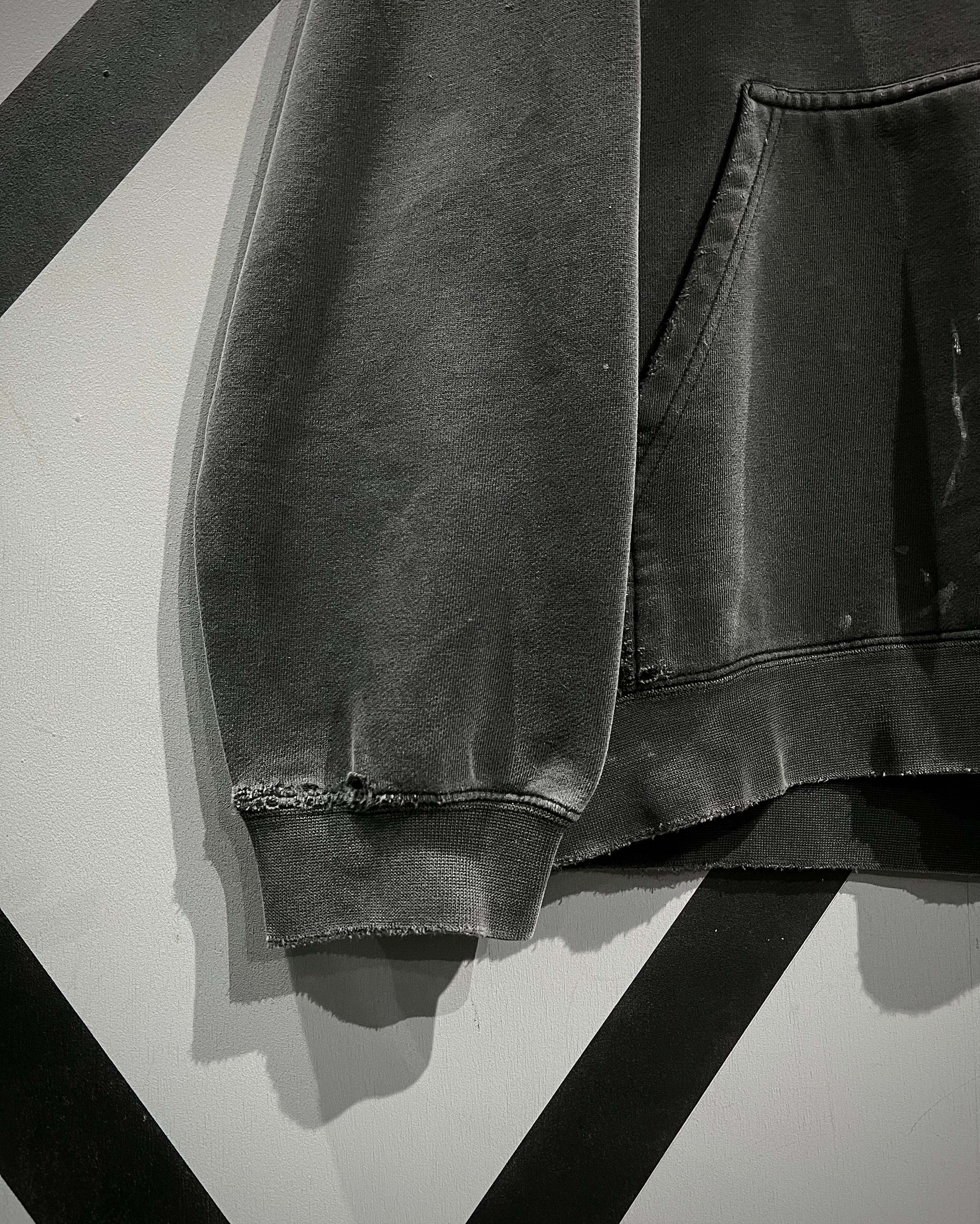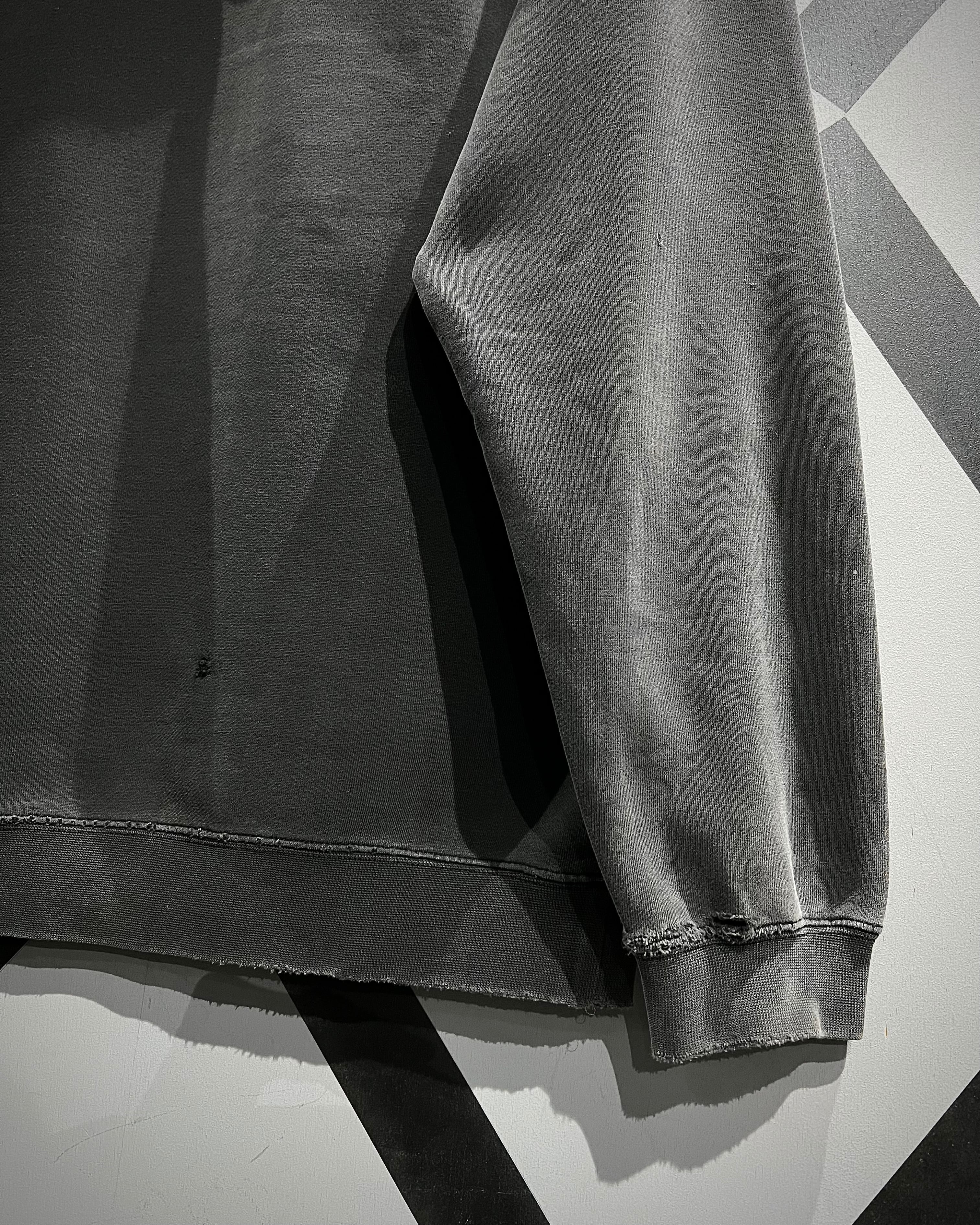 各所に見られるダメージや汚れは、単なるコンディションではなく、スケーターのリアルなライフスタイルを映し出したディテール。襟元や袖口の擦れ、フェードしたボディとのバランスも相まって、唯一無二の雰囲気を形成しています。