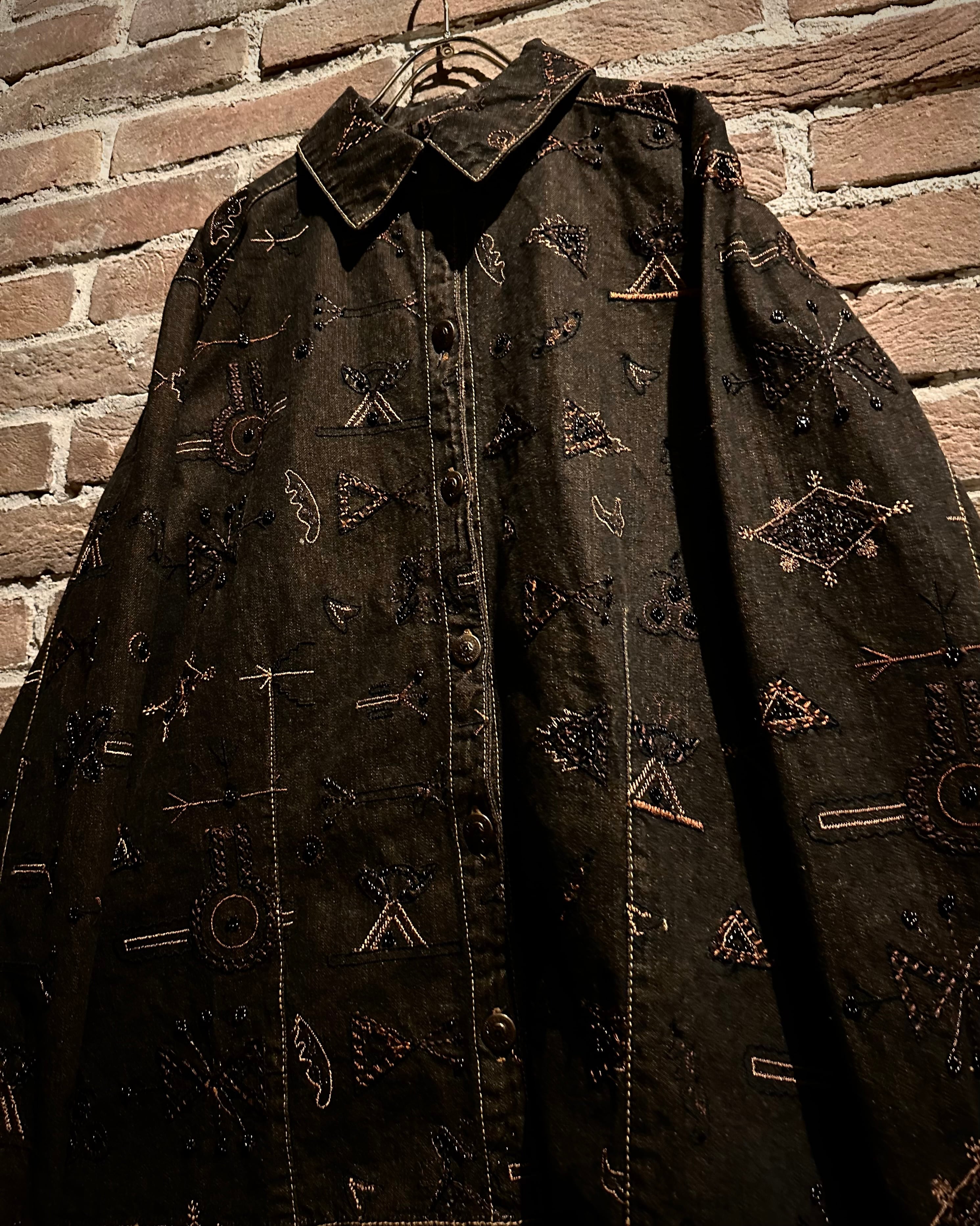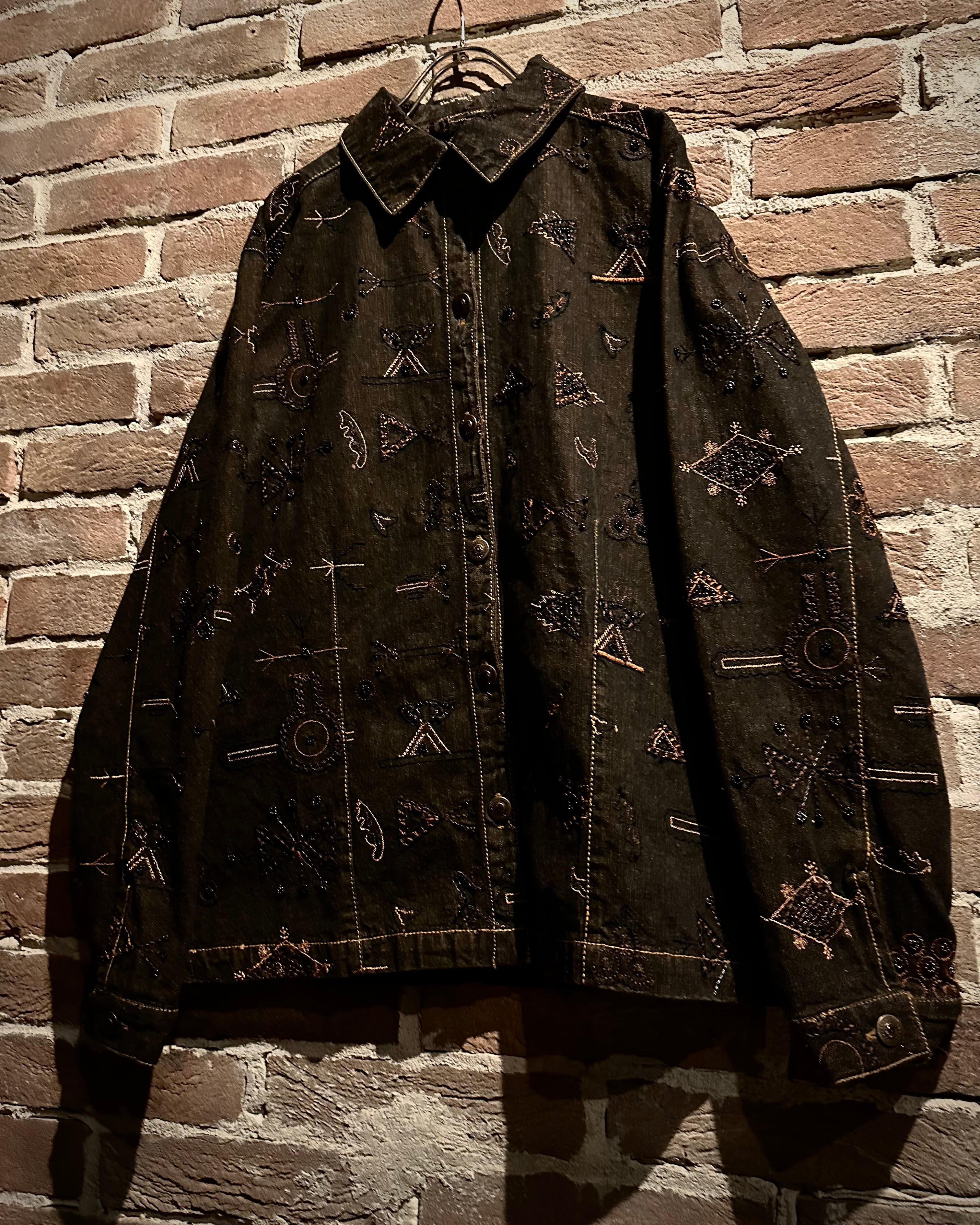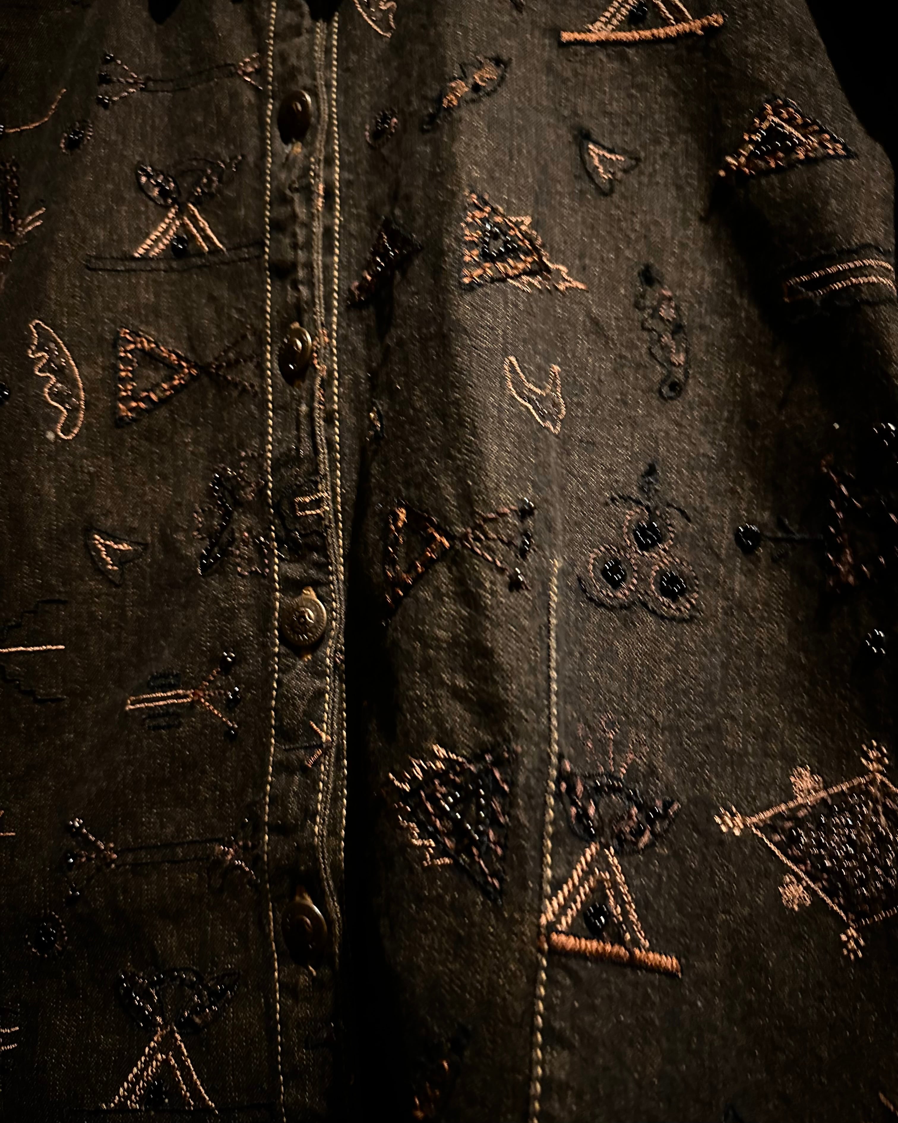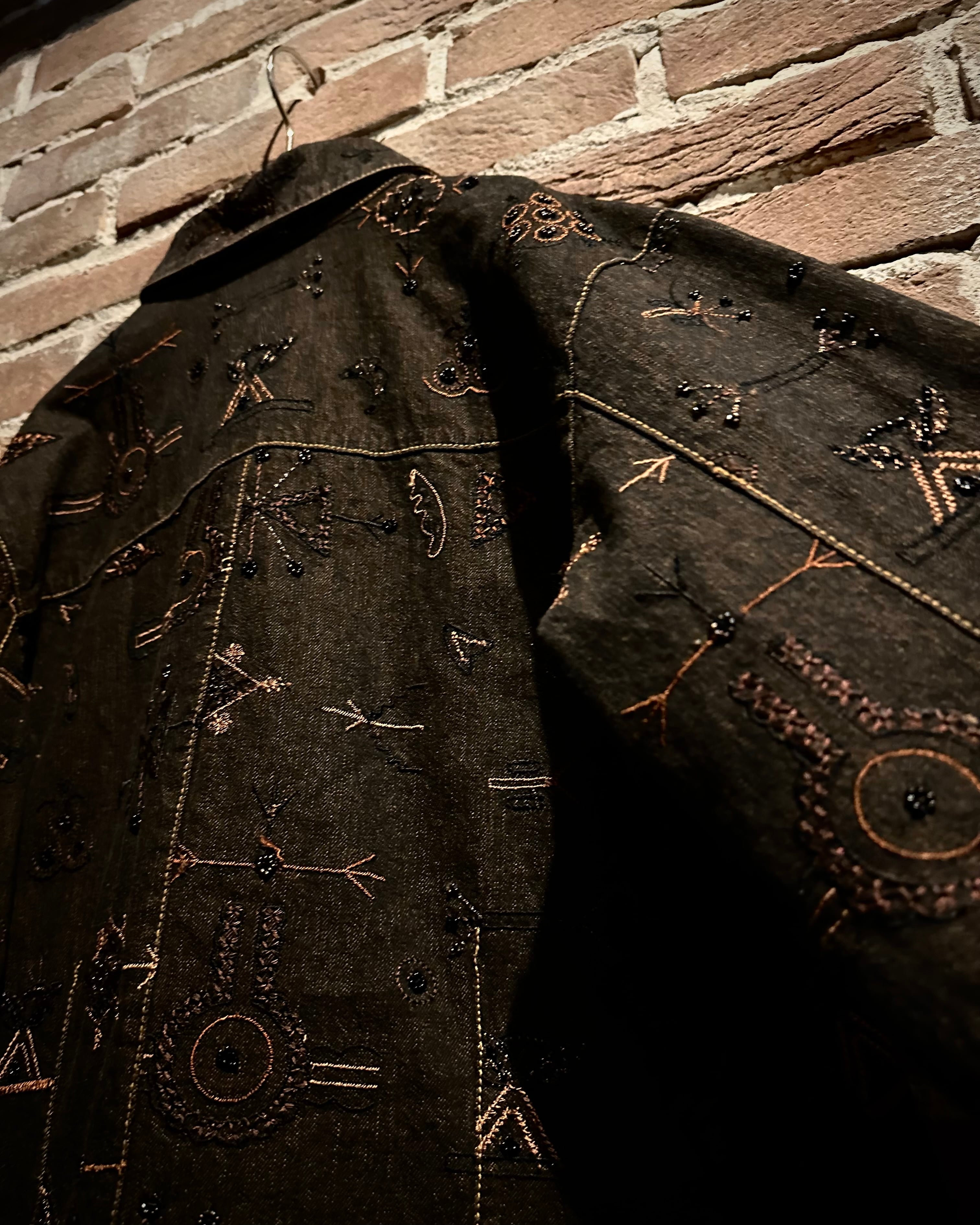 縦糸にブラック、横糸にオレンジを走らせた、奥行きのある独特な色味のデニムをボディに採用し、全体にアーティスティックな刺繍とビーズ装飾を施したデニムシャツジャケット。
