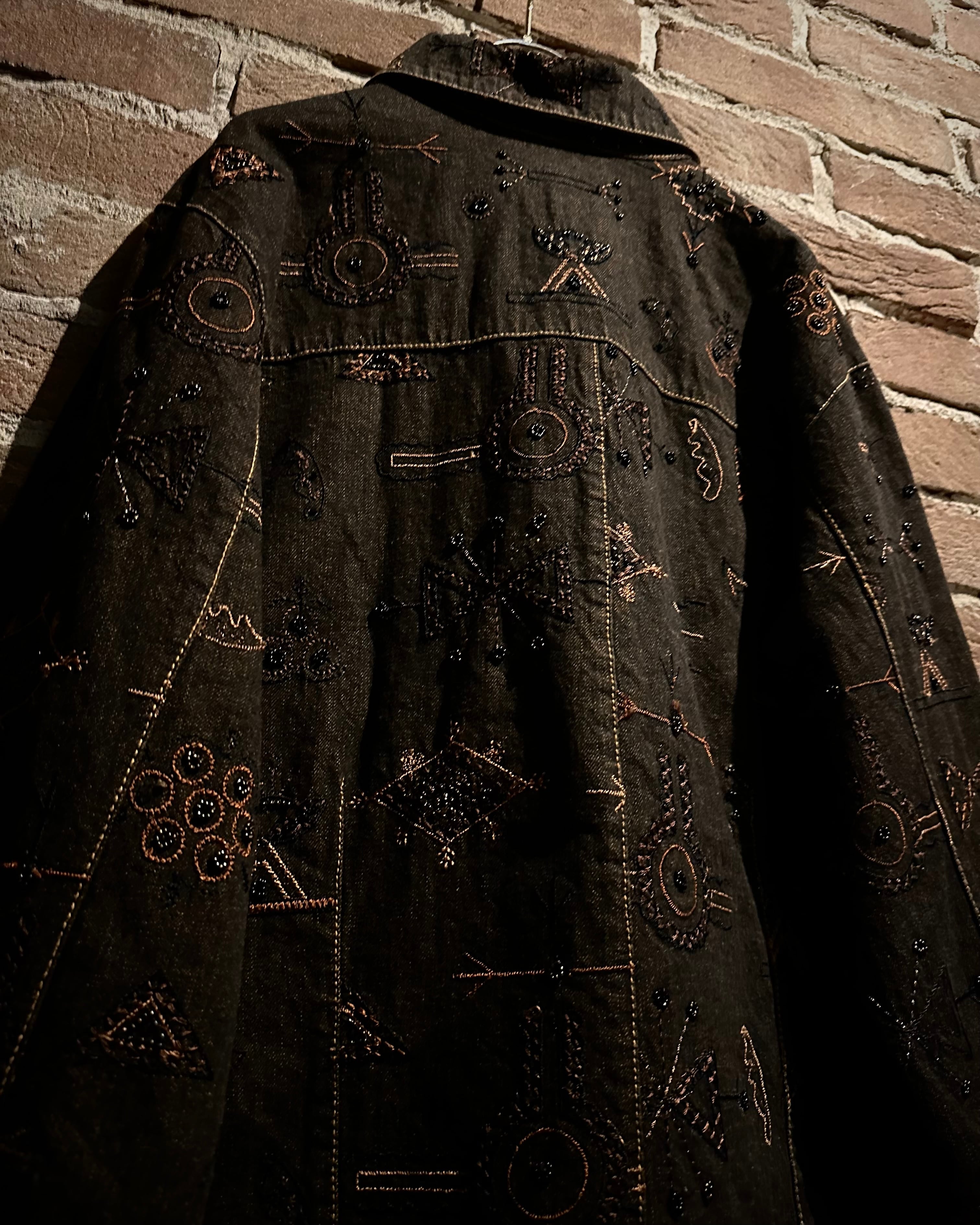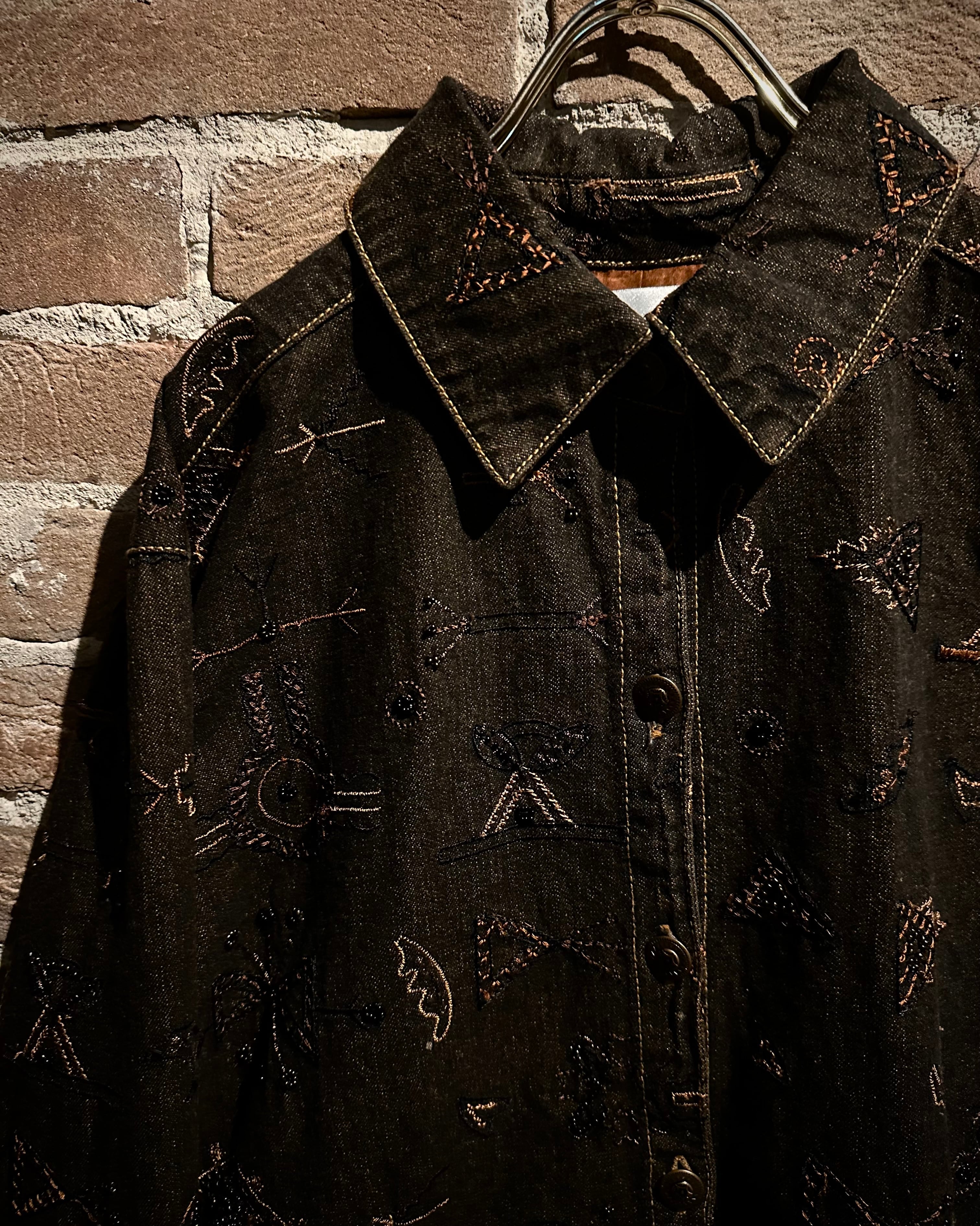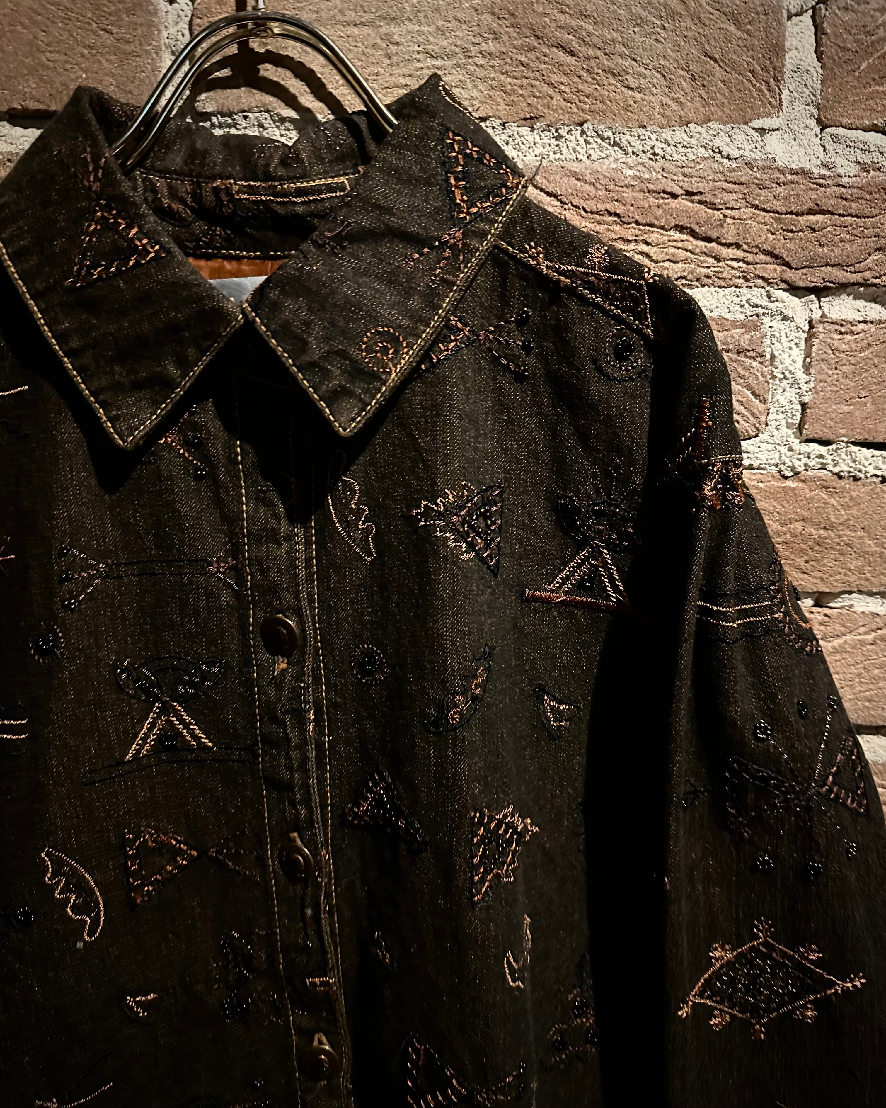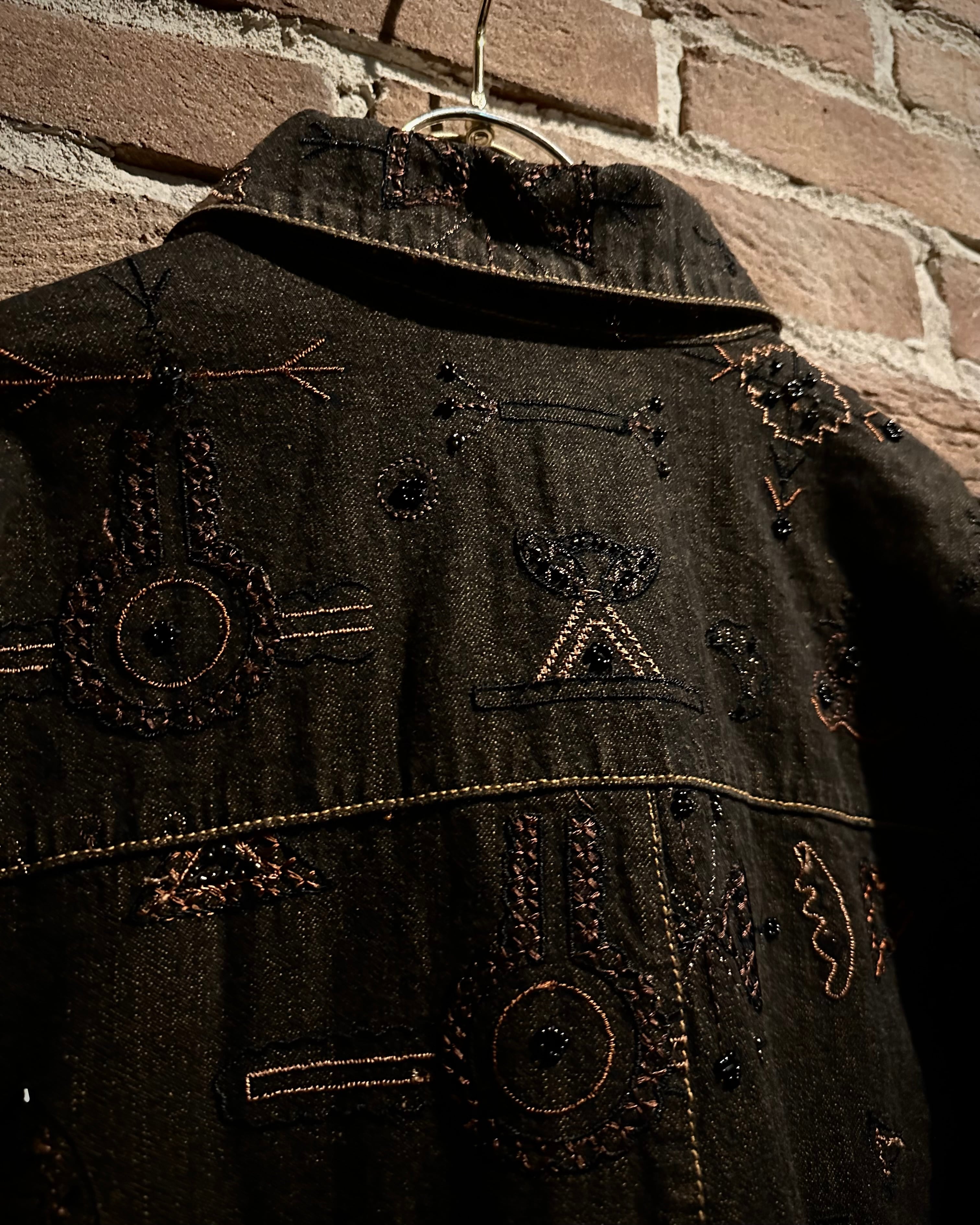 縦糸にブラック、横糸にオレンジを走らせた、奥行きのある独特な色味のデニムをボディに採用し、全体にアーティスティックな刺繍とビーズ装飾を施したデニムシャツジャケット。