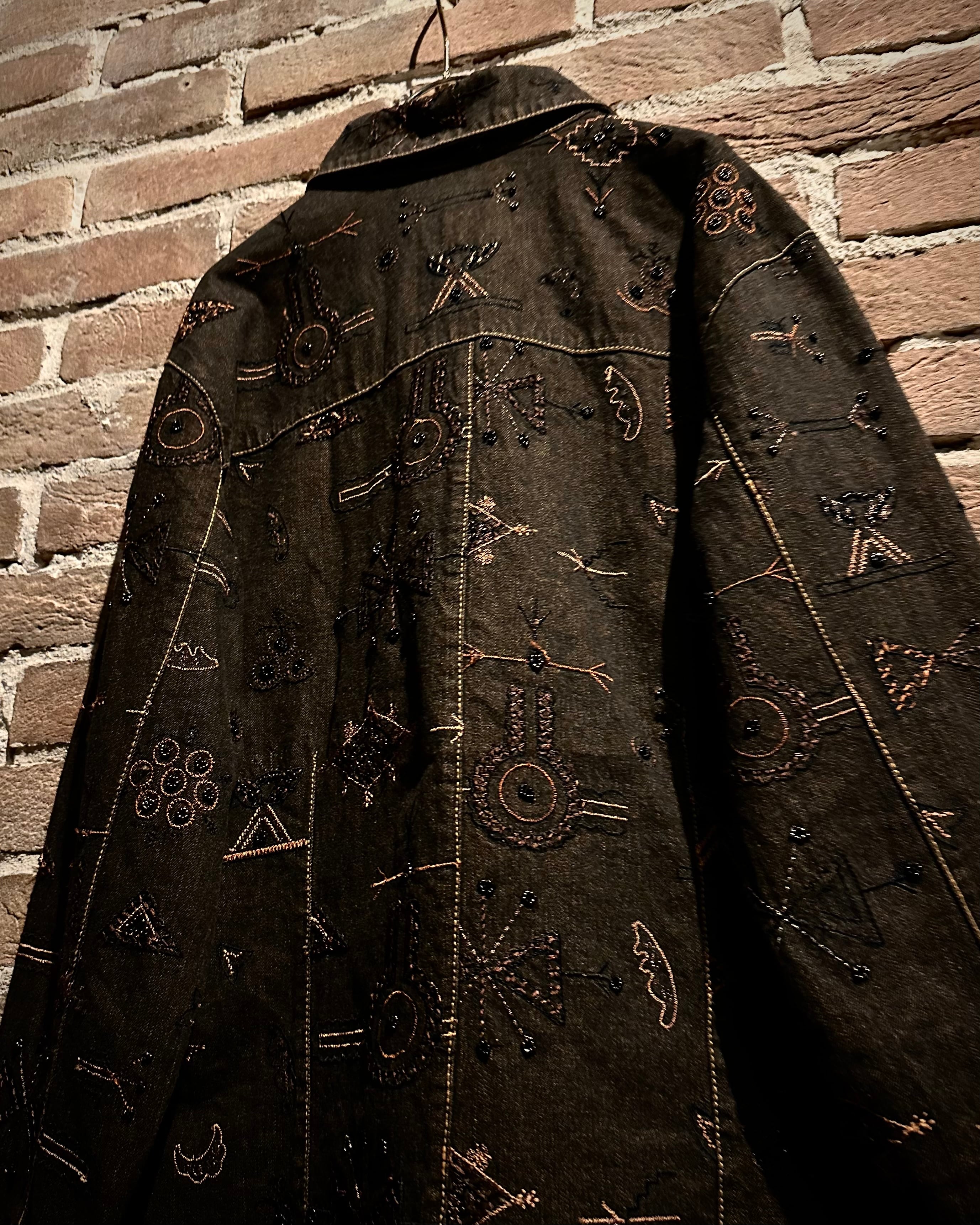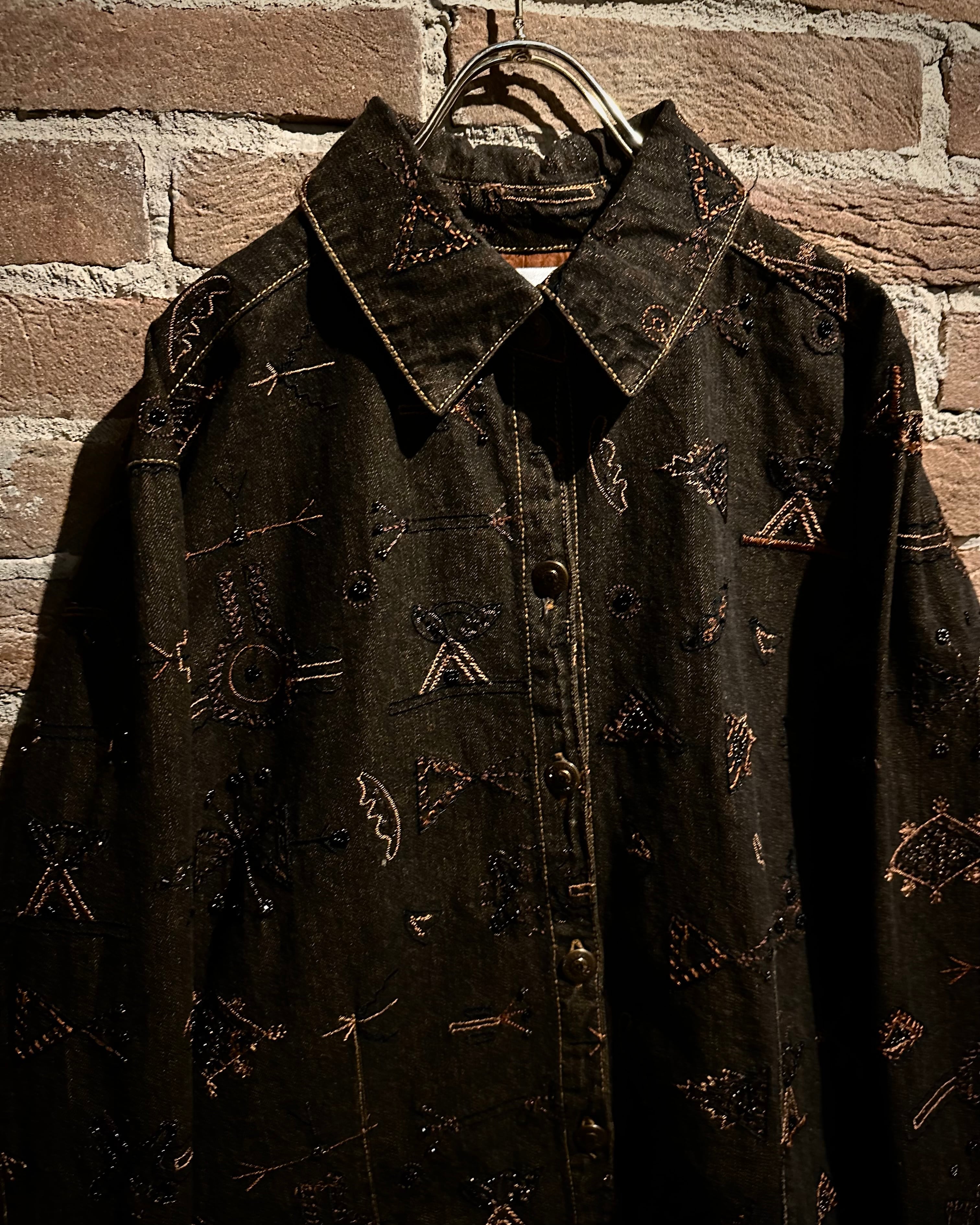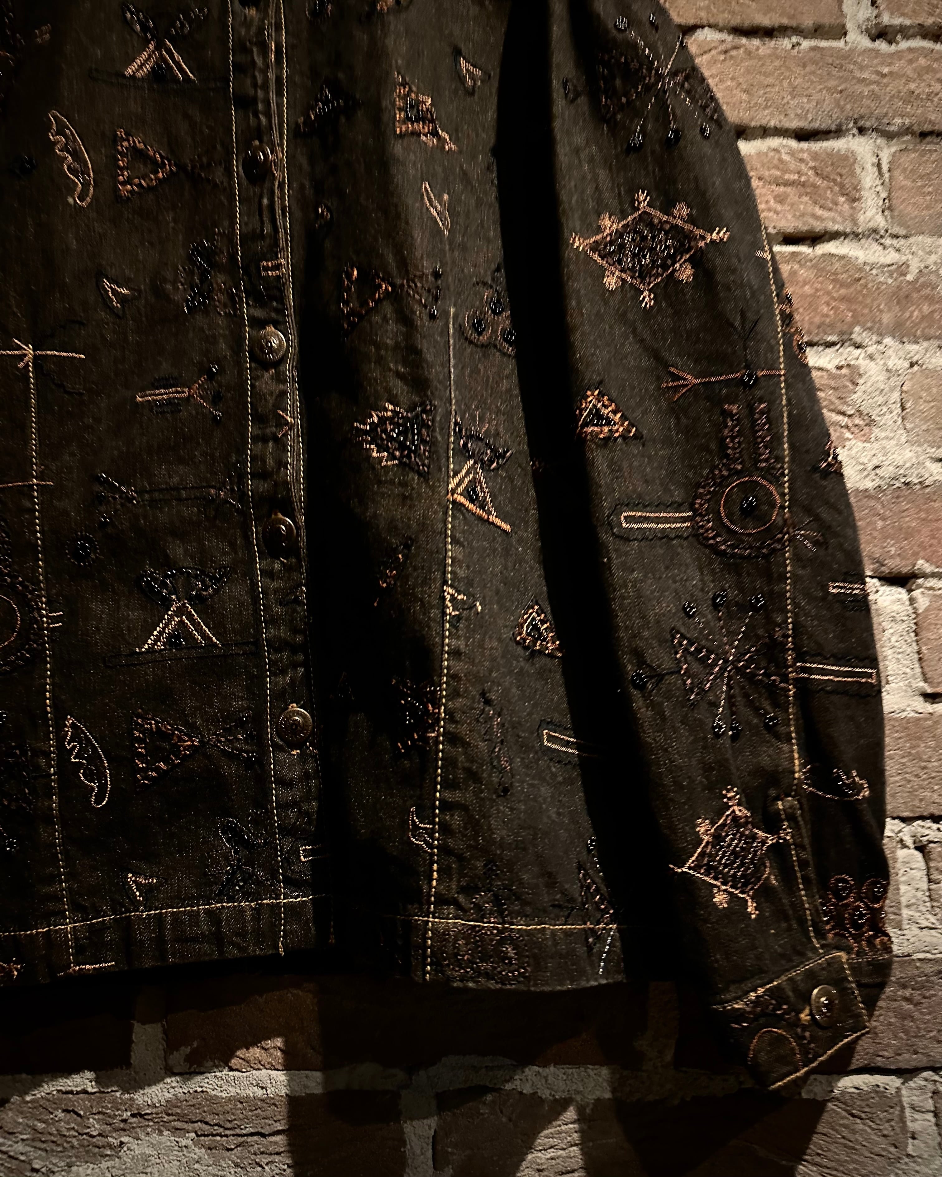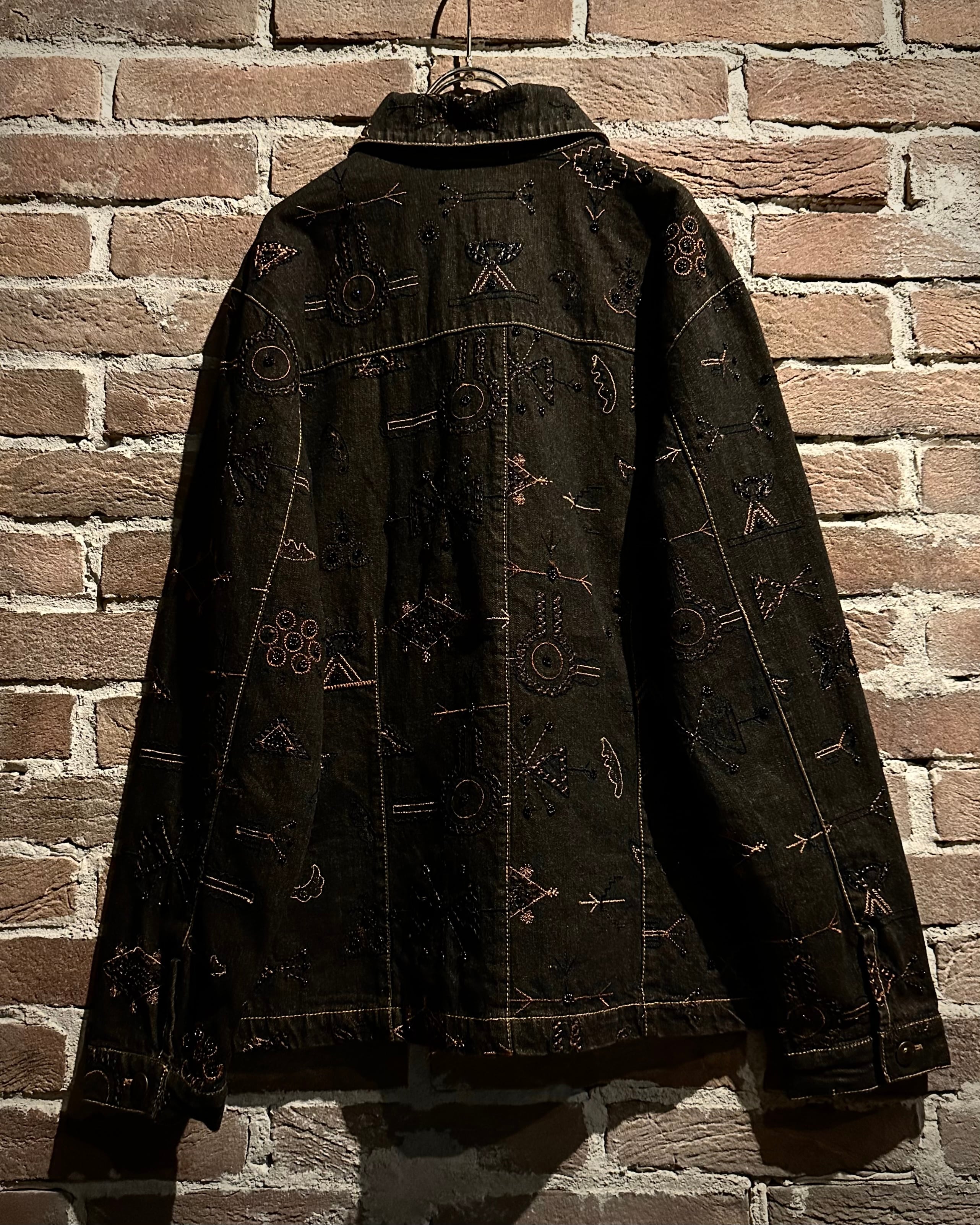 縦糸にブラック、横糸にオレンジを走らせた、奥行きのある独特な色味のデニムをボディに採用し、全体にアーティスティックな刺繍とビーズ装飾を施したデニムシャツジャケット。