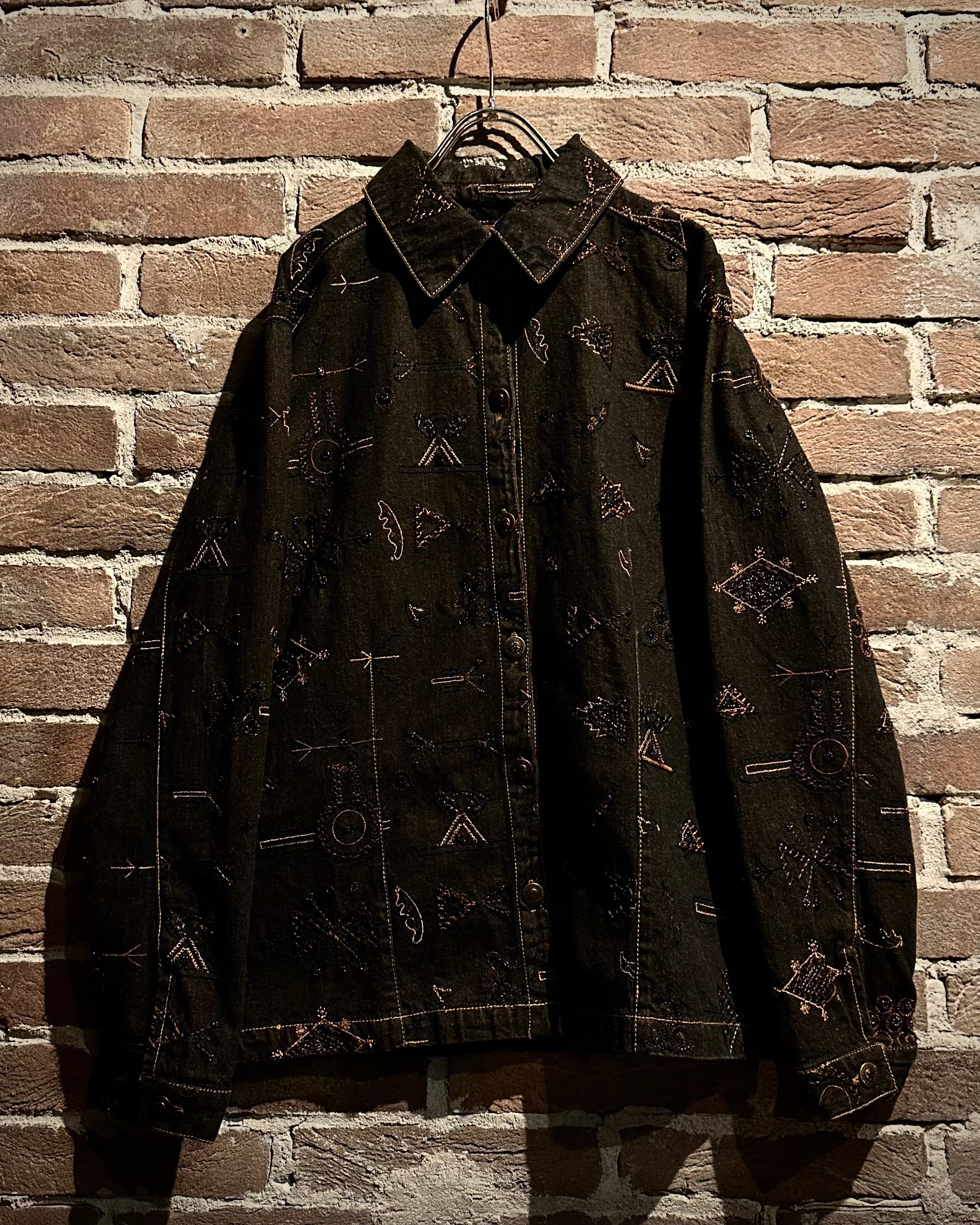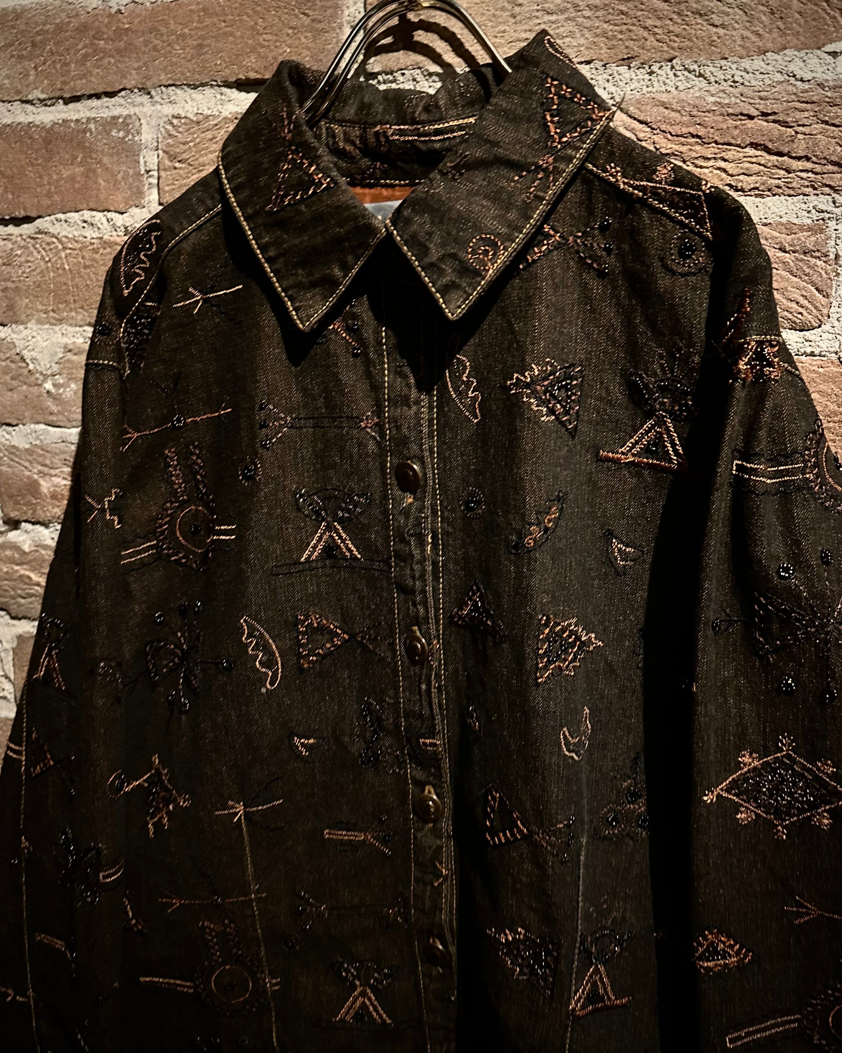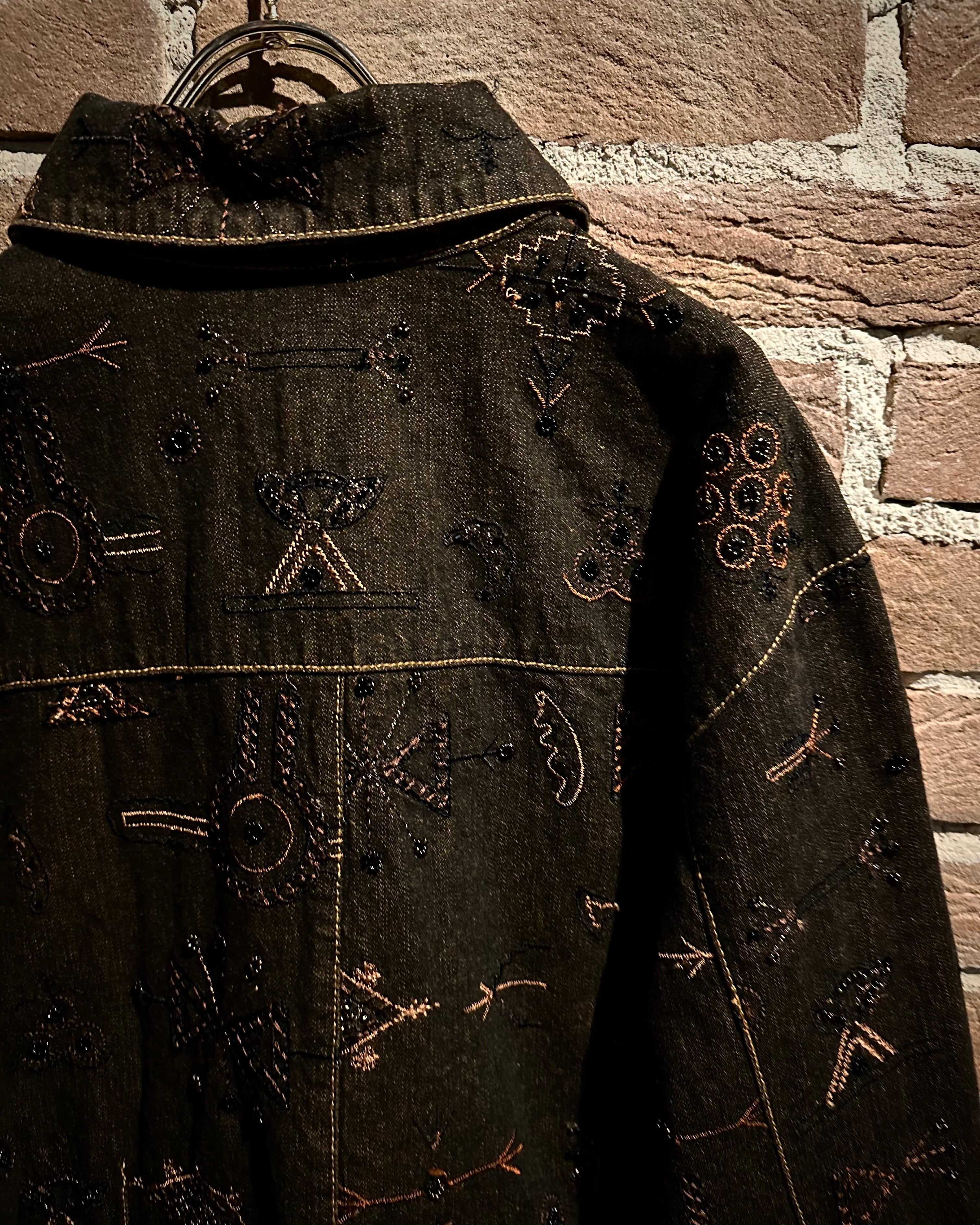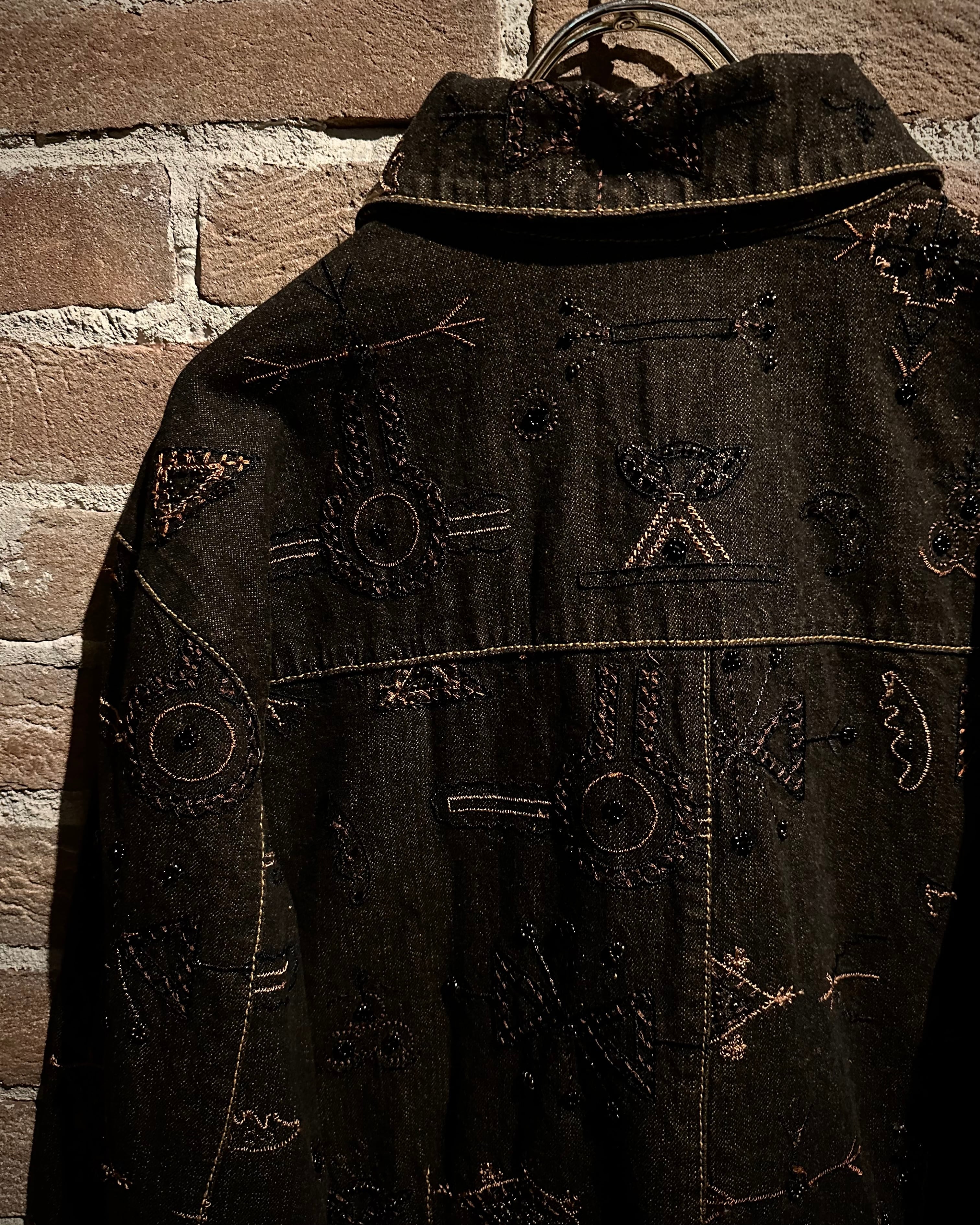 縦糸にブラック、横糸にオレンジを走らせた、奥行きのある独特な色味のデニムをボディに採用し、全体にアーティスティックな刺繍とビーズ装飾を施したデニムシャツジャケット。