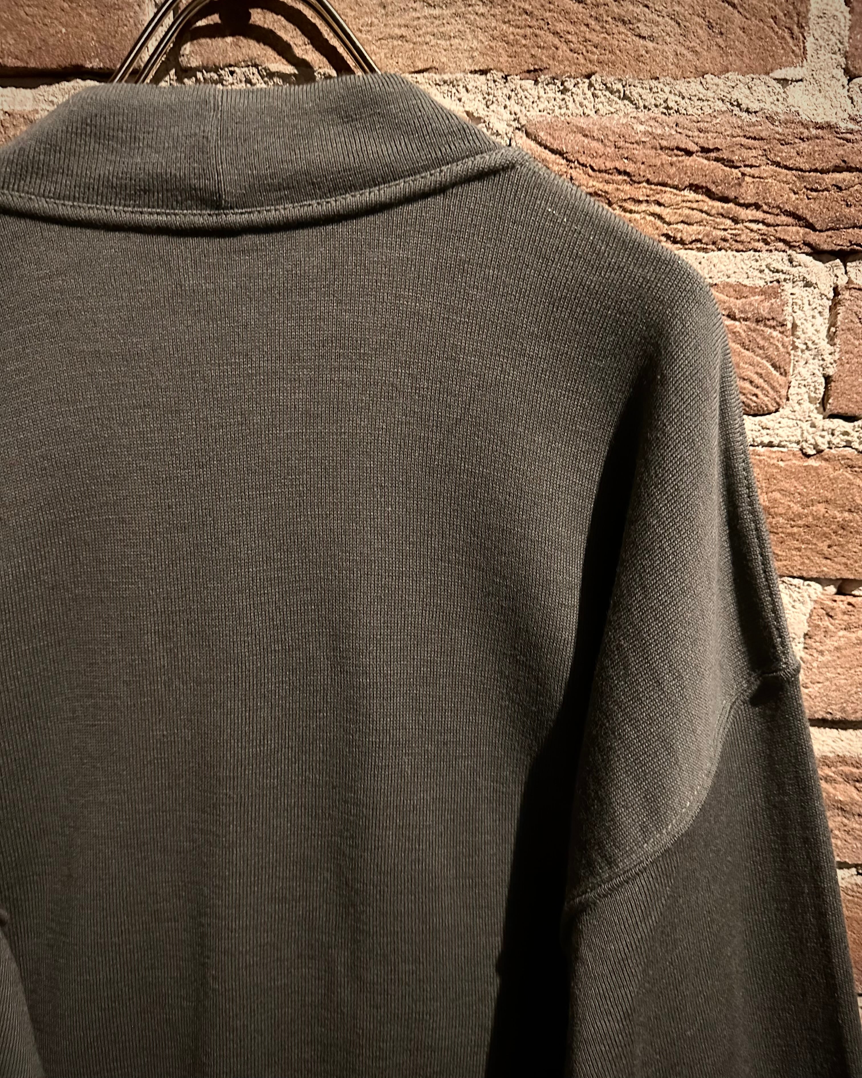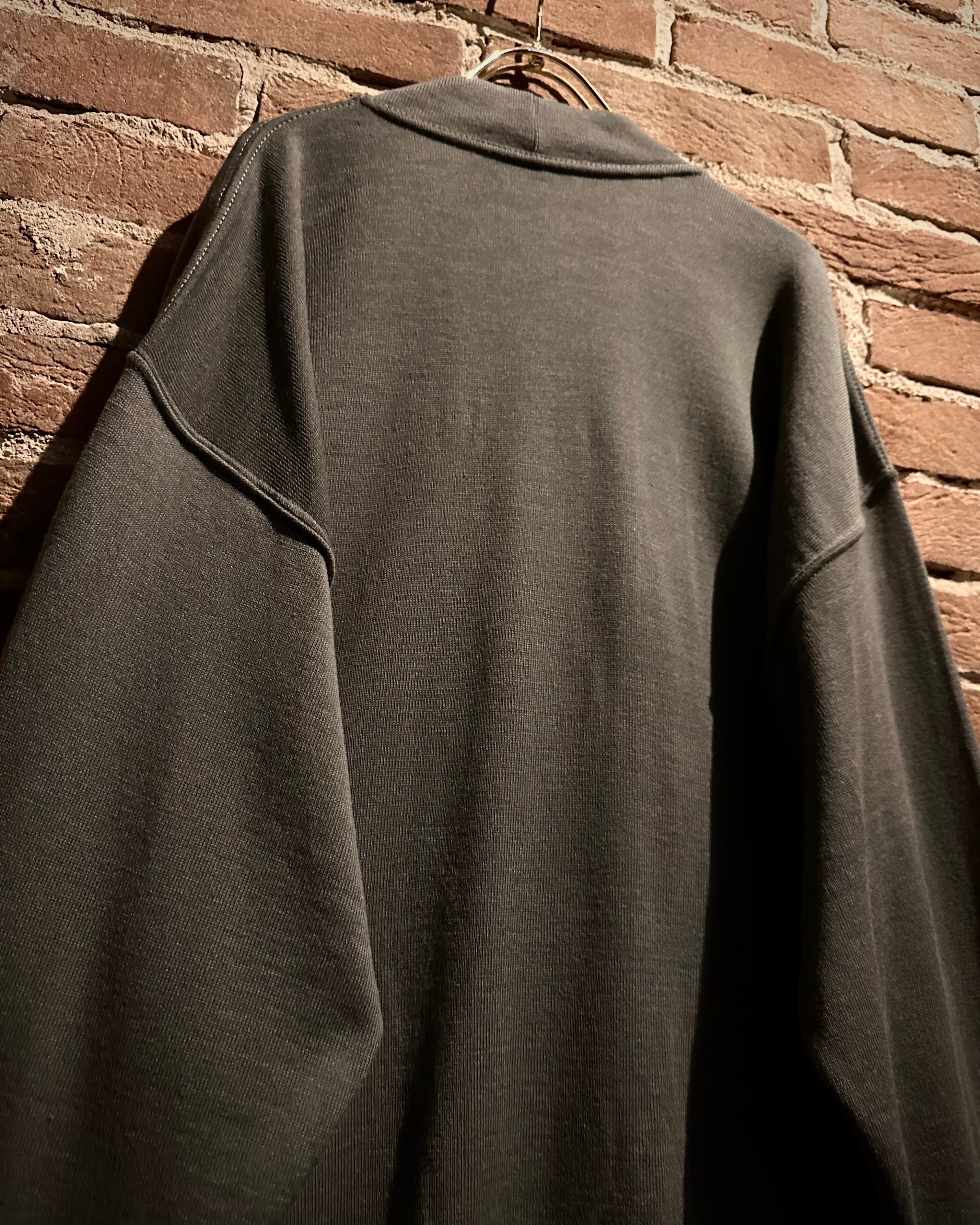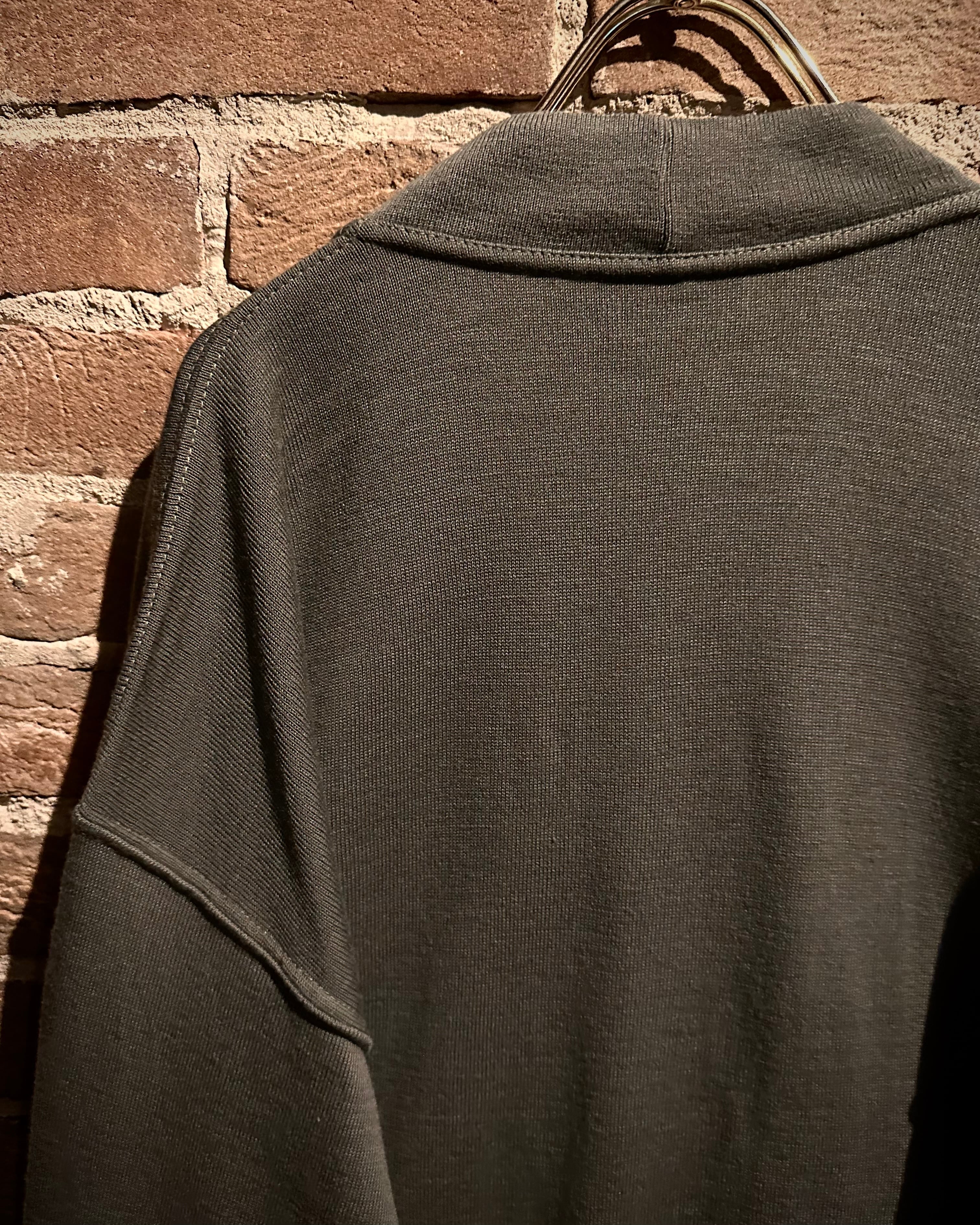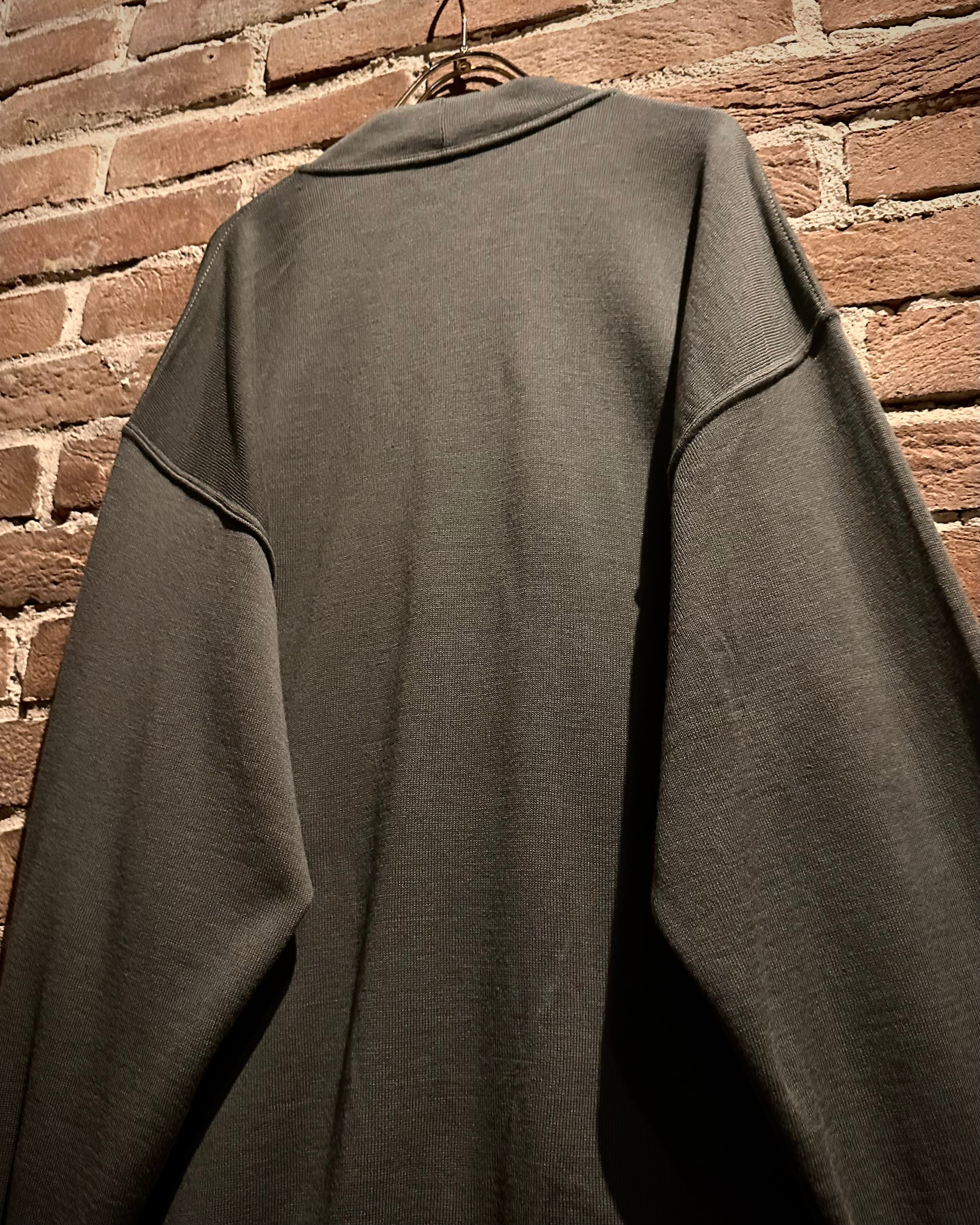 薄手ながらもしなやかで滑らかなタッチが特徴で、ウール特有のチクつきを感じにくく着心地も軽やか。ルーズなサイズ感から生まれる、肩の落ちるリラックス感のあるシルエットも美しい。