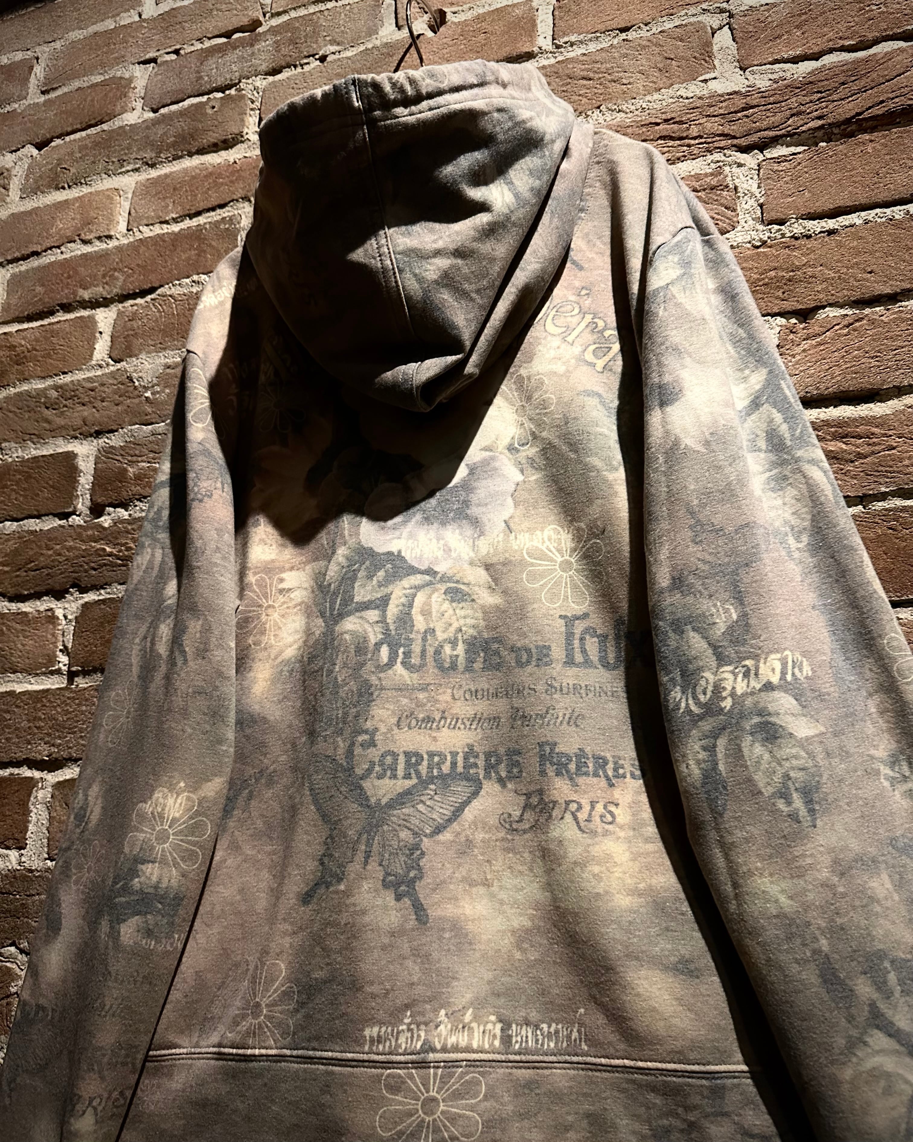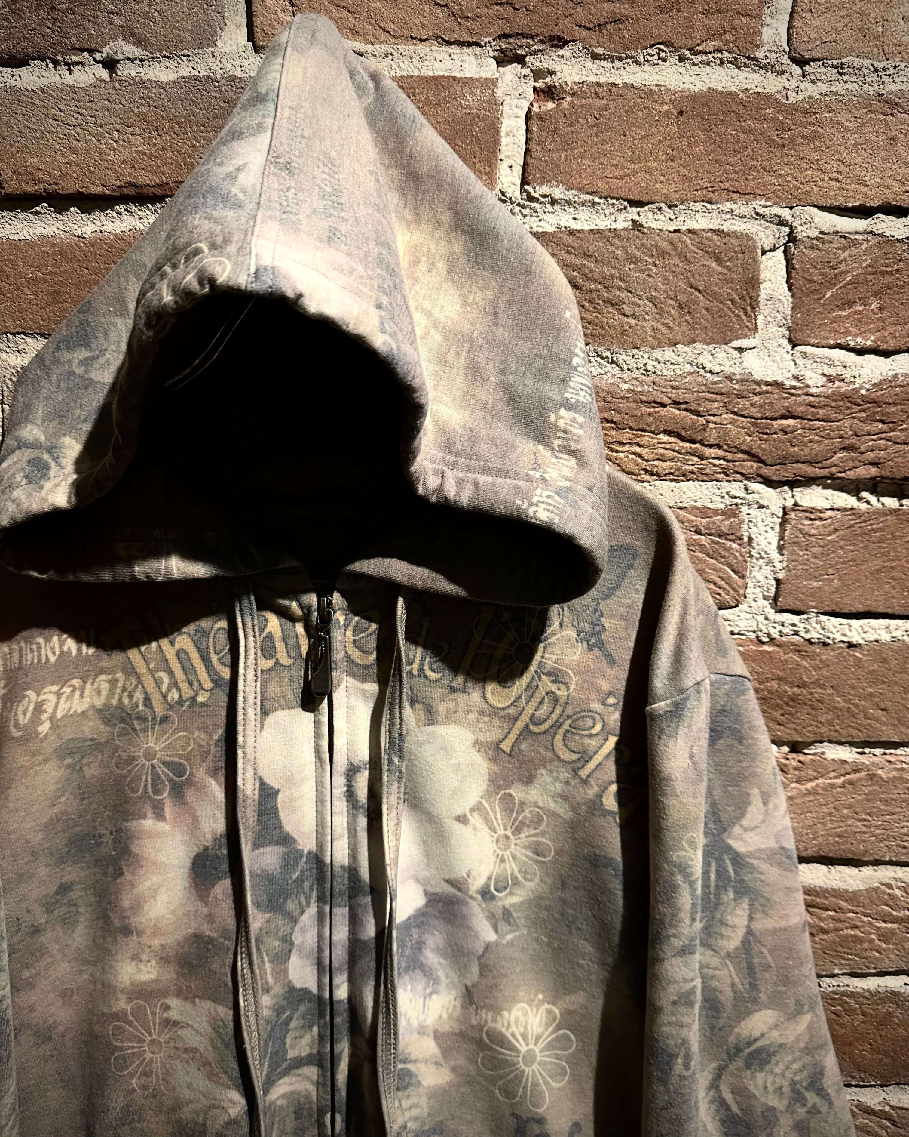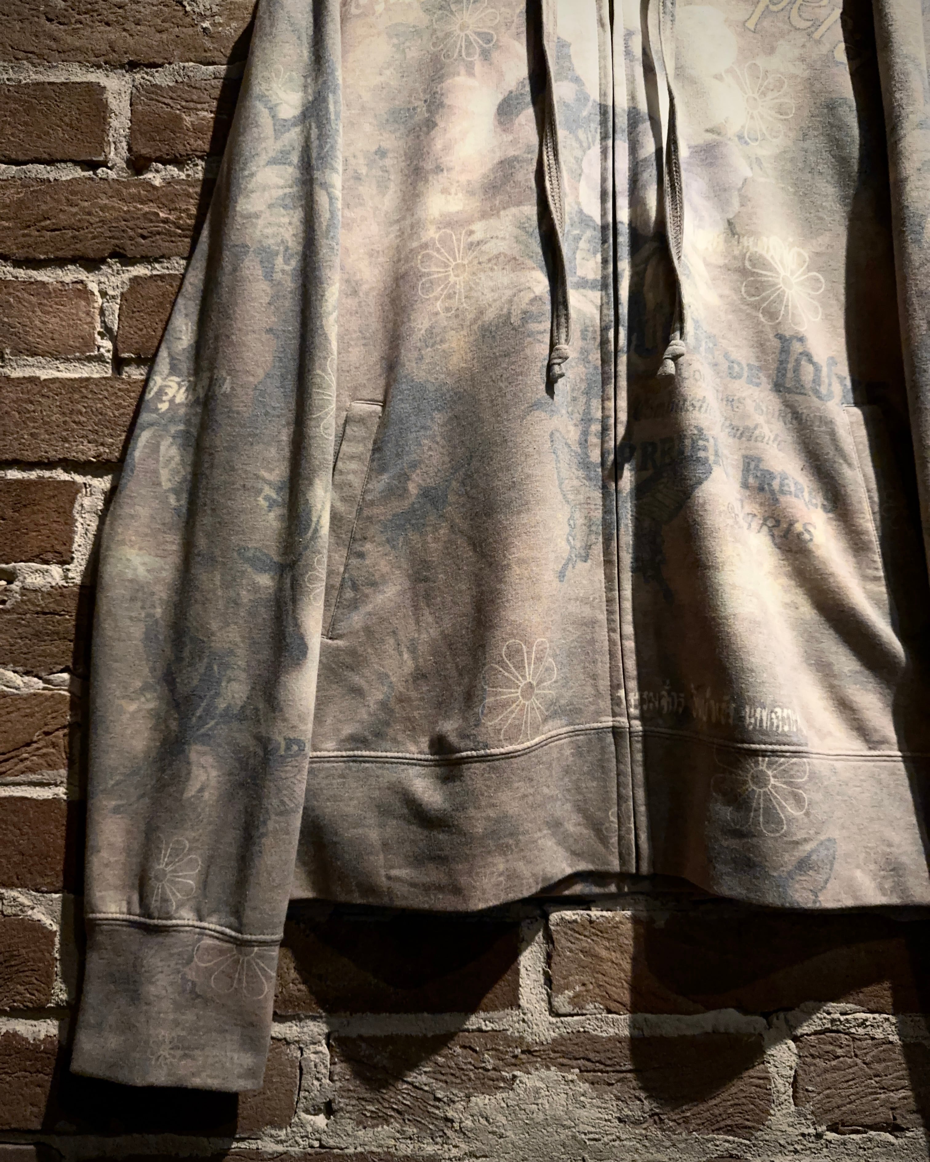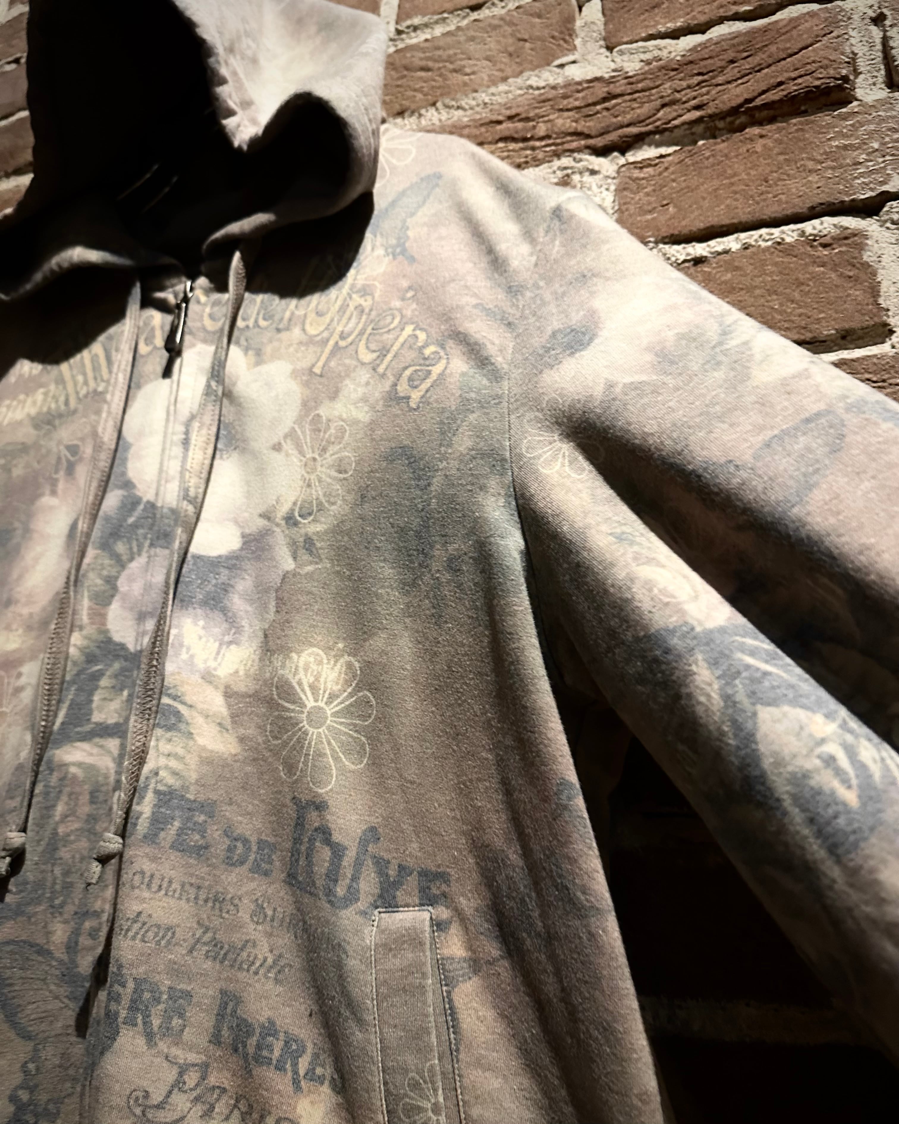 柄のタッチに加え、淡くフェードしたような色味も相まって、どこか退廃的でノスタルジックな空気感を纏った仕上がり。フロントジップ仕様にフード、カンガルーポケットといったベーシックなディテールの中に、この総柄が映えるバランス感も秀逸です。