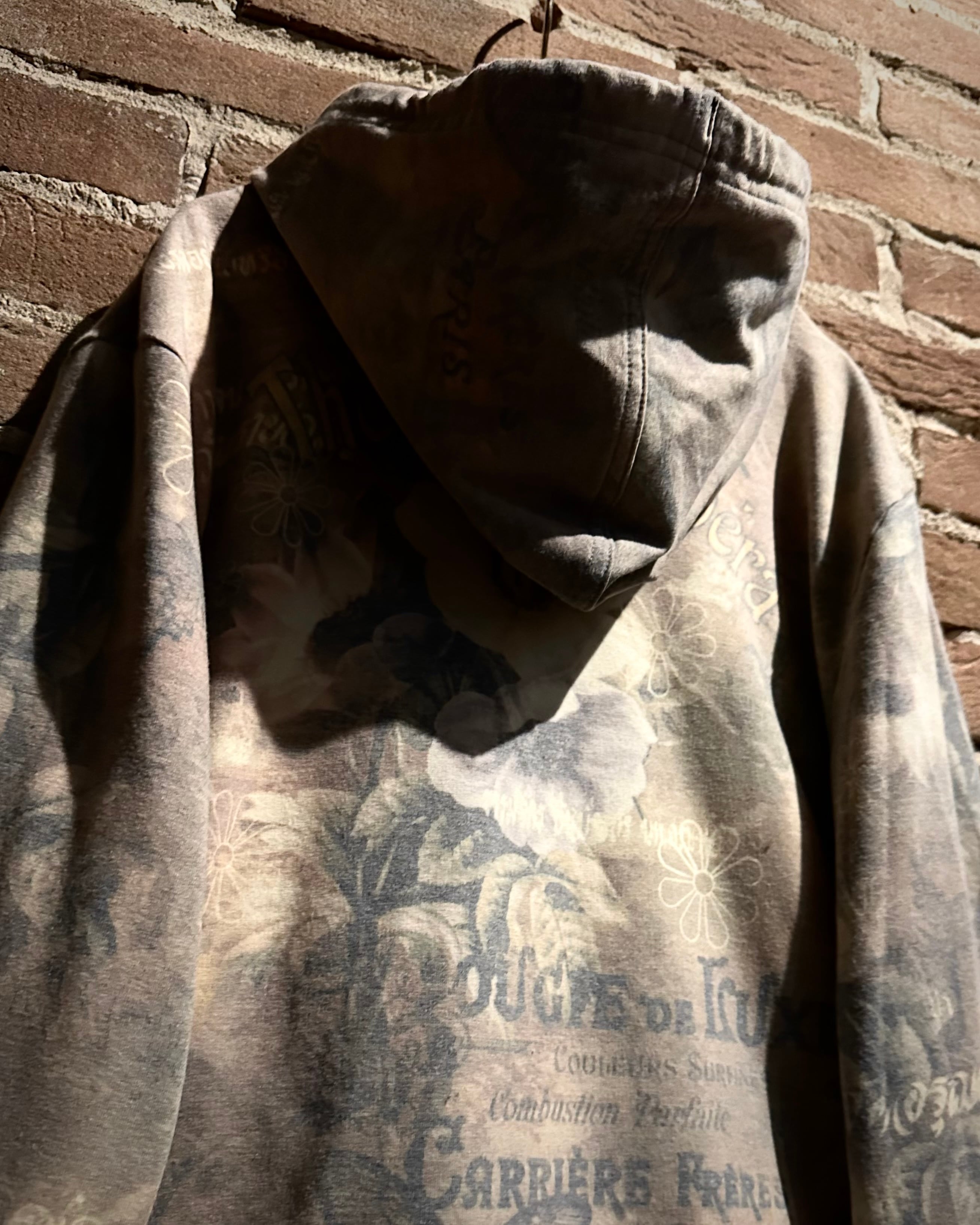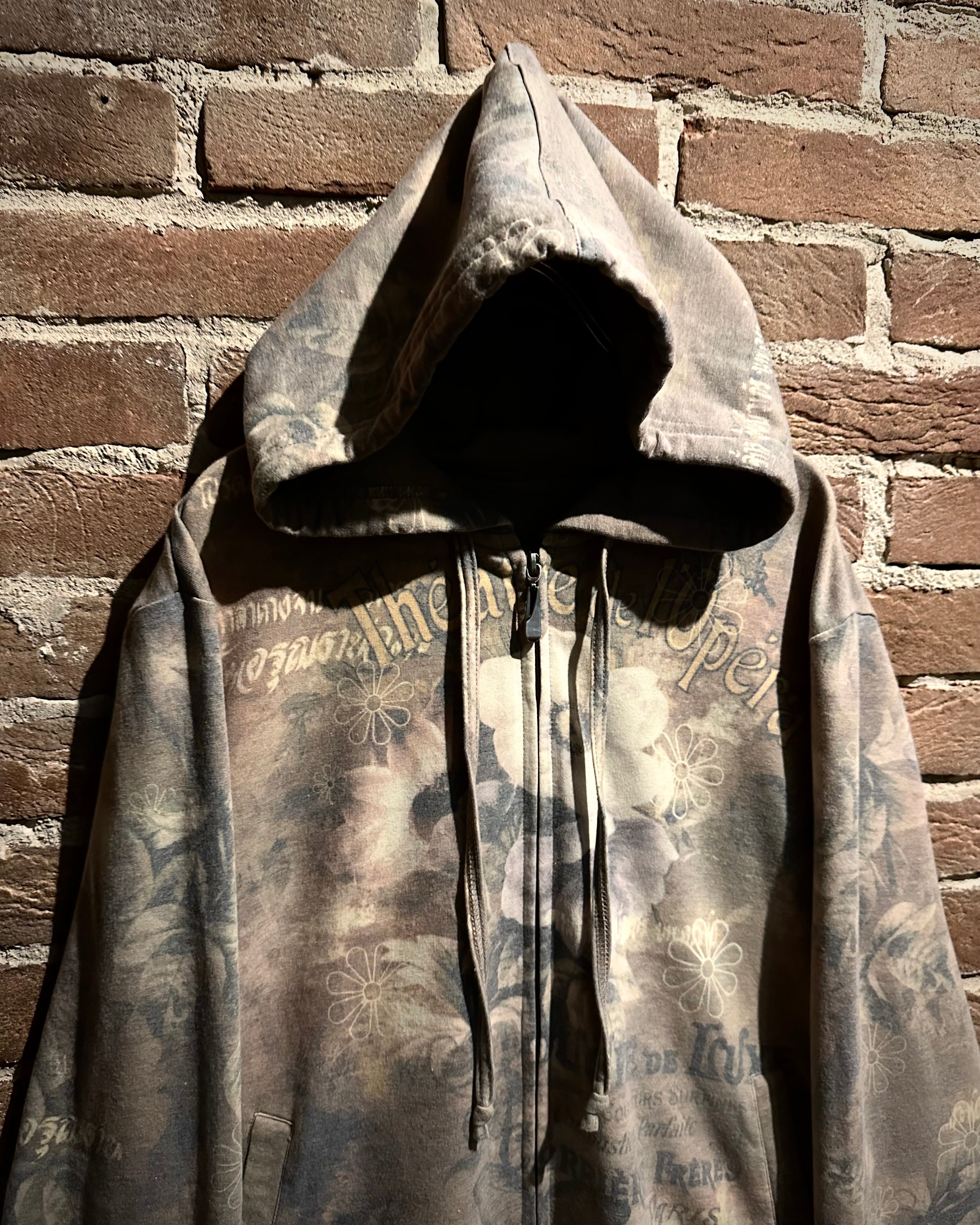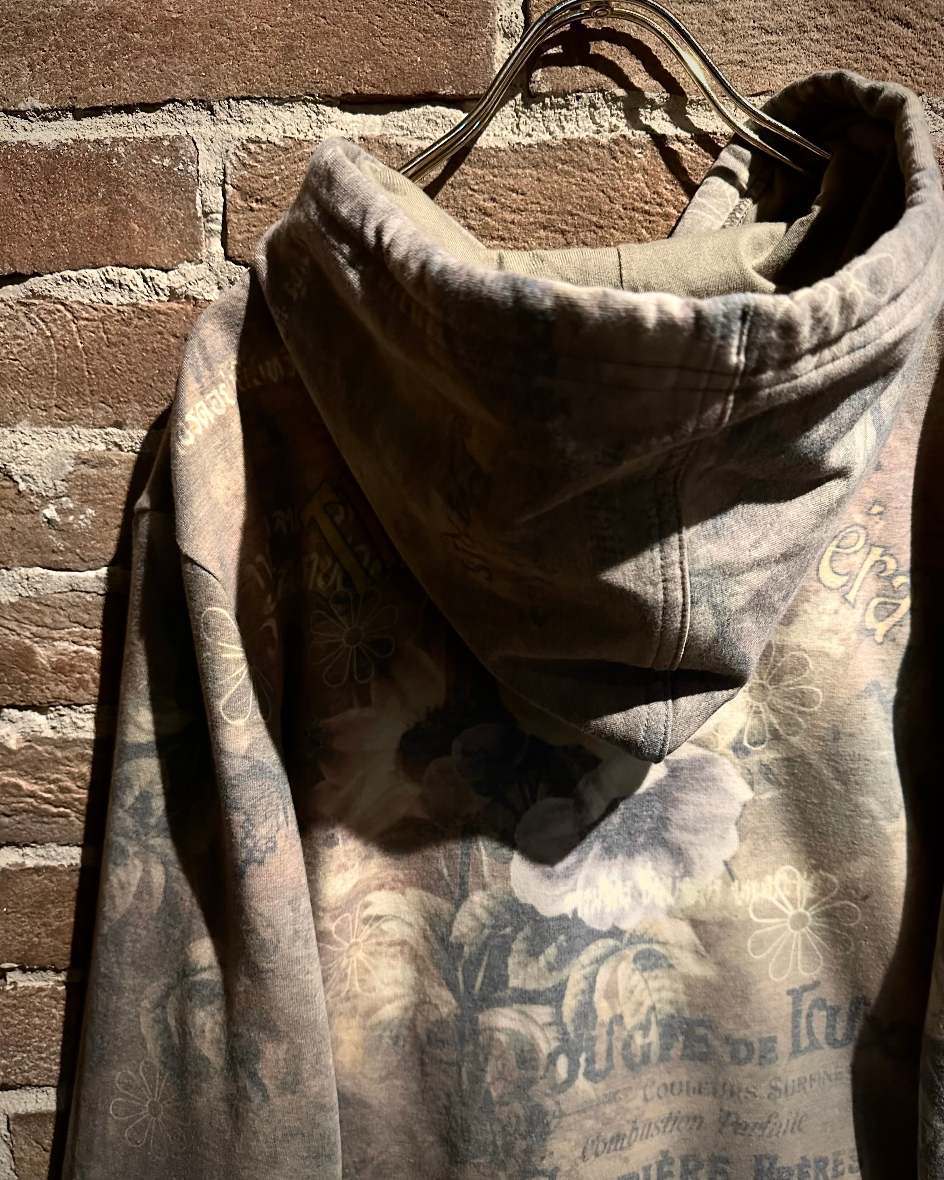 柄のタッチに加え、淡くフェードしたような色味も相まって、どこか退廃的でノスタルジックな空気感を纏った仕上がり。フロントジップ仕様にフード、カンガルーポケットといったベーシックなディテールの中に、この総柄が映えるバランス感も秀逸です。