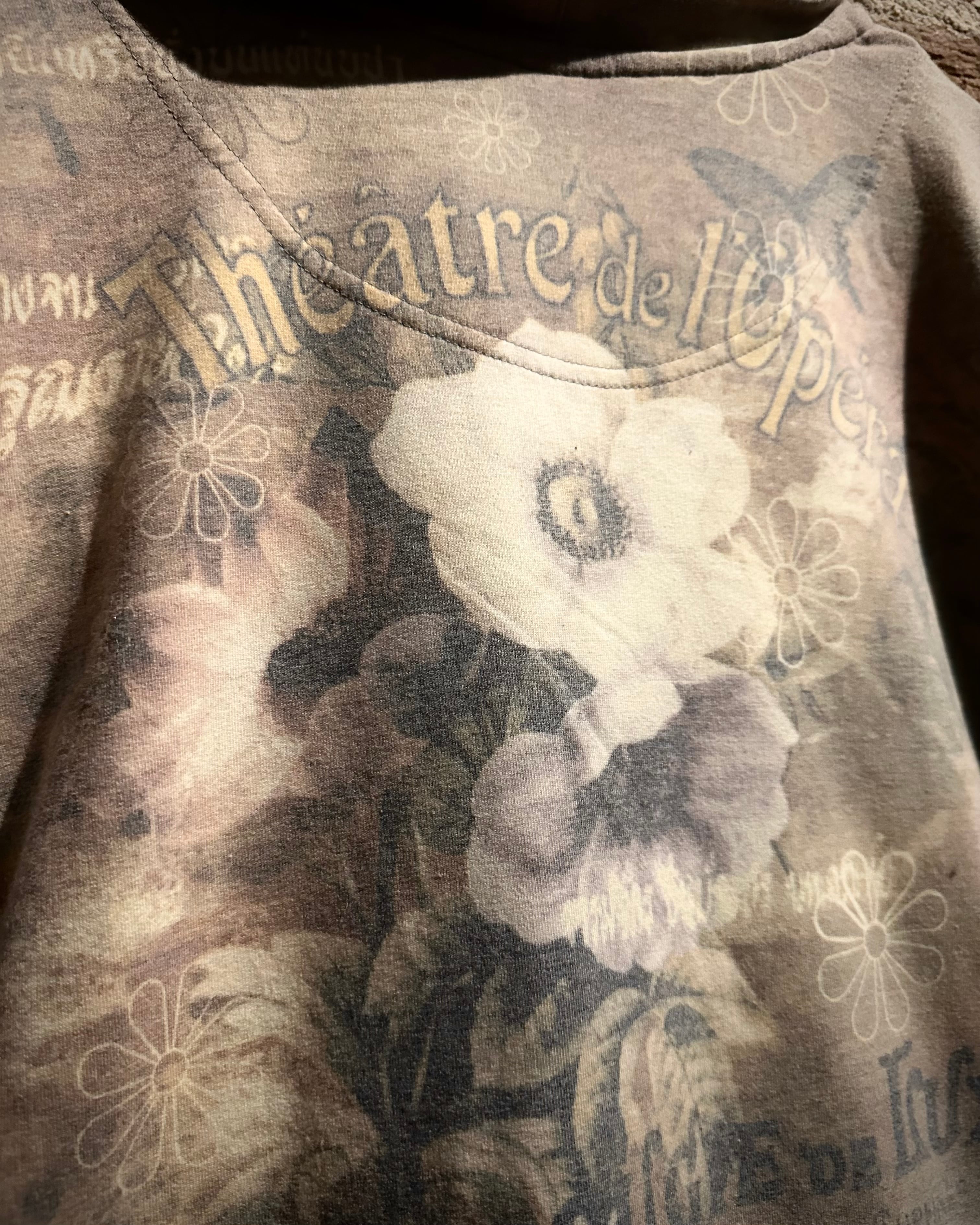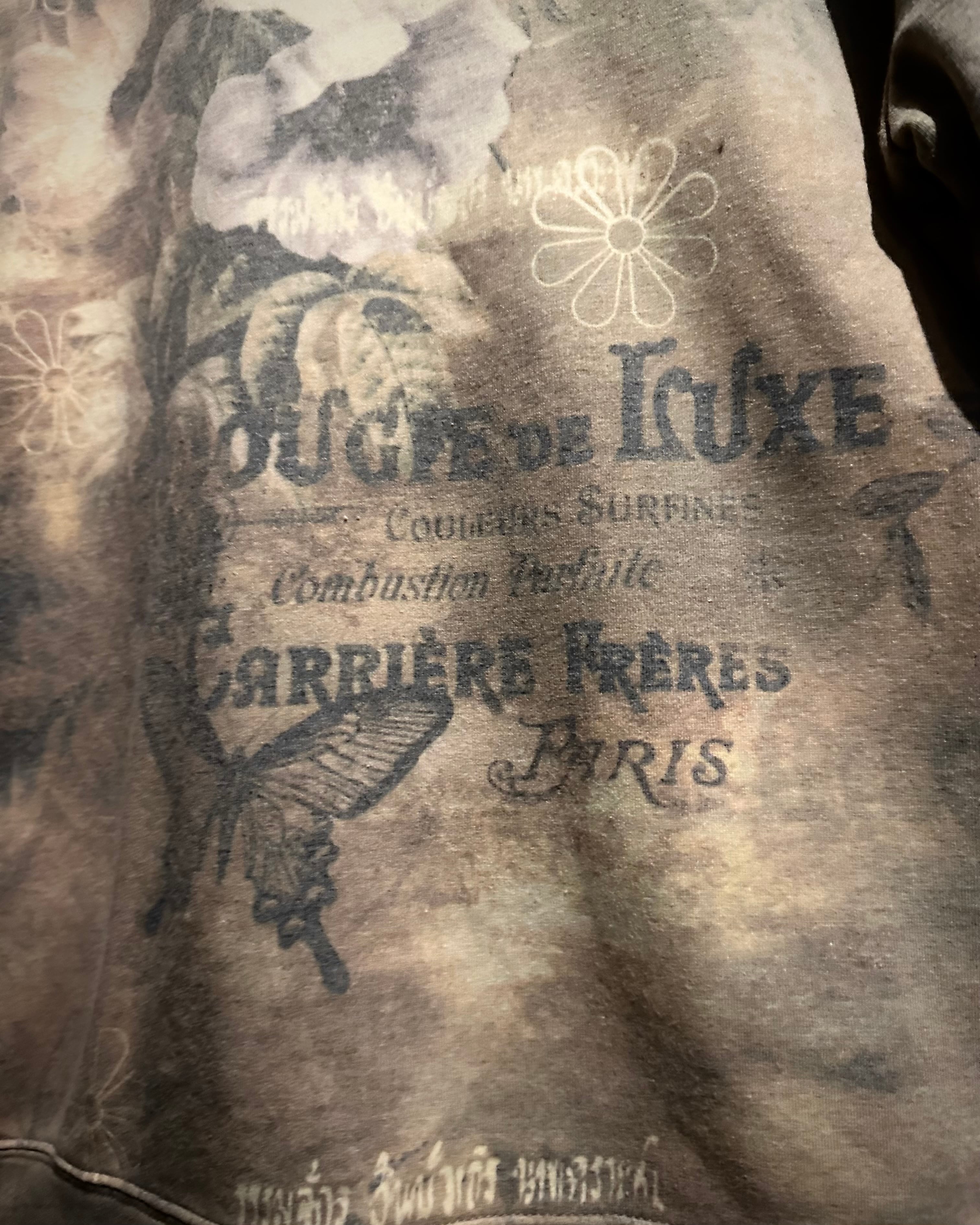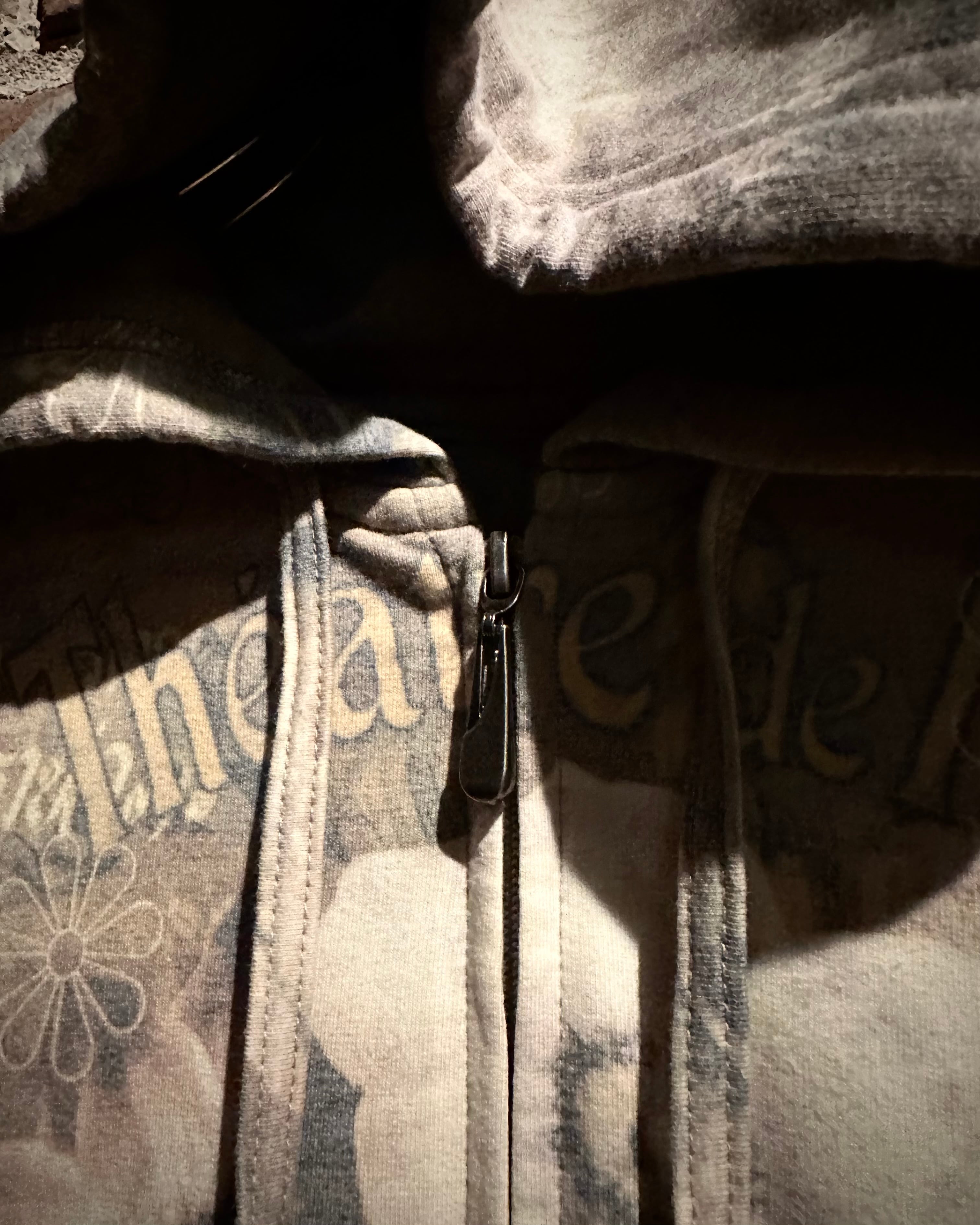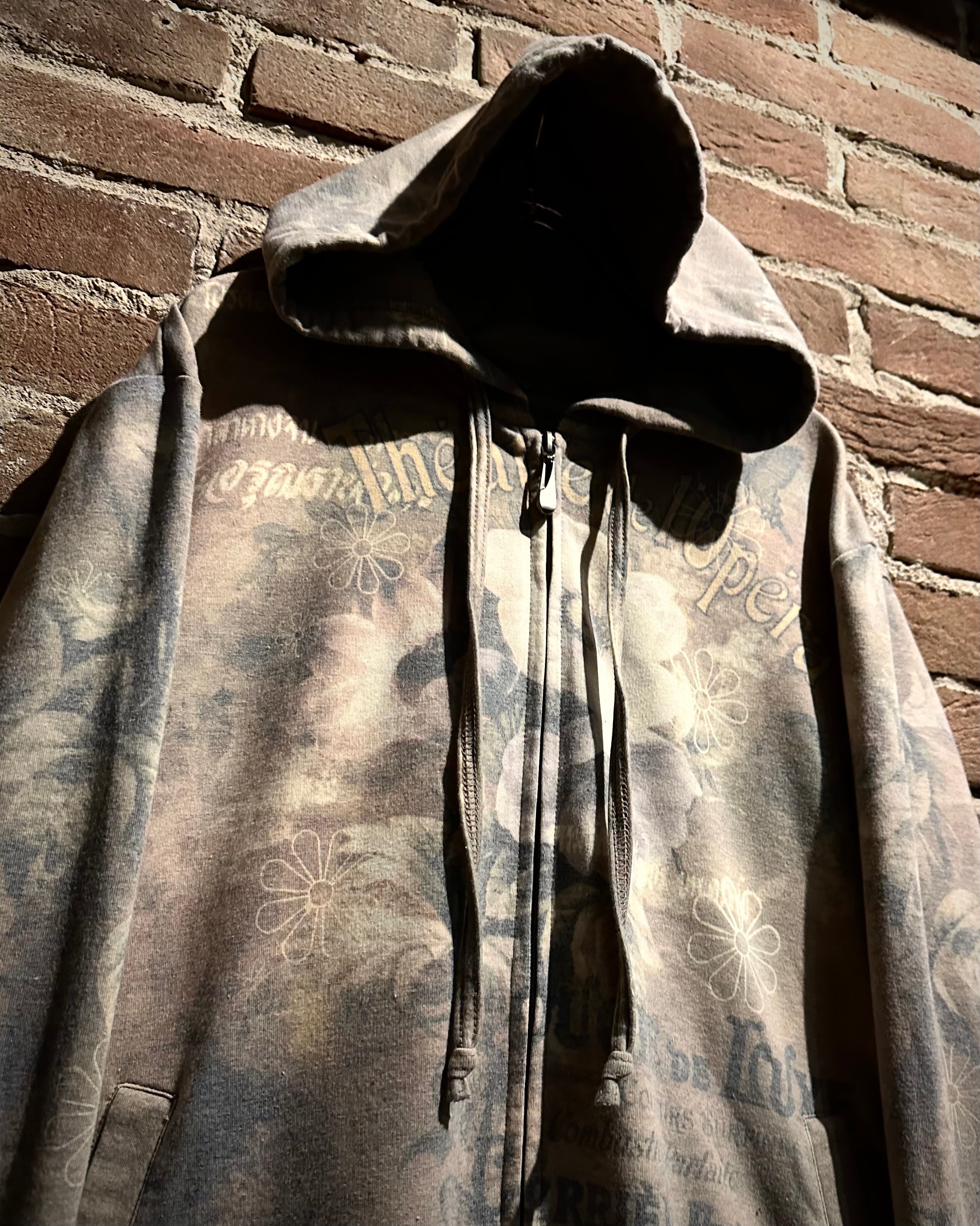 柄のタッチに加え、淡くフェードしたような色味も相まって、どこか退廃的でノスタルジックな空気感を纏った仕上がり。フロントジップ仕様にフード、カンガルーポケットといったベーシックなディテールの中に、この総柄が映えるバランス感も秀逸です。