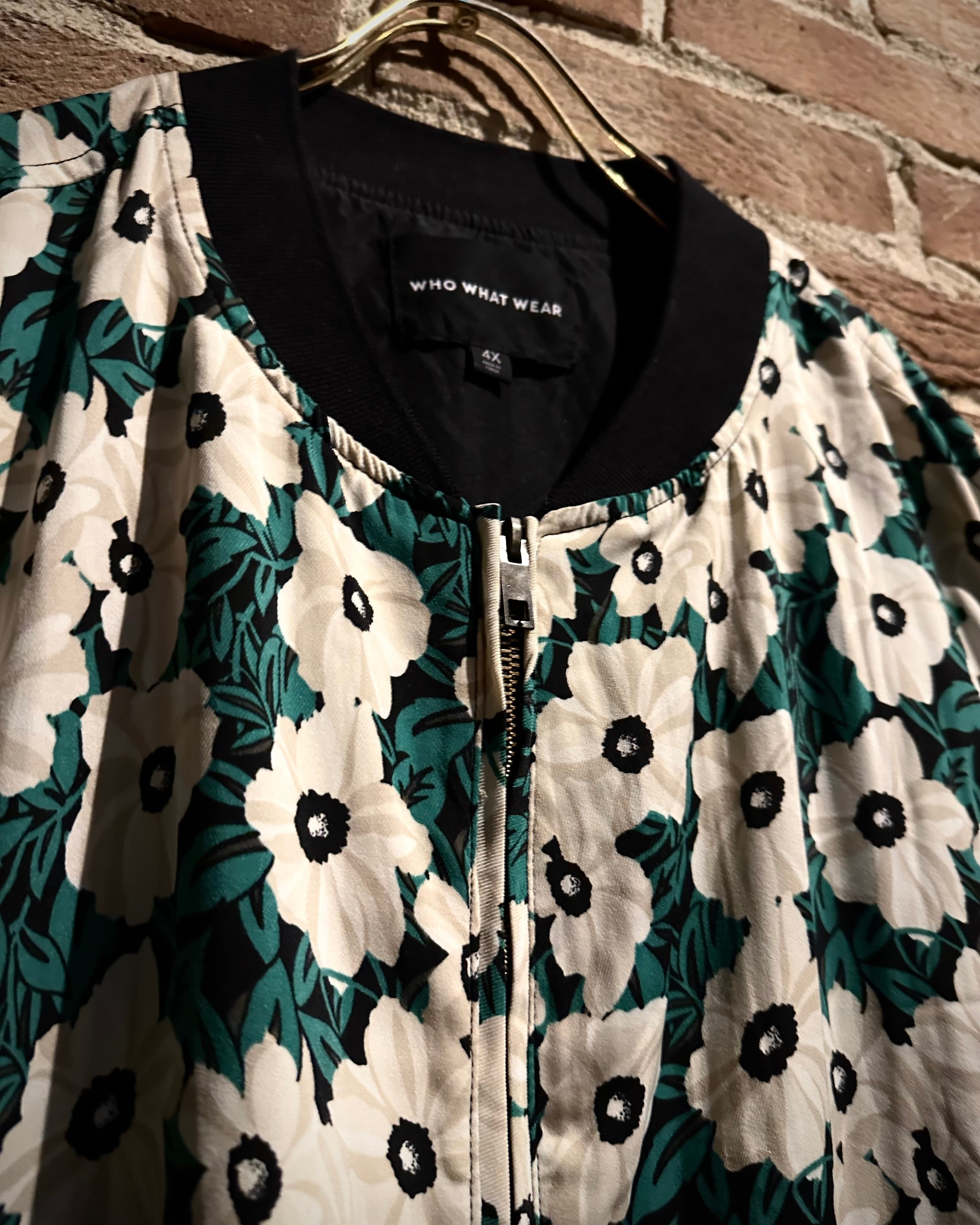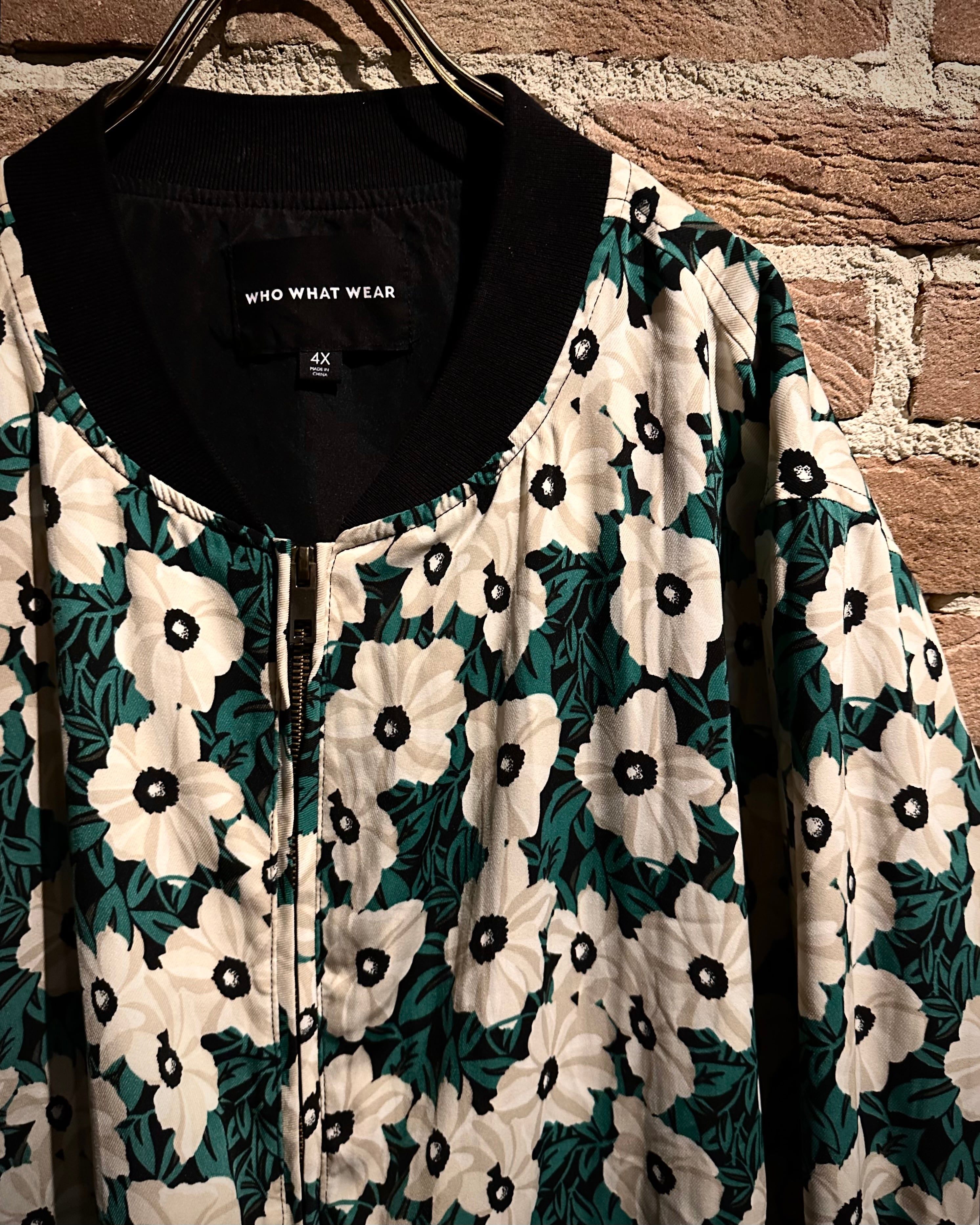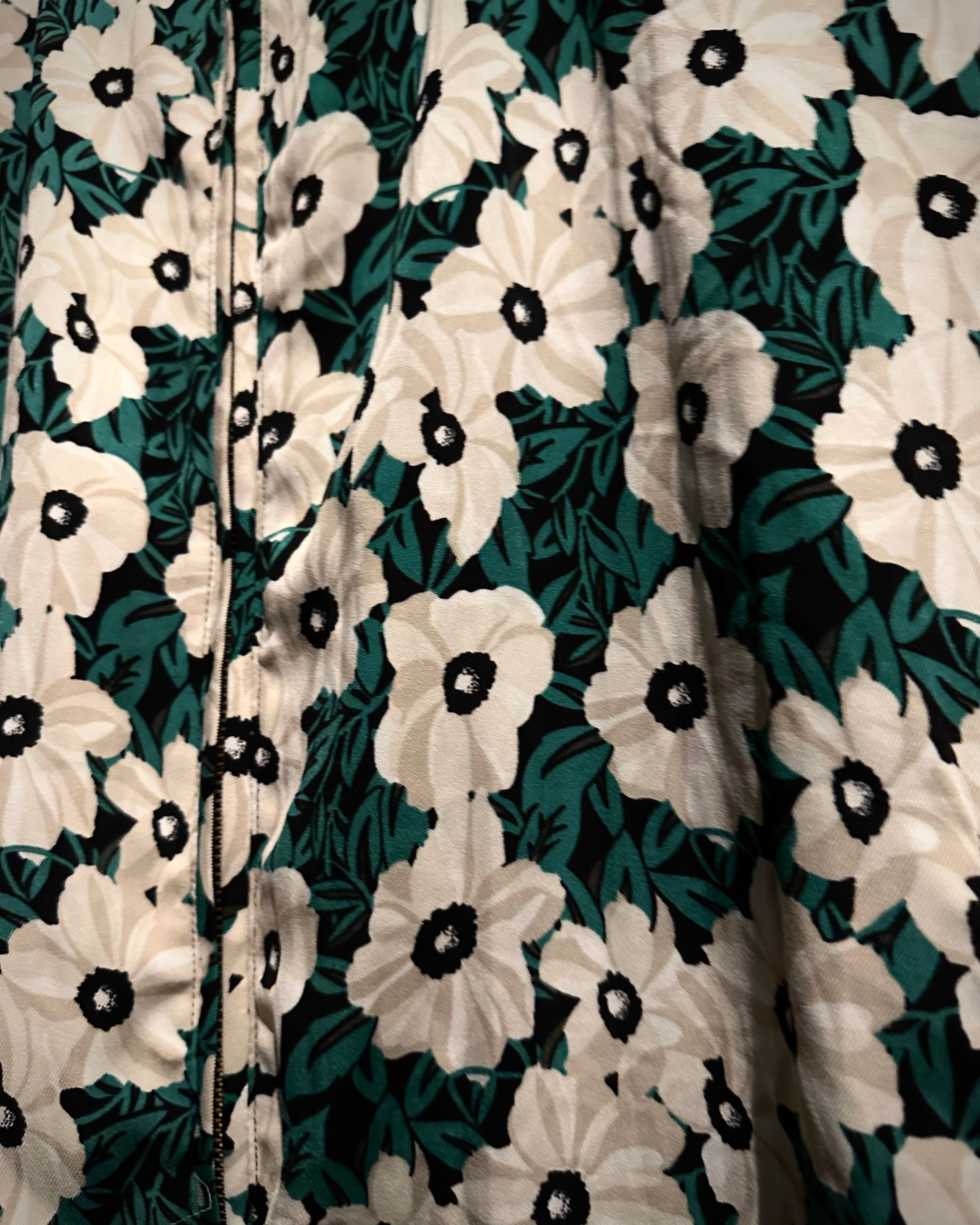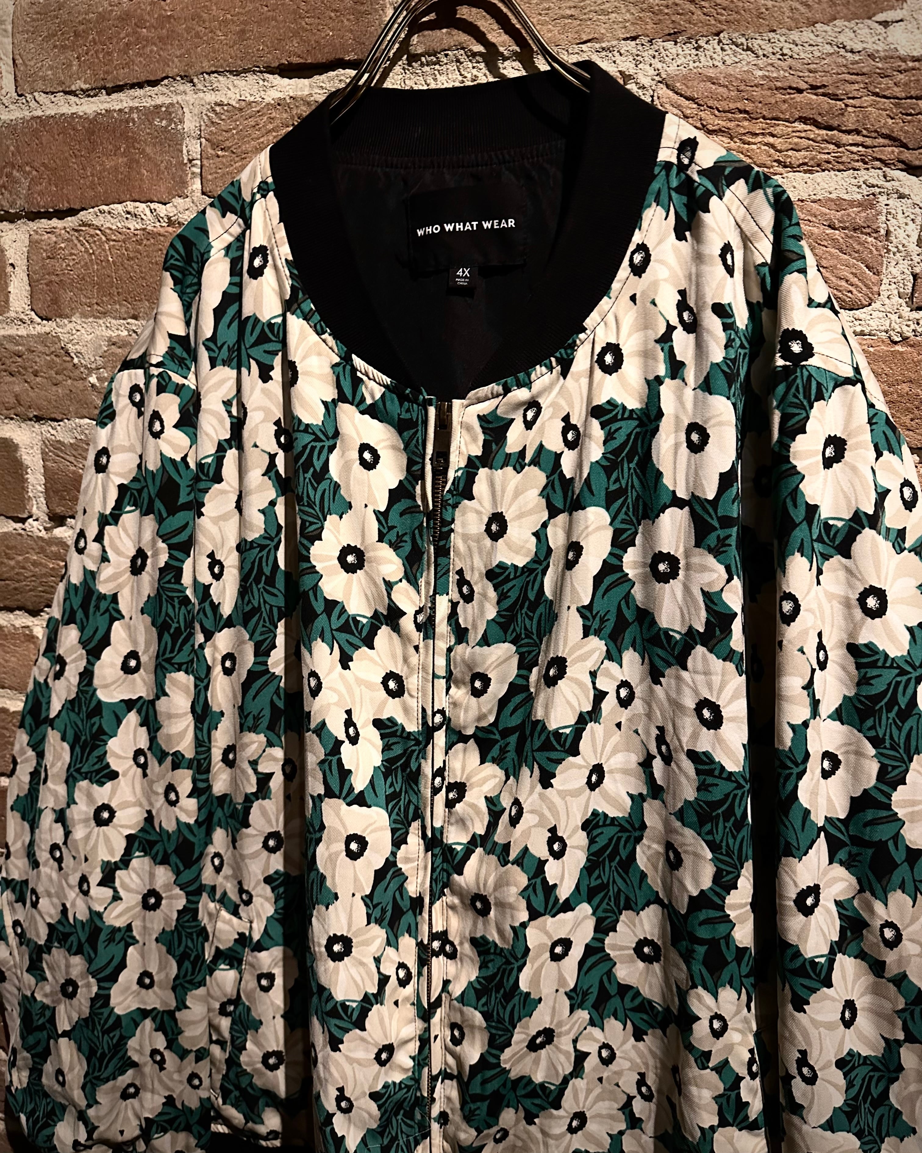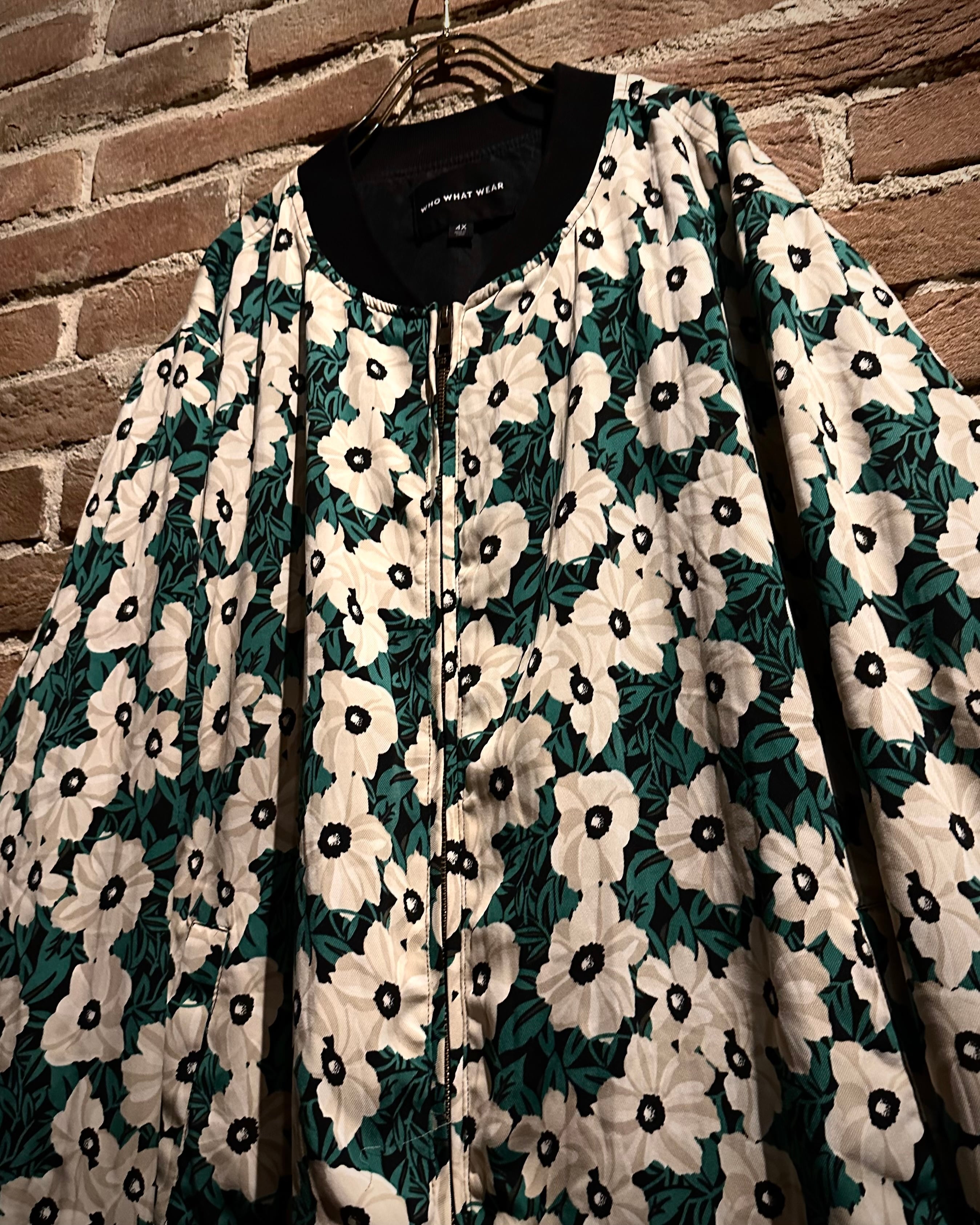 ホワイト×アイボリー×グリーンをベースとした落ち着きのある配色で、ボディ全面にレトロなフラワーパターンが落とし込まれたジップアップブルゾン。
