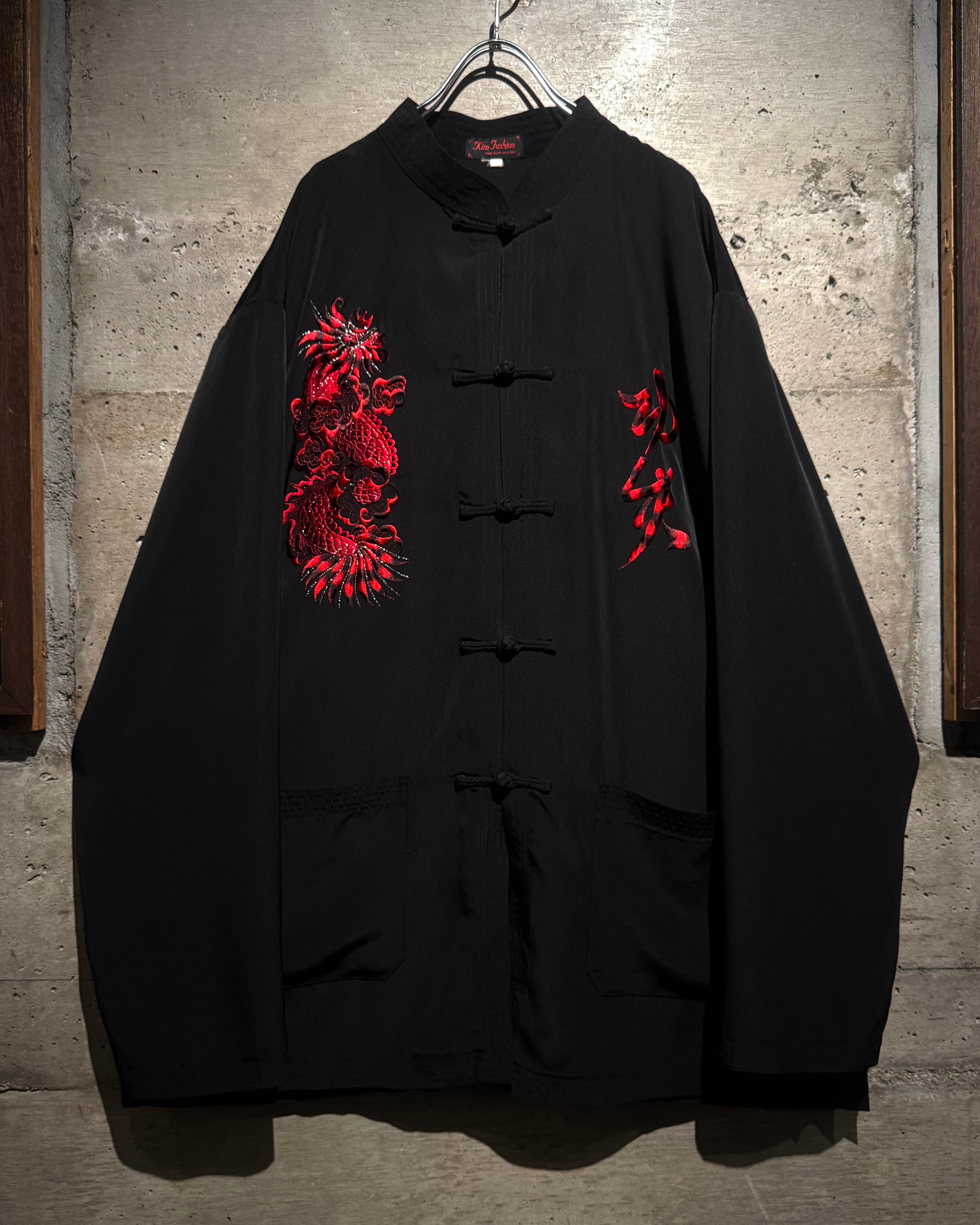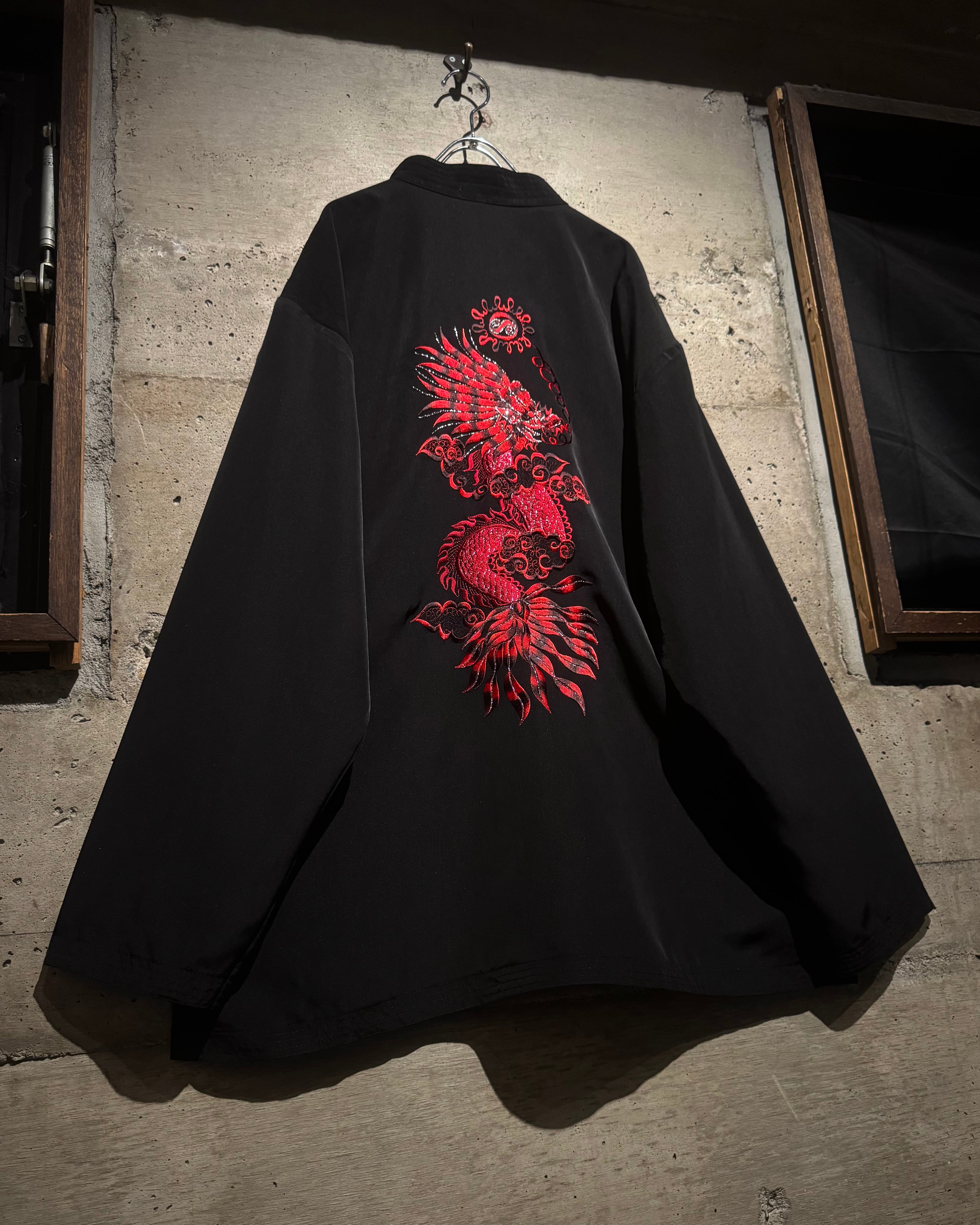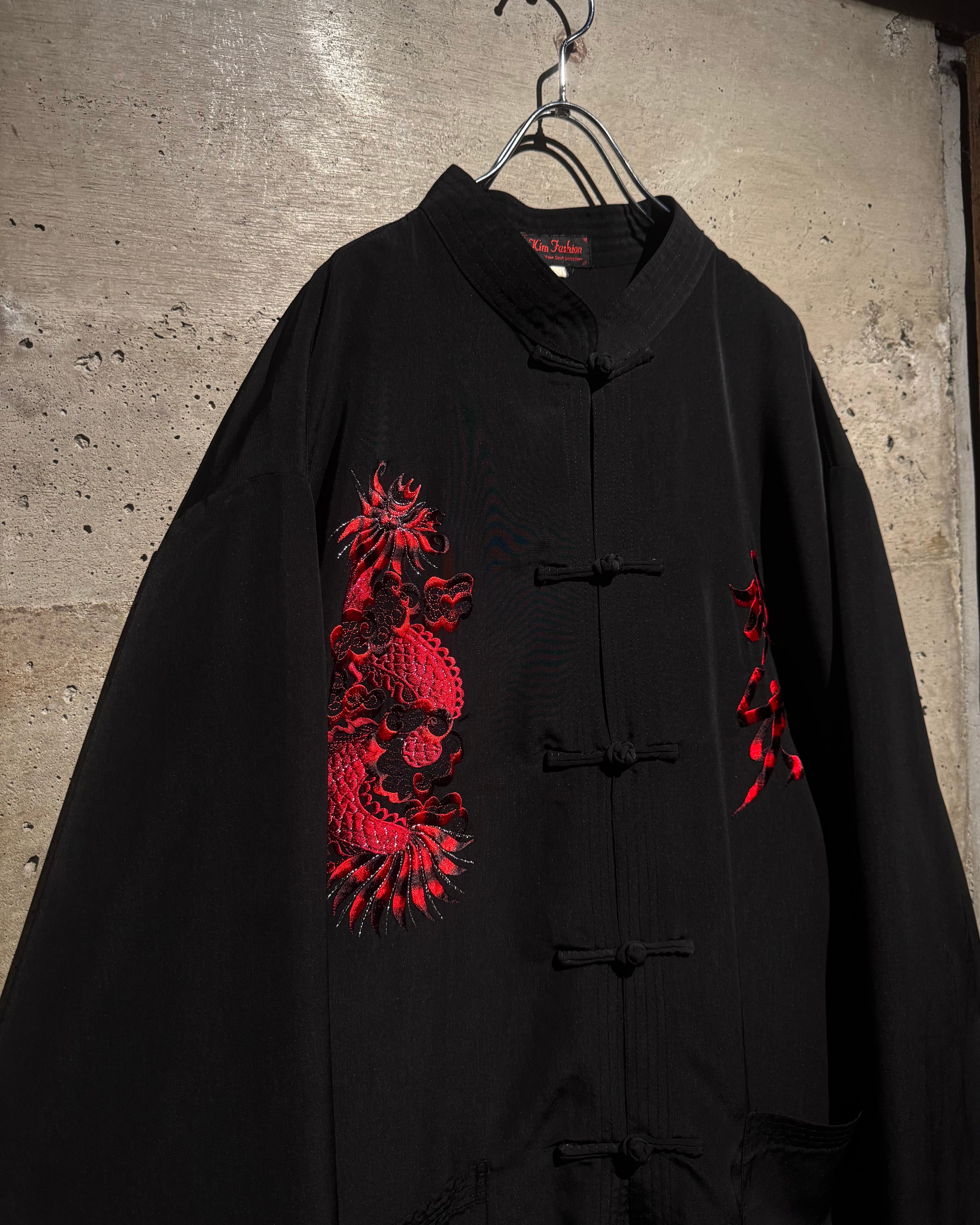 ツルッとした滑らかな質感のブラックボディに、レッド×ブラックで構成された龍の刺繍を大胆に刻み込んだチャイナシャツ。