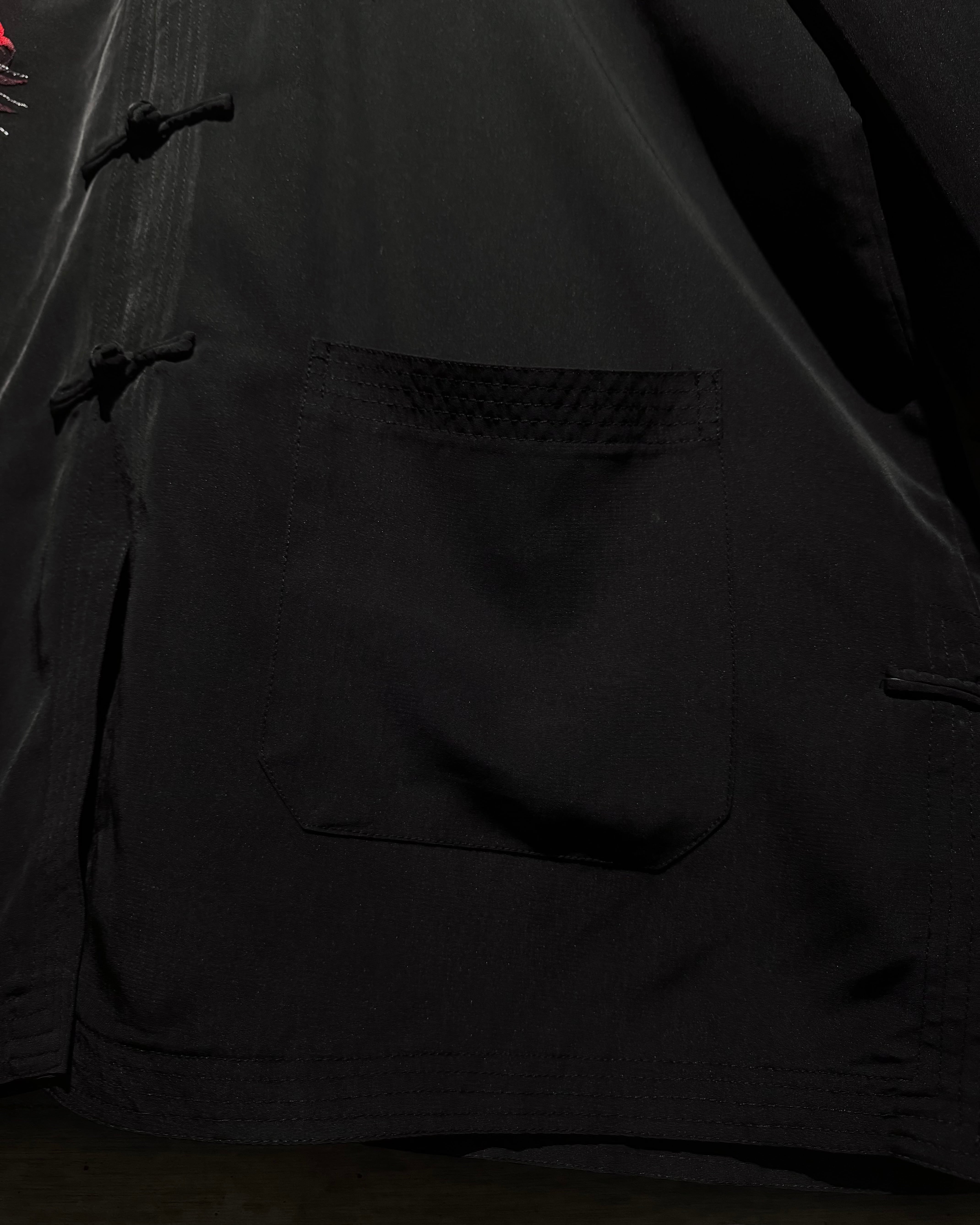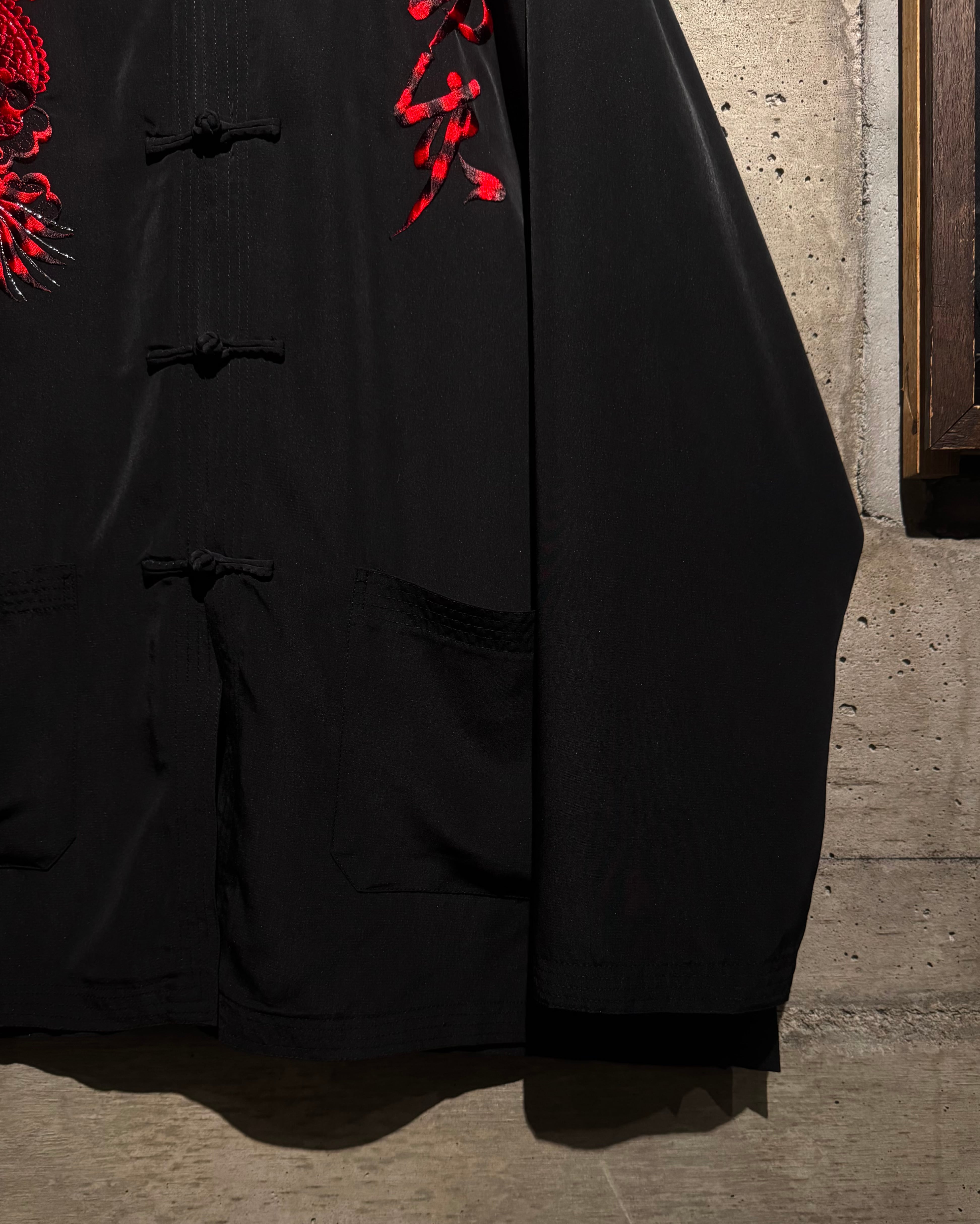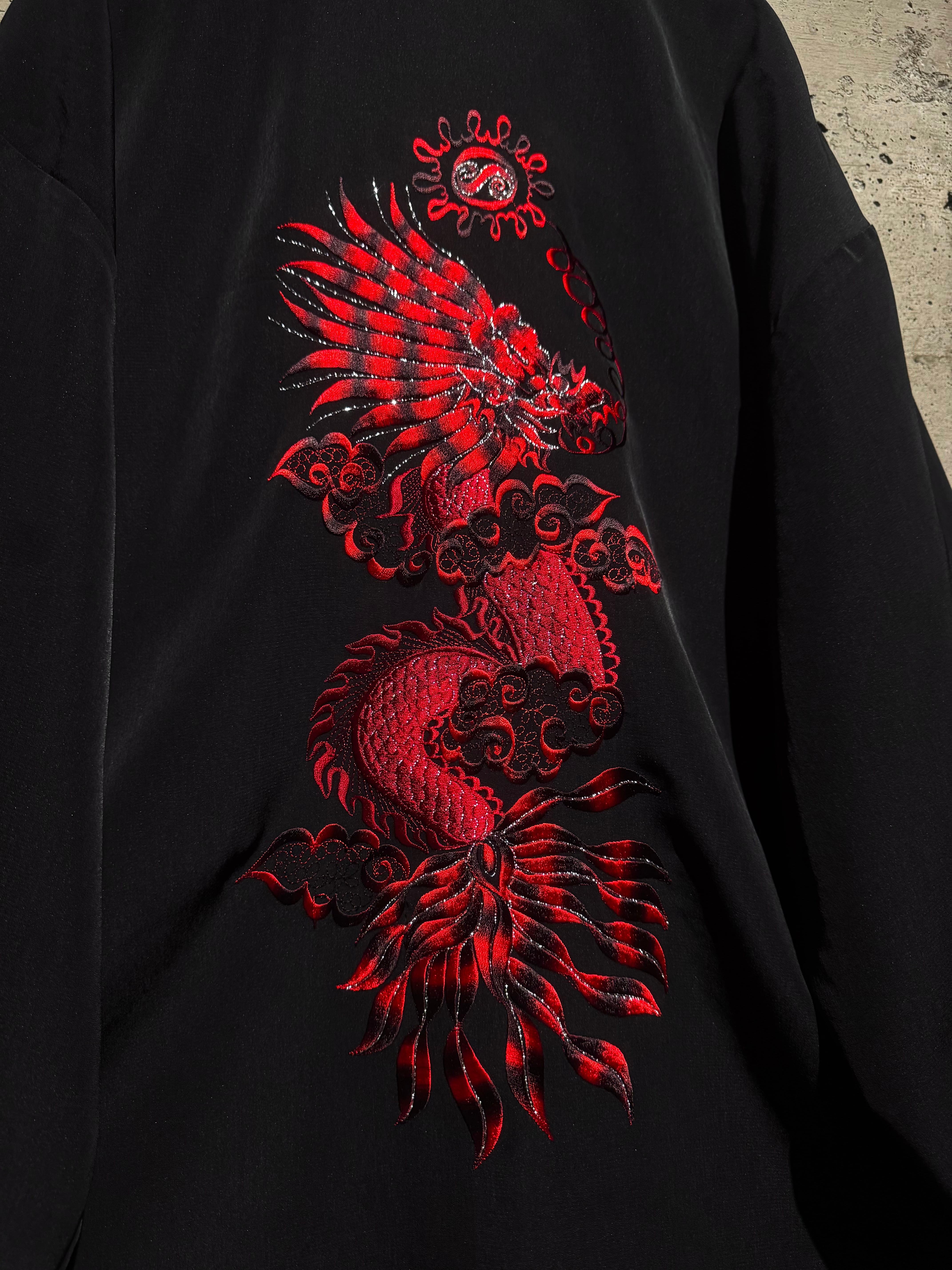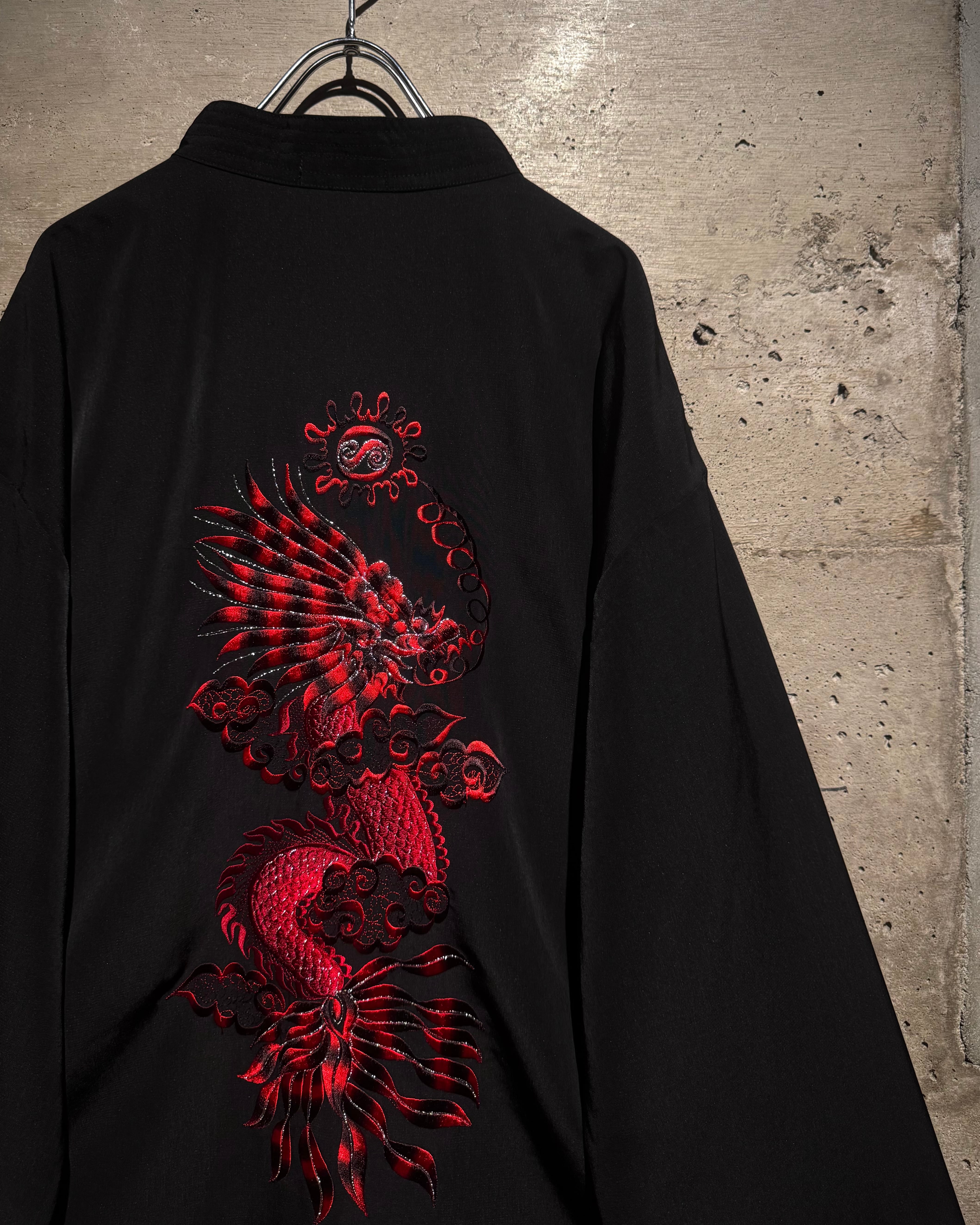 ツルッとした滑らかな質感のブラックボディに、レッド×ブラックで構成された龍の刺繍を大胆に刻み込んだチャイナシャツ。