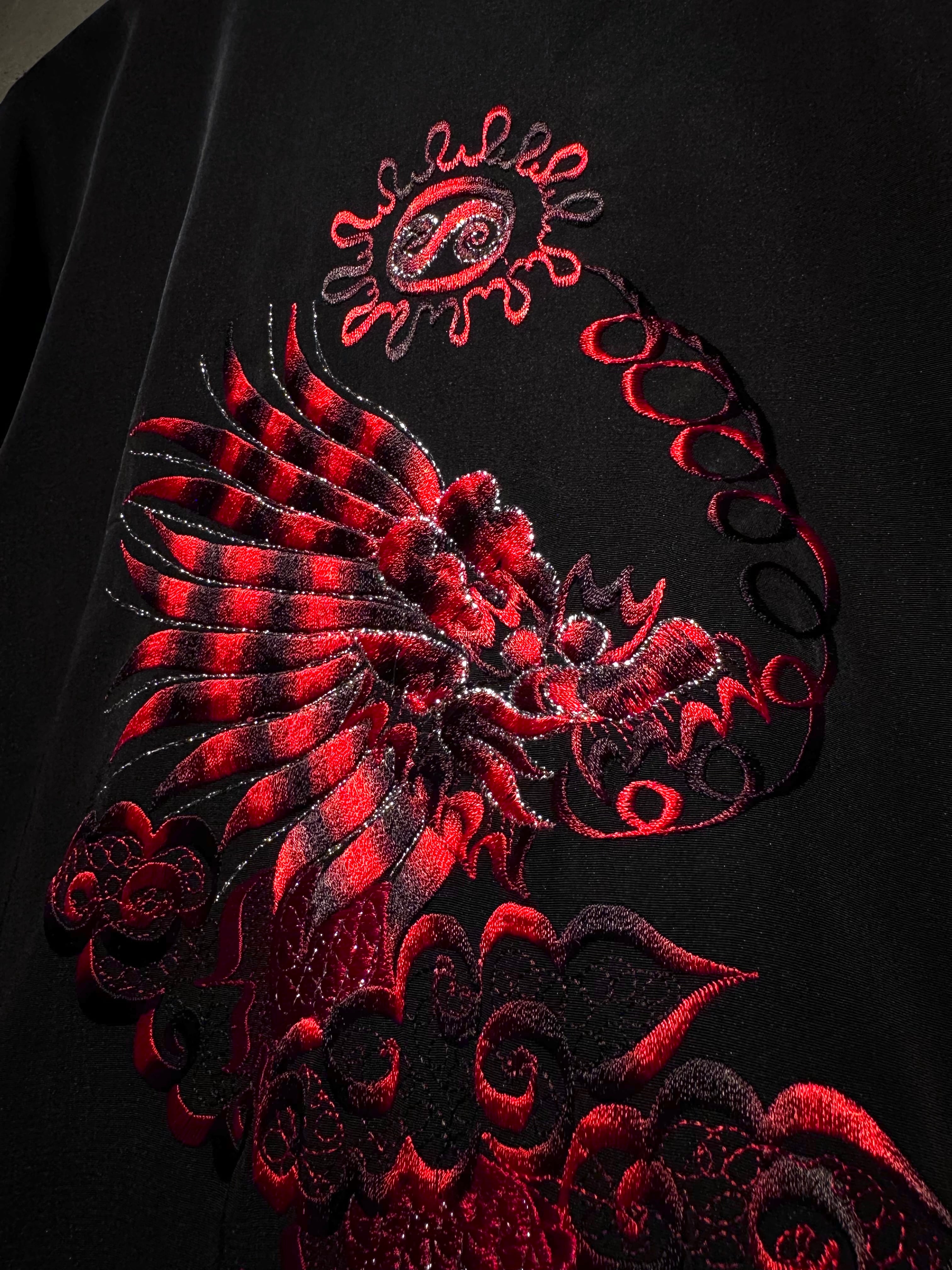 刺繍にはシルバーのラメ糸を織り込むことで、光の当たり方や角度によって鈍く輝き、奥行きと立体感を演出。ブラックベースに映えるコントラストが非常に美しく、圧倒的な存在感を放つ仕上がりとなっています。