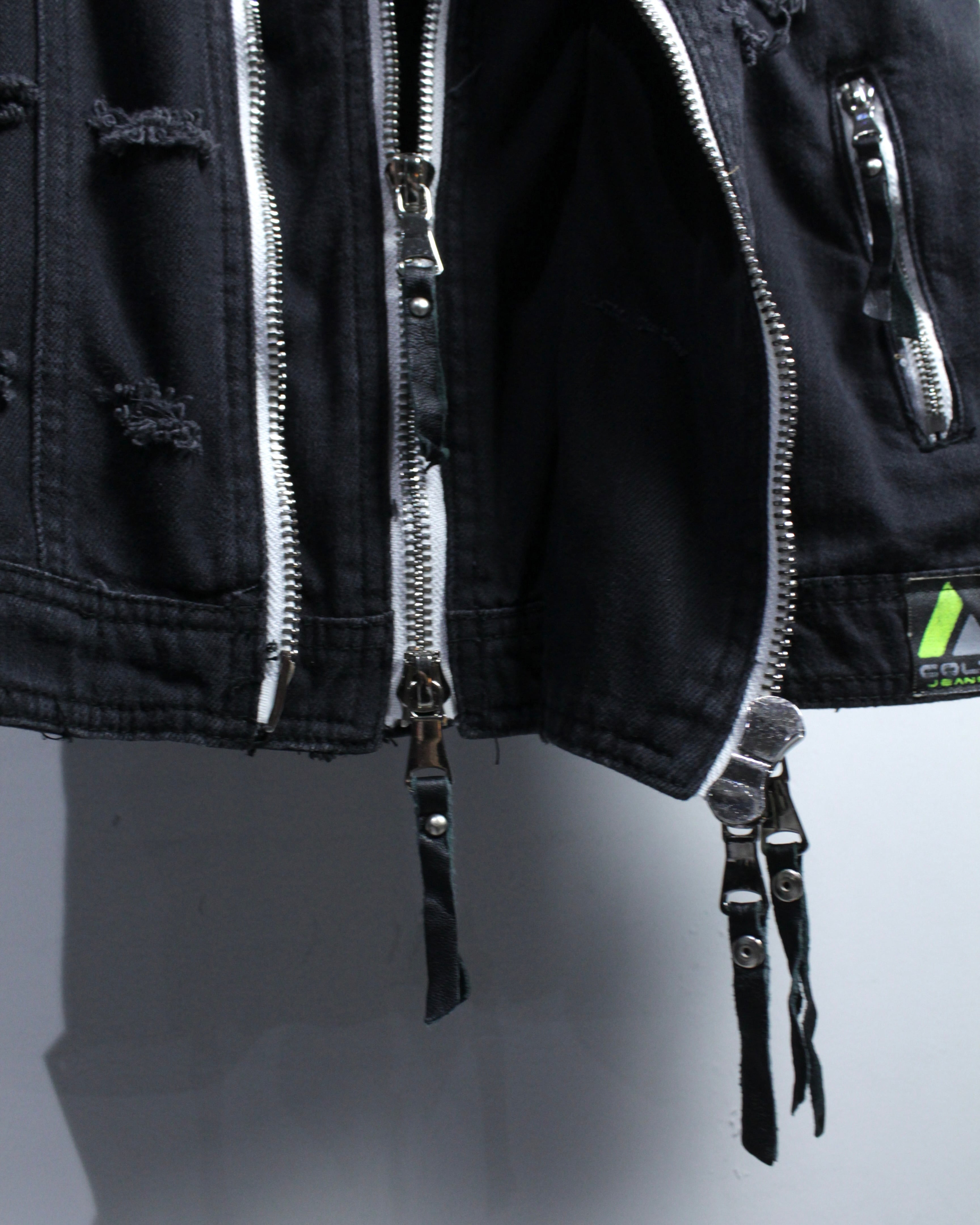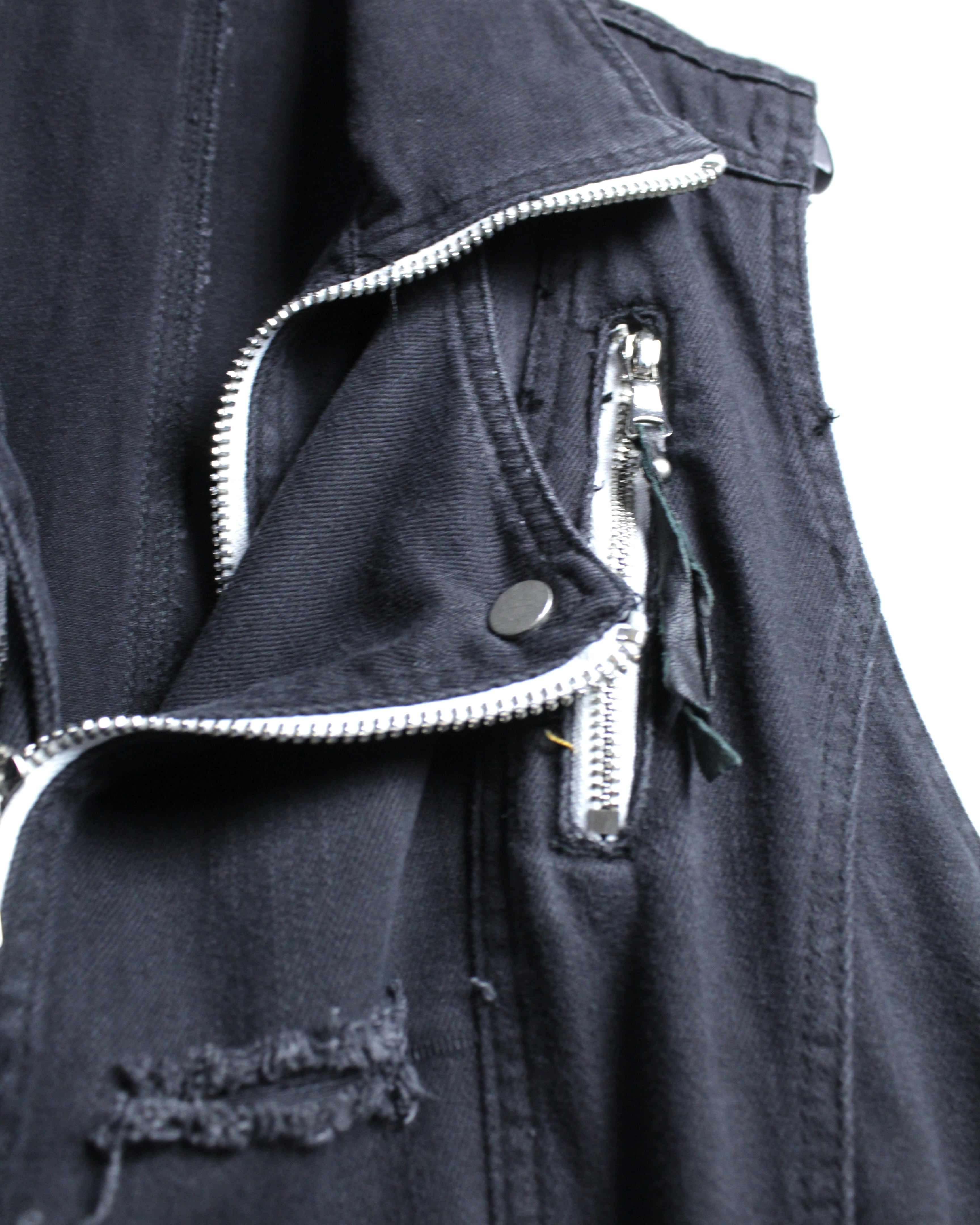 タフな質感のデニムボディをベースに、ライダース特有のフロントデザインやジップディテールを踏襲した1着。随所に施されたボロ加工が、無骨さとモードな雰囲気を同時に演出しています。