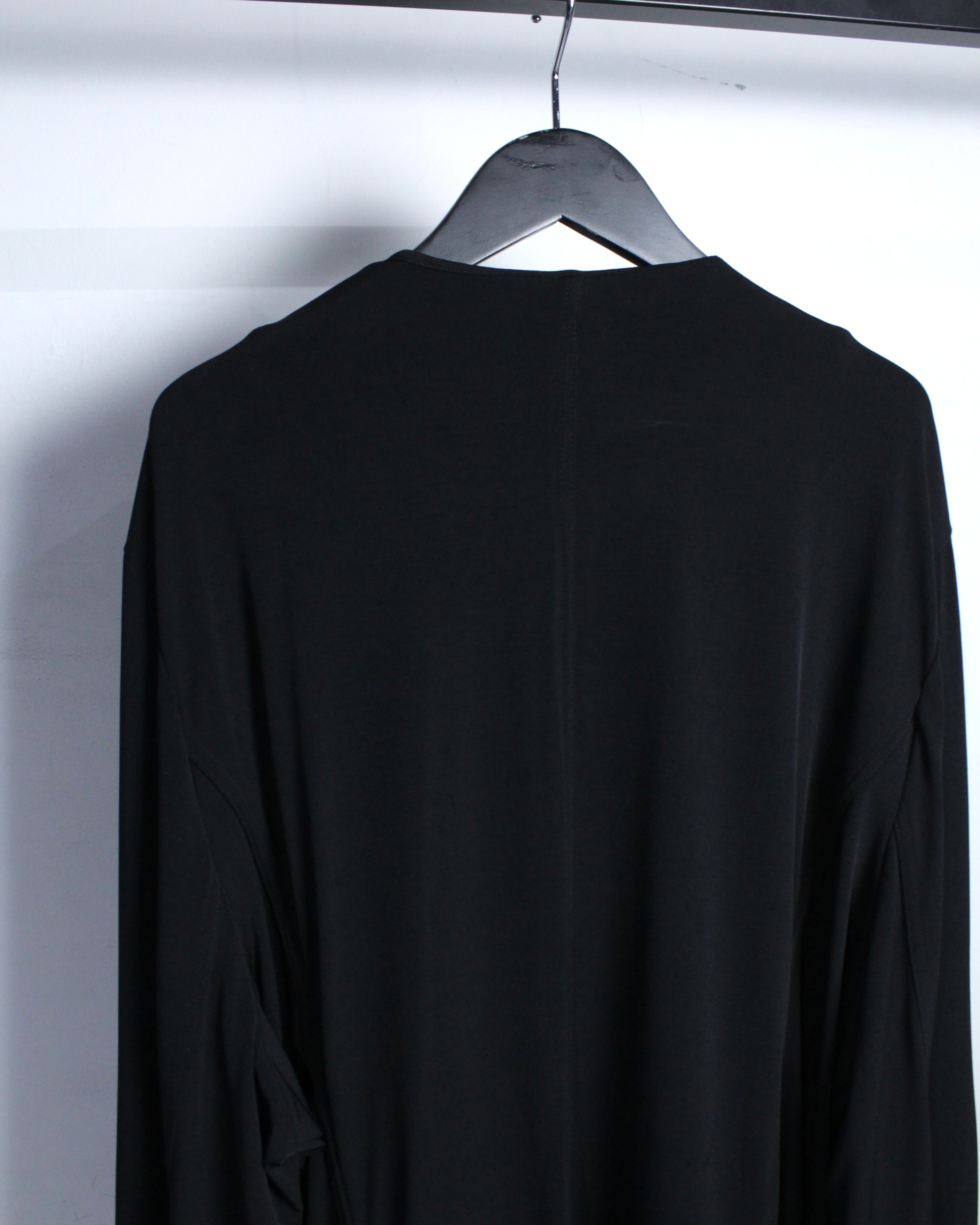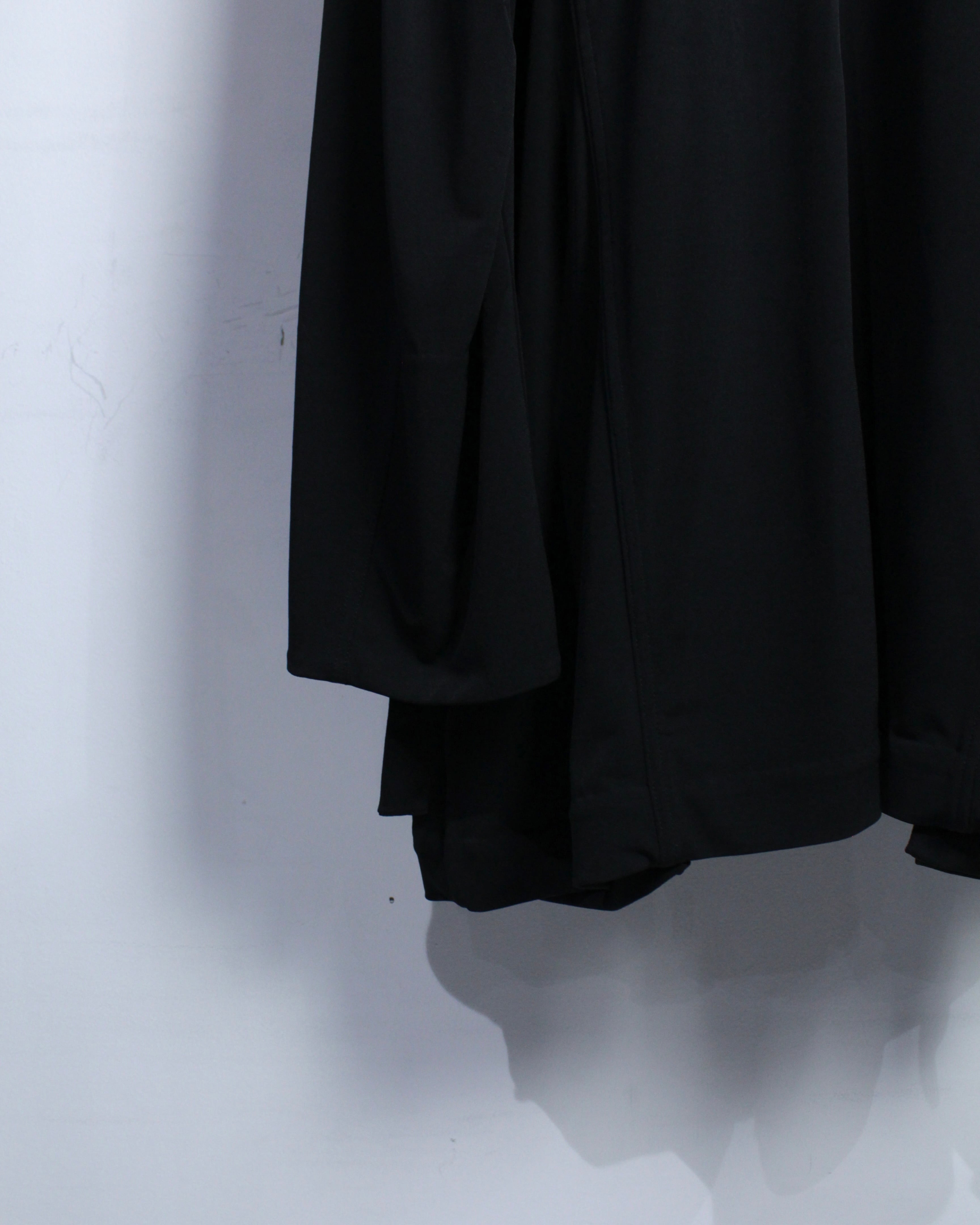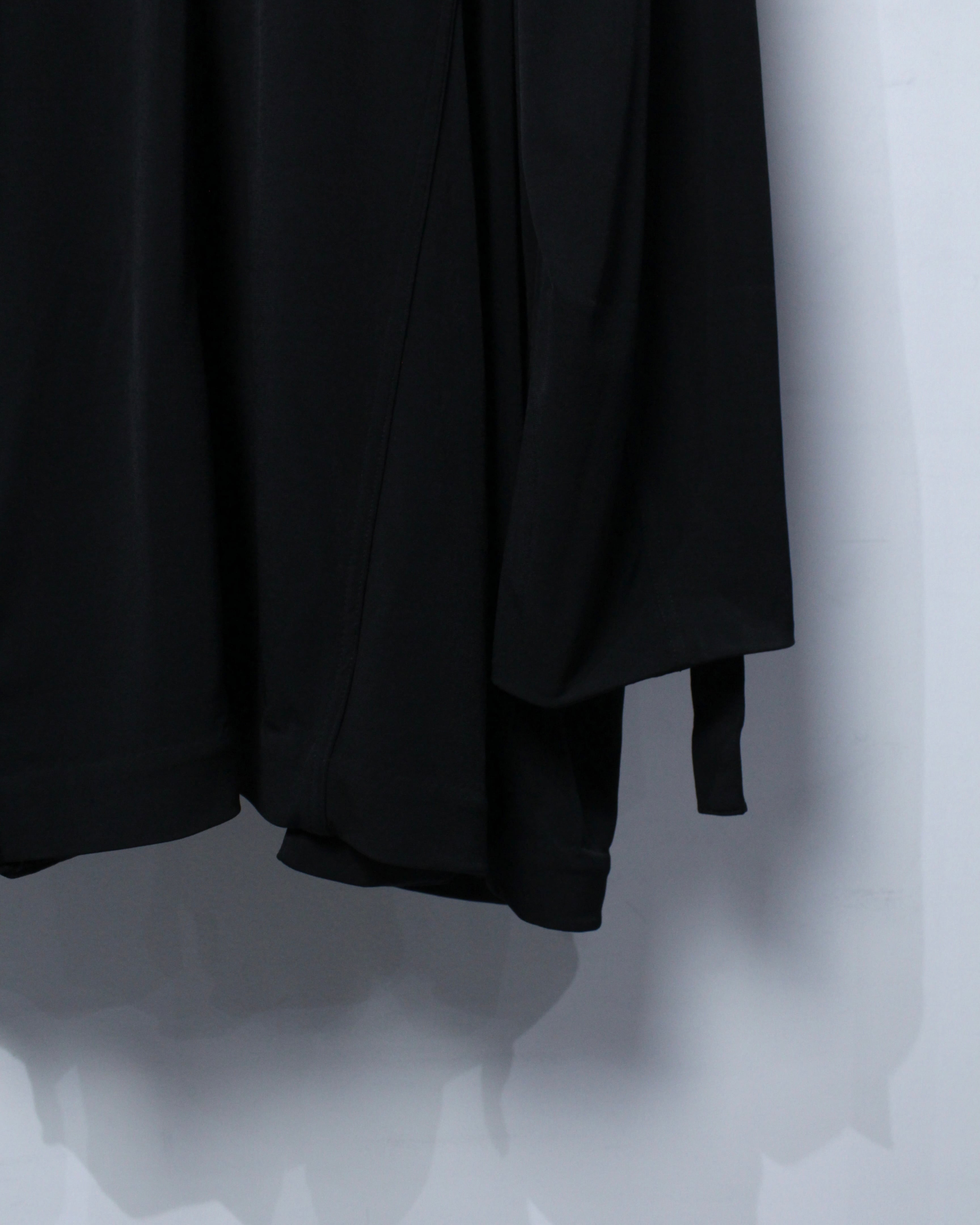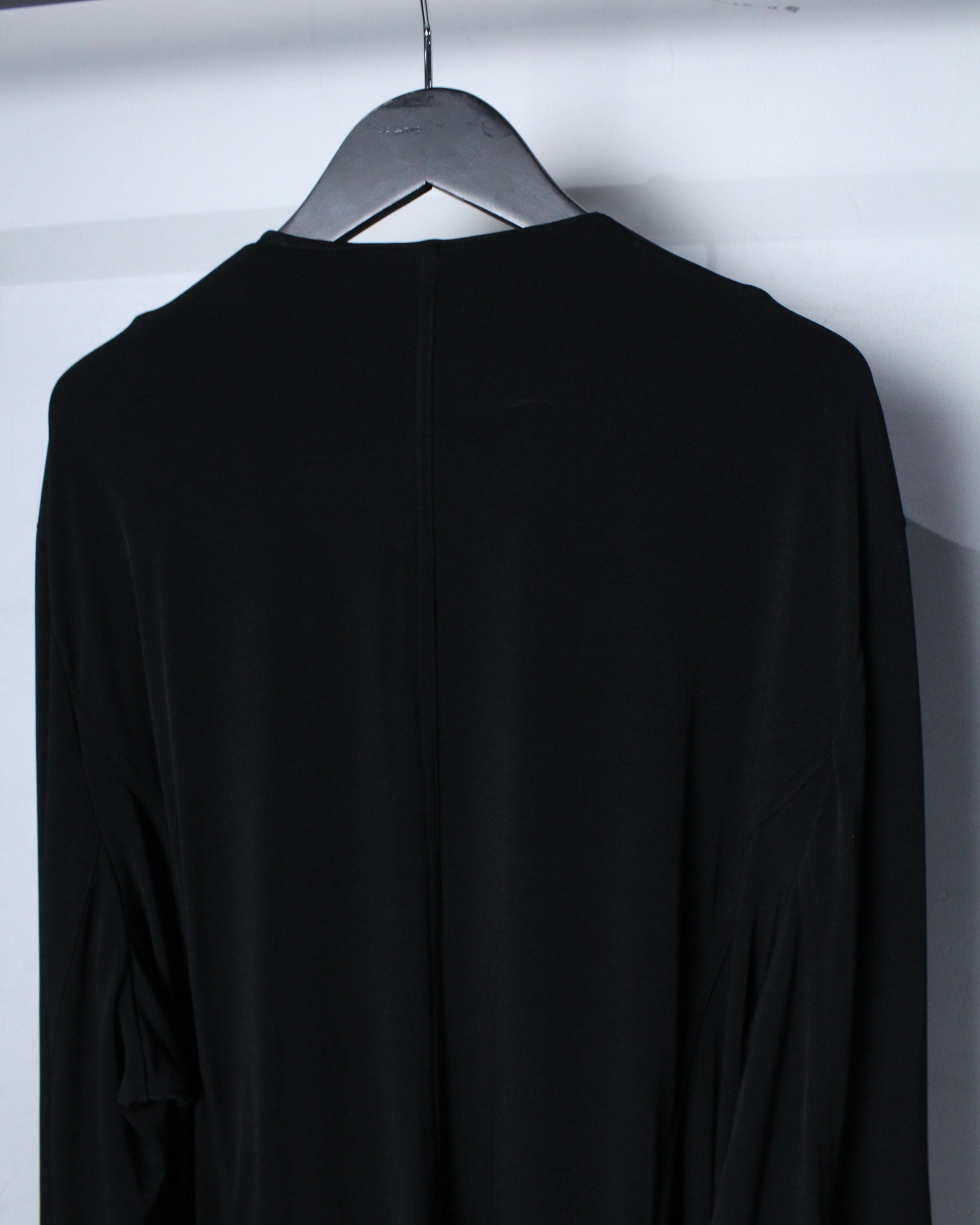 落ち感のある生地をベースに、全体に流れるドレープが美しく、動きの中で表情を変える1着。