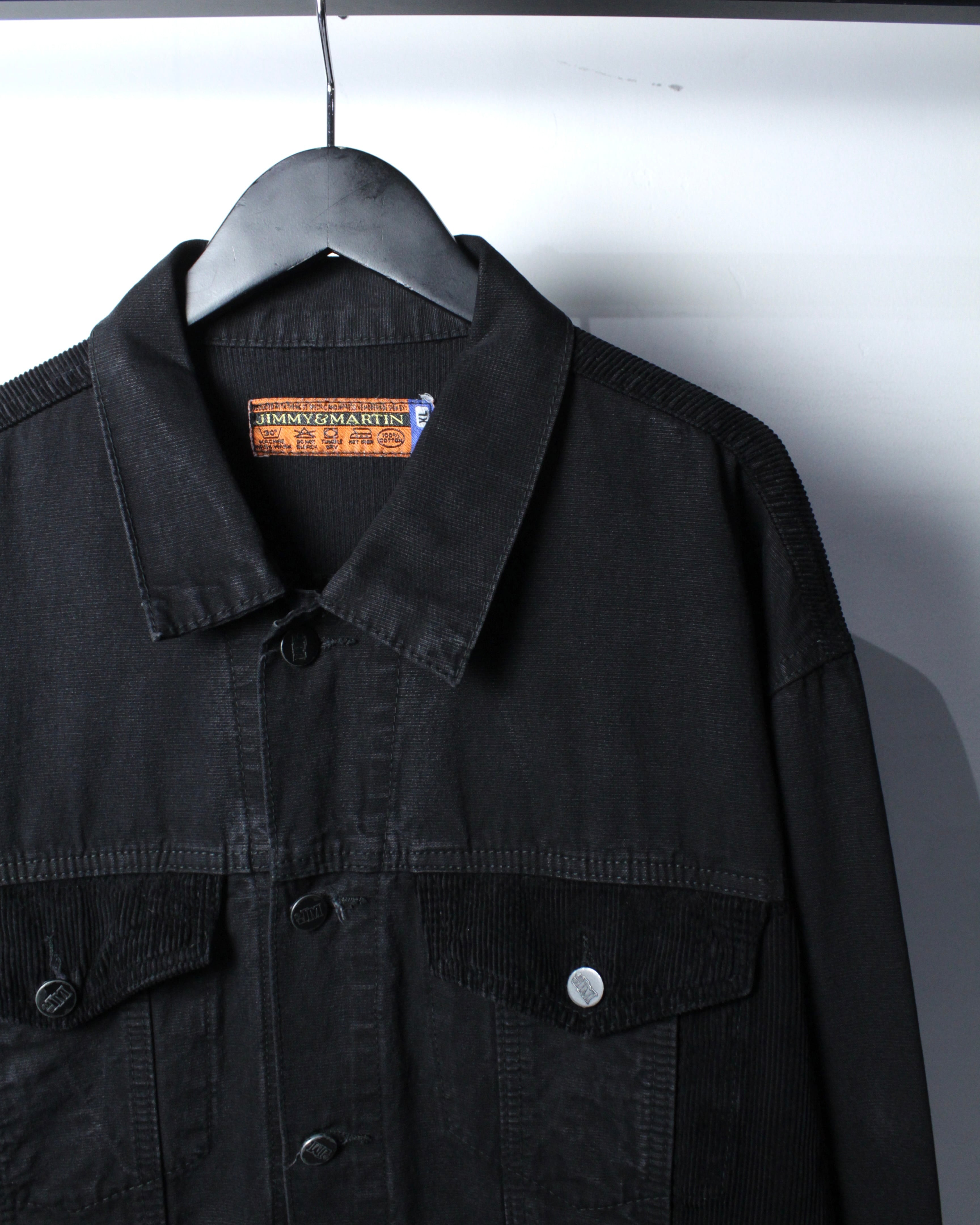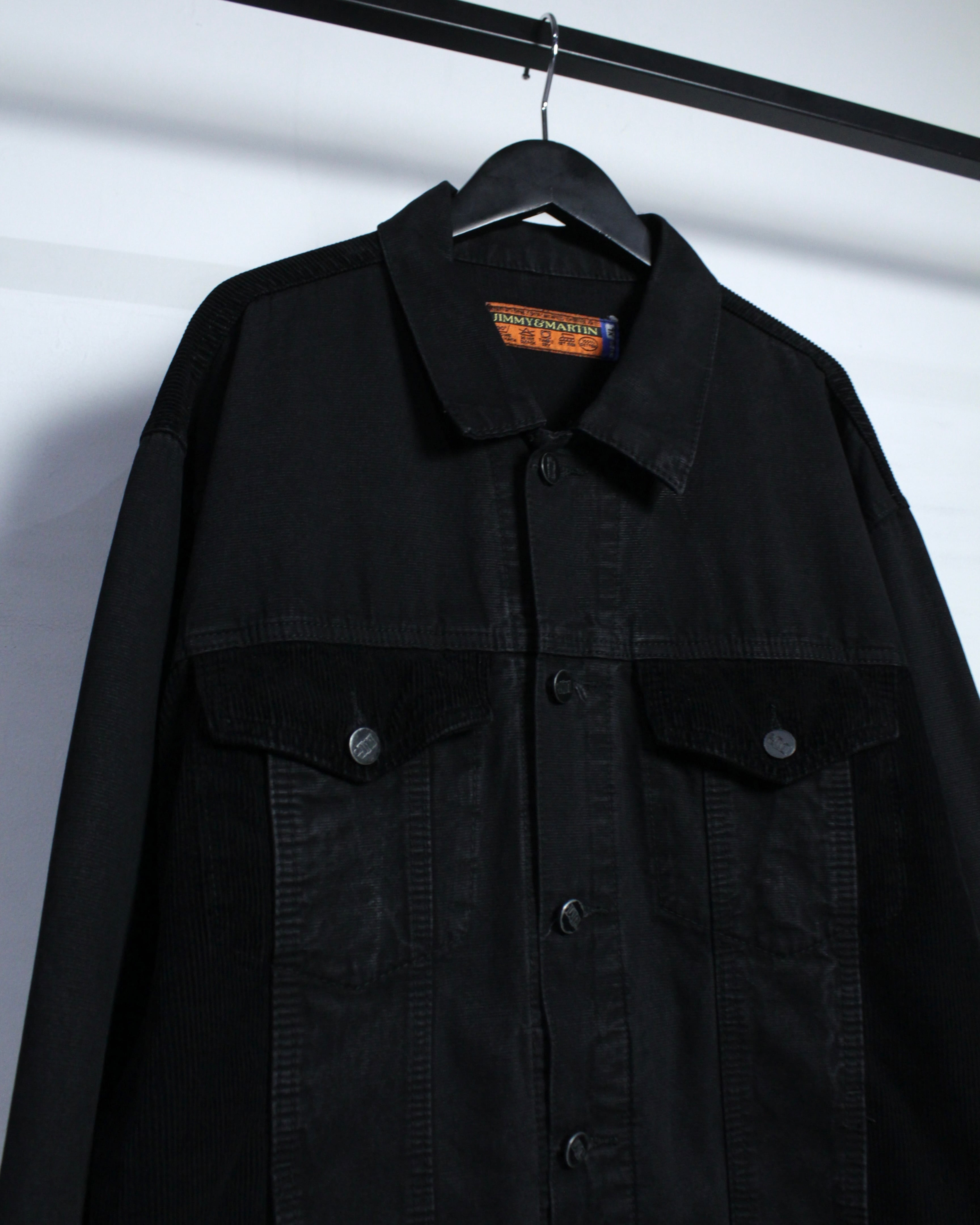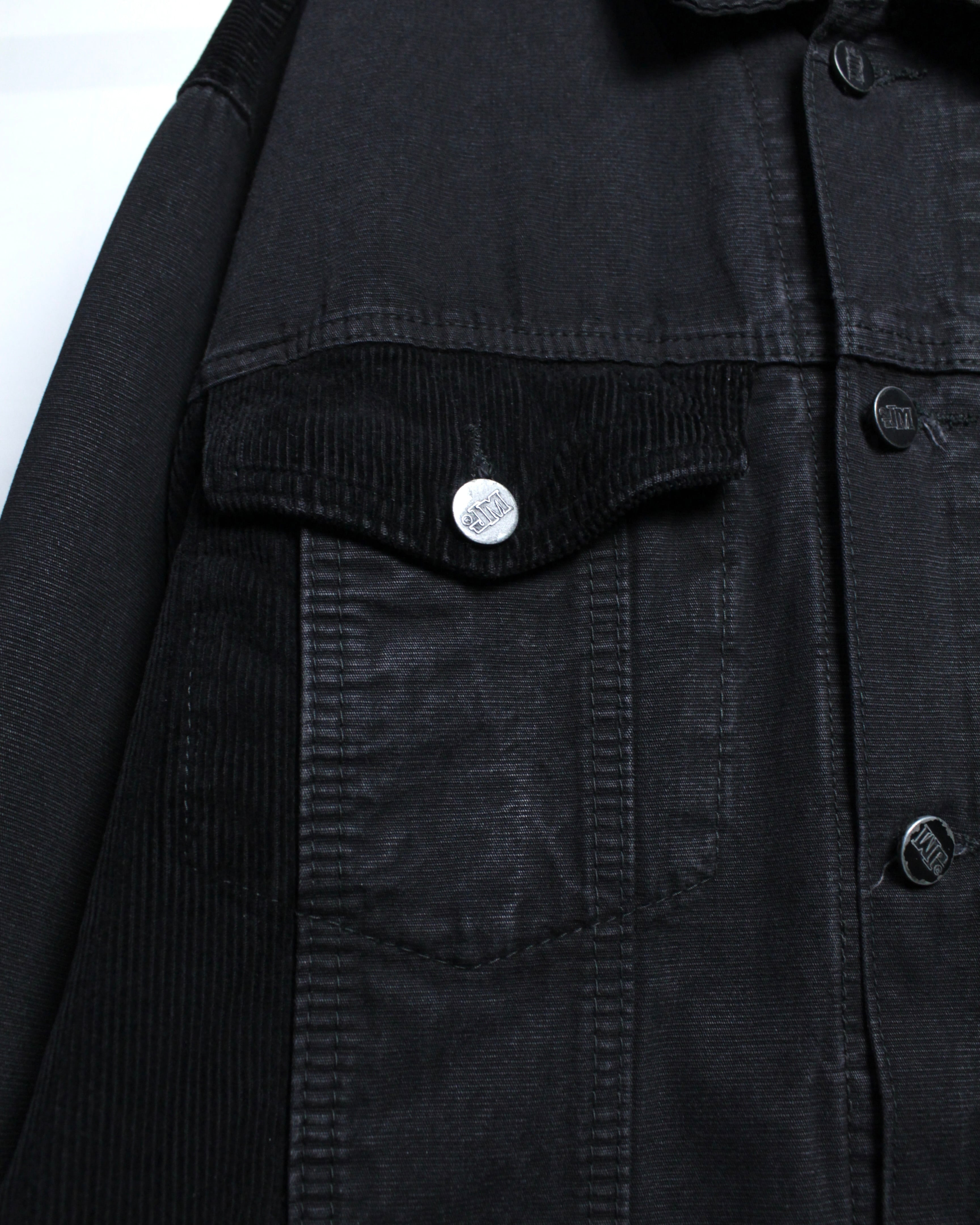 ブラックのボディをベースに、フラップポケット、ボディサイド、背面ヨークにブラックのコーデュロイを切り替えた1着。異素材を同色でまとめることで、奥行きのある表情とさりげないコントラストを演出しています。