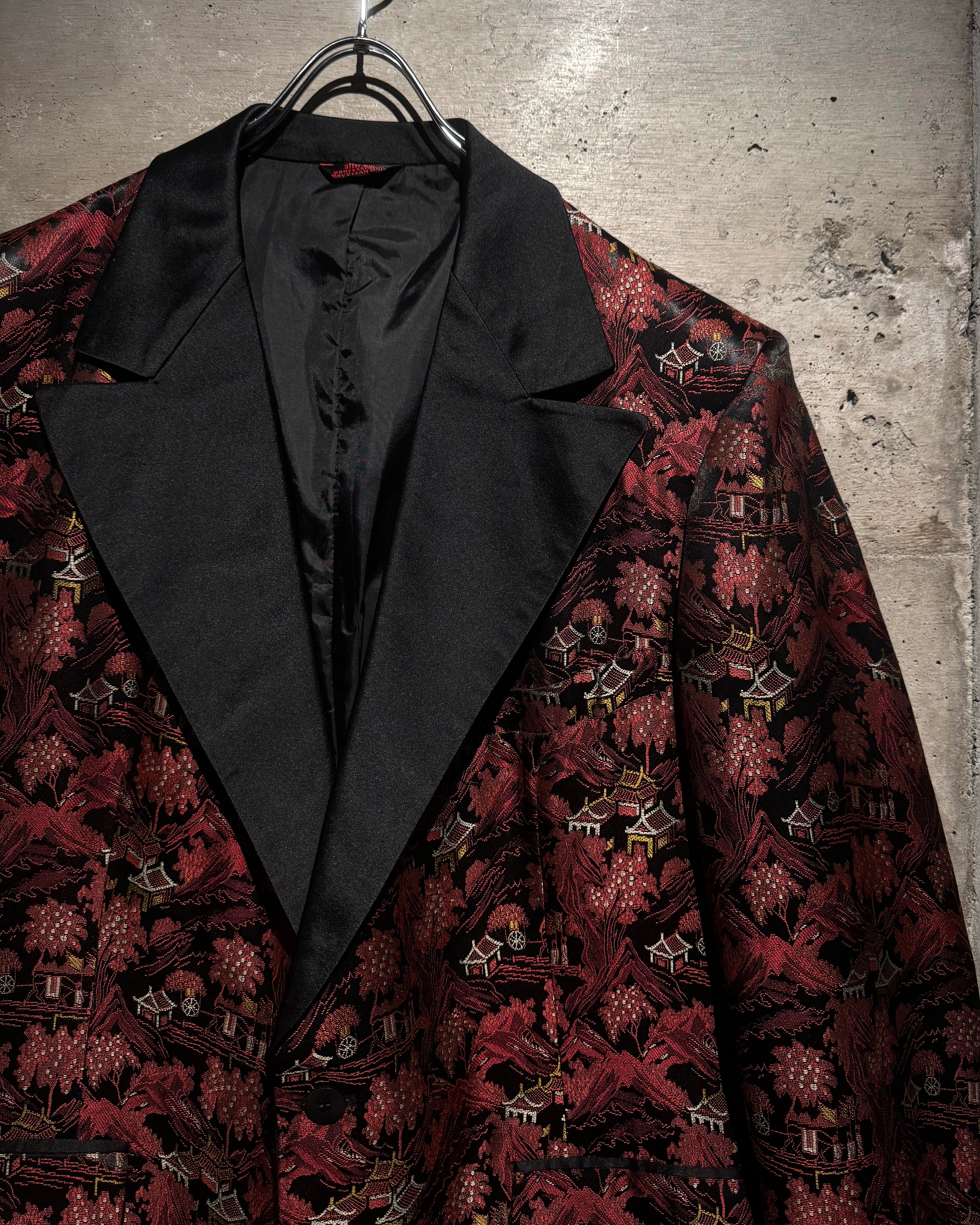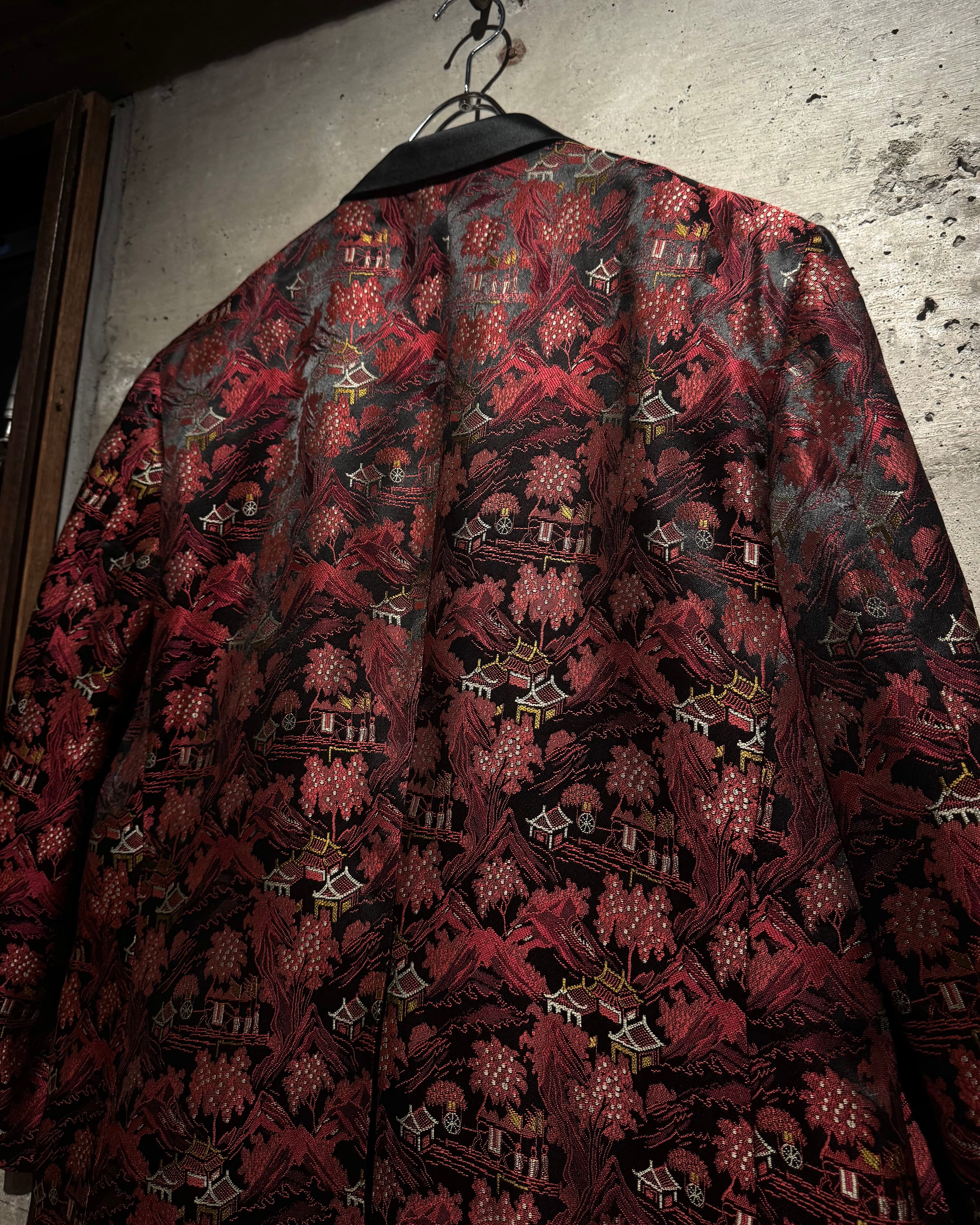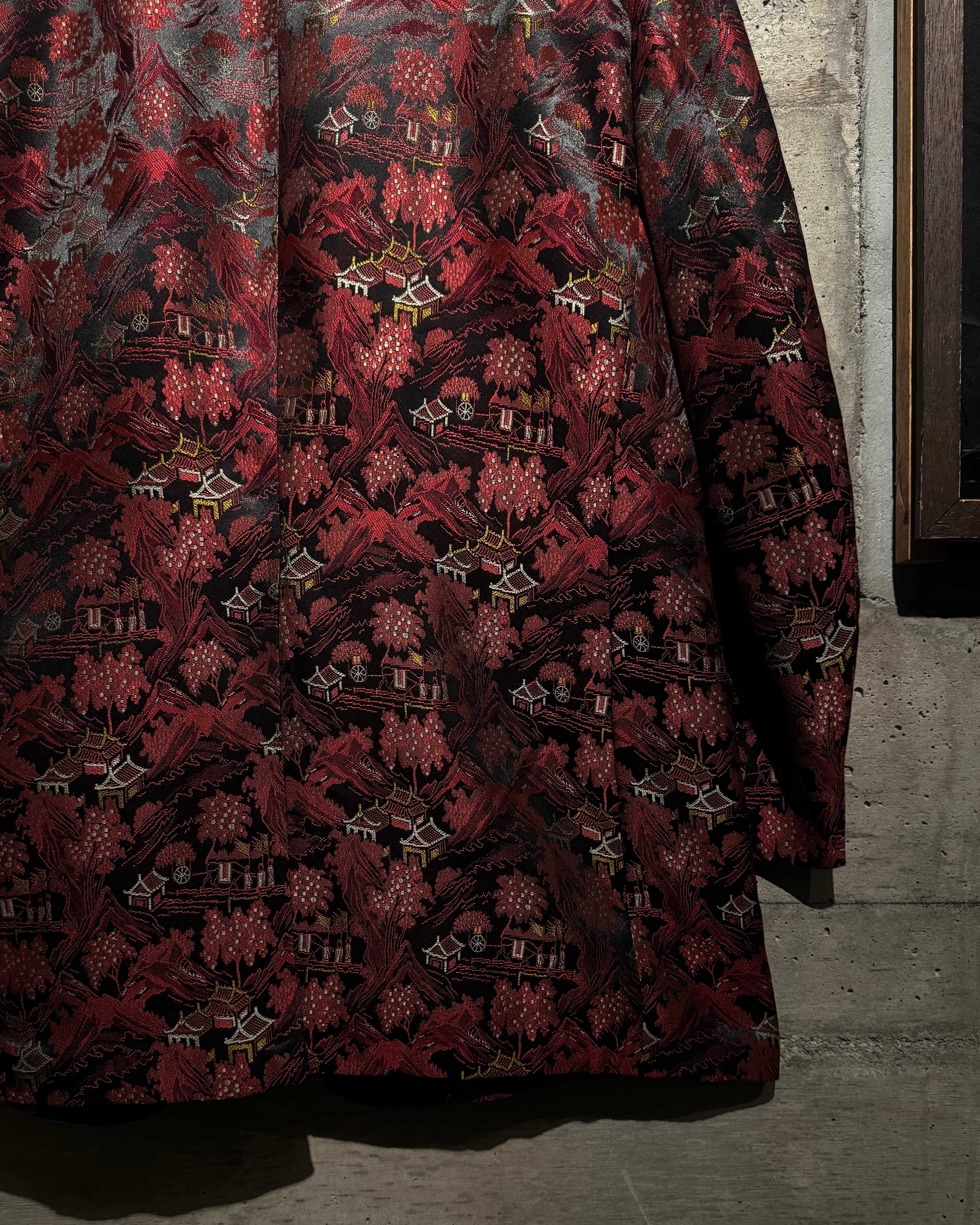 ハリのある艶やかな光沢を帯びたボディをベースに、全体へ織りで表現されたオリエンタルな総柄が目を惹く一着。