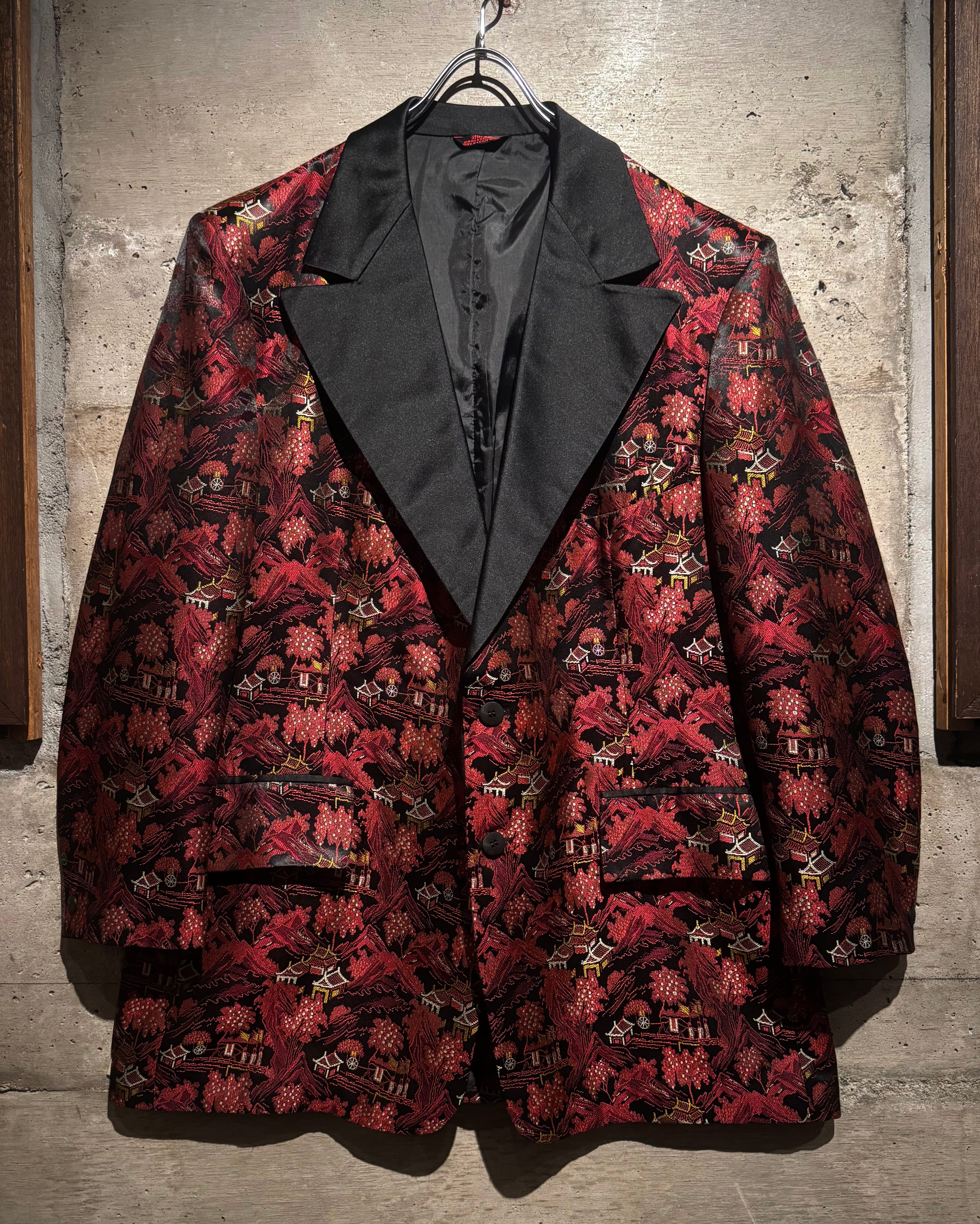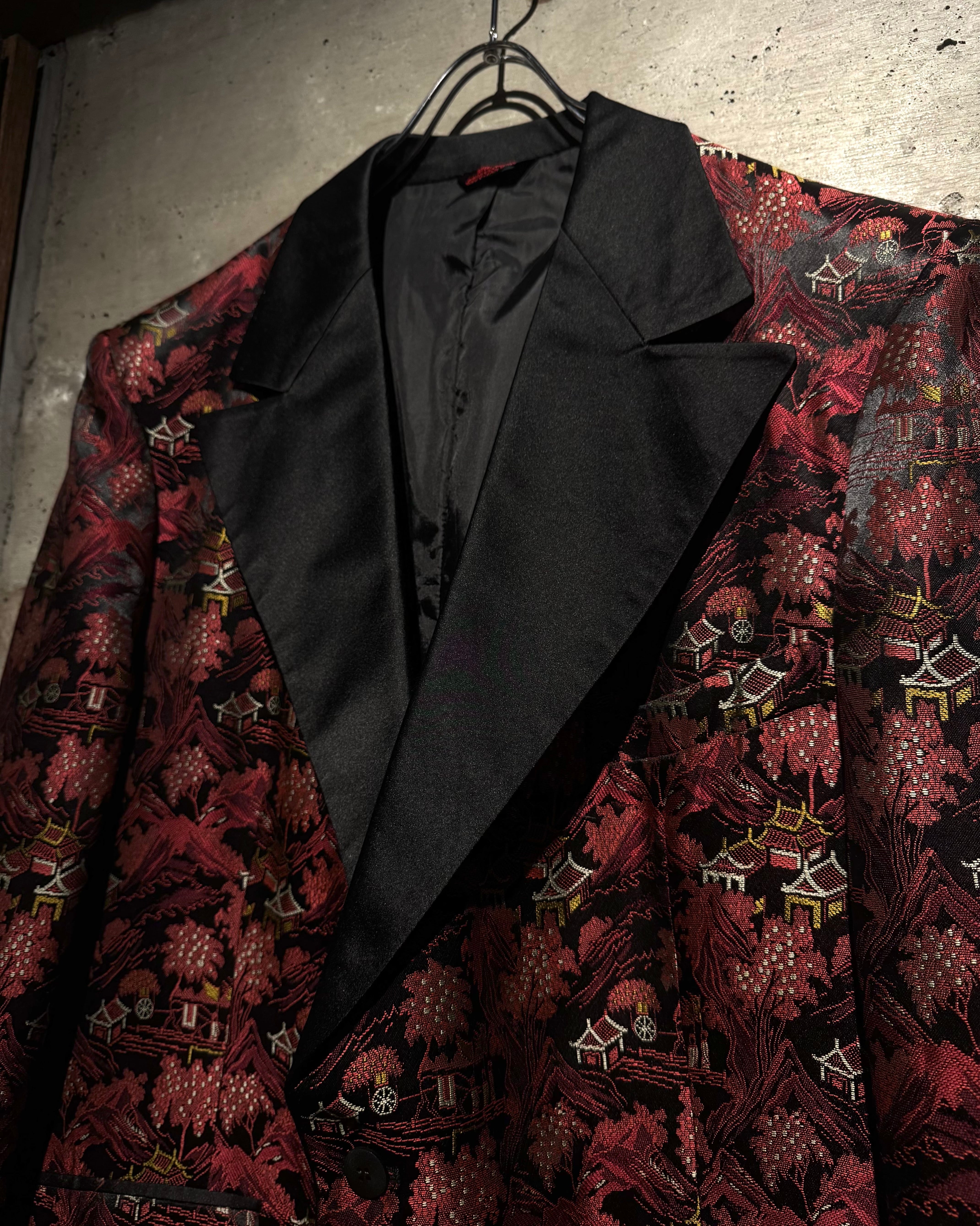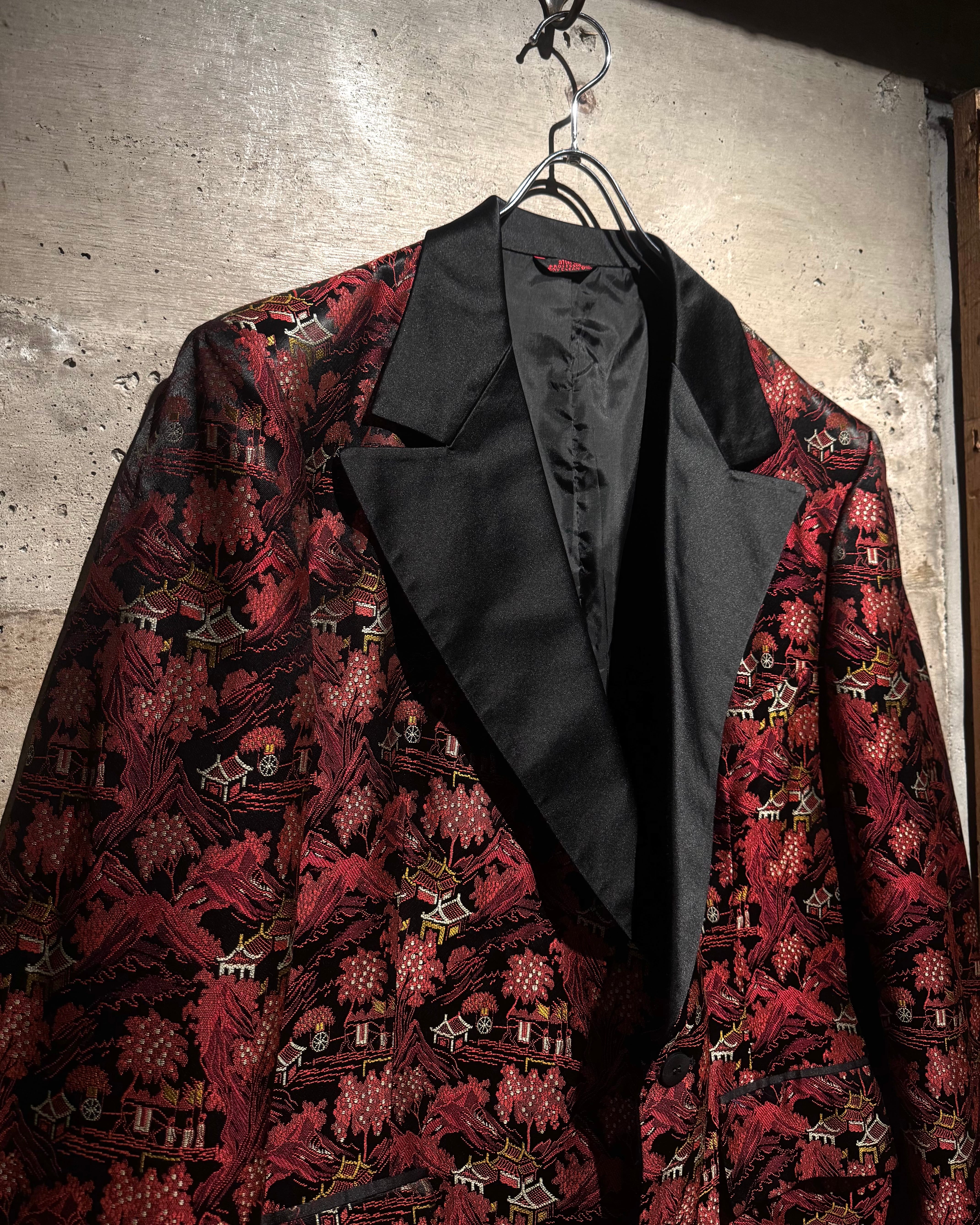 ハリのある艶やかな光沢を帯びたボディをベースに、全体へ織りで表現されたオリエンタルな総柄が目を惹く一着。