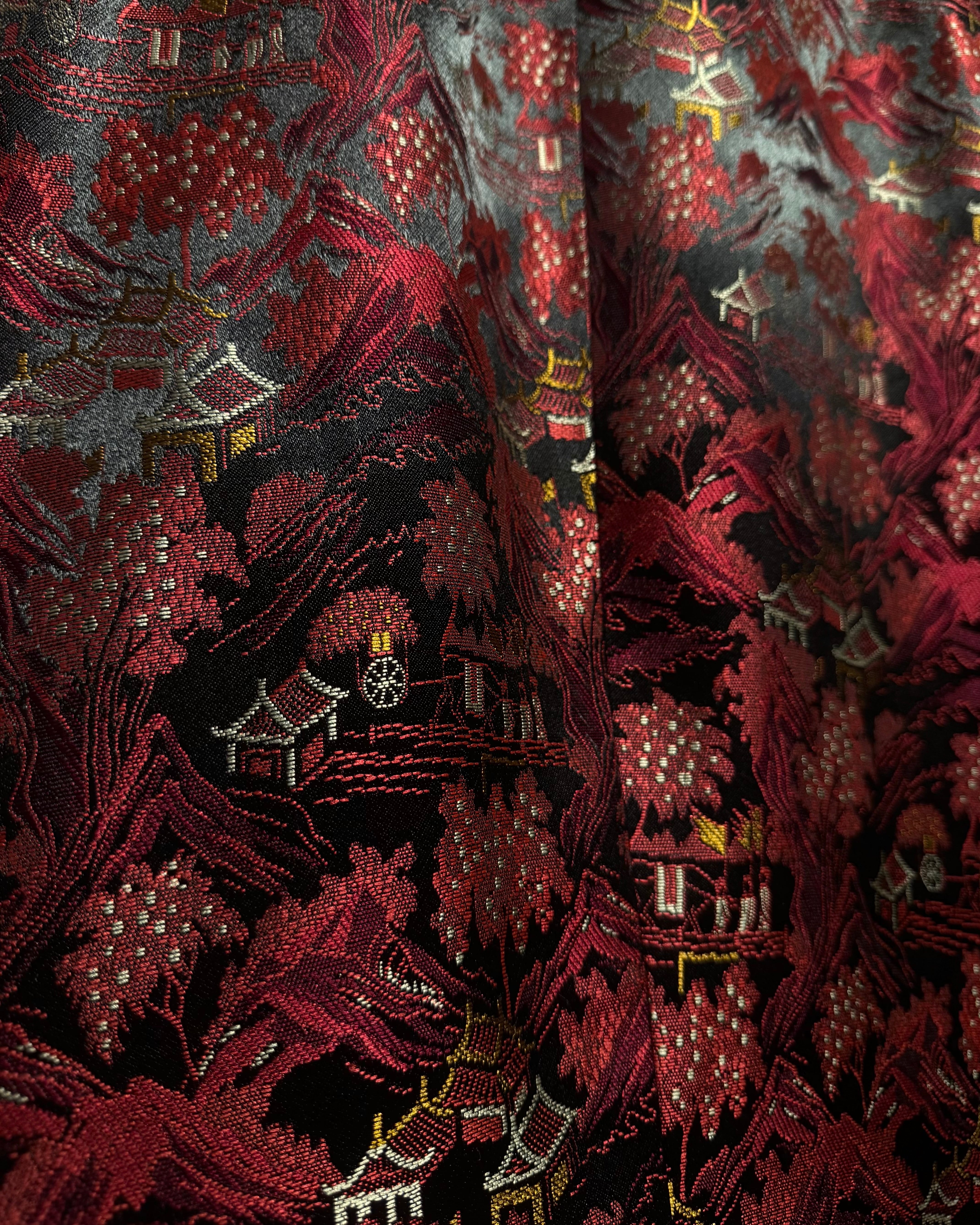 レッド×ブラックを基調とした重厚な配色に、繊細な織り柄が重なり合うことで奥行きある表情を演出し、抜群の存在感を放っています。